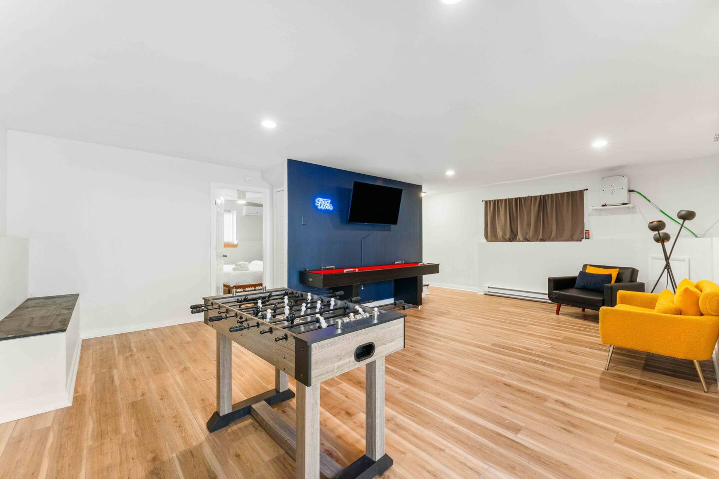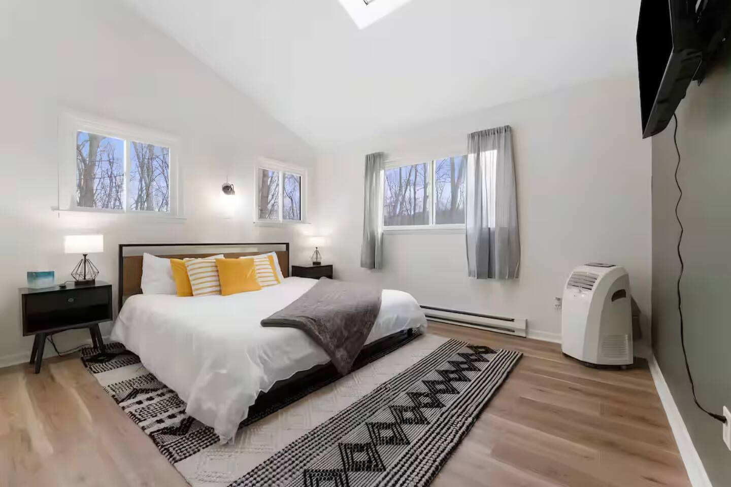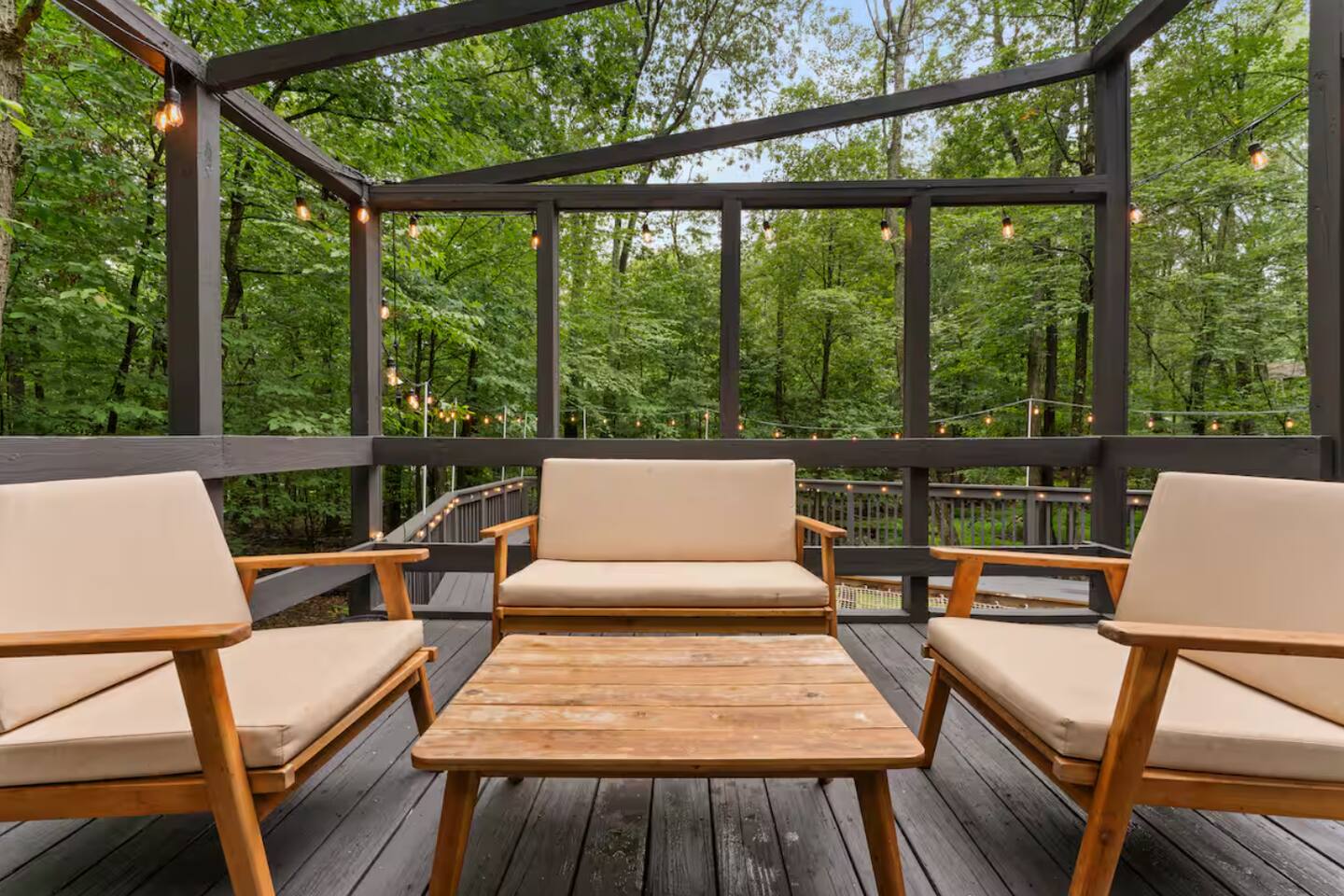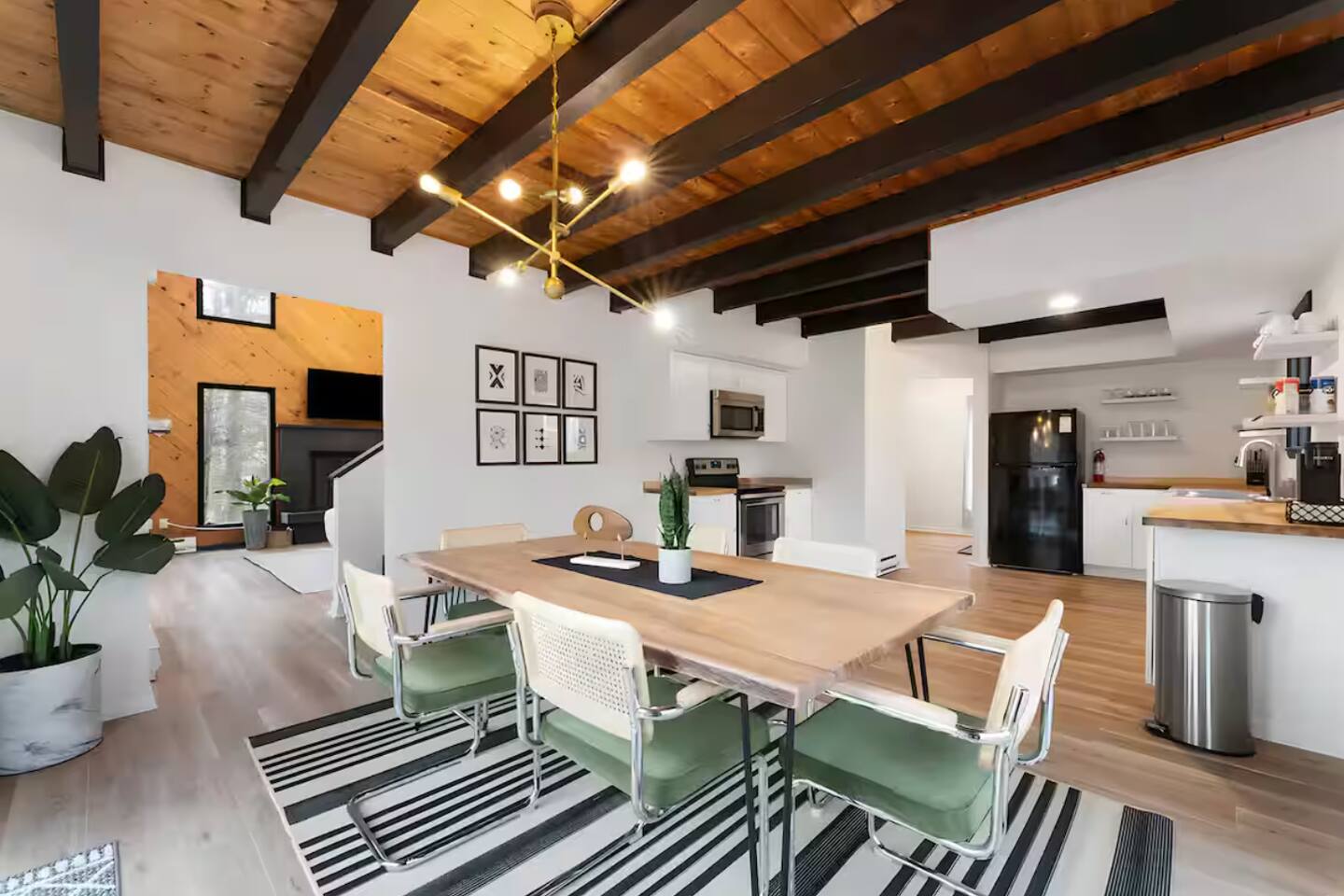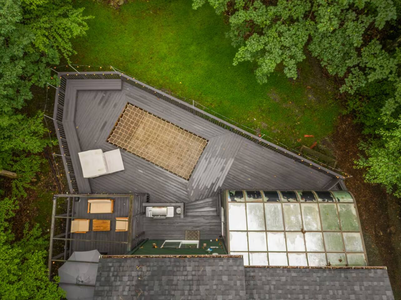 **During the summer months (Memorial Day weekend - Labor Day weekend), you will receive amenity badges that allow you to access the following amenities. If you’re staying with us outside of these dates, these amenities will be closed.** ☀ Lakes (with beach access - swimming allowed!) ☀ Pools ☀ Tennis courts ☀ Basketball courts ☀ Volleyball courts ☀ Dog park ☀ Playground areas KEY FEATURES: ☀ 5 gorgeous bedrooms; 4 kings, 1 full, and 2 twin beds (including one full-over-twin trundle) ☀ 3 full bathrooms; 1 on each floor! ☀ Modern kitchen ☀ Open, lofty living room with tall ceilings & comfy seating ☀ Beautiful dining area with direct access to the living room & back deck ☀ Private sunroom lounge chairs ☀ Stunning wraparound deck with gorgeous views of the surrounding forest & hot tub ☀ Massive net built into the deck to provide an immersive hammock experience ☀ Amenities loaded all around the outdoor space Here Are A Few Kind Words From Our Past Guests: “This was a great place to stay! The morning light through the windows was so beautiful. Overall, just a relaxing experience. The hosts were super responsive whenever I had a question. I would stay again!” - Emily “Sabrina was very accommodating and communicative. the house is beautiful and very comfortable, close to nature hikes.” - Jennifer “This place was lovely! Exactly as pictured! Very clean and excellent host experience!!! I plan to come back again!” - Regina ☆☆ BEDROOMS ☆☆ Right off of the game room on the bottom floor is a bedroom with a king bed & ensuite bathroom. Right across the hall is a second bedroom with a twin bed + a full-over-twin trundle. The top floor is filled with the remaining three bedrooms, each with king beds & gorgeous views of the Poconos forest. ☆☆ BATHROOMS ☆☆ Each floor has its own bathroom! On the bottom floor, the king bedroom has its own ensuite. The main level has a full common bathroom that is shared with the living spaces & kitchen. The top level has another full bathroom that is shared between all 3 remaining bedrooms. ☆☆ KITCHEN & DINING ☆☆ Beautiful, completely remodeled space! Modern appliances and open concept that flows into the dining room, with direct access to both the living space & out onto the deck. ☆☆ LIVING ROOM ☆☆ STUNNING central living room! Opens up right into the rest of the house, with high vaulted ceilings and beautiful modern design, coupled with the original cabin-charm of this house. Comfy seating, a smart TV, and lots of natural light pouring in, you will not want to leave this space! Right downstairs is an additional bonus lounge! With games (foosball and shuffleboard), more comfy seating, and another smart TV. This is such a unique space that you can enjoy under the snow falling on the lofty skylights, or as the sun beams shine through the walls of windows, no matter the season! ☆☆ OUTDOOR SPACE ☆☆ This is an outdoor space unlike any other in the Poconos! HUGE deck, tons of seating all around, lounge seating inside the sunroom, and a MASSIVE built-in net on the lower level of the deck, the provide you a fully immersive hammock experience as you enjoy the serene surrounding nature and listen to the peaceful sounds of the nearby running creek! Right down the steps from the deck, there is a private hot tub that backs up to the serene woodlands. Along with the peaceful setting of this home, you will also be able to enjoy grilling on the outdoor BBQ, cozying up next to the fire pit (propane), and exploring all around the private serenity of this home, as it's located at the end of a cul-de-sac with no other homes behind it! ★☆ Book Now & Let Us Take Care Of You In The Poconos! ☆★
