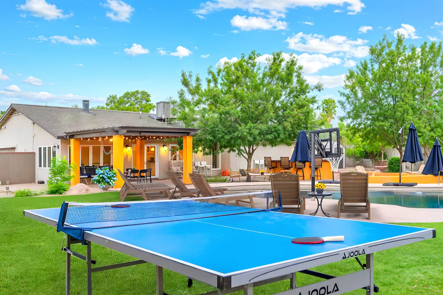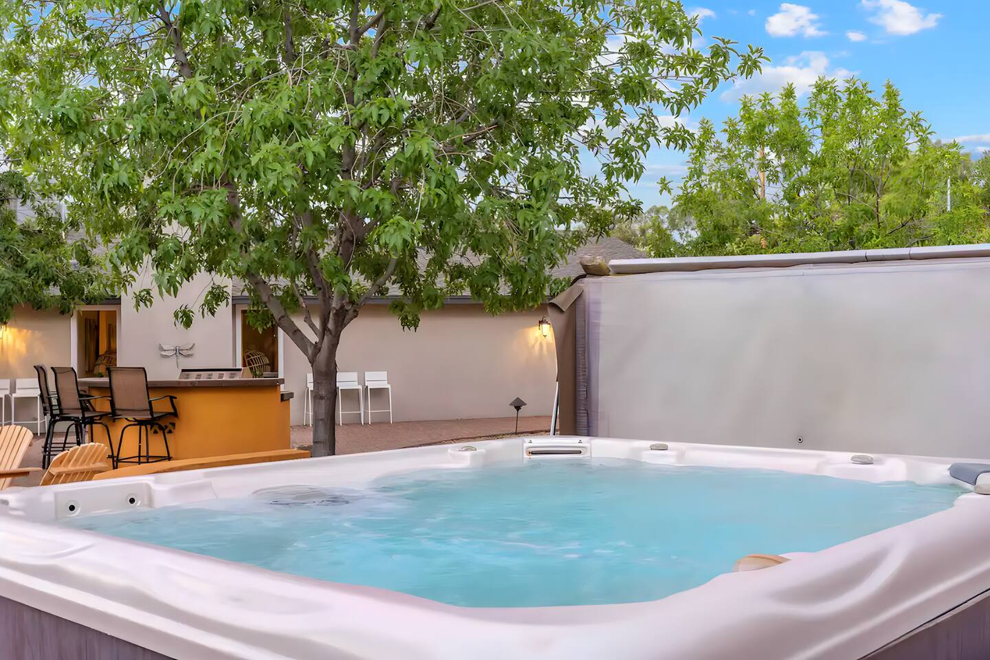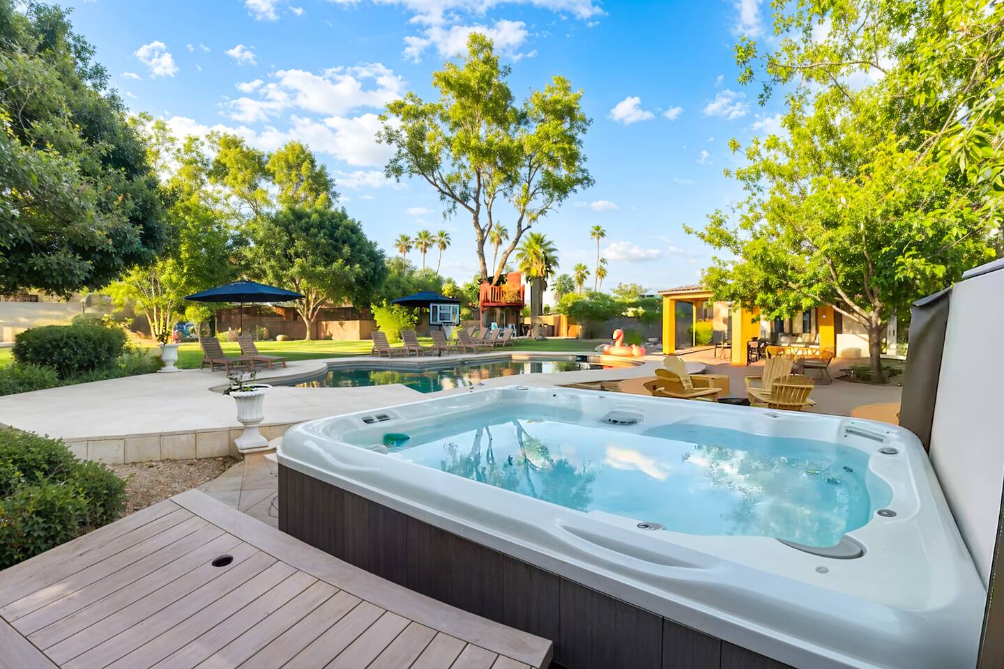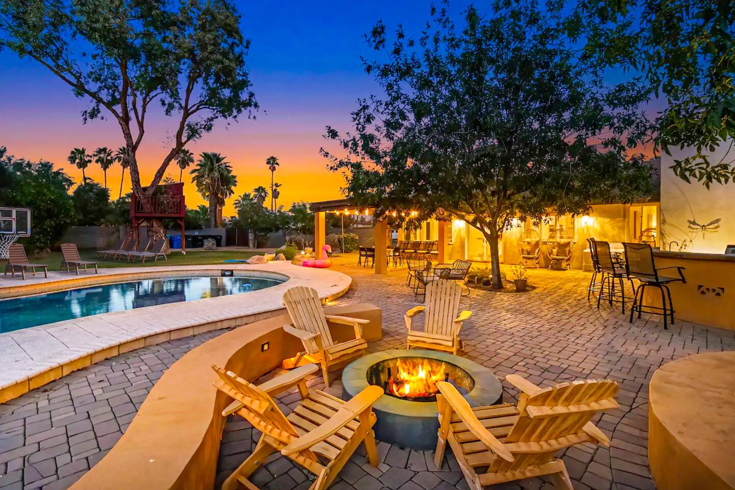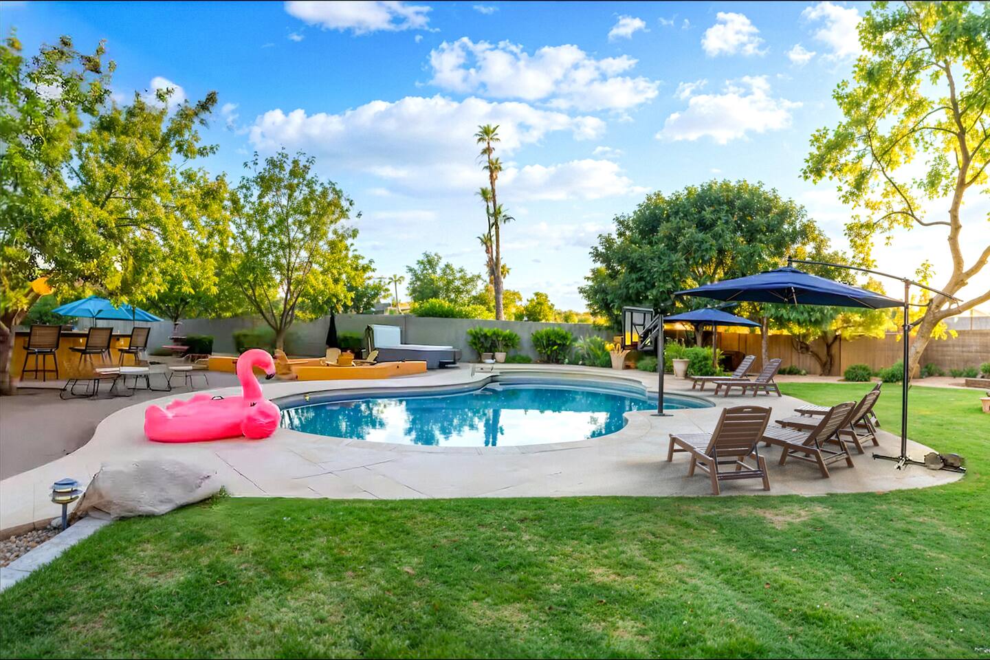 5 bedrooms, 3 baths. Amazing backyard - perfect for entertaining! Hot tub seats 8 comfortably. Heated pool (safety gate around the back patio before entering the pool area), grill with bar, wood-burning fire pit, outdoor seating, fun for kids. Granite, wood floors, fireplace, front courtyard, french doors, washer/dryer. The pool & yard are lit at night. 4 smart TV’s. Super clean - feels like a hotel home.
