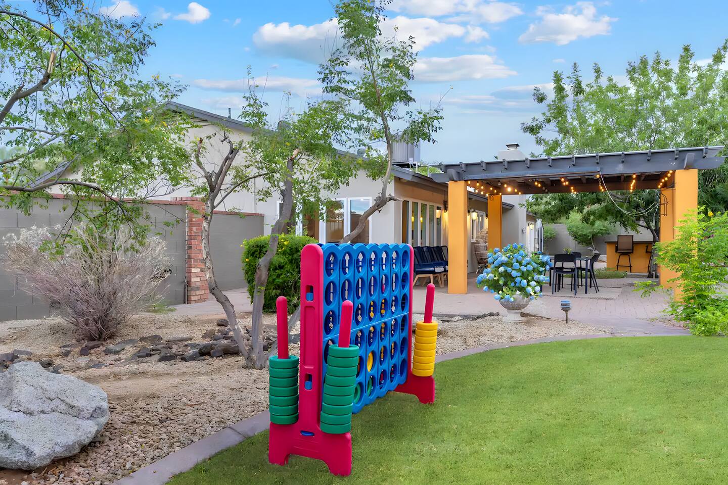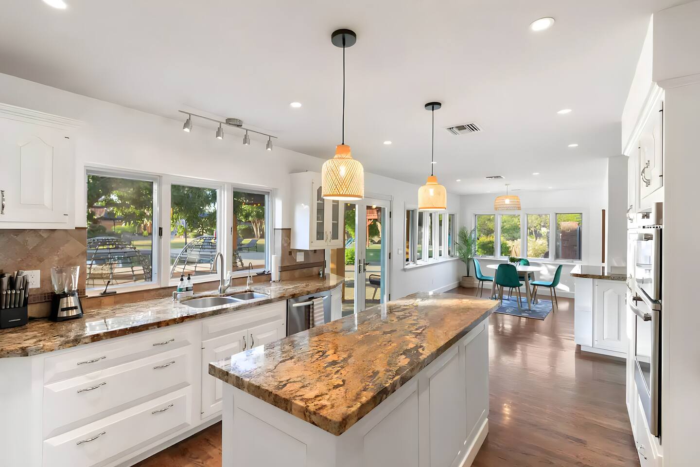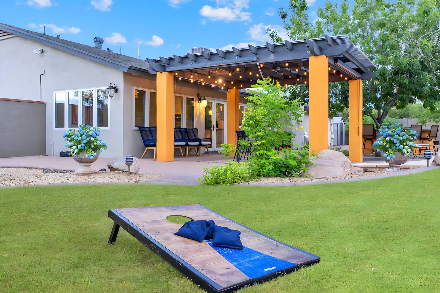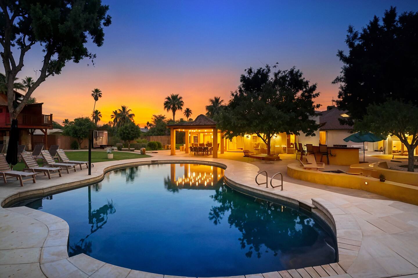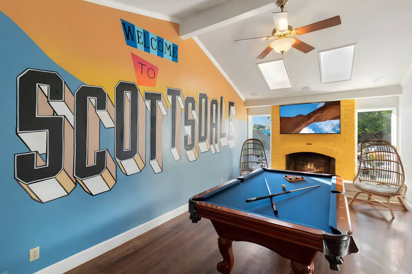 5 bedrooms, 3 baths. Amazing backyard - perfect for entertaining! Hot tub seats 8 comfortably. Heated pool (safety gate around the back patio before entering the pool area), grill with bar, wood-burning fire pit, outdoor seating, fun for kids. Granite, wood floors, fireplace, front courtyard, french doors, washer/dryer. The pool & yard are lit at night. 4 smart TV’s. Super clean - feels like a hotel home.