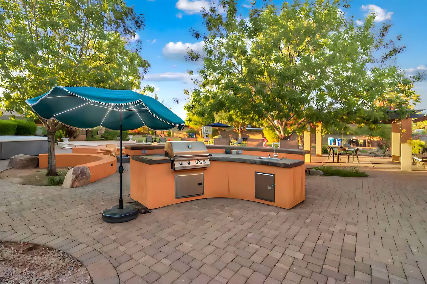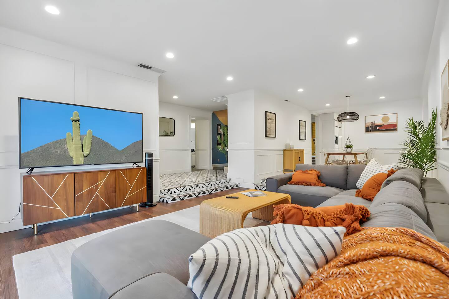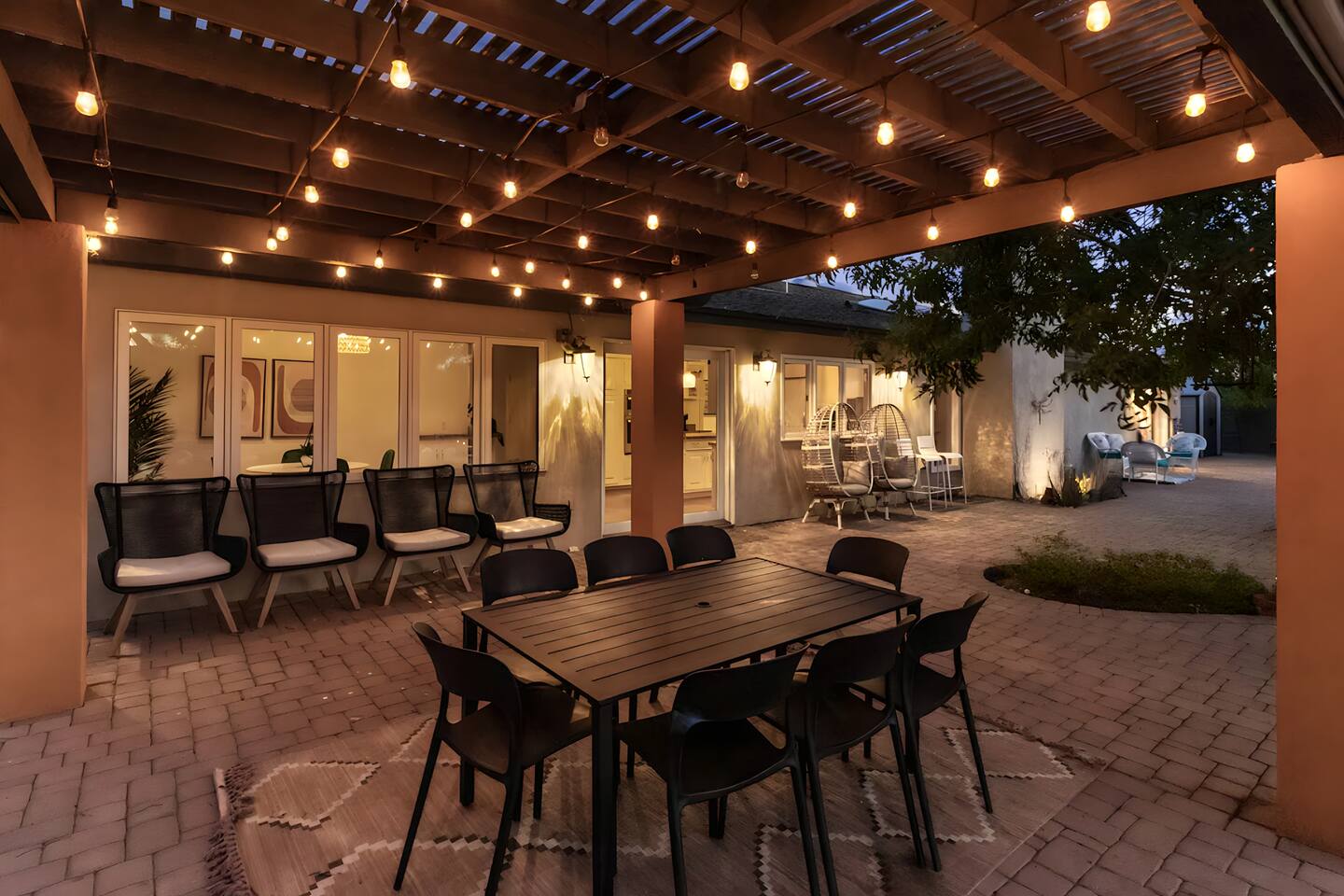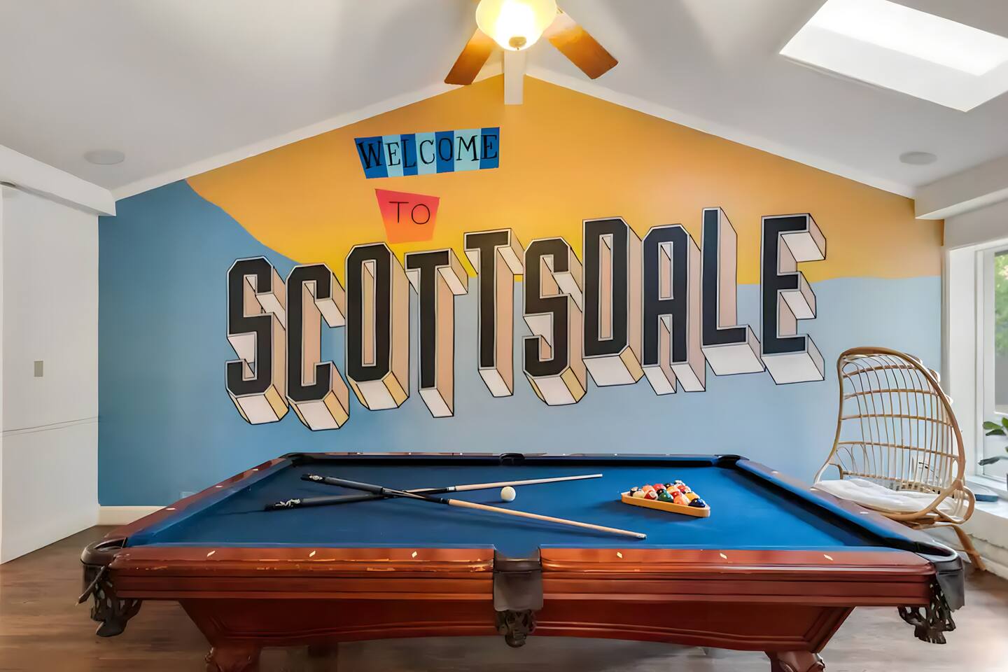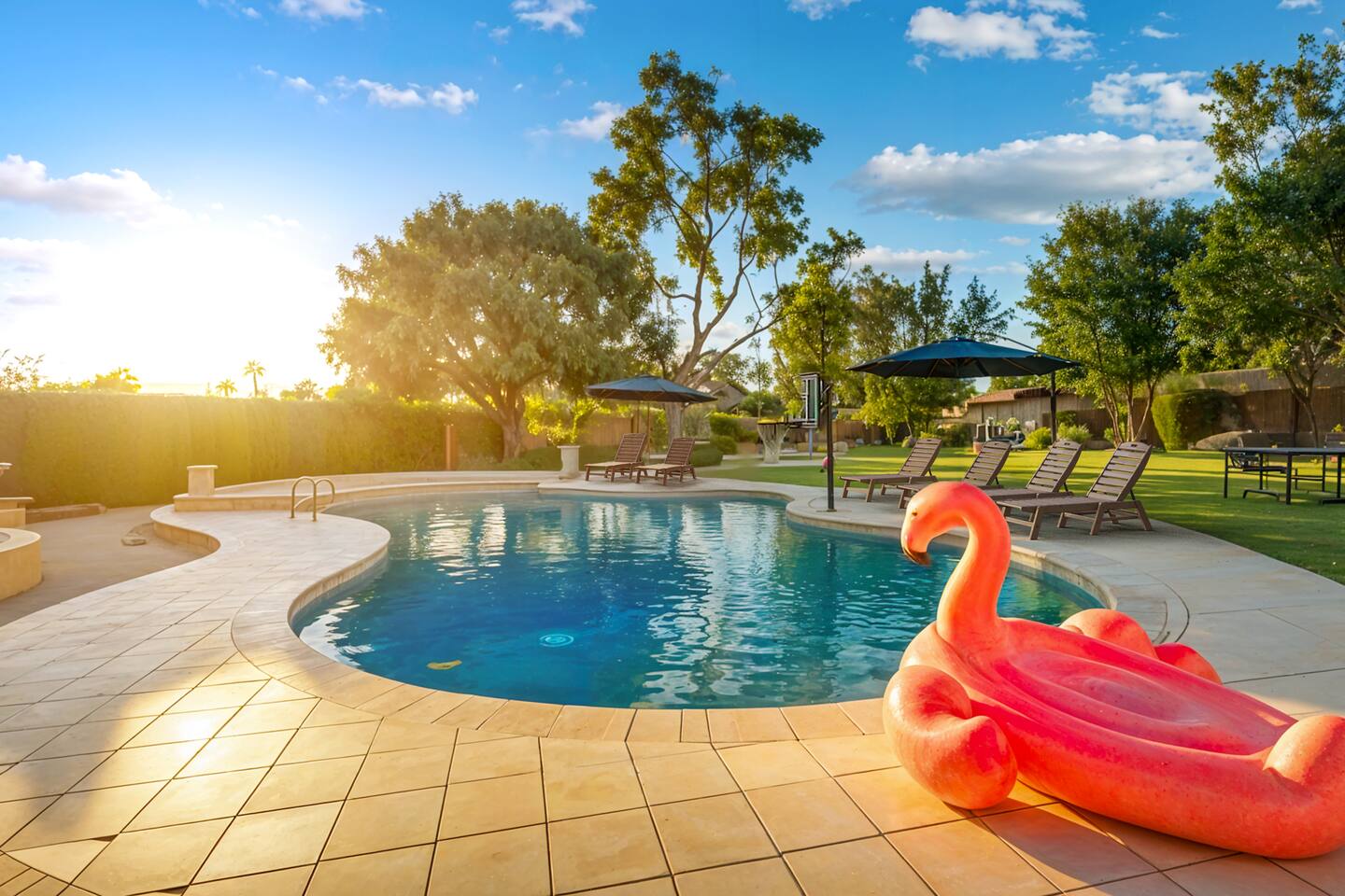 5 bedrooms, 3 baths. Amazing backyard - perfect for entertaining! Hot tub seats 8 comfortably. Heated pool (safety gate around the back patio before entering the pool area), grill with bar, wood-burning fire pit, outdoor seating, fun for kids. Granite, wood floors, fireplace, front courtyard, french doors, washer/dryer. The pool & yard are lit at night. 4 smart TV’s. Super clean - feels like a hotel home.