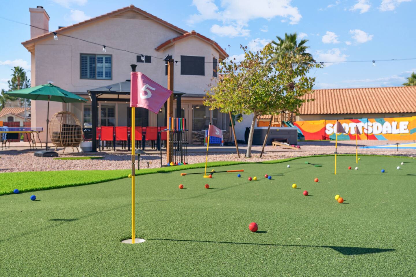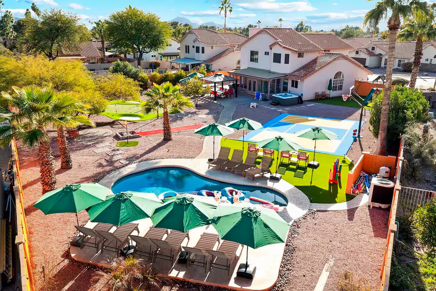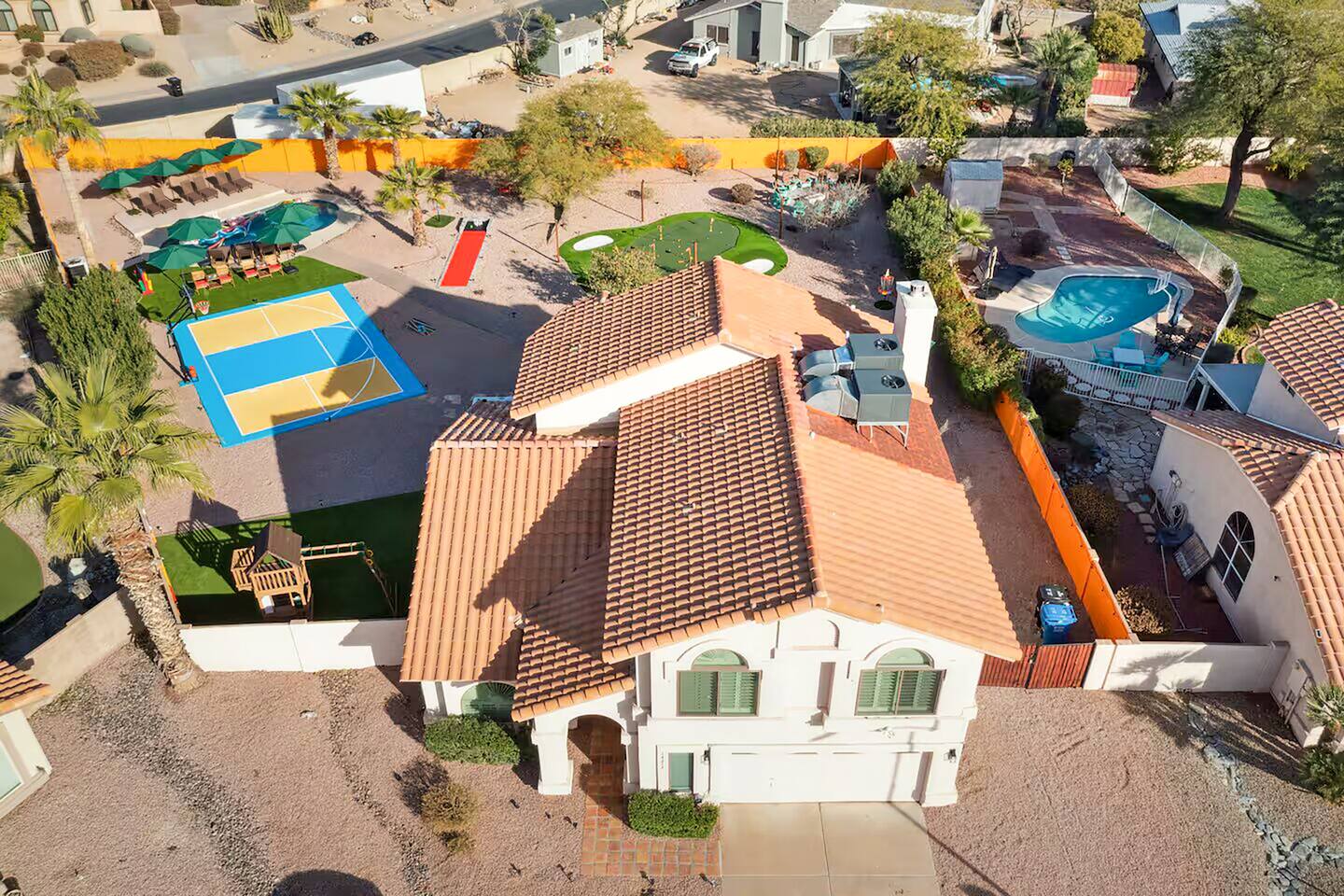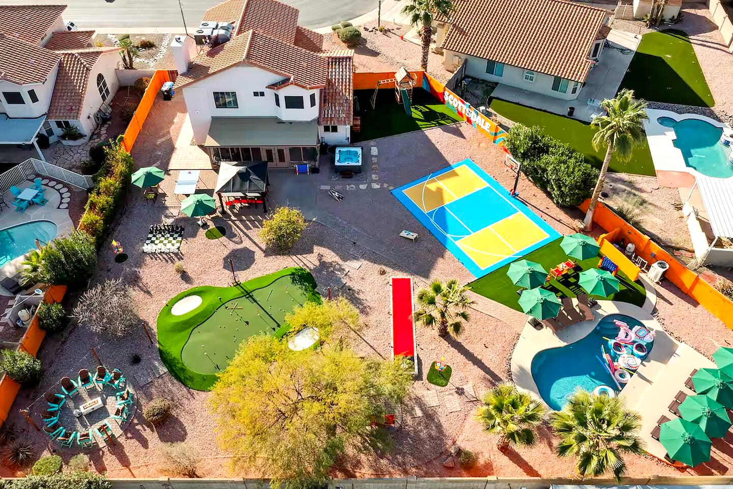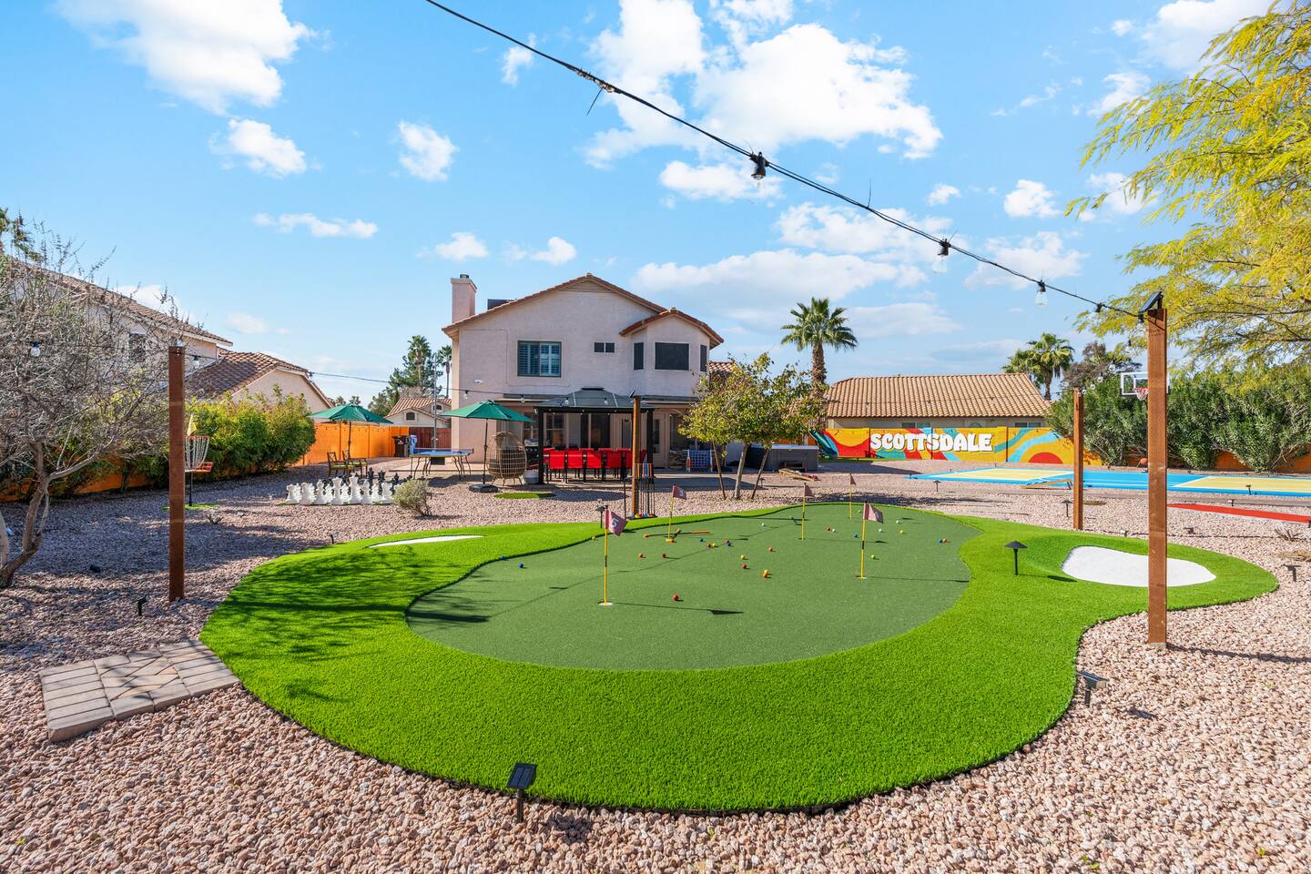 KEY FEATURES: ☀ 5 beautiful bedrooms; 3 kings, 4 fulls, & 4 twin beds ☀ 2.5 modern bathrooms ☀ Modern kitchen with new, stainless steel appliances ☀ Open living room with lots of comfy seating & smart TV ☀ Dining room with seating to comfortably accommodate 14 (+ outdoor dining options) ☀ Bright, vibrant game room with pool table! ☀ UNBELIEVABLE backyard; heated pool, hot tub, fire pit, mini golf, basketball court, & much more! Here Are A Few Kind Words From Our Past Guests: “This was a great place to stay! The morning light through the windows was so beautiful. Overall, just a relaxing experience. The hosts were super responsive whenever I had a question. I would stay again!” - Emily “Sabrina was very accommodating and communicative. the house is beautiful and very comfortable, close to nature hikes.” - Jennifer “This place was lovely! Exactly as pictured! Very clean and excellent host experience!!! I plan to come back again!” - Regina ☆☆ BEDROOMS ☆☆ You'll find 5 bedrooms throughout this home. Downstairs, there is a FUN filled bunk bedroom, with two twin-over-full bunk beds, smart TV, shuffleboard, and arcade game. Upstairs are the four remaining bedrooms. Three bedrooms have one king bed & a smart TV in each, while the fifth bedroom has two twin-over-full bunk beds & an private ensuite bathroom. ☆☆ BATHROOMS ☆☆ There are two and a half modern bathrooms throughout the home. Downstairs, the half bathroom has a sink & toilet only. Upstairs, the private master ensuite has two sinks, a toilet, walk-in shower, and a soaking tub. The hallway bathroom upstairs also has two sinks, a toilet, & shower/tub combo. ☆☆ KITCHEN & DINING ☆☆ The modern kitchen is located right off of the main living areas, and is loaded with all new stainless steel appliances & a coffee station (including a Keurig & coffee pods). The dining room is right next to the kitchen, with enough seating to comfortably fit 14 people (between two dining tables), + lots of room for outdoor dining! ☆☆ LIVING ROOM ☆☆ In the living room, you’ll be greeted with lots of comfy seating, a big smart TV, and a beautiful, bright design that is carried throughout the rest of the home. This is the perfect spot to host your movie nights & games with your friends and family! ☆☆ GAME ROOM ☆☆ Right next to the main living areas, you'll find the pool table room, along with a comfy sofa & smart TV. It will take your breath away as you enter this home! ☆☆ OUTDOOR SPACE ☆☆ This backyard is everything you could ask for, and more! ☀ Heated pool ☀ Hot tub ☀ Mini golf ☀ Basketball court ☀ Pickleball court ☀ Bowling ☀ Ping pong ☀ Giant chess ☀ Frisbee golf ☀ Fire pit ☀ Corn hole ☀ Jungle gym ☀ Giant Jenga ☀ BBQ grill ☀ Sun bathing chairs ☀ Lounge seating ☀ Covered outdoor dining There is so much to do here, that all of your friends & family will be thoroughly entertained throughout your entire stay. No matter the season, this backyard has it all. Book your stay with us today and you will NOT be disappointed. Get ready for a vacation you will never forget! ★☆ Book Now & Let Us Take Care Of You In Scottsdale! ☆★