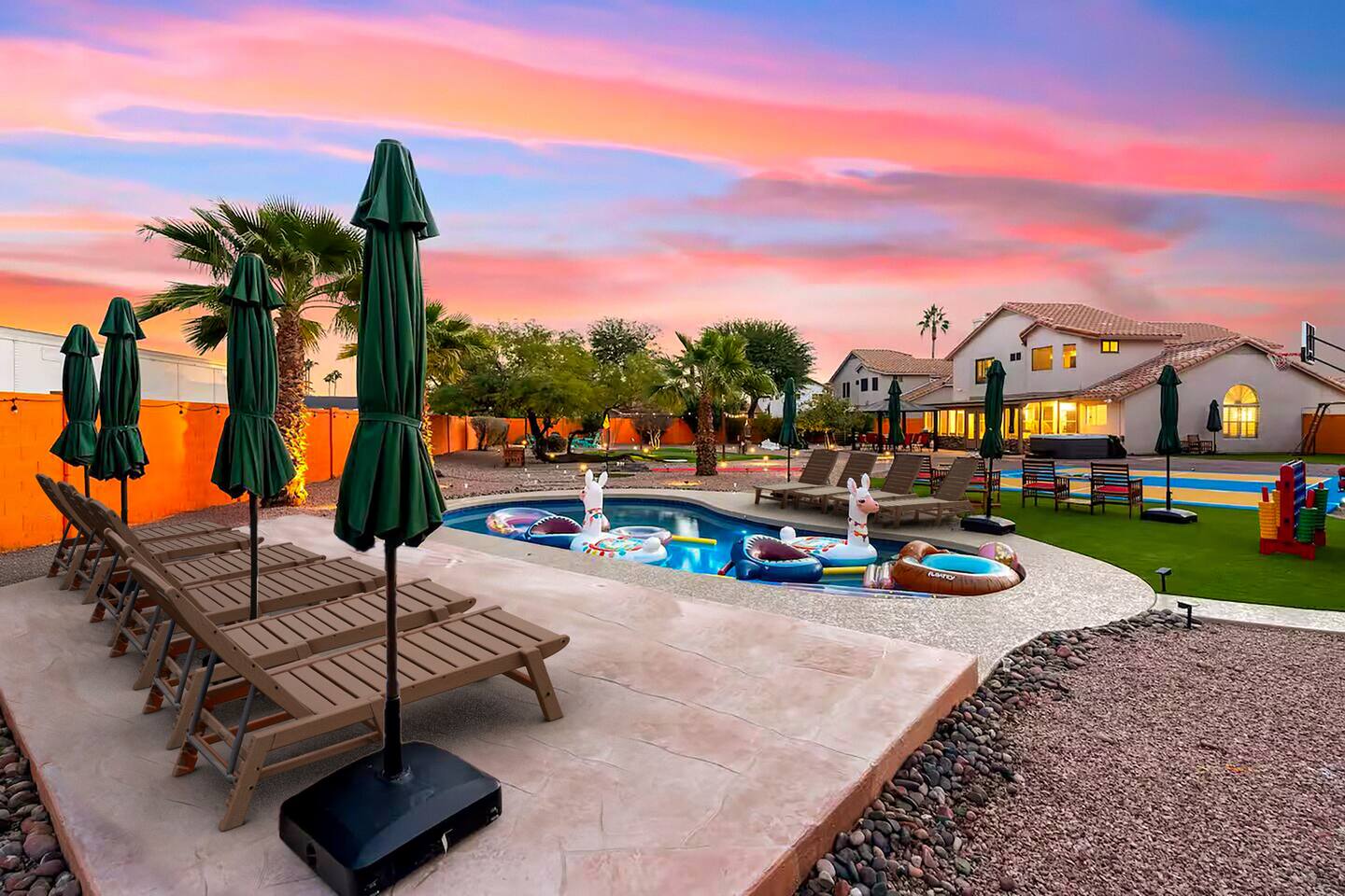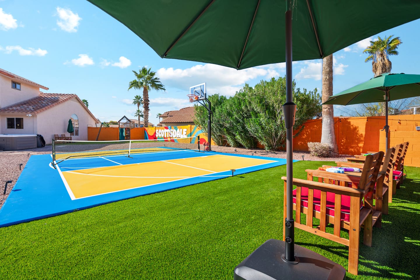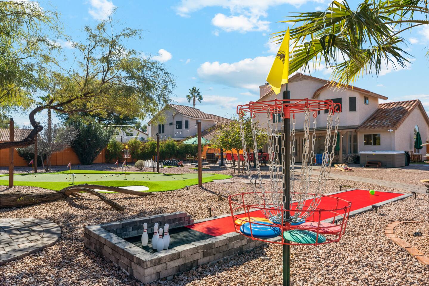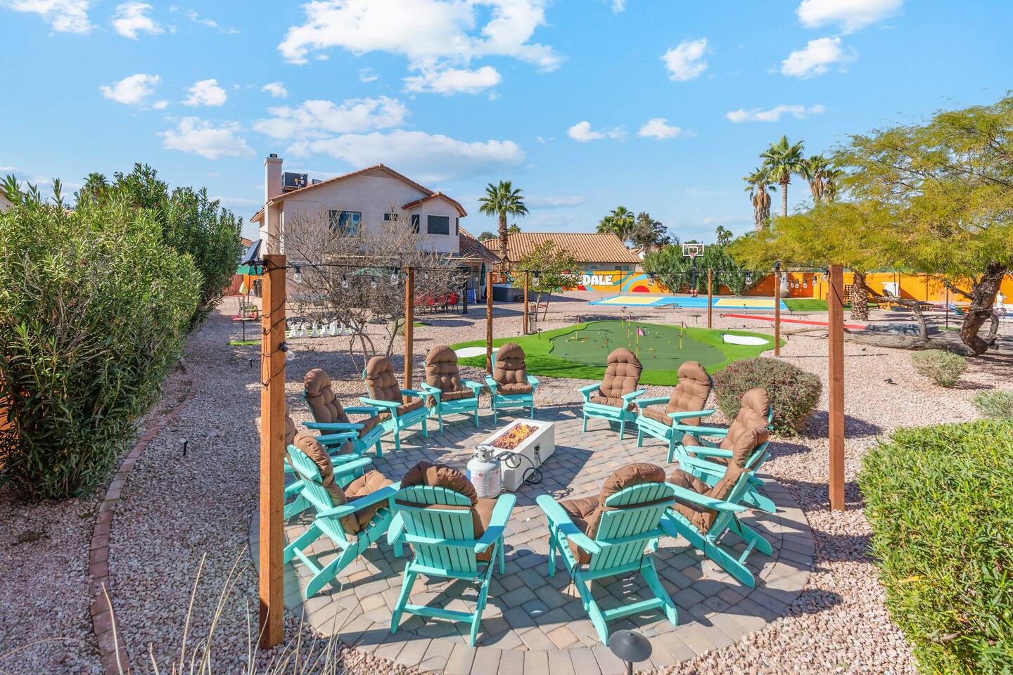 KEY FEATURES: ☀ 5 beautiful bedrooms; 3 kings, 4 fulls, & 4 twin beds ☀ 2.5 modern bathrooms ☀ Modern kitchen with new, stainless steel appliances ☀ Open living room with lots of comfy seating & smart TV ☀ Dining room with seating to comfortably accommodate 14 (+ outdoor dining options) ☀ Bright, vibrant game room with pool table! ☀ UNBELIEVABLE backyard; heated pool, hot tub, fire pit, mini golf, basketball court, & much more! Here Are A Few Kind Words From Our Past Guests: “This was a great place to stay! The morning light through the windows was so beautiful. Overall, just a relaxing experience. The hosts were super responsive whenever I had a question. I would stay again!” - Emily “Sabrina was very accommodating and communicative. the house is beautiful and very comfortable, close to nature hikes.” - Jennifer “This place was lovely! Exactly as pictured! Very clean and excellent host experience!!! I plan to come back again!” - Regina ☆☆ BEDROOMS ☆☆ You'll find 5 bedrooms throughout this home. Downstairs, there is a FUN filled bunk bedroom, with two twin-over-full bunk beds, smart TV, shuffleboard, and arcade game. Upstairs are the four remaining bedrooms. Three bedrooms have one king bed & a smart TV in each, while the fifth bedroom has two twin-over-full bunk beds & an private ensuite bathroom. ☆☆ BATHROOMS ☆☆ There are two and a half modern bathrooms throughout the home. Downstairs, the half bathroom has a sink & toilet only. Upstairs, the private master ensuite has two sinks, a toilet, walk-in shower, and a soaking tub. The hallway bathroom upstairs also has two sinks, a toilet, & shower/tub combo. ☆☆ KITCHEN & DINING ☆☆ The modern kitchen is located right off of the main living areas, and is loaded with all new stainless steel appliances & a coffee station (including a Keurig & coffee pods). The dining room is right next to the kitchen, with enough seating to comfortably fit 14 people (between two dining tables), + lots of room for outdoor dining! ☆☆ LIVING ROOM ☆☆ In the living room, you’ll be greeted with lots of comfy seating, a big smart TV, and a beautiful, bright design that is carried throughout the rest of the home. This is the perfect spot to host your movie nights & games with your friends and family! ☆☆ GAME ROOM ☆☆ Right next to the main living areas, you'll find the pool table room, along with a comfy sofa & smart TV. It will take your breath away as you enter this home! ☆☆ OUTDOOR SPACE ☆☆ This backyard is everything you could ask for, and more! ☀ Heated pool ☀ Hot tub ☀ Mini golf ☀ Basketball court ☀ Pickleball court ☀ Bowling ☀ Ping pong ☀ Giant chess ☀ Frisbee golf ☀ Fire pit ☀ Corn hole ☀ Jungle gym ☀ Giant Jenga ☀ BBQ grill ☀ Sun bathing chairs ☀ Lounge seating ☀ Covered outdoor dining There is so much to do here, that all of your friends & family will be thoroughly entertained throughout your entire stay. No matter the season, this backyard has it all. Book your stay with us today and you will NOT be disappointed. Get ready for a vacation you will never forget! ★☆ Book Now & Let Us Take Care Of You In Scottsdale! ☆★