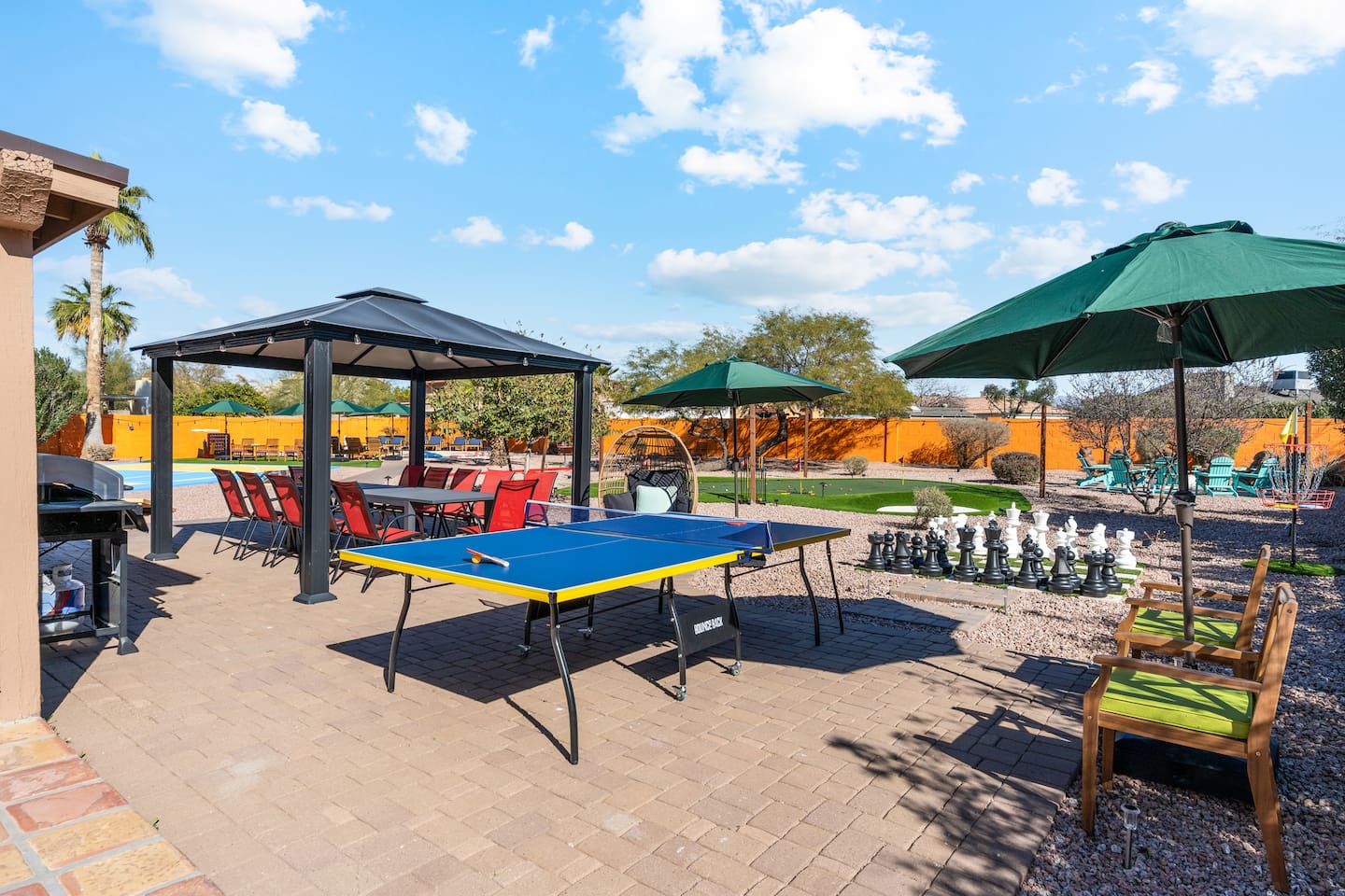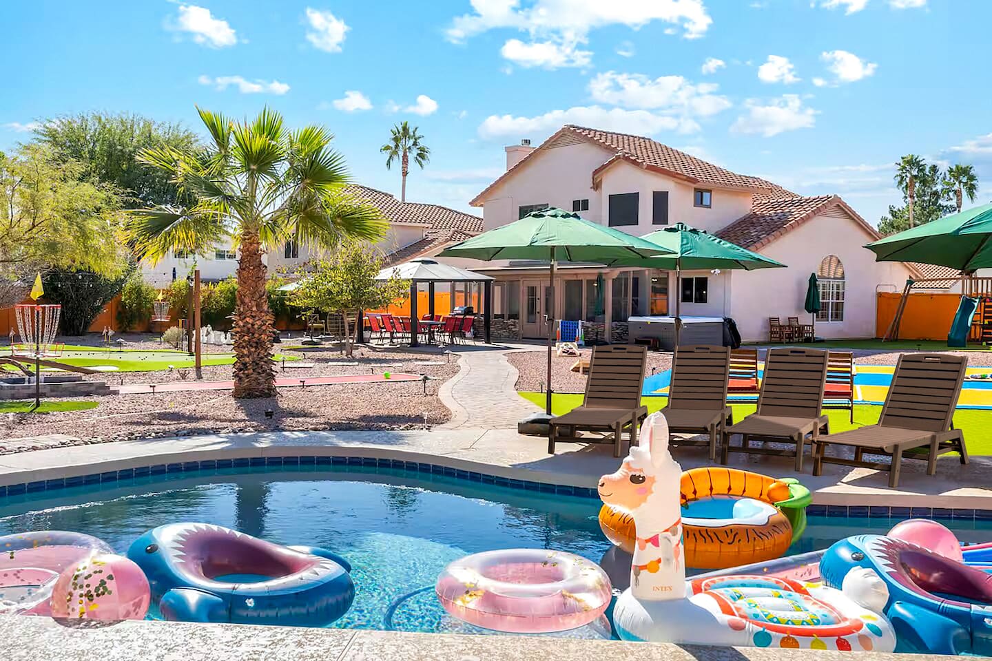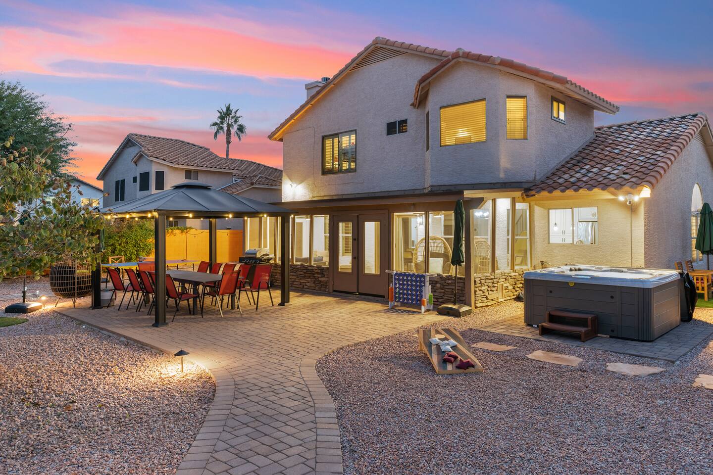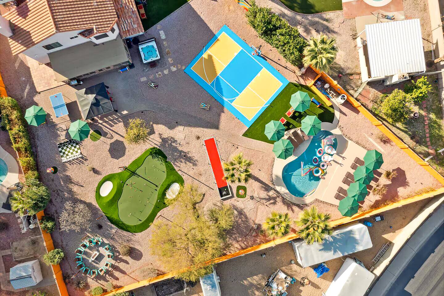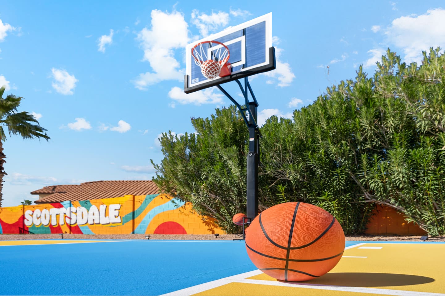 KEY FEATURES: ☀ 5 beautiful bedrooms; 3 kings, 4 fulls, & 4 twin beds ☀ 2.5 modern bathrooms ☀ Modern kitchen with new, stainless steel appliances ☀ Open living room with lots of comfy seating & smart TV ☀ Dining room with seating to comfortably accommodate 14 (+ outdoor dining options) ☀ Bright, vibrant game room with pool table! ☀ UNBELIEVABLE backyard; heated pool, hot tub, fire pit, mini golf, basketball court, & much more! Here Are A Few Kind Words From Our Past Guests: “This was a great place to stay! The morning light through the windows was so beautiful. Overall, just a relaxing experience. The hosts were super responsive whenever I had a question. I would stay again!” - Emily “Sabrina was very accommodating and communicative. the house is beautiful and very comfortable, close to nature hikes.” - Jennifer “This place was lovely! Exactly as pictured! Very clean and excellent host experience!!! I plan to come back again!” - Regina ☆☆ BEDROOMS ☆☆ You'll find 5 bedrooms throughout this home. Downstairs, there is a FUN filled bunk bedroom, with two twin-over-full bunk beds, smart TV, shuffleboard, and arcade game. Upstairs are the four remaining bedrooms. Three bedrooms have one king bed & a smart TV in each, while the fifth bedroom has two twin-over-full bunk beds & an private ensuite bathroom. ☆☆ BATHROOMS ☆☆ There are two and a half modern bathrooms throughout the home. Downstairs, the half bathroom has a sink & toilet only. Upstairs, the private master ensuite has two sinks, a toilet, walk-in shower, and a soaking tub. The hallway bathroom upstairs also has two sinks, a toilet, & shower/tub combo. ☆☆ KITCHEN & DINING ☆☆ The modern kitchen is located right off of the main living areas, and is loaded with all new stainless steel appliances & a coffee station (including a Keurig & coffee pods). The dining room is right next to the kitchen, with enough seating to comfortably fit 14 people (between two dining tables), + lots of room for outdoor dining! ☆☆ LIVING ROOM ☆☆ In the living room, you’ll be greeted with lots of comfy seating, a big smart TV, and a beautiful, bright design that is carried throughout the rest of the home. This is the perfect spot to host your movie nights & games with your friends and family! ☆☆ GAME ROOM ☆☆ Right next to the main living areas, you'll find the pool table room, along with a comfy sofa & smart TV. It will take your breath away as you enter this home! ☆☆ OUTDOOR SPACE ☆☆ This backyard is everything you could ask for, and more! ☀ Heated pool ☀ Hot tub ☀ Mini golf ☀ Basketball court ☀ Pickleball court ☀ Bowling ☀ Ping pong ☀ Giant chess ☀ Frisbee golf ☀ Fire pit ☀ Corn hole ☀ Jungle gym ☀ Giant Jenga ☀ BBQ grill ☀ Sun bathing chairs ☀ Lounge seating ☀ Covered outdoor dining There is so much to do here, that all of your friends & family will be thoroughly entertained throughout your entire stay. No matter the season, this backyard has it all. Book your stay with us today and you will NOT be disappointed. Get ready for a vacation you will never forget! ★☆ Book Now & Let Us Take Care Of You In Scottsdale! ☆★