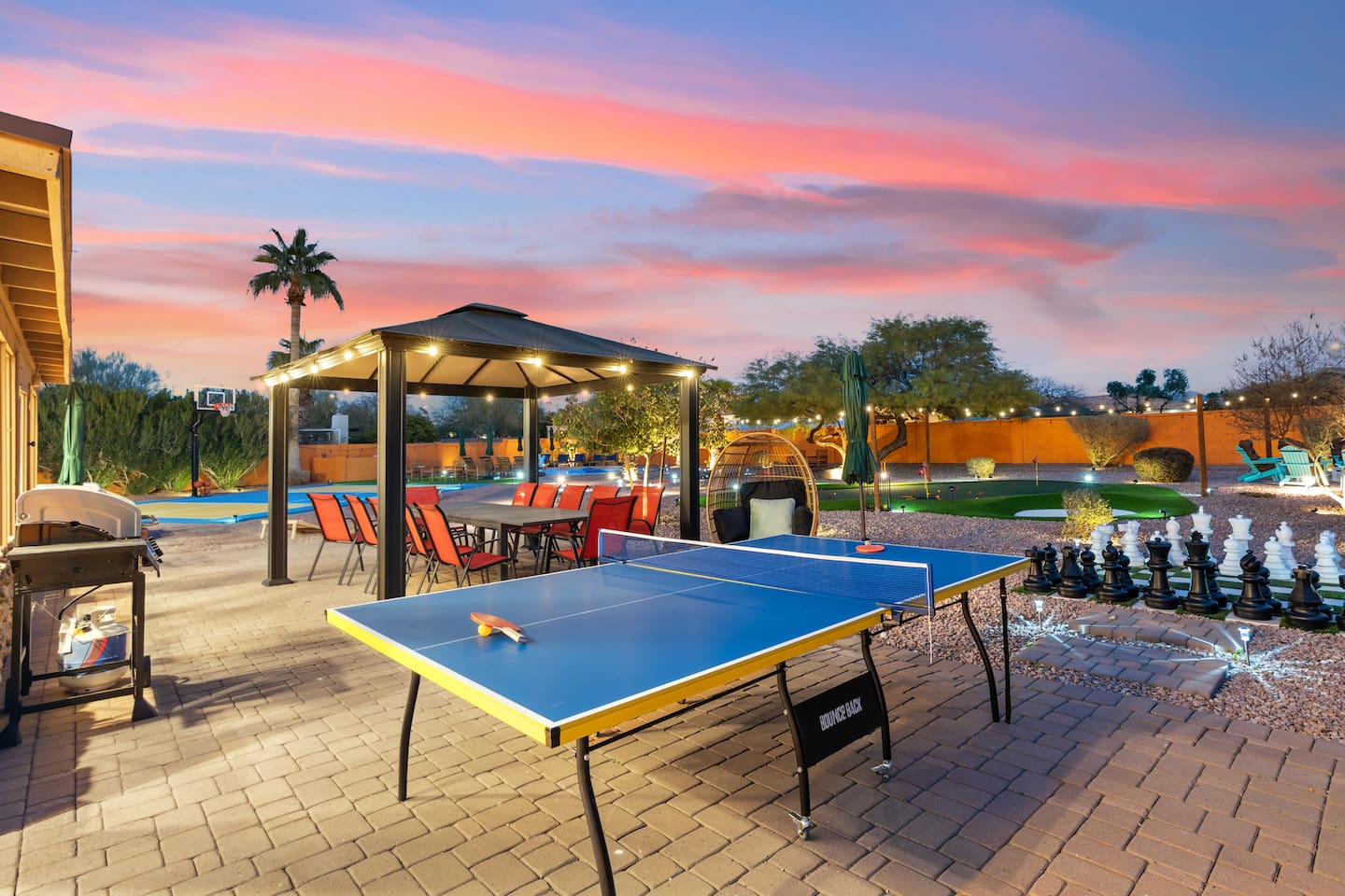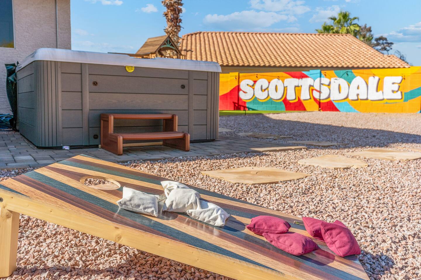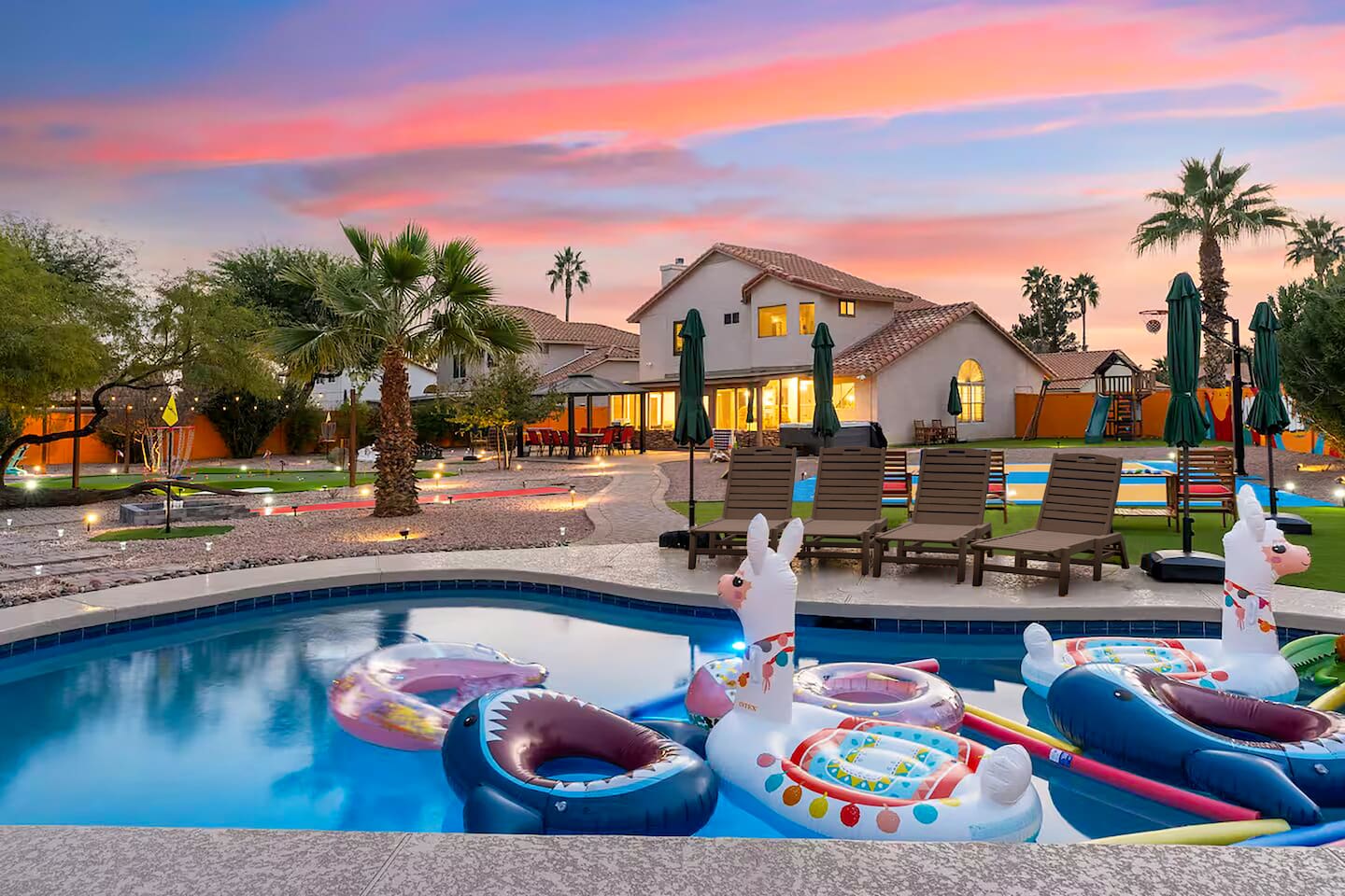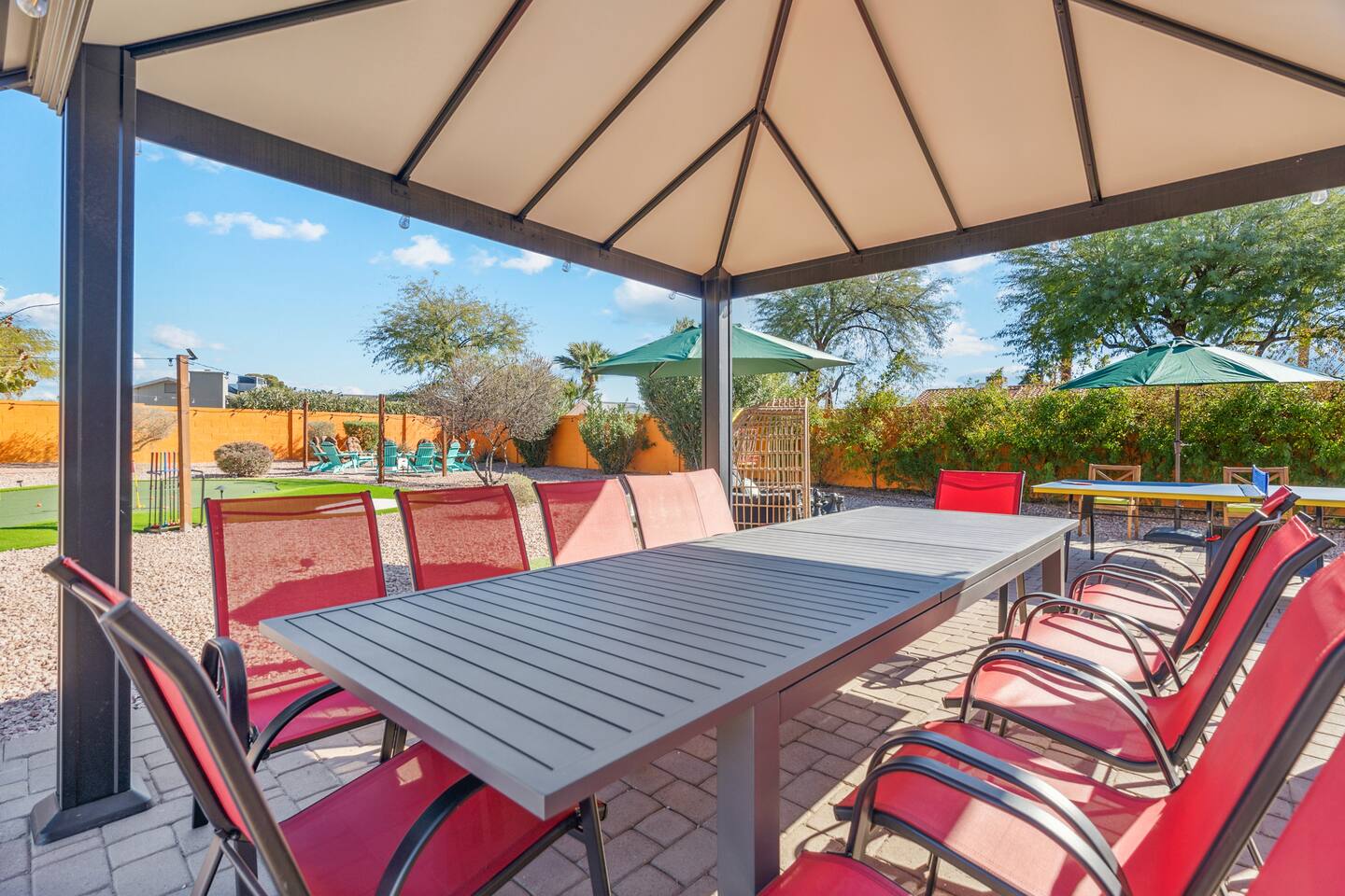 KEY FEATURES: ☀ 5 beautiful bedrooms; 3 kings, 4 fulls, & 4 twin beds ☀ 2.5 modern bathrooms ☀ Modern kitchen with new, stainless steel appliances ☀ Open living room with lots of comfy seating & smart TV ☀ Dining room with seating to comfortably accommodate 14 (+ outdoor dining options) ☀ Bright, vibrant game room with pool table! ☀ UNBELIEVABLE backyard; heated pool, hot tub, fire pit, mini golf, basketball court, & much more! Here Are A Few Kind Words From Our Past Guests: “This was a great place to stay! The morning light through the windows was so beautiful. Overall, just a relaxing experience. The hosts were super responsive whenever I had a question. I would stay again!” - Emily “Sabrina was very accommodating and communicative. the house is beautiful and very comfortable, close to nature hikes.” - Jennifer “This place was lovely! Exactly as pictured! Very clean and excellent host experience!!! I plan to come back again!” - Regina ☆☆ BEDROOMS ☆☆ You'll find 5 bedrooms throughout this home. Downstairs, there is a FUN filled bunk bedroom, with two twin-over-full bunk beds, smart TV, shuffleboard, and arcade game. Upstairs are the four remaining bedrooms. Three bedrooms have one king bed & a smart TV in each, while the fifth bedroom has two twin-over-full bunk beds & an private ensuite bathroom. ☆☆ BATHROOMS ☆☆ There are two and a half modern bathrooms throughout the home. Downstairs, the half bathroom has a sink & toilet only. Upstairs, the private master ensuite has two sinks, a toilet, walk-in shower, and a soaking tub. The hallway bathroom upstairs also has two sinks, a toilet, & shower/tub combo. ☆☆ KITCHEN & DINING ☆☆ The modern kitchen is located right off of the main living areas, and is loaded with all new stainless steel appliances & a coffee station (including a Keurig & coffee pods). The dining room is right next to the kitchen, with enough seating to comfortably fit 14 people (between two dining tables), + lots of room for outdoor dining! ☆☆ LIVING ROOM ☆☆ In the living room, you’ll be greeted with lots of comfy seating, a big smart TV, and a beautiful, bright design that is carried throughout the rest of the home. This is the perfect spot to host your movie nights & games with your friends and family! ☆☆ GAME ROOM ☆☆ Right next to the main living areas, you'll find the pool table room, along with a comfy sofa & smart TV. It will take your breath away as you enter this home! ☆☆ OUTDOOR SPACE ☆☆ This backyard is everything you could ask for, and more! ☀ Heated pool ☀ Hot tub ☀ Mini golf ☀ Basketball court ☀ Pickleball court ☀ Bowling ☀ Ping pong ☀ Giant chess ☀ Frisbee golf ☀ Fire pit ☀ Corn hole ☀ Jungle gym ☀ Giant Jenga ☀ BBQ grill ☀ Sun bathing chairs ☀ Lounge seating ☀ Covered outdoor dining There is so much to do here, that all of your friends & family will be thoroughly entertained throughout your entire stay. No matter the season, this backyard has it all. Book your stay with us today and you will NOT be disappointed. Get ready for a vacation you will never forget! ★☆ Book Now & Let Us Take Care Of You In Scottsdale! ☆★
