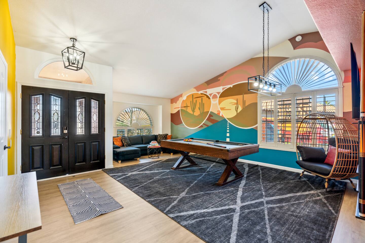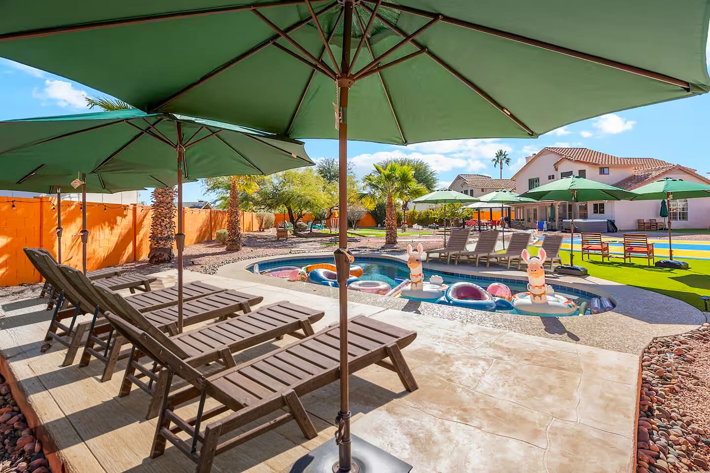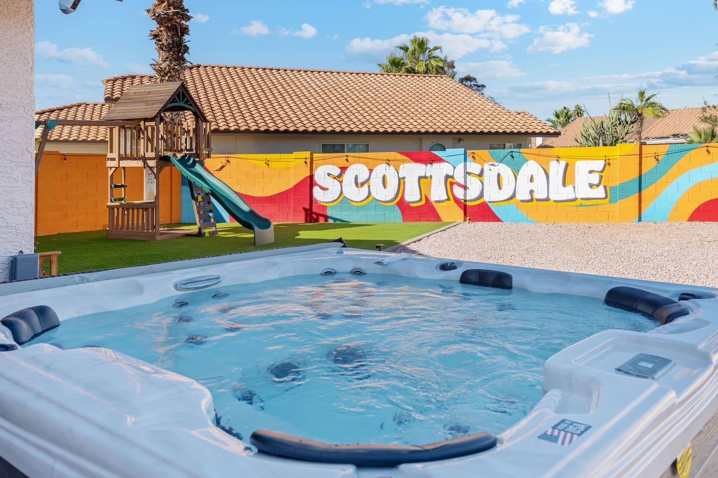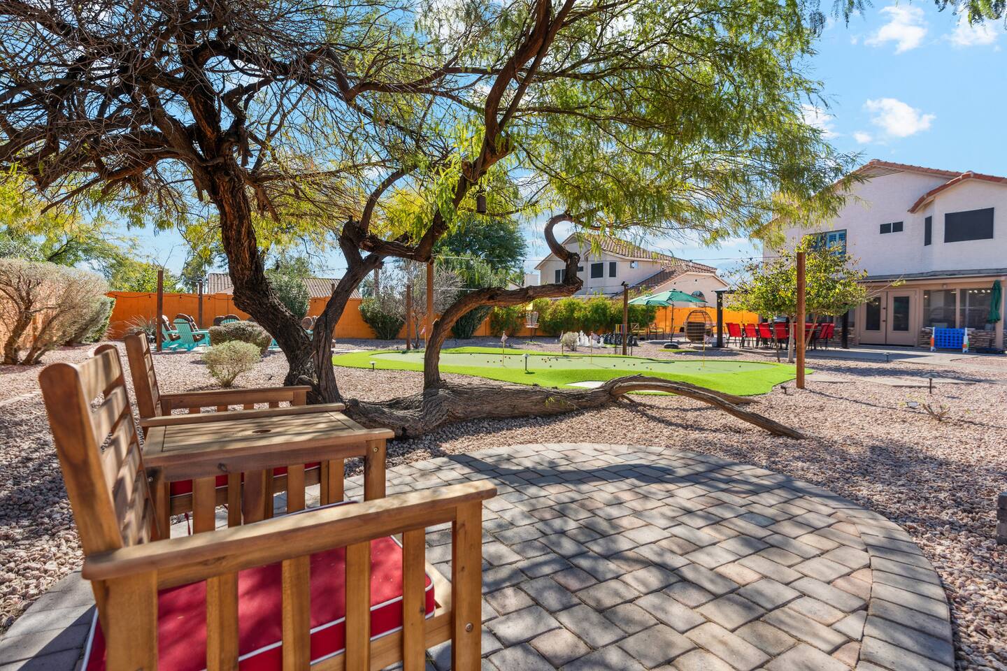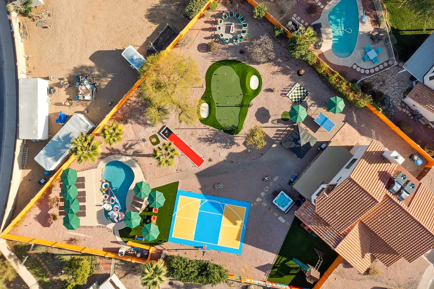 KEY FEATURES: ☀ 5 beautiful bedrooms; 3 kings, 4 fulls, & 4 twin beds ☀ 2.5 modern bathrooms ☀ Modern kitchen with new, stainless steel appliances ☀ Open living room with lots of comfy seating & smart TV ☀ Dining room with seating to comfortably accommodate 14 (+ outdoor dining options) ☀ Bright, vibrant game room with pool table! ☀ UNBELIEVABLE backyard; heated pool, hot tub, fire pit, mini golf, basketball court, & much more! Here Are A Few Kind Words From Our Past Guests: “This was a great place to stay! The morning light through the windows was so beautiful. Overall, just a relaxing experience. The hosts were super responsive whenever I had a question. I would stay again!” - Emily “Sabrina was very accommodating and communicative. the house is beautiful and very comfortable, close to nature hikes.” - Jennifer “This place was lovely! Exactly as pictured! Very clean and excellent host experience!!! I plan to come back again!” - Regina ☆☆ BEDROOMS ☆☆ You'll find 5 bedrooms throughout this home. Downstairs, there is a FUN filled bunk bedroom, with two twin-over-full bunk beds, smart TV, shuffleboard, and arcade game. Upstairs are the four remaining bedrooms. Three bedrooms have one king bed & a smart TV in each, while the fifth bedroom has two twin-over-full bunk beds & an private ensuite bathroom. ☆☆ BATHROOMS ☆☆ There are two and a half modern bathrooms throughout the home. Downstairs, the half bathroom has a sink & toilet only. Upstairs, the private master ensuite has two sinks, a toilet, walk-in shower, and a soaking tub. The hallway bathroom upstairs also has two sinks, a toilet, & shower/tub combo. ☆☆ KITCHEN & DINING ☆☆ The modern kitchen is located right off of the main living areas, and is loaded with all new stainless steel appliances & a coffee station (including a Keurig & coffee pods). The dining room is right next to the kitchen, with enough seating to comfortably fit 14 people (between two dining tables), + lots of room for outdoor dining! ☆☆ LIVING ROOM ☆☆ In the living room, you’ll be greeted with lots of comfy seating, a big smart TV, and a beautiful, bright design that is carried throughout the rest of the home. This is the perfect spot to host your movie nights & games with your friends and family! ☆☆ GAME ROOM ☆☆ Right next to the main living areas, you'll find the pool table room, along with a comfy sofa & smart TV. It will take your breath away as you enter this home! ☆☆ OUTDOOR SPACE ☆☆ This backyard is everything you could ask for, and more! ☀ Heated pool ☀ Hot tub ☀ Mini golf ☀ Basketball court ☀ Pickleball court ☀ Bowling ☀ Ping pong ☀ Giant chess ☀ Frisbee golf ☀ Fire pit ☀ Corn hole ☀ Jungle gym ☀ Giant Jenga ☀ BBQ grill ☀ Sun bathing chairs ☀ Lounge seating ☀ Covered outdoor dining There is so much to do here, that all of your friends & family will be thoroughly entertained throughout your entire stay. No matter the season, this backyard has it all. Book your stay with us today and you will NOT be disappointed. Get ready for a vacation you will never forget! ★☆ Book Now & Let Us Take Care Of You In Scottsdale! ☆★