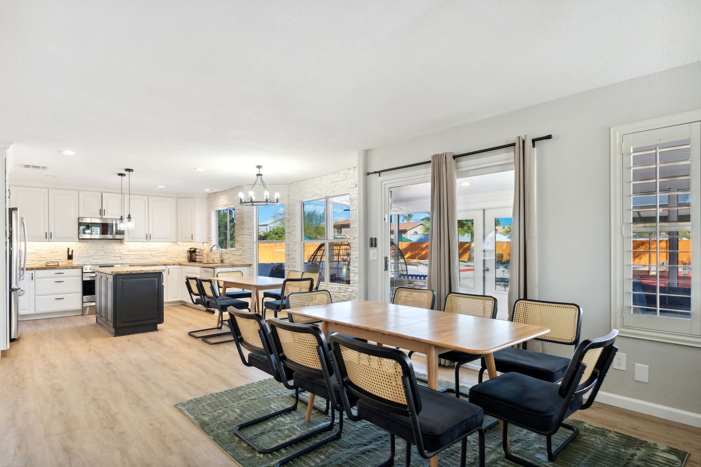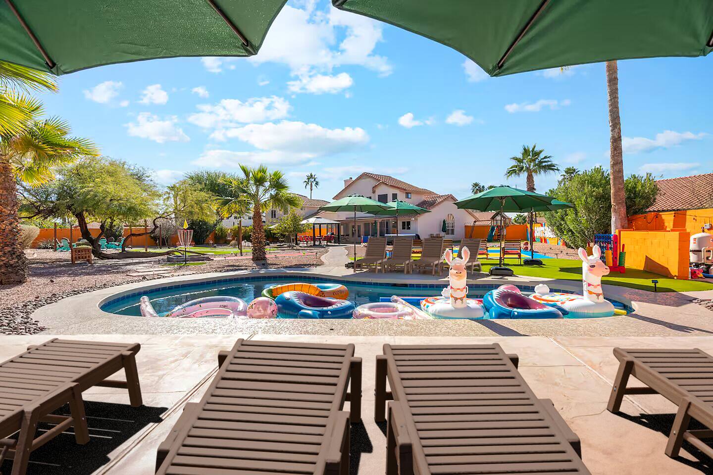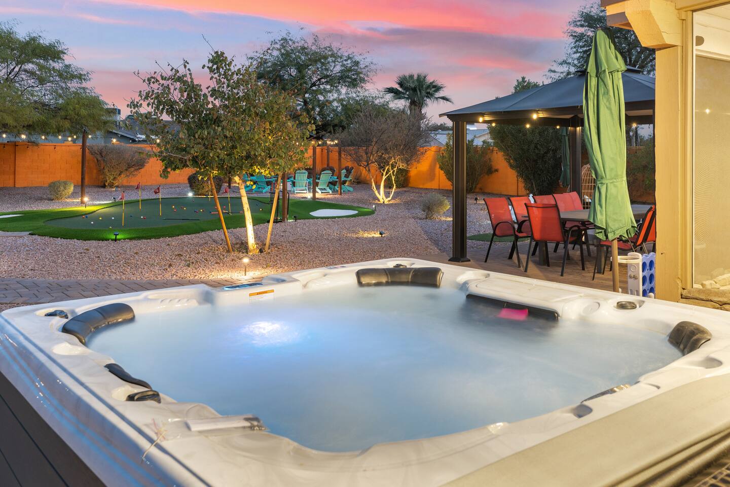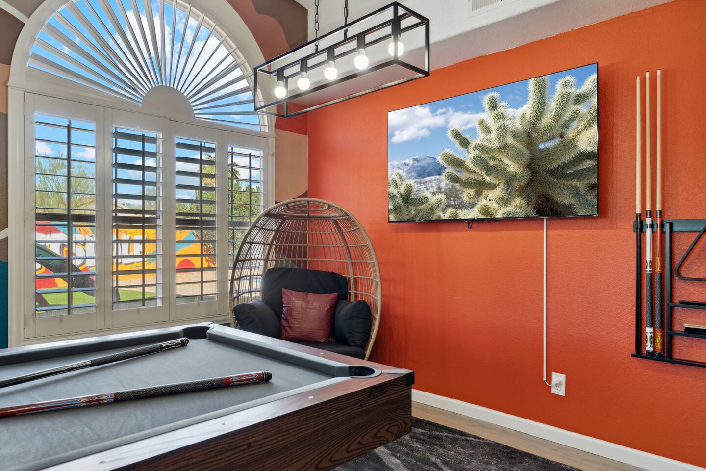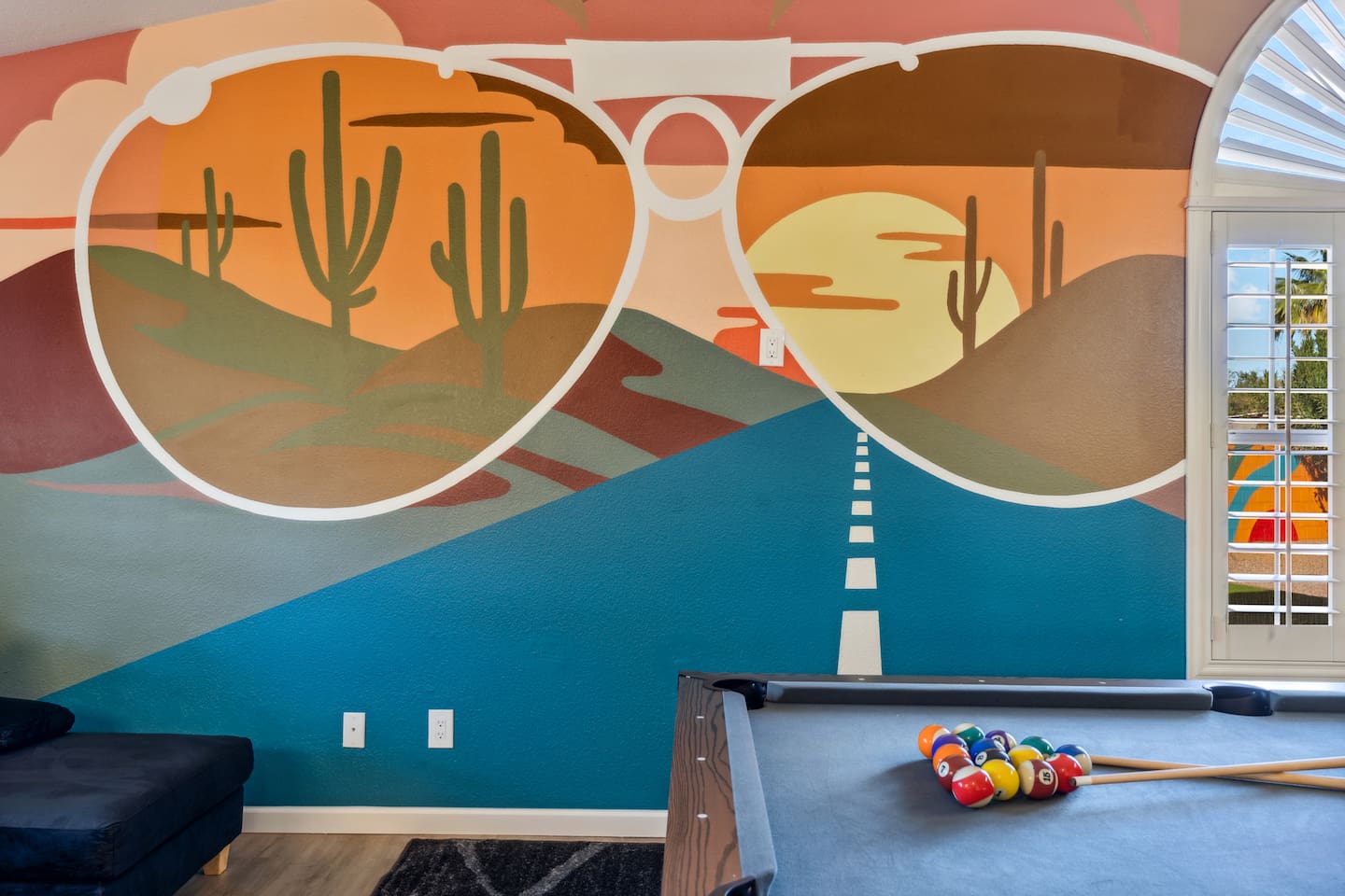 KEY FEATURES: ☀ 5 beautiful bedrooms; 3 kings, 4 fulls, & 4 twin beds ☀ 2.5 modern bathrooms ☀ Modern kitchen with new, stainless steel appliances ☀ Open living room with lots of comfy seating & smart TV ☀ Dining room with seating to comfortably accommodate 14 (+ outdoor dining options) ☀ Bright, vibrant game room with pool table! ☀ UNBELIEVABLE backyard; heated pool, hot tub, fire pit, mini golf, basketball court, & much more! Here Are A Few Kind Words From Our Past Guests: “This was a great place to stay! The morning light through the windows was so beautiful. Overall, just a relaxing experience. The hosts were super responsive whenever I had a question. I would stay again!” - Emily “Sabrina was very accommodating and communicative. the house is beautiful and very comfortable, close to nature hikes.” - Jennifer “This place was lovely! Exactly as pictured! Very clean and excellent host experience!!! I plan to come back again!” - Regina ☆☆ BEDROOMS ☆☆ You'll find 5 bedrooms throughout this home. Downstairs, there is a FUN filled bunk bedroom, with two twin-over-full bunk beds, smart TV, shuffleboard, and arcade game. Upstairs are the four remaining bedrooms. Three bedrooms have one king bed & a smart TV in each, while the fifth bedroom has two twin-over-full bunk beds & an private ensuite bathroom. ☆☆ BATHROOMS ☆☆ There are two and a half modern bathrooms throughout the home. Downstairs, the half bathroom has a sink & toilet only. Upstairs, the private master ensuite has two sinks, a toilet, walk-in shower, and a soaking tub. The hallway bathroom upstairs also has two sinks, a toilet, & shower/tub combo. ☆☆ KITCHEN & DINING ☆☆ The modern kitchen is located right off of the main living areas, and is loaded with all new stainless steel appliances & a coffee station (including a Keurig & coffee pods). The dining room is right next to the kitchen, with enough seating to comfortably fit 14 people (between two dining tables), + lots of room for outdoor dining! ☆☆ LIVING ROOM ☆☆ In the living room, you’ll be greeted with lots of comfy seating, a big smart TV, and a beautiful, bright design that is carried throughout the rest of the home. This is the perfect spot to host your movie nights & games with your friends and family! ☆☆ GAME ROOM ☆☆ Right next to the main living areas, you'll find the pool table room, along with a comfy sofa & smart TV. It will take your breath away as you enter this home! ☆☆ OUTDOOR SPACE ☆☆ This backyard is everything you could ask for, and more! ☀ Heated pool ☀ Hot tub ☀ Mini golf ☀ Basketball court ☀ Pickleball court ☀ Bowling ☀ Ping pong ☀ Giant chess ☀ Frisbee golf ☀ Fire pit ☀ Corn hole ☀ Jungle gym ☀ Giant Jenga ☀ BBQ grill ☀ Sun bathing chairs ☀ Lounge seating ☀ Covered outdoor dining There is so much to do here, that all of your friends & family will be thoroughly entertained throughout your entire stay. No matter the season, this backyard has it all. Book your stay with us today and you will NOT be disappointed. Get ready for a vacation you will never forget! ★☆ Book Now & Let Us Take Care Of You In Scottsdale! ☆★