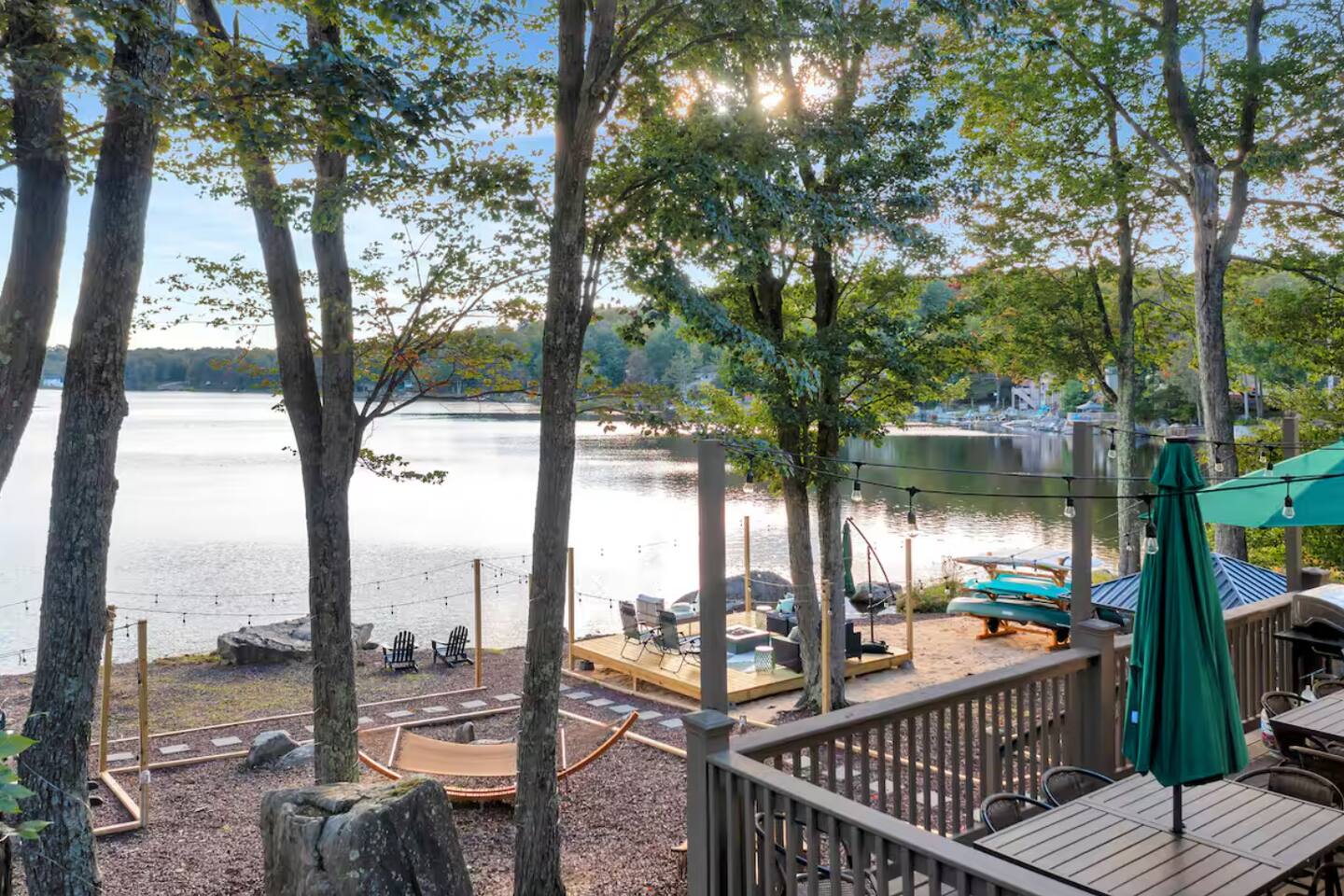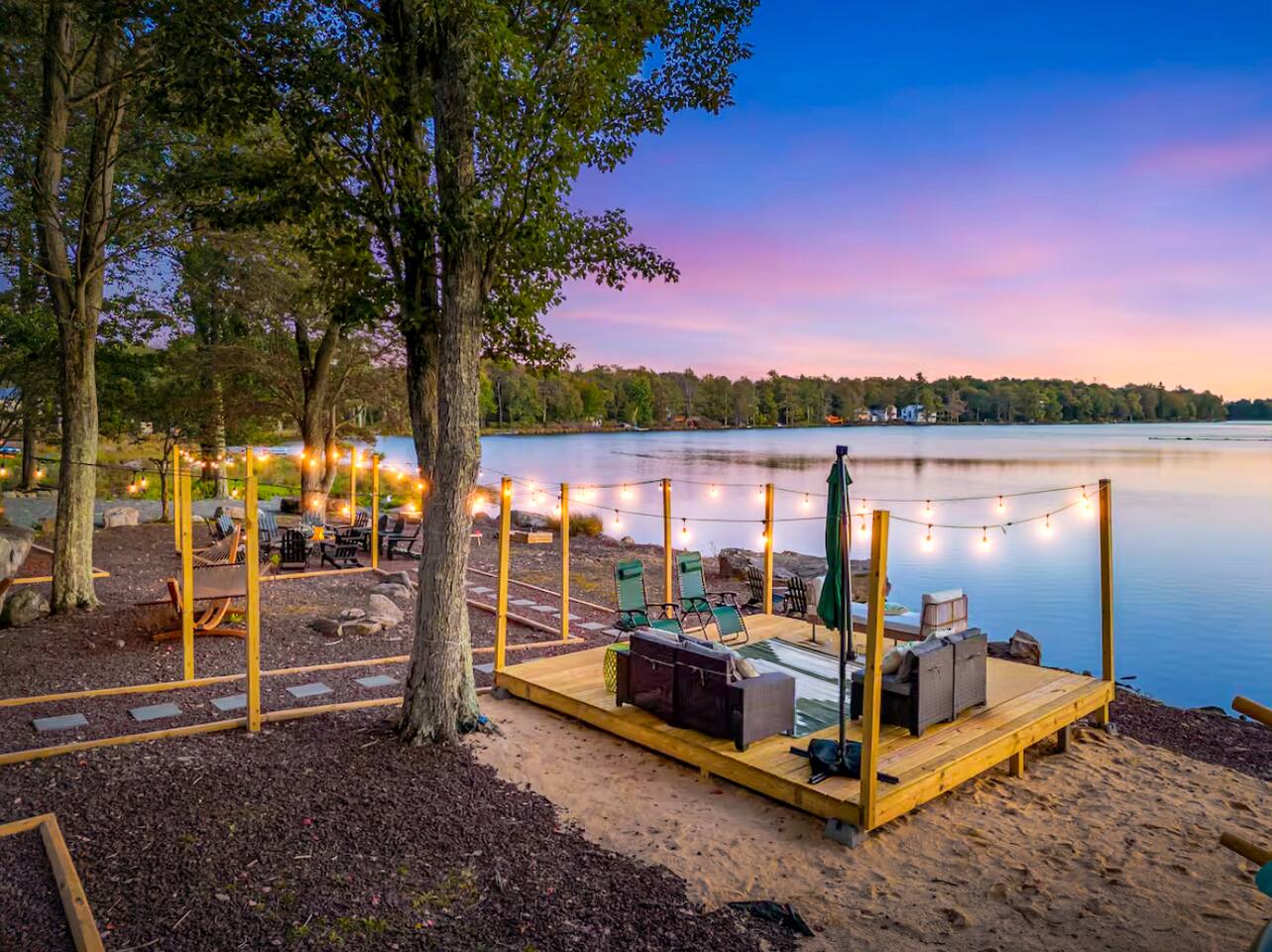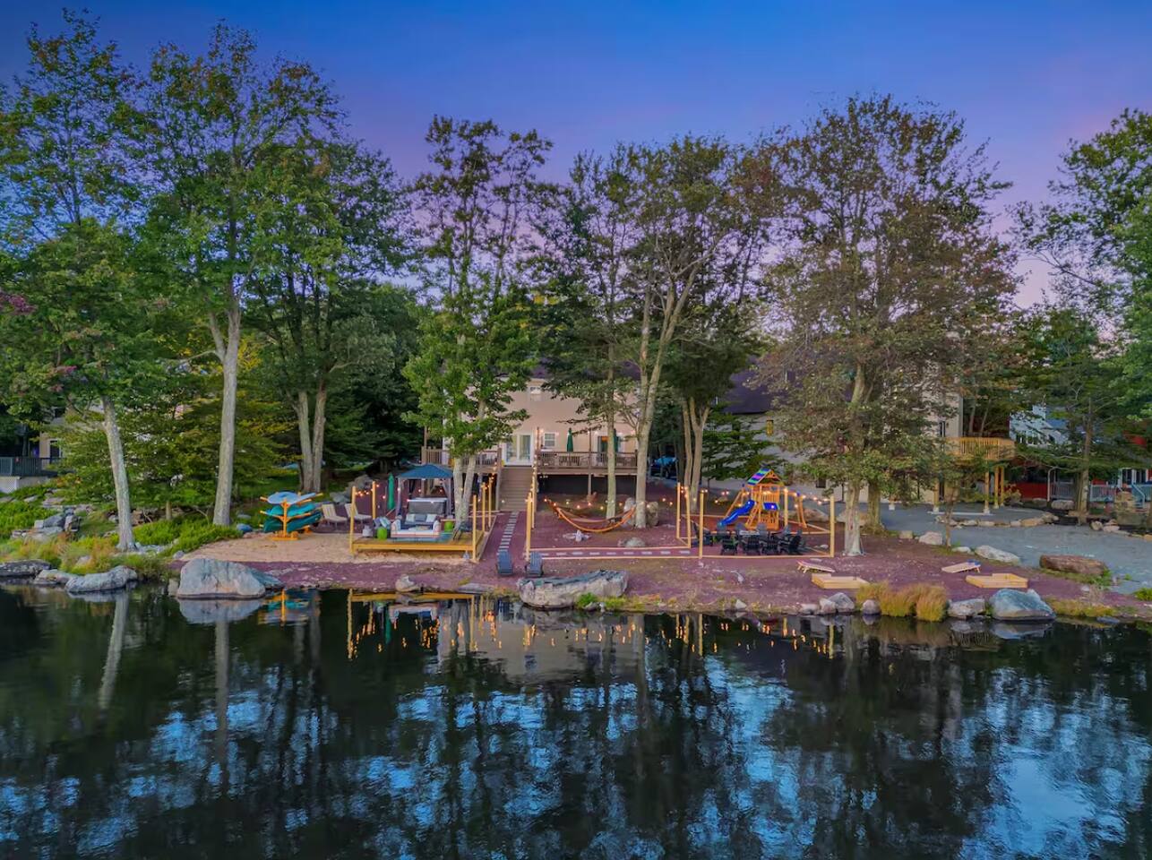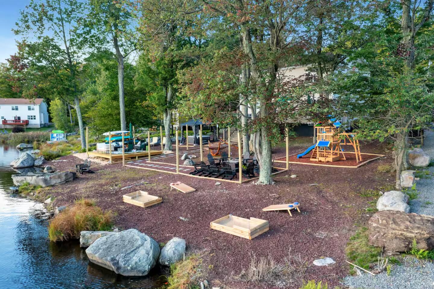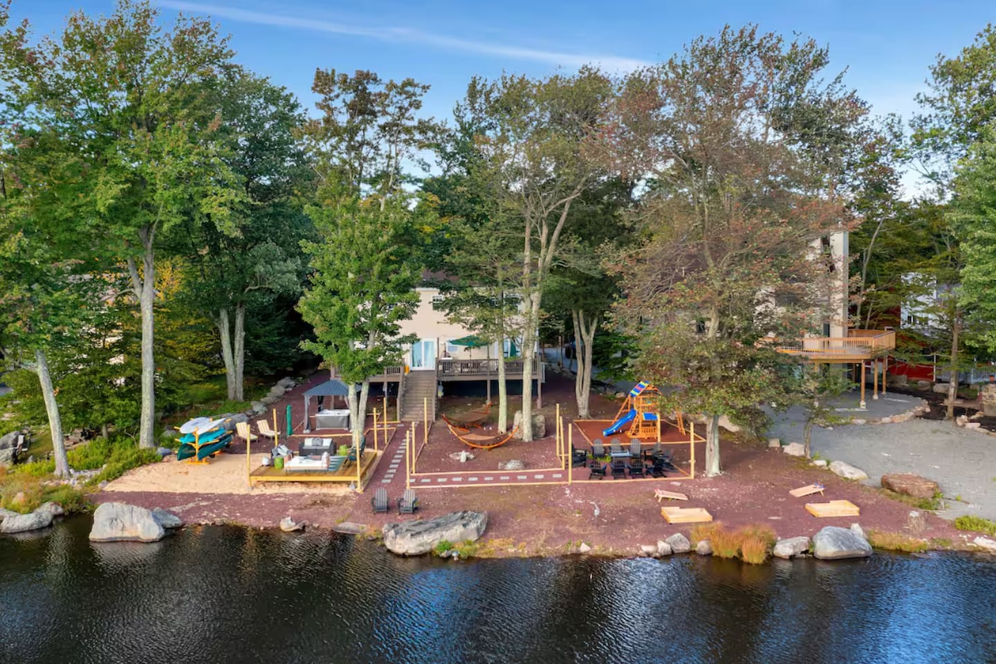 **During the summer months (Memorial Day weekend - Labor Day weekend), you will have the option to purchase amenity passes that allow you to access the following amenities** ☀ Lakes (with beach access - swimming allowed!) ☀ Pools ☀ Tennis courts ☀ Basketball courts ☀ Dog park ☀ Playground areas KEY FEATURES: ☀ 5 beautiful bedrooms; 2 kings, 2 queens, 2 fulls, 1 twin bed, & 1 trundle bed (beneath the bunk bed) ☀ 2 full bathrooms & 2 half bathrooms ☀ Modern kitchen with new, stainless steel appliances ☀ Open living room with lots of comfy seating & smart TV ☀ Dining room with seating to comfortably accommodate 10 (+ 4 more in the breakfast nook & additional dining on the back deck) ☀ AMAZING game room; pool table, arcade, movie theater, & more! ☀ STUNNING lakefront backyard; hot tub, wood burning fire pit, kayaks, jungle gym, & much more! Here Are A Few Kind Words From Our Past Guests: “This was a great place to stay! The morning light through the windows was so beautiful. Overall, just a relaxing experience. The hosts were super responsive whenever I had a question. I would stay again!” - Emily “Sabrina was very accommodating and communicative. the house is beautiful and very comfortable, close to nature hikes.” - Jennifer “This place was lovely! Exactly as pictured! Very clean and excellent host experience!!! I plan to come back again!” - Regina ☆☆ BEDROOMS ☆☆ You'll find 5 beautiful bedrooms throughout this home. On the main floor, the first bedroom has a king bed & smart TV. Upstairs, there is one bedroom with a king bed, two more bedrooms with a queen bed in each, and the fifth bedroom with a full-over-full bunk (+ trundle bed) & a twin bed. Each bedroom in this home has its own smart TV. ☆☆ BATHROOMS ☆☆ There are 2 full bathrooms & 2 half bathrooms in this home. One half bathroom is in the basement game room, while the other is on the main level. Upstairs, the master bedroom has a private ensuite bathroom, with a sink, toilet, and shower/tub combo. The other full bathroom is right down the hallway, also with a sink, toilet, and shower/tub combo. ☆☆ KITCHEN & DINING ☆☆ The modern kitchen is located right off of the main living areas, and is loaded with all new stainless steel appliances & a coffee station (including a Keurig & coffee pods). There is also a breakfast nook with a small dining table, enough to seat 4 people, with a great view of the lake right outside the back door! The dining room is right next to the kitchen, with enough seating to comfortably fit 10 people, also with gorgeous views of the lake! ☆☆ LIVING ROOM ☆☆ In the living room, you’ll be greeted with lots of comfy seating and a big smart TV. This is the perfect spot to host your movie nights & games with your friends and family! ☆☆ GAME ROOM ☆☆ Keep your family and friends entertained throughout your stay in our amenity-filled game room! Pool table, air hockey, foosball, basketball, arcade games, and a wet bar. Whether your reason for staying is to explore the town or stay at home and relax, this place will be the perfect spot to unwind! ☆☆ MOVIE THEATER ☆☆ Right next to the game room is a private movie theater room! With curtains to close off this space to be its own private theater, this is a truly unique experience that you will only find here. A HUGE 75 inch TV & comfy movie theater seats creates a cozy, private theater for just you and your family/friends to enjoy together! ☆☆ OUTDOOR SPACE ☆☆ This backyard is everything you could ask for, and more! ☀ Private beach-entry access to the lake ☀ Kayaks ☀ Surf boards ☀ Hot tub ☀ Fire pit (wood burning) ☀ Jungle gym ☀ Corn hole ☀ Ring toss ☀ Hammocks ☀ Sun loungers ☀ BBQ grill ☀ Outdoor lounge seating ☀ Outdoor dining There is so much to do here, that all of your friends & family will be thoroughly entertained throughout your entire stay. No matter the season, this backyard has it all. Book your stay with us today and you will NOT be disappointed. Get ready for a vacation you will never forget! ★☆ Book Now & Let Us Take Care Of You In The Poconos! ☆★