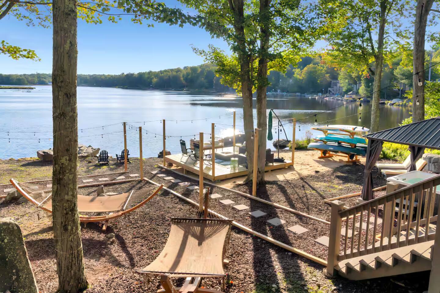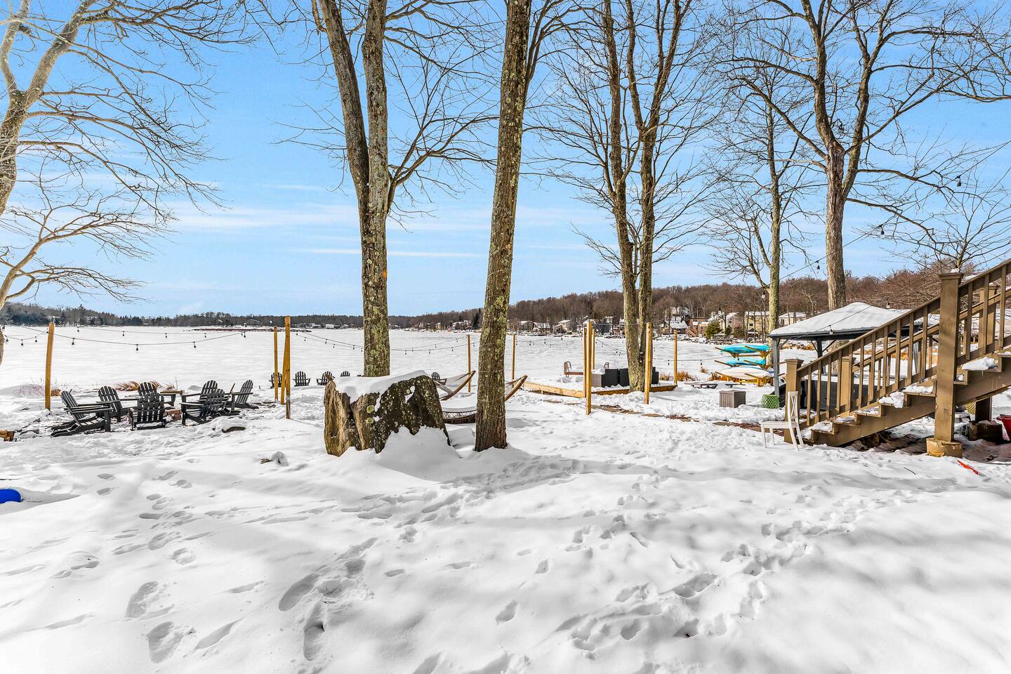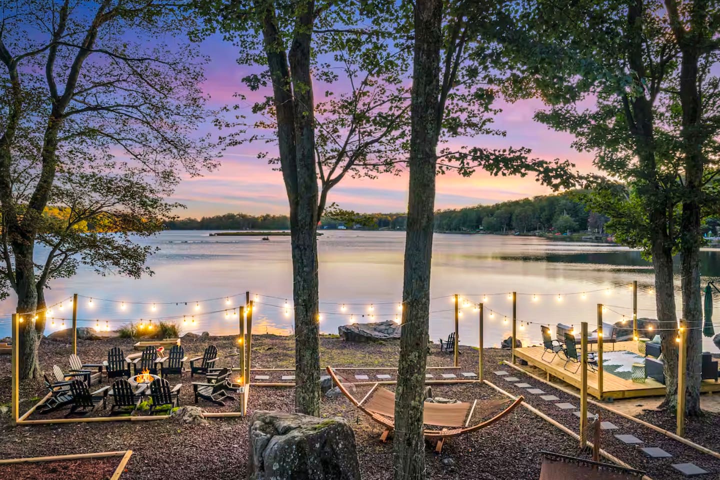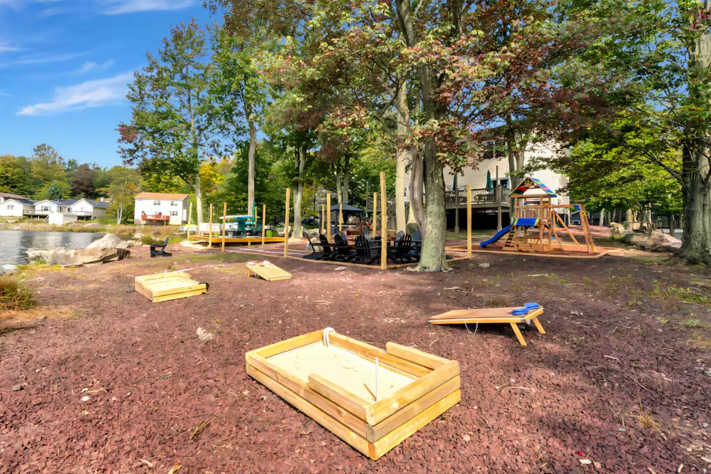 **During the summer months (Memorial Day weekend - Labor Day weekend), you will have the option to purchase amenity passes that allow you to access the following amenities** ☀ Lakes (with beach access - swimming allowed!) ☀ Pools ☀ Tennis courts ☀ Basketball courts ☀ Dog park ☀ Playground areas KEY FEATURES: ☀ 5 beautiful bedrooms; 2 kings, 2 queens, 2 fulls, 1 twin bed, & 1 trundle bed (beneath the bunk bed) ☀ 2 full bathrooms & 2 half bathrooms ☀ Modern kitchen with new, stainless steel appliances ☀ Open living room with lots of comfy seating & smart TV ☀ Dining room with seating to comfortably accommodate 10 (+ 4 more in the breakfast nook & additional dining on the back deck) ☀ AMAZING game room; pool table, arcade, movie theater, & more! ☀ STUNNING lakefront backyard; hot tub, wood burning fire pit, kayaks, jungle gym, & much more! Here Are A Few Kind Words From Our Past Guests: “This was a great place to stay! The morning light through the windows was so beautiful. Overall, just a relaxing experience. The hosts were super responsive whenever I had a question. I would stay again!” - Emily “Sabrina was very accommodating and communicative. the house is beautiful and very comfortable, close to nature hikes.” - Jennifer “This place was lovely! Exactly as pictured! Very clean and excellent host experience!!! I plan to come back again!” - Regina ☆☆ BEDROOMS ☆☆ You'll find 5 beautiful bedrooms throughout this home. On the main floor, the first bedroom has a king bed & smart TV. Upstairs, there is one bedroom with a king bed, two more bedrooms with a queen bed in each, and the fifth bedroom with a full-over-full bunk (+ trundle bed) & a twin bed. Each bedroom in this home has its own smart TV. ☆☆ BATHROOMS ☆☆ There are 2 full bathrooms & 2 half bathrooms in this home. One half bathroom is in the basement game room, while the other is on the main level. Upstairs, the master bedroom has a private ensuite bathroom, with a sink, toilet, and shower/tub combo. The other full bathroom is right down the hallway, also with a sink, toilet, and shower/tub combo. ☆☆ KITCHEN & DINING ☆☆ The modern kitchen is located right off of the main living areas, and is loaded with all new stainless steel appliances & a coffee station (including a Keurig & coffee pods). There is also a breakfast nook with a small dining table, enough to seat 4 people, with a great view of the lake right outside the back door! The dining room is right next to the kitchen, with enough seating to comfortably fit 10 people, also with gorgeous views of the lake! ☆☆ LIVING ROOM ☆☆ In the living room, you’ll be greeted with lots of comfy seating and a big smart TV. This is the perfect spot to host your movie nights & games with your friends and family! ☆☆ GAME ROOM ☆☆ Keep your family and friends entertained throughout your stay in our amenity-filled game room! Pool table, air hockey, foosball, basketball, arcade games, and a wet bar. Whether your reason for staying is to explore the town or stay at home and relax, this place will be the perfect spot to unwind! ☆☆ MOVIE THEATER ☆☆ Right next to the game room is a private movie theater room! With curtains to close off this space to be its own private theater, this is a truly unique experience that you will only find here. A HUGE 75 inch TV & comfy movie theater seats creates a cozy, private theater for just you and your family/friends to enjoy together! ☆☆ OUTDOOR SPACE ☆☆ This backyard is everything you could ask for, and more! ☀ Private beach-entry access to the lake ☀ Kayaks ☀ Surf boards ☀ Hot tub ☀ Fire pit (wood burning) ☀ Jungle gym ☀ Corn hole ☀ Ring toss ☀ Hammocks ☀ Sun loungers ☀ BBQ grill ☀ Outdoor lounge seating ☀ Outdoor dining There is so much to do here, that all of your friends & family will be thoroughly entertained throughout your entire stay. No matter the season, this backyard has it all. Book your stay with us today and you will NOT be disappointed. Get ready for a vacation you will never forget! ★☆ Book Now & Let Us Take Care Of You In The Poconos! ☆★