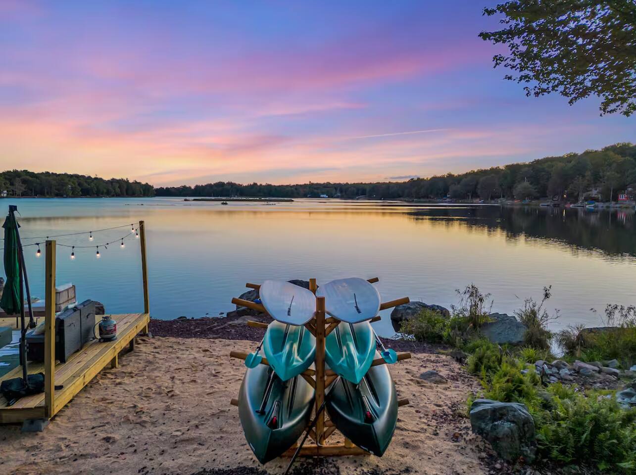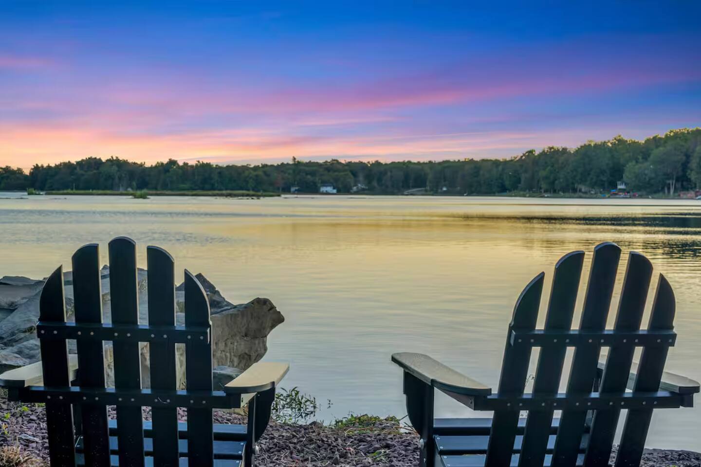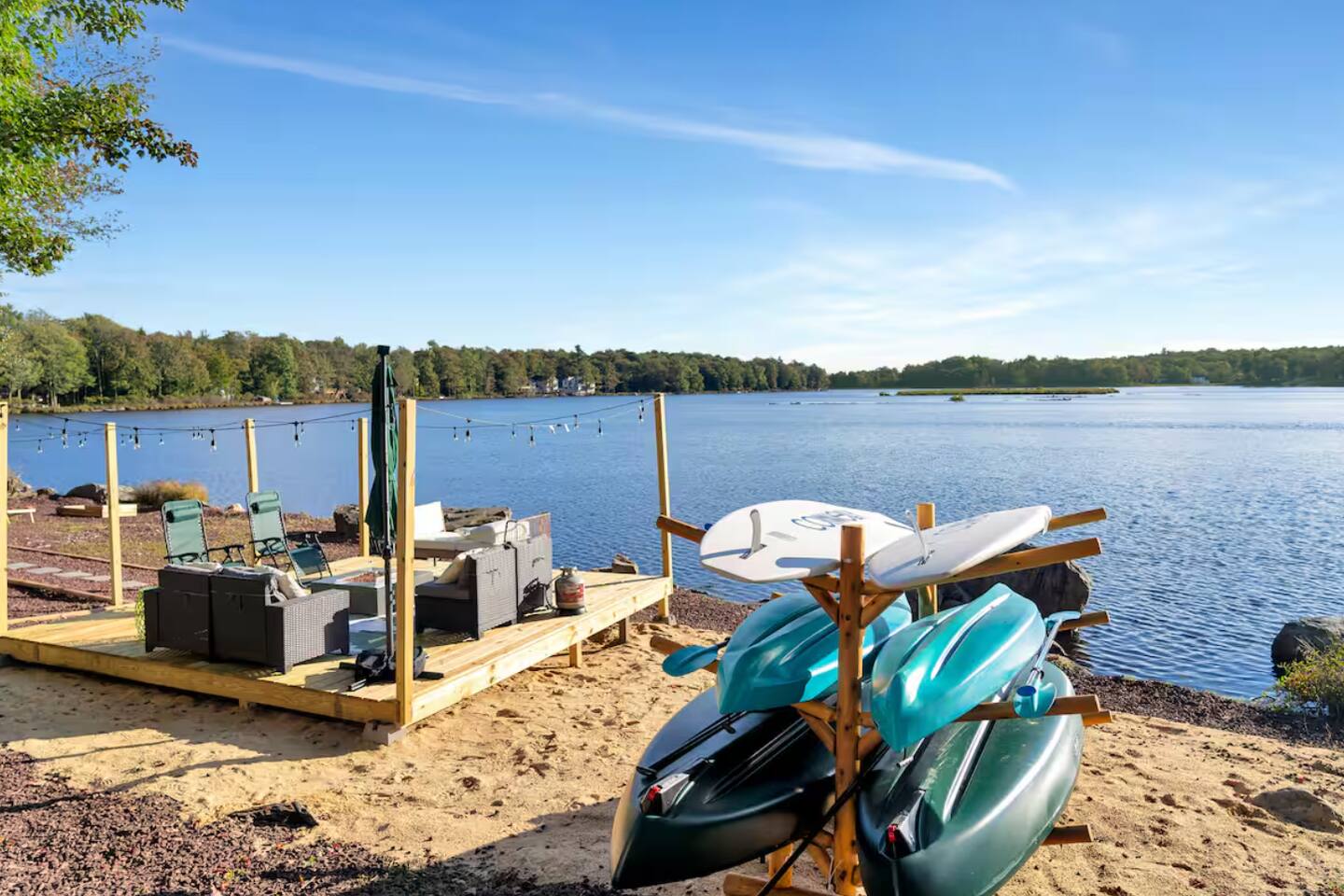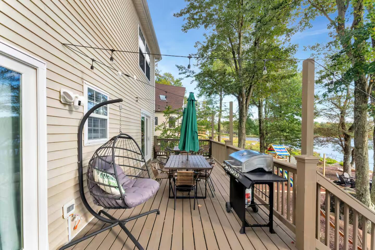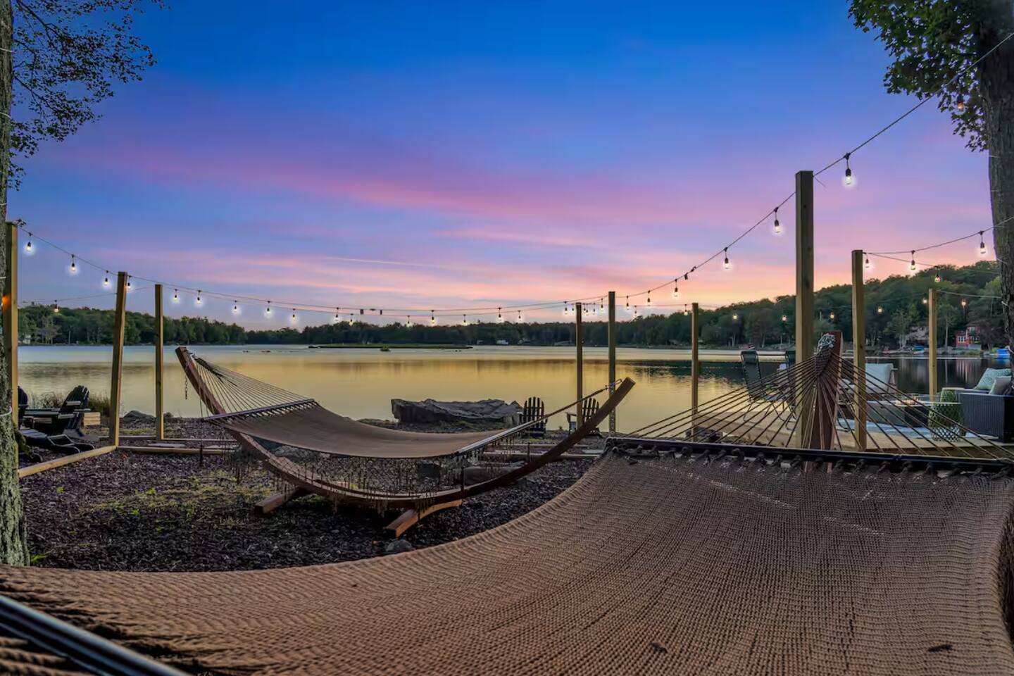 **During the summer months (Memorial Day weekend - Labor Day weekend), you will have the option to purchase amenity passes that allow you to access the following amenities** ☀ Lakes (with beach access - swimming allowed!) ☀ Pools ☀ Tennis courts ☀ Basketball courts ☀ Dog park ☀ Playground areas KEY FEATURES: ☀ 5 beautiful bedrooms; 2 kings, 2 queens, 2 fulls, 1 twin bed, & 1 trundle bed (beneath the bunk bed) ☀ 2 full bathrooms & 2 half bathrooms ☀ Modern kitchen with new, stainless steel appliances ☀ Open living room with lots of comfy seating & smart TV ☀ Dining room with seating to comfortably accommodate 10 (+ 4 more in the breakfast nook & additional dining on the back deck) ☀ AMAZING game room; pool table, arcade, movie theater, & more! ☀ STUNNING lakefront backyard; hot tub, wood burning fire pit, kayaks, jungle gym, & much more! Here Are A Few Kind Words From Our Past Guests: “This was a great place to stay! The morning light through the windows was so beautiful. Overall, just a relaxing experience. The hosts were super responsive whenever I had a question. I would stay again!” - Emily “Sabrina was very accommodating and communicative. the house is beautiful and very comfortable, close to nature hikes.” - Jennifer “This place was lovely! Exactly as pictured! Very clean and excellent host experience!!! I plan to come back again!” - Regina ☆☆ BEDROOMS ☆☆ You'll find 5 beautiful bedrooms throughout this home. On the main floor, the first bedroom has a king bed & smart TV. Upstairs, there is one bedroom with a king bed, two more bedrooms with a queen bed in each, and the fifth bedroom with a full-over-full bunk (+ trundle bed) & a twin bed. Each bedroom in this home has its own smart TV. ☆☆ BATHROOMS ☆☆ There are 2 full bathrooms & 2 half bathrooms in this home. One half bathroom is in the basement game room, while the other is on the main level. Upstairs, the master bedroom has a private ensuite bathroom, with a sink, toilet, and shower/tub combo. The other full bathroom is right down the hallway, also with a sink, toilet, and shower/tub combo. ☆☆ KITCHEN & DINING ☆☆ The modern kitchen is located right off of the main living areas, and is loaded with all new stainless steel appliances & a coffee station (including a Keurig & coffee pods). There is also a breakfast nook with a small dining table, enough to seat 4 people, with a great view of the lake right outside the back door! The dining room is right next to the kitchen, with enough seating to comfortably fit 10 people, also with gorgeous views of the lake! ☆☆ LIVING ROOM ☆☆ In the living room, you’ll be greeted with lots of comfy seating and a big smart TV. This is the perfect spot to host your movie nights & games with your friends and family! ☆☆ GAME ROOM ☆☆ Keep your family and friends entertained throughout your stay in our amenity-filled game room! Pool table, air hockey, foosball, basketball, arcade games, and a wet bar. Whether your reason for staying is to explore the town or stay at home and relax, this place will be the perfect spot to unwind! ☆☆ MOVIE THEATER ☆☆ Right next to the game room is a private movie theater room! With curtains to close off this space to be its own private theater, this is a truly unique experience that you will only find here. A HUGE 75 inch TV & comfy movie theater seats creates a cozy, private theater for just you and your family/friends to enjoy together! ☆☆ OUTDOOR SPACE ☆☆ This backyard is everything you could ask for, and more! ☀ Private beach-entry access to the lake ☀ Kayaks ☀ Surf boards ☀ Hot tub ☀ Fire pit (wood burning) ☀ Jungle gym ☀ Corn hole ☀ Ring toss ☀ Hammocks ☀ Sun loungers ☀ BBQ grill ☀ Outdoor lounge seating ☀ Outdoor dining There is so much to do here, that all of your friends & family will be thoroughly entertained throughout your entire stay. No matter the season, this backyard has it all. Book your stay with us today and you will NOT be disappointed. Get ready for a vacation you will never forget! ★☆ Book Now & Let Us Take Care Of You In The Poconos! ☆★