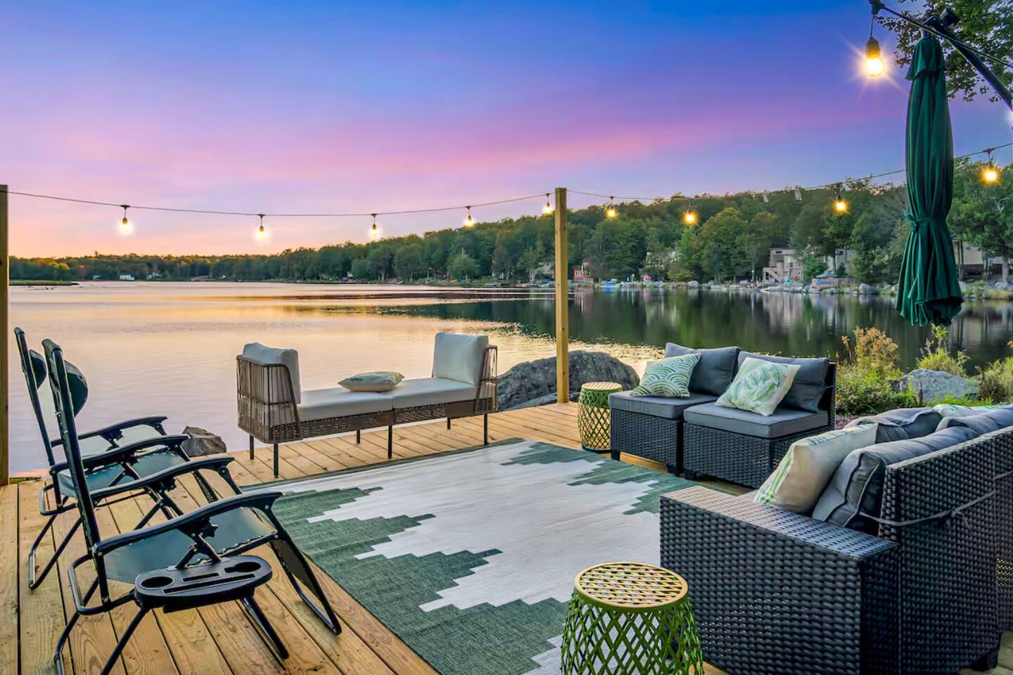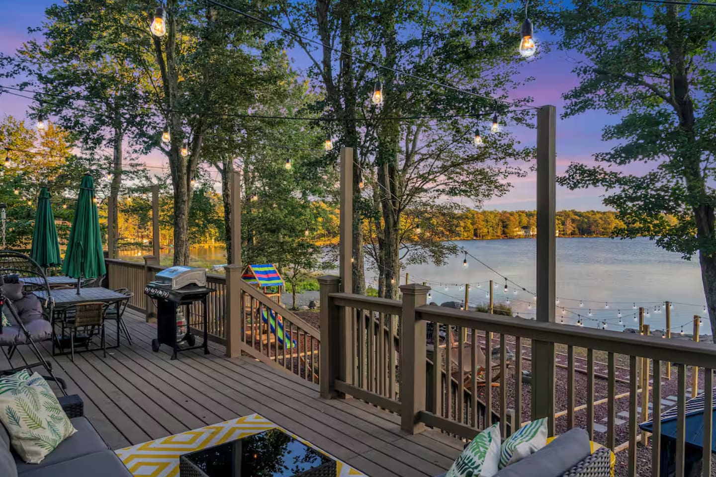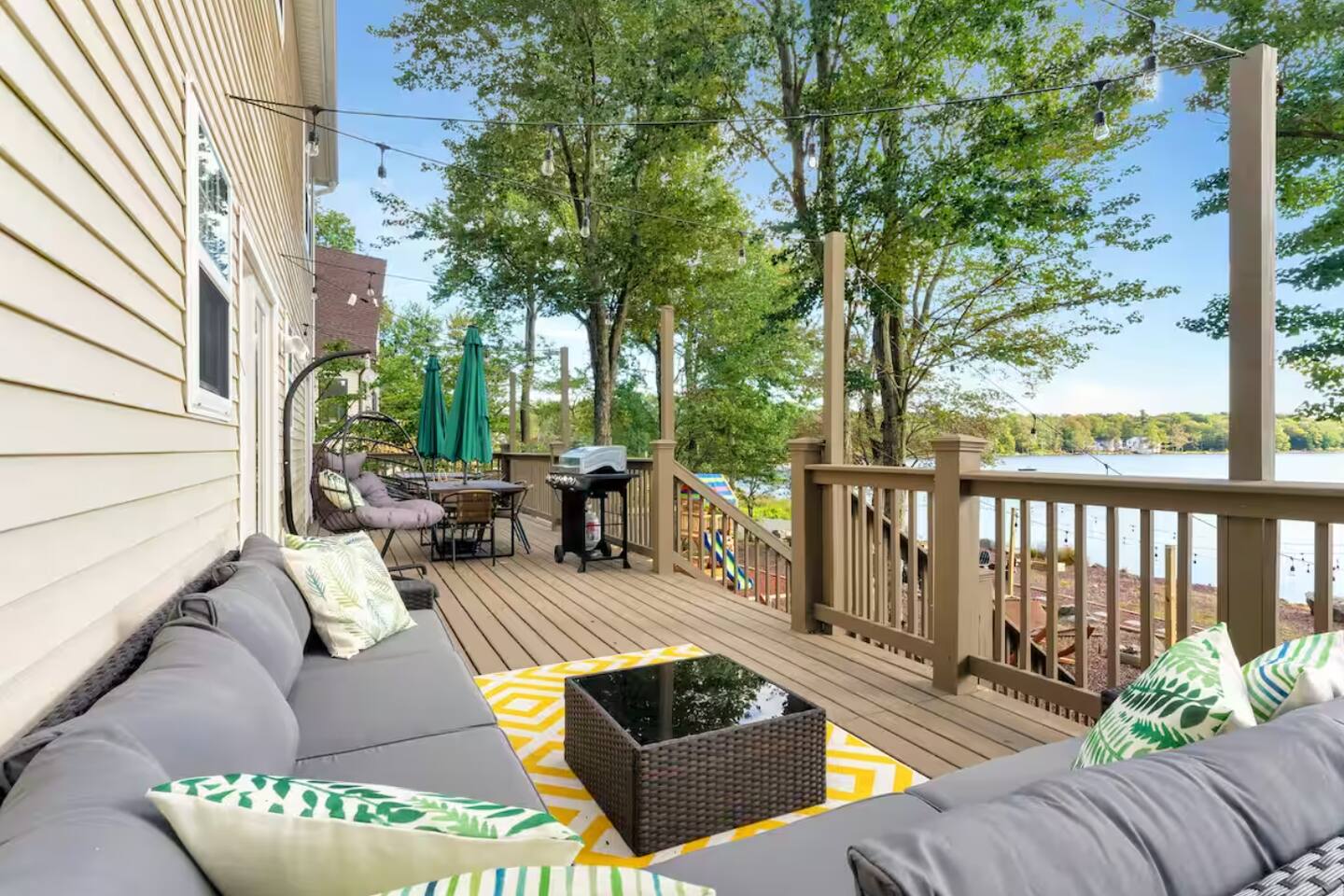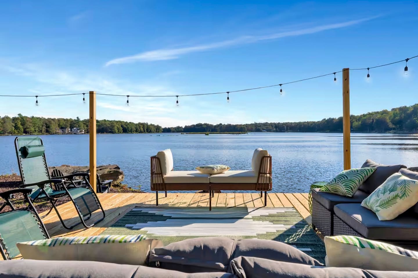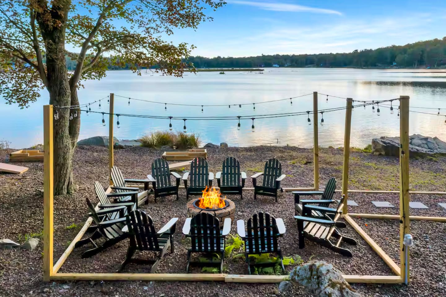 **During the summer months (Memorial Day weekend - Labor Day weekend), you will have the option to purchase amenity passes that allow you to access the following amenities** ☀ Lakes (with beach access - swimming allowed!) ☀ Pools ☀ Tennis courts ☀ Basketball courts ☀ Dog park ☀ Playground areas KEY FEATURES: ☀ 5 beautiful bedrooms; 2 kings, 2 queens, 2 fulls, 1 twin bed, & 1 trundle bed (beneath the bunk bed) ☀ 2 full bathrooms & 2 half bathrooms ☀ Modern kitchen with new, stainless steel appliances ☀ Open living room with lots of comfy seating & smart TV ☀ Dining room with seating to comfortably accommodate 10 (+ 4 more in the breakfast nook & additional dining on the back deck) ☀ AMAZING game room; pool table, arcade, movie theater, & more! ☀ STUNNING lakefront backyard; hot tub, wood burning fire pit, kayaks, jungle gym, & much more! Here Are A Few Kind Words From Our Past Guests: “This was a great place to stay! The morning light through the windows was so beautiful. Overall, just a relaxing experience. The hosts were super responsive whenever I had a question. I would stay again!” - Emily “Sabrina was very accommodating and communicative. the house is beautiful and very comfortable, close to nature hikes.” - Jennifer “This place was lovely! Exactly as pictured! Very clean and excellent host experience!!! I plan to come back again!” - Regina ☆☆ BEDROOMS ☆☆ You'll find 5 beautiful bedrooms throughout this home. On the main floor, the first bedroom has a king bed & smart TV. Upstairs, there is one bedroom with a king bed, two more bedrooms with a queen bed in each, and the fifth bedroom with a full-over-full bunk (+ trundle bed) & a twin bed. Each bedroom in this home has its own smart TV. ☆☆ BATHROOMS ☆☆ There are 2 full bathrooms & 2 half bathrooms in this home. One half bathroom is in the basement game room, while the other is on the main level. Upstairs, the master bedroom has a private ensuite bathroom, with a sink, toilet, and shower/tub combo. The other full bathroom is right down the hallway, also with a sink, toilet, and shower/tub combo. ☆☆ KITCHEN & DINING ☆☆ The modern kitchen is located right off of the main living areas, and is loaded with all new stainless steel appliances & a coffee station (including a Keurig & coffee pods). There is also a breakfast nook with a small dining table, enough to seat 4 people, with a great view of the lake right outside the back door! The dining room is right next to the kitchen, with enough seating to comfortably fit 10 people, also with gorgeous views of the lake! ☆☆ LIVING ROOM ☆☆ In the living room, you’ll be greeted with lots of comfy seating and a big smart TV. This is the perfect spot to host your movie nights & games with your friends and family! ☆☆ GAME ROOM ☆☆ Keep your family and friends entertained throughout your stay in our amenity-filled game room! Pool table, air hockey, foosball, basketball, arcade games, and a wet bar. Whether your reason for staying is to explore the town or stay at home and relax, this place will be the perfect spot to unwind! ☆☆ MOVIE THEATER ☆☆ Right next to the game room is a private movie theater room! With curtains to close off this space to be its own private theater, this is a truly unique experience that you will only find here. A HUGE 75 inch TV & comfy movie theater seats creates a cozy, private theater for just you and your family/friends to enjoy together! ☆☆ OUTDOOR SPACE ☆☆ This backyard is everything you could ask for, and more! ☀ Private beach-entry access to the lake ☀ Kayaks ☀ Surf boards ☀ Hot tub ☀ Fire pit (wood burning) ☀ Jungle gym ☀ Corn hole ☀ Ring toss ☀ Hammocks ☀ Sun loungers ☀ BBQ grill ☀ Outdoor lounge seating ☀ Outdoor dining There is so much to do here, that all of your friends & family will be thoroughly entertained throughout your entire stay. No matter the season, this backyard has it all. Book your stay with us today and you will NOT be disappointed. Get ready for a vacation you will never forget! ★☆ Book Now & Let Us Take Care Of You In The Poconos! ☆★