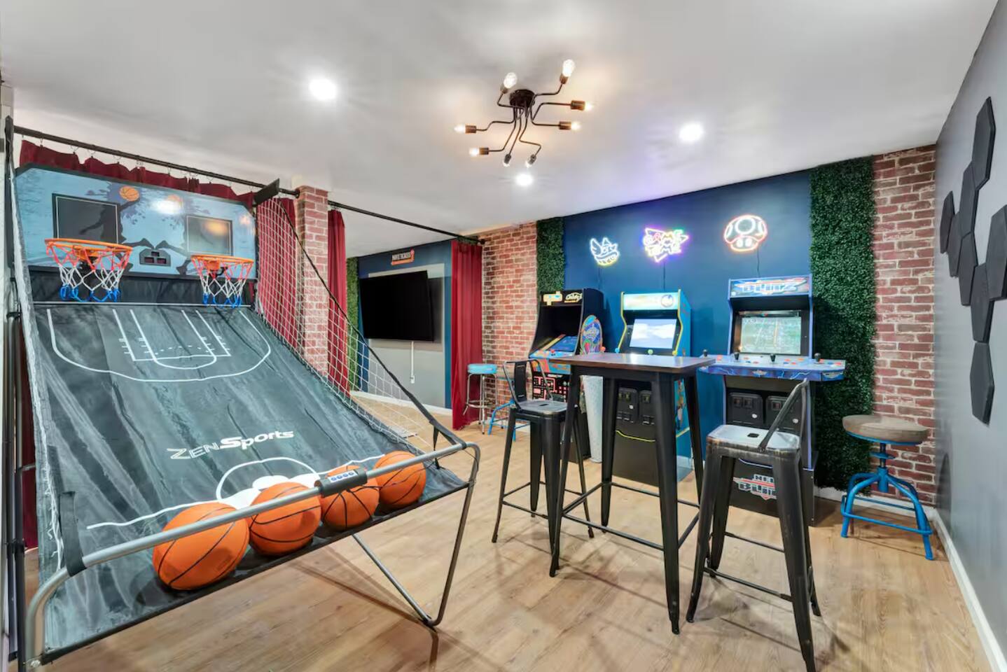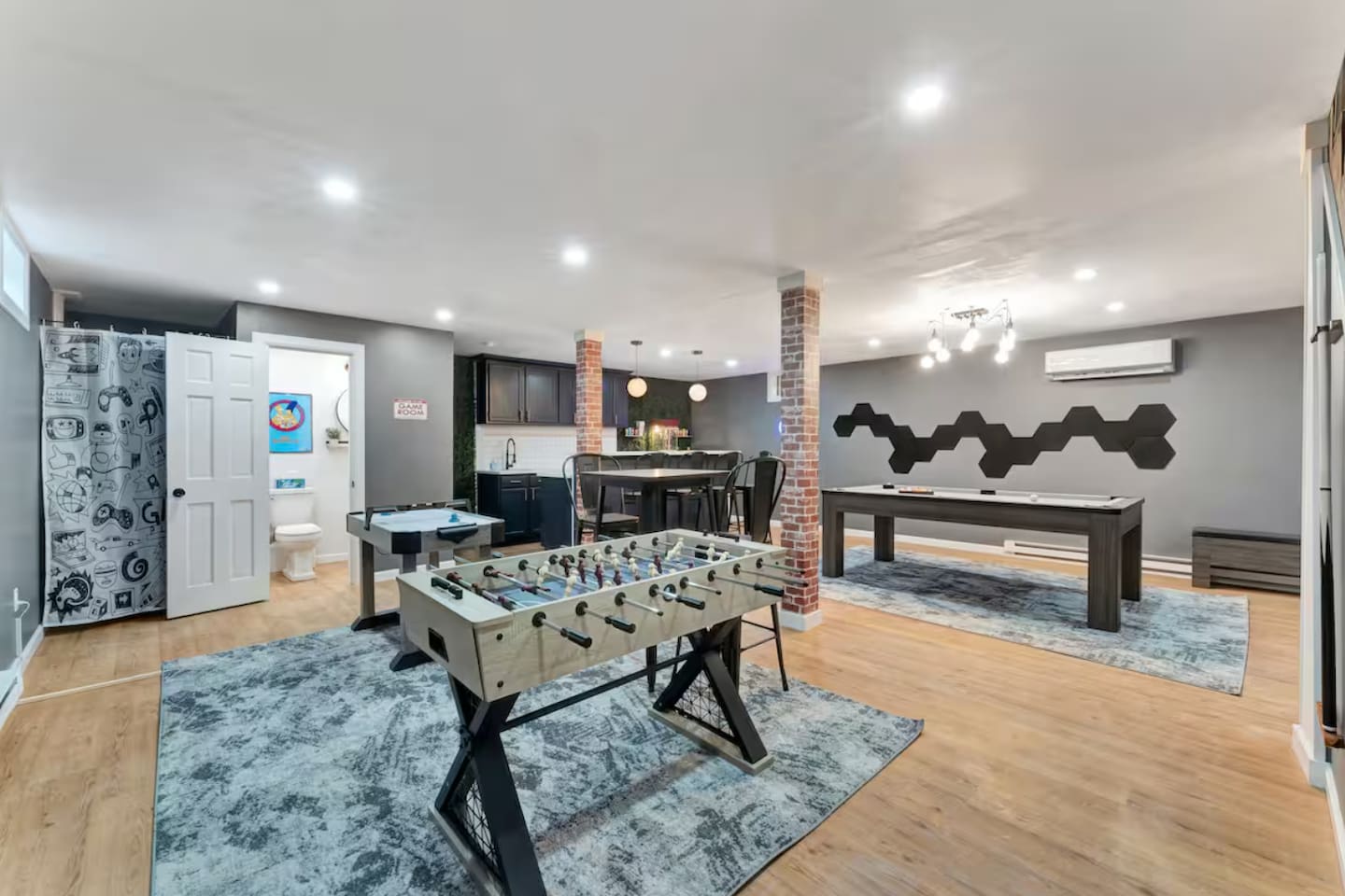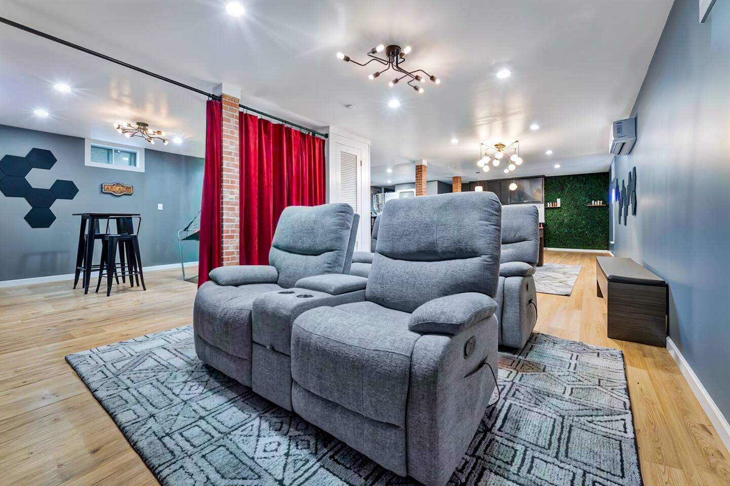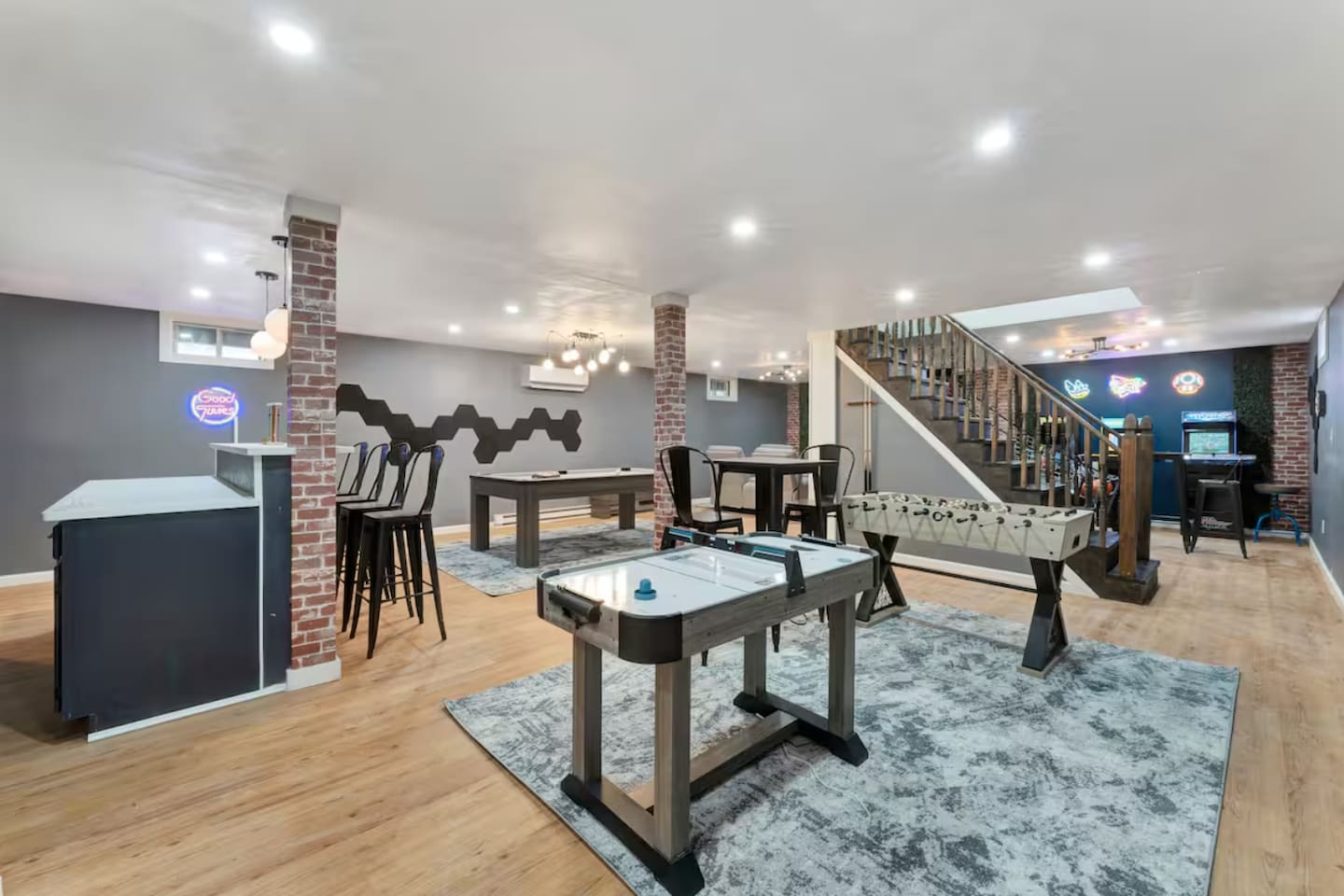**During the summer months (Memorial Day weekend - Labor Day weekend), you will have the option to purchase amenity passes that allow you to access the following amenities** ☀ Lakes (with beach access - swimming allowed!) ☀ Pools ☀ Tennis courts ☀ Basketball courts ☀ Dog park ☀ Playground areas KEY FEATURES: ☀ 5 beautiful bedrooms; 2 kings, 2 queens, 2 fulls, 1 twin bed, & 1 trundle bed (beneath the bunk bed) ☀ 2 full bathrooms & 2 half bathrooms ☀ Modern kitchen with new, stainless steel appliances ☀ Open living room with lots of comfy seating & smart TV ☀ Dining room with seating to comfortably accommodate 10 (+ 4 more in the breakfast nook & additional dining on the back deck) ☀ AMAZING game room; pool table, arcade, movie theater, & more! ☀ STUNNING lakefront backyard; hot tub, wood burning fire pit, kayaks, jungle gym, & much more! Here Are A Few Kind Words From Our Past Guests: “This was a great place to stay! The morning light through the windows was so beautiful. Overall, just a relaxing experience. The hosts were super responsive whenever I had a question. I would stay again!” - Emily “Sabrina was very accommodating and communicative. the house is beautiful and very comfortable, close to nature hikes.” - Jennifer “This place was lovely! Exactly as pictured! Very clean and excellent host experience!!! I plan to come back again!” - Regina ☆☆ BEDROOMS ☆☆ You'll find 5 beautiful bedrooms throughout this home. On the main floor, the first bedroom has a king bed & smart TV. Upstairs, there is one bedroom with a king bed, two more bedrooms with a queen bed in each, and the fifth bedroom with a full-over-full bunk (+ trundle bed) & a twin bed. Each bedroom in this home has its own smart TV. ☆☆ BATHROOMS ☆☆ There are 2 full bathrooms & 2 half bathrooms in this home. One half bathroom is in the basement game room, while the other is on the main level. Upstairs, the master bedroom has a private ensuite bathroom, with a sink, toilet, and shower/tub combo. The other full bathroom is right down the hallway, also with a sink, toilet, and shower/tub combo. ☆☆ KITCHEN & DINING ☆☆ The modern kitchen is located right off of the main living areas, and is loaded with all new stainless steel appliances & a coffee station (including a Keurig & coffee pods). There is also a breakfast nook with a small dining table, enough to seat 4 people, with a great view of the lake right outside the back door! The dining room is right next to the kitchen, with enough seating to comfortably fit 10 people, also with gorgeous views of the lake! ☆☆ LIVING ROOM ☆☆ In the living room, you’ll be greeted with lots of comfy seating and a big smart TV. This is the perfect spot to host your movie nights & games with your friends and family! ☆☆ GAME ROOM ☆☆ Keep your family and friends entertained throughout your stay in our amenity-filled game room! Pool table, air hockey, foosball, basketball, arcade games, and a wet bar. Whether your reason for staying is to explore the town or stay at home and relax, this place will be the perfect spot to unwind! ☆☆ MOVIE THEATER ☆☆ Right next to the game room is a private movie theater room! With curtains to close off this space to be its own private theater, this is a truly unique experience that you will only find here. A HUGE 75 inch TV & comfy movie theater seats creates a cozy, private theater for just you and your family/friends to enjoy together! ☆☆ OUTDOOR SPACE ☆☆ This backyard is everything you could ask for, and more! ☀ Private beach-entry access to the lake ☀ Kayaks ☀ Surf boards ☀ Hot tub ☀ Fire pit (wood burning) ☀ Jungle gym ☀ Corn hole ☀ Ring toss ☀ Hammocks ☀ Sun loungers ☀ BBQ grill ☀ Outdoor lounge seating ☀ Outdoor dining There is so much to do here, that all of your friends & family will be thoroughly entertained throughout your entire stay. No matter the season, this backyard has it all. Book your stay with us today and you will NOT be disappointed. Get ready for a vacation you will never forget! ★☆ Book Now & Let Us Take Care Of You In The Poconos! ☆★