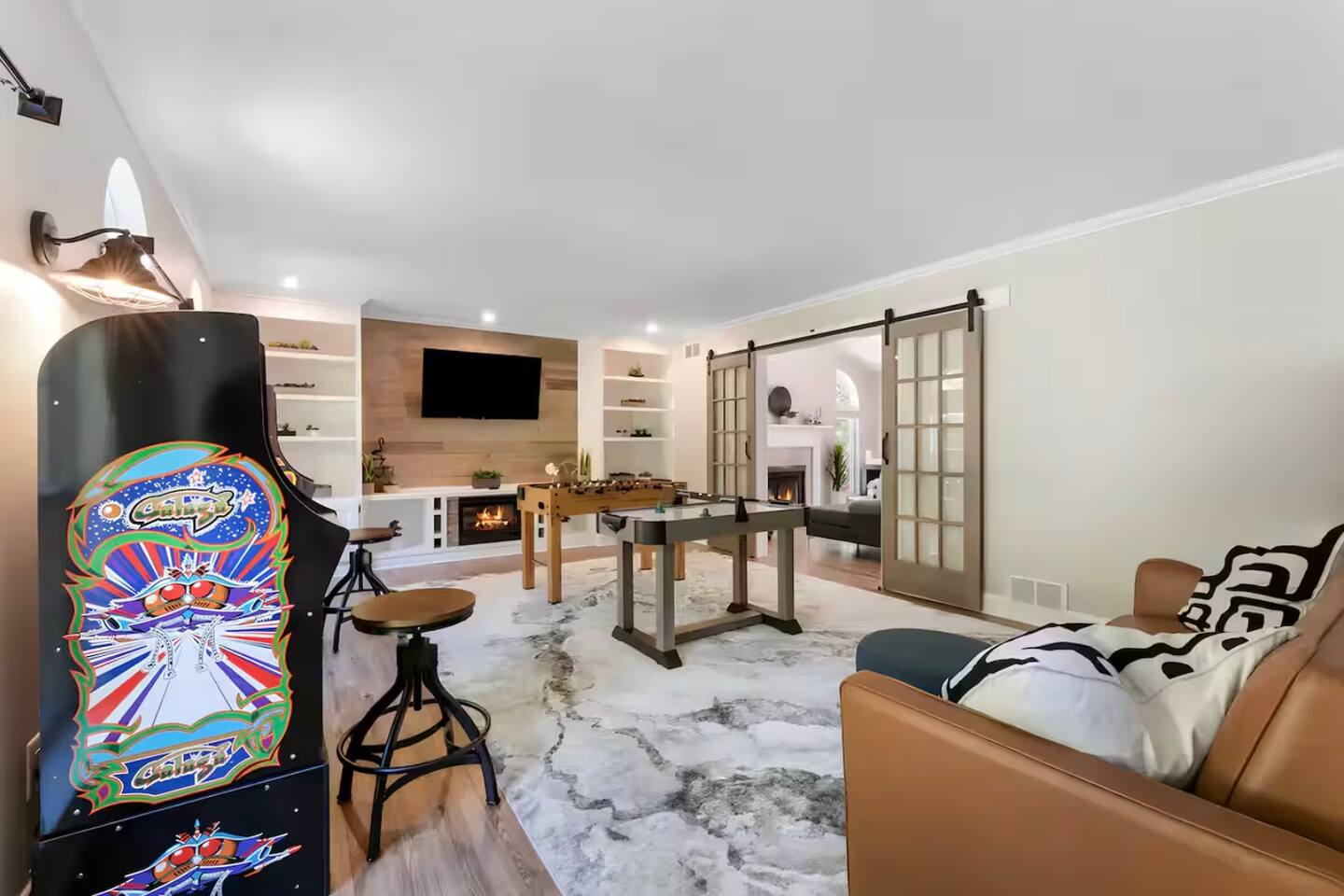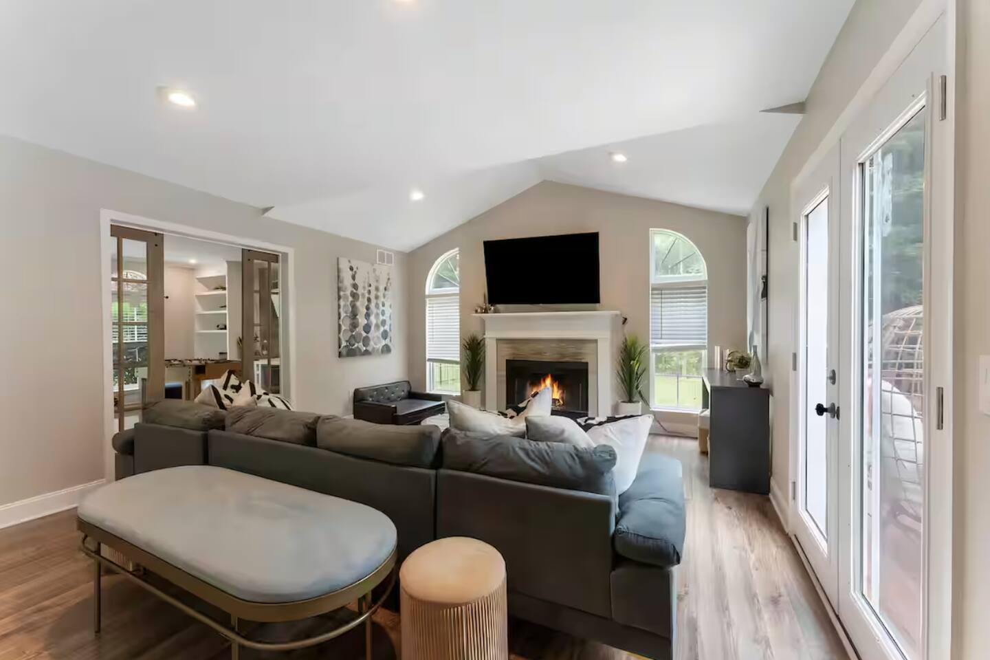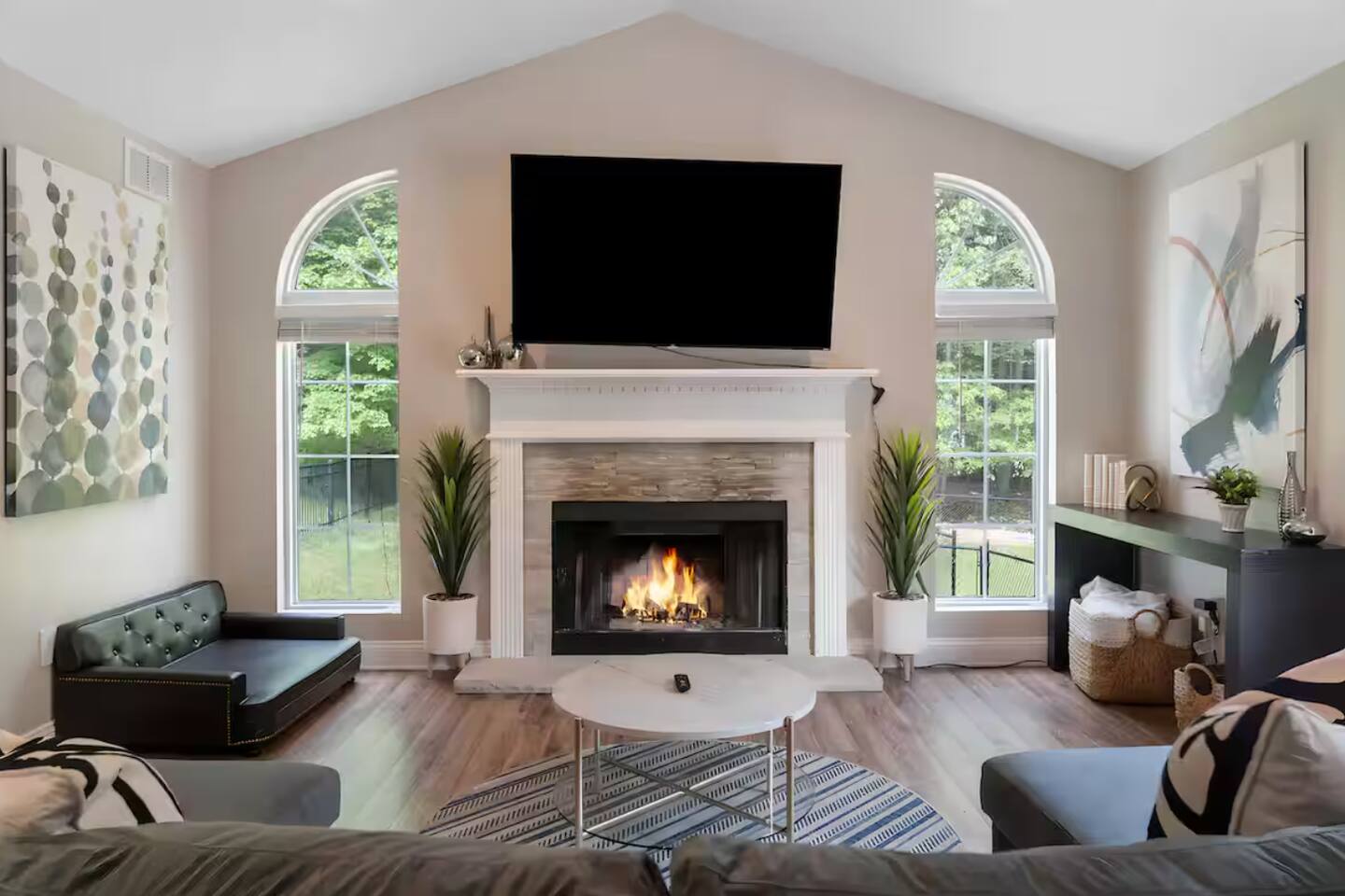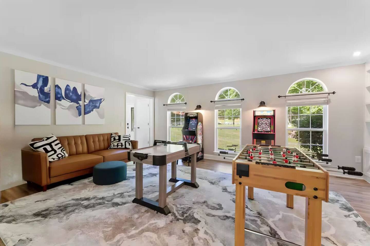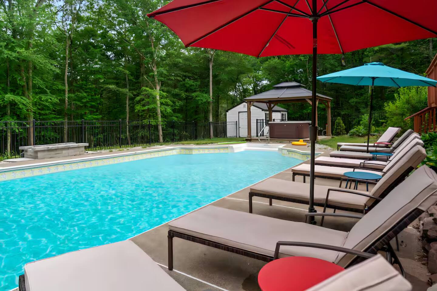 KEY FEATURES: ☀ 4 beautiful, spacious bedrooms - 3 kings, 2 queens (bunk bed) ☀ 2.5 bathrooms ☀ Beautifully renovated kitchen with modern appliances ☀ Open living room with lots of comfy seating & wood burning fireplace ☀ Game room with more seating & huge smart TV ☀ Gorgeous formal dining room ☀ INCREDIBLE backyard with a HEATED pool, hot tub, and more! ☀ Huge, private lot surrounded by the Poconos forest Here Are A Few Kind Words From Our Past Guests: “This was a great place to stay! The morning light through the windows was so beautiful. Overall, just a relaxing experience. The hosts were super responsive whenever I had a question. I would stay again!” - Emily “Sabrina was very accommodating and communicative. the house is beautiful and very comfortable, close to nature hikes.” - Jennifer “This place was lovely! Exactly as pictured! Very clean and excellent host experience!!! I plan to come back again!” - Regina ☆☆ BEDROOMS ☆☆ This modern estate boasts 4 beautiful bedrooms, all of which are located on the second floor. The master bedroom has a high vaulted ceiling, king size bed, smart TV, and an attached ensuite. The next bedroom has two queen beds (bunk bed), as well as a dedicated workspace. The next two bedrooms have one king bed each. All 3 secondary bedrooms share a hallway bathroom. ☆☆ BATHROOMS ☆☆ There are two and a half bathrooms, one of which is downstairs (the half bathroom), while the other two are accessible by the bedrooms upstairs. The downstairs bathroom is directly off of the kitchen hallway, right next to the washer & dryer. Upstairs, the master ensuite is equipped with a sink, vanity, and separate jetted tub & standing shower. The last bathroom upstairs has dual sinks & a shower/tub combo. ☆☆ KITCHEN & DINING ☆☆ Prepare to be amazed! The stunning kitchen will take your breath away. The unique, dark blue accents & open concept are unlike any other in the Poconos. Included in this kitchen is an eat-in breakfast nook & coffee station (including a Keurig & coffee pods). The full dining room is just steps away. With a large dining table that can seat 6 + the additional breakfast nook which can seat 4 more, there is an abundance of space for the entire group to enjoy a feast prepared in the chef's kitchen! ☆☆ LIVING ROOM & GAME ROOM ☆☆ The first living room is more formal, with lots of comfy seating, a wood burning fireplace, a smart TV, and gorgeous views of the private backyard. On the other side of the wall, you can let your inner child out as you enjoy the arcade games, foosball, air hockey, or all other entertainment that you can find on the huge smart TV! ☆☆ OUTDOOR SPACE ☆☆ This backyard has all the fun you can imagine! ☀ Private heated pool ☀ Hot tub ☀ Fire pit (wood burning) ☀ Sun loungers ☀ Outdoor dining ☀ BBQ grill ★☆ Book Now & Let Us Take Care Of You In The Poconos! ☆★