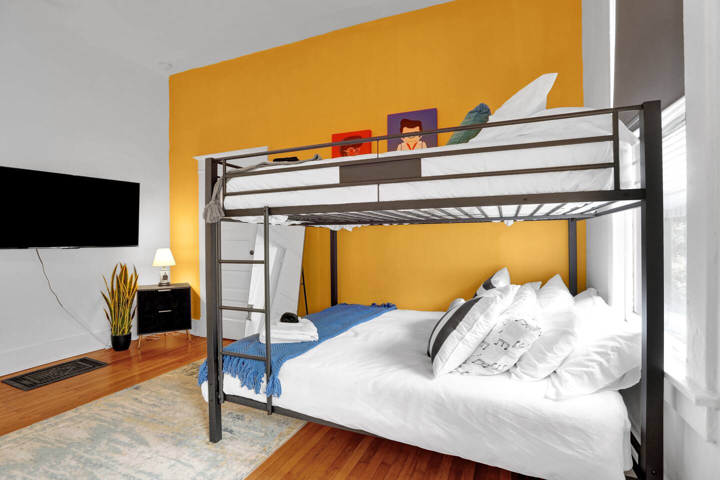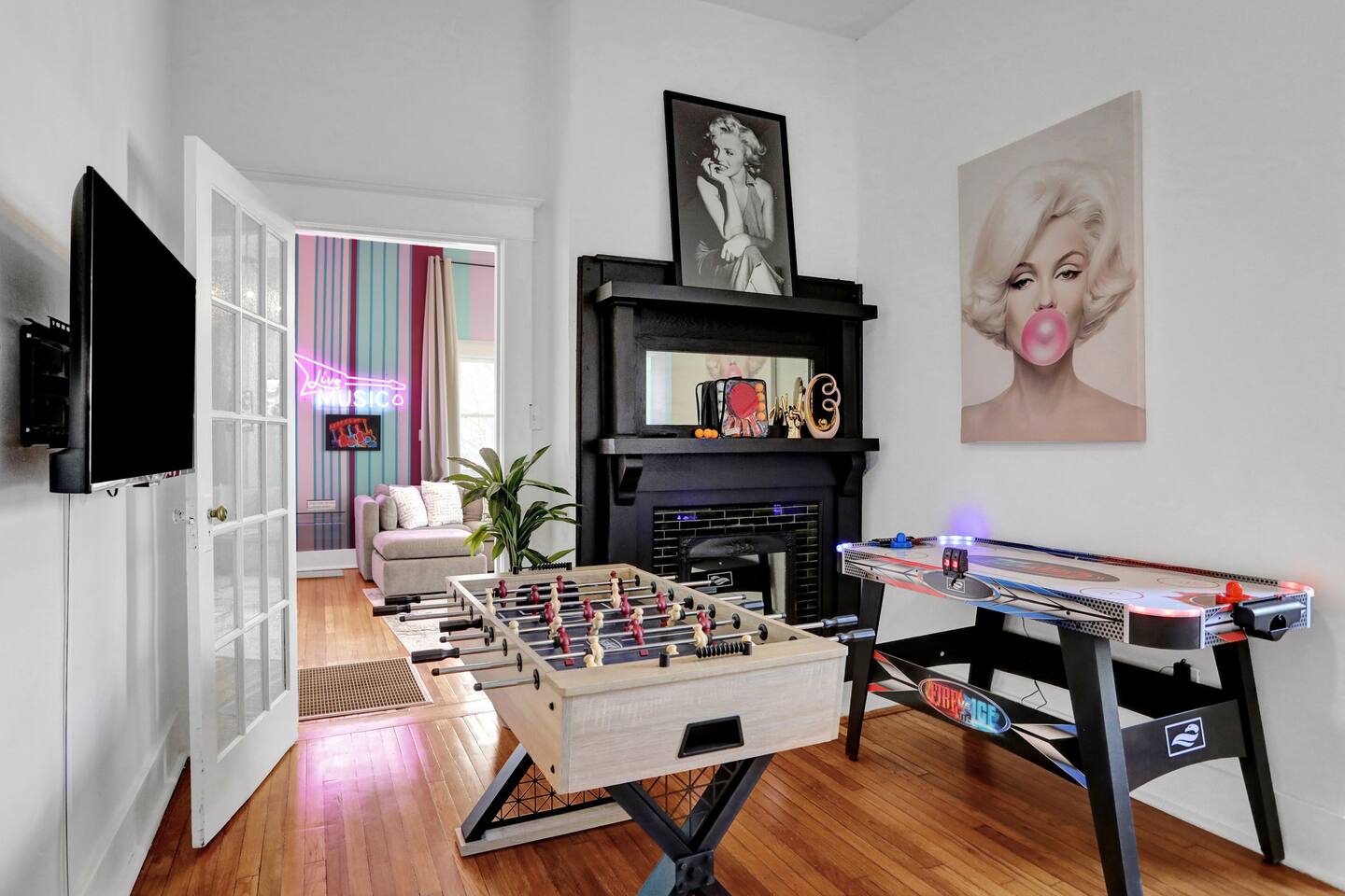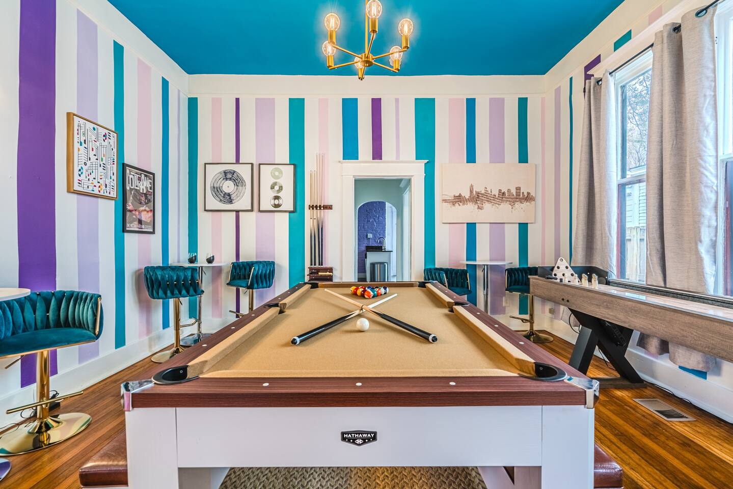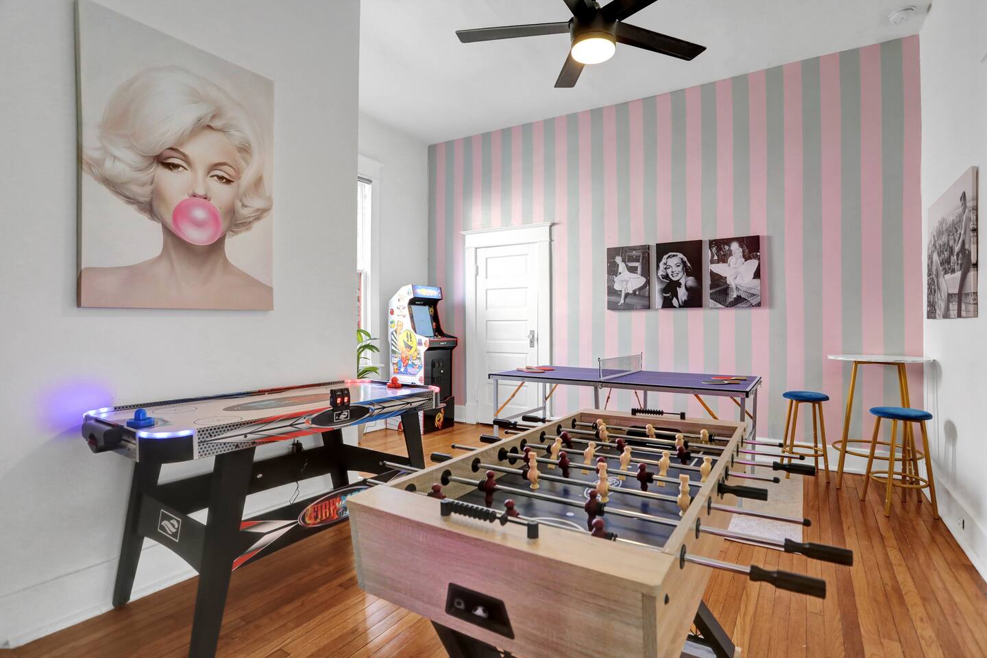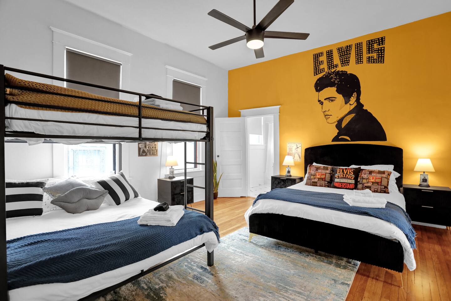 KEY FEATURES: ☀ Three gorgeously designed bedrooms; 1 king & 3 queens, & 2 full beds ☀ 3.5 bathrooms ☀ Historic kitchen with modern, stainless steel appliances ☀ Open, comfy living room with a fun musical design! ☀ Open dining room that doubles as a game-room ☀ Large backyard filled with amenities ☀ Pool, fire pit, games, and more! Here Are A Few Kind Words From Our Past Guests: “This was a great place to stay! The morning light through the windows was so beautiful. Overall, just a relaxing experience. The hosts were super responsive whenever I had a question. I would stay again!” - Emily “Sabrina was very accommodating and communicative. the house is beautiful and very comfortable, close to nature hikes.” - Jennifer “This place was lovely! Exactly as pictured! Very clean and excellent host experience!!! I plan to come back again!” - Regina ☆☆ BEDROOMS ☆☆ The bedrooms in this home are breathtaking! Each with a unique design, modeled after famous musicians. The downstairs bedroom (Elvis-themed), has three queen beds (one queen bed + a queen-over-queen bunk bed), smart TV, and a private ensuite bathroom, as well. The upstairs bedrooms will continue to blow you away. The "Prince" themed bedroom has two king beds, a smart TV, and a shared attached bathroom with the "Cavern Club" bedroom (Beatles-themed), which is equipped with a queen bed & a cute nook to relax below the natural light on a couple comfy bean bags. ☆☆ BATHROOMS ☆☆ There are three and a half bathrooms in this home. Downstairs, both bedrooms have their own bathrooms, each with a sink, toilet, & shower/tub combo. There is also a half-bath downstairs, with a sink & toilet only. Upstairs, the two bedrooms share one grand bathroom, with two sinks, a toilet, walk-in shower, and soaking tub. ☆☆ KITCHEN & DINING ☆☆ The kitchen and dining space opens up to the main living area of the home. The kitchen is historic and stays true to the original charm of the home, but with new, stainless steel appliances and a coffee station (including a Keurig & coffee pods). The dining room is just right down the hall from the kitchen, and doubles as a game room. The dining table converts to a full-size pool table, and is accompanied by shuffleboard & additional high top seating throughout the room. ☆☆ LIVING ROOM ☆☆ As you walk into the home, you will be greeted with a cozy living room, full of comfy seating, funky Memphis-musical inspired design, & a big smart TV. The perfect spot to relax with your friends & family after exploring the town! ☆☆ GAME ROOM ☆☆ Upstairs, you'll find a mini-arcade; two arcade games & a pinball machine complete this cozy nook to play some retro games! ☆☆ OUTDOOR SPACE ☆☆ This backyard is a truly special find in Memphis! A big, fully fenced yard loaded with amenities: ☀ Hot tub ☀ Fire pit (wood burning) ☀ Jungle gym ☀ Corn hole ☀ Horseshoe ☀ Giant Connect 4 ☀ Giant Jenga ☀ Outdoor lounge seating ☀ Covered outdoor dining When you're not spending your days exploring all that Memphis has to offer, you will have plenty to do right here at home, whether you're in the house or enjoying all the amenities offered right outside! ★☆ Book Now & Let Us Take Care Of You In Memphis! ☆★