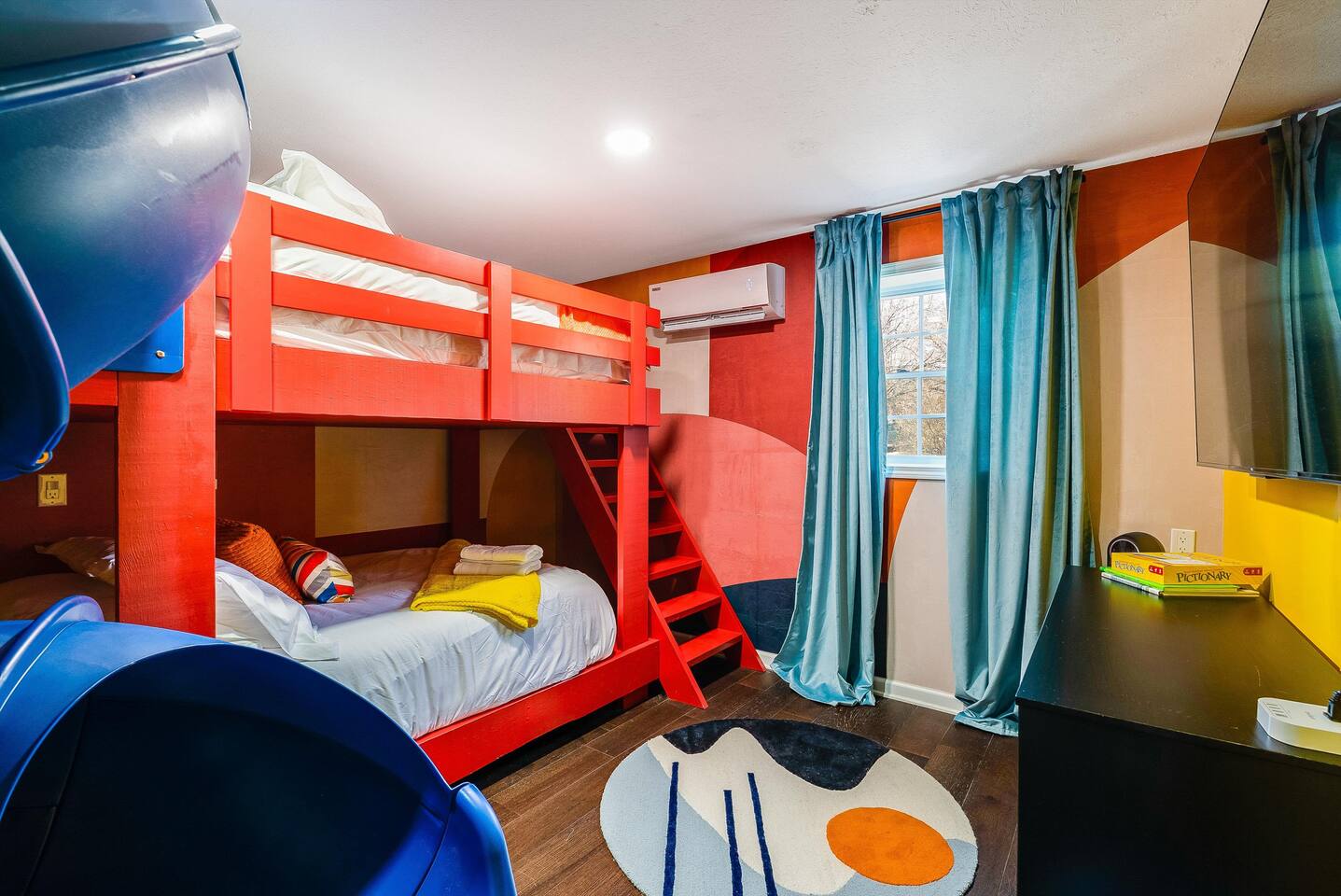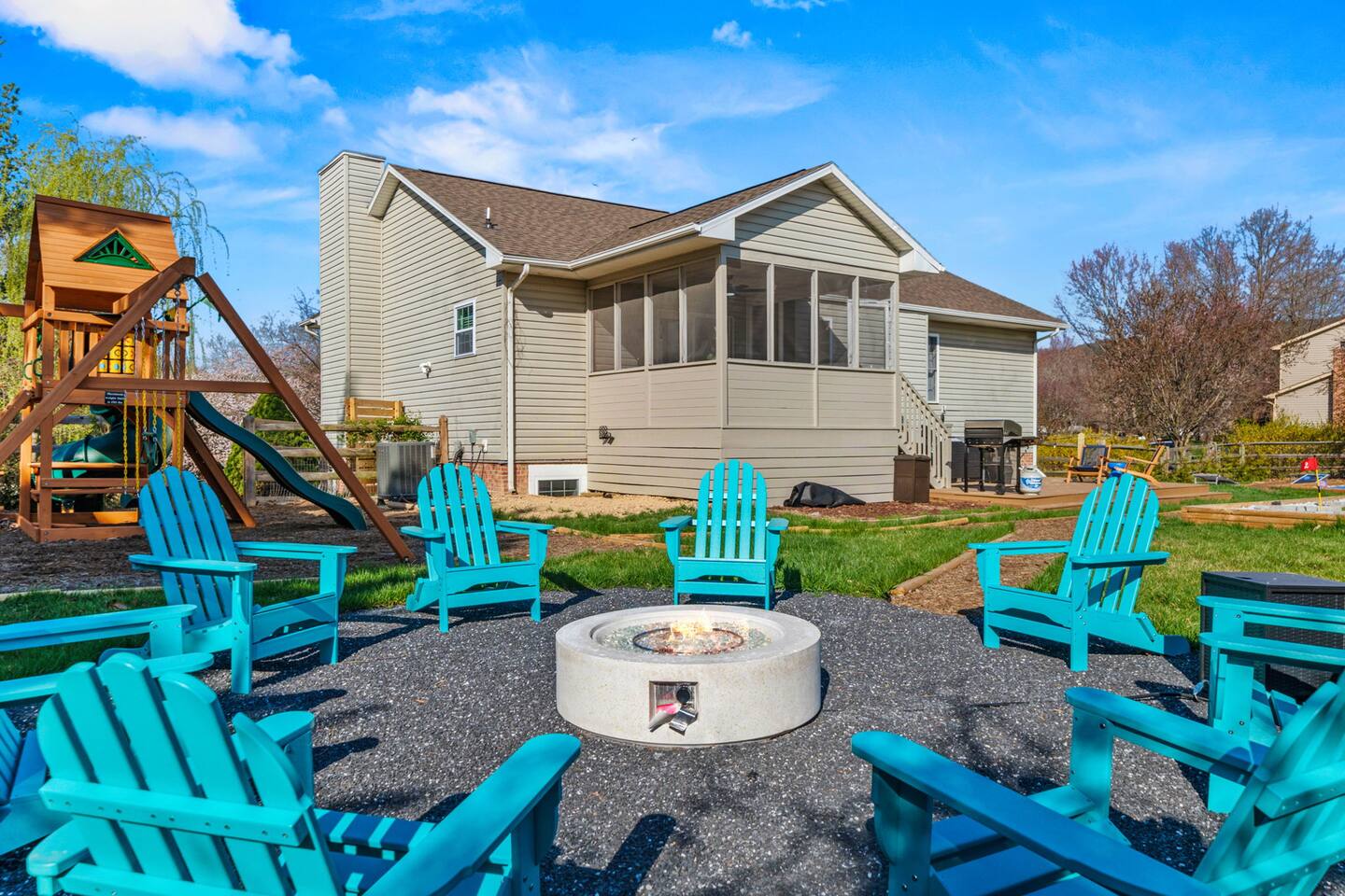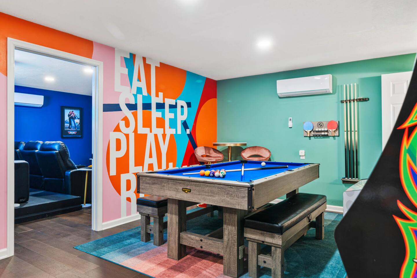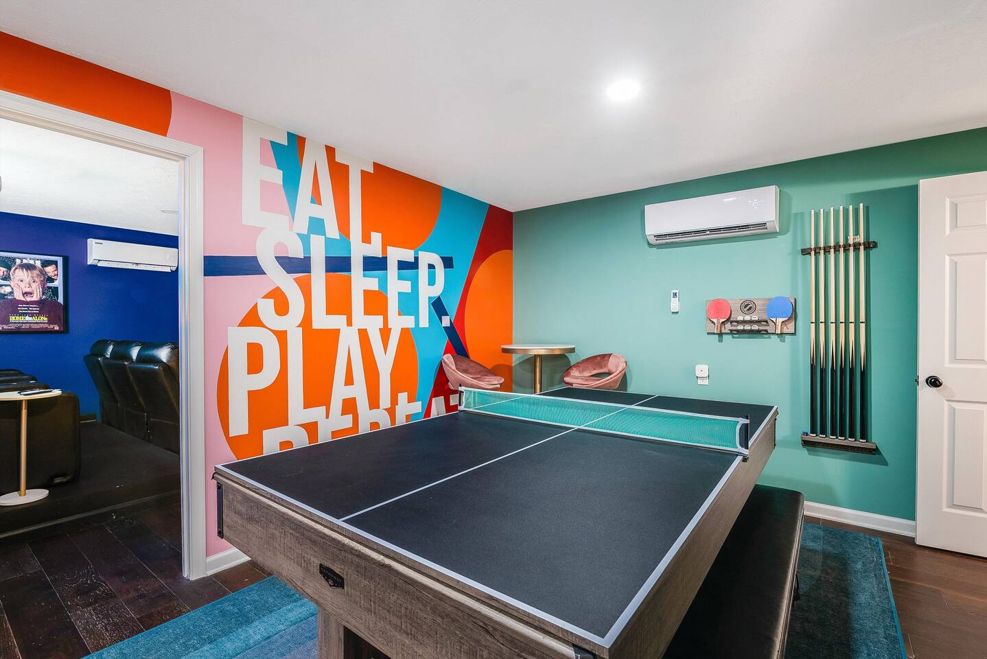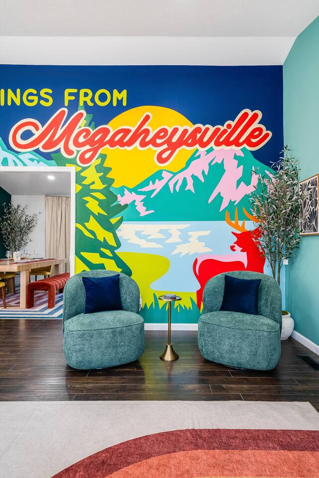 KEY FEATURES: ☀ 6 beautiful bedrooms; 3 kings, 3 queens, & 2 full beds ☀ 2.5 bathrooms ☀ Modern kitchen with new, stainless steel appliances ☀ Open living room with lots of comfy seating & smart TV ☀ Dining room with seating to comfortably accommodate 10 (+ 4 seats in the screened in porch) ☀ AMAZING game room; pool table, poker table, arcade games & more! ☀ One-of-a-kind CUSTOM movie theater, with huge projector screen & classic movie theater seats! ☀ Beautiful, private, fully-fenced backyard, including a hot tub, fire pit, mini golf and more! Here Are A Few Kind Words From Our Past Guests: “This was a great place to stay! The morning light through the windows was so beautiful. Overall, just a relaxing experience. The hosts were super responsive whenever I had a question. I would stay again!” - Emily “Sabrina was very accommodating and communicative. the house is beautiful and very comfortable, close to nature hikes.” - Jennifer “This place was lovely! Exactly as pictured! Very clean and excellent host experience!!! I plan to come back again!” - Regina ☆☆ BEDROOMS ☆☆ There are 6 gorgeous bedrooms throughout this home, each with their own smart TV! You'll find 3 bedrooms on the main floor. The master bedroom has a king bed & private ensuite bathroom. The second bedroom has another king bed, while the third has a queen-over-queen bunk bed. On the bottom floor, the fourth bedroom has a king, the fifth bedroom has a queen, and the sixth has a custom full-over-full bunk bed with a SLIDE! You have to see it to believe it! ☆☆ BATHROOMS ☆☆ This home has 2 and a half bathrooms. The upstairs master ensuite bathroom has two sinks, a toilet, and shower/tub combo. Right down the hall, the second bathroom has 1 sink, a toilet, and a walk-in shower only. Downstairs, the half bathroom is accessible off of the queen bedroom & game room, with a sink & toilet only. ☆☆ KITCHEN & DINING ☆☆ The kitchen is located right off of the main living areas, and is loaded with all new stainless steel appliances & a coffee station (including a Keurig & coffee pods). The dining room is right next to the kitchen, with enough seating to comfortably fit 10 people, plus additional dining space in the private back screened in porch! ☆☆ LIVING ROOM ☆☆ In the living room, you’ll be greeted with high vaulted ceilings, lots of comfy seating, a big smart TV, a fireplace, and gorgeous, colorful design along with a massive, fun mural. This is the perfect spot to host your movie nights & games with your friends and family! ☆☆ GAME ROOM ☆☆ Keep your family and friends entertained throughout your stay in our super fun game room! With a pool table, ping pong, poker table, arcade games, pop-a-shot basketball, & a big smart TV, this is the ideal hangout spot to keep you entertained for hours! ☆☆ MOVIE THEATER ☆☆ A truly unique space! In this home, you'll have your own PRIVATE movie theater, with a HUGE projector screen and 2 rows of movie theater seating. This room will take your breath away! ☆☆ OUTDOOR SPACE ☆☆ This private back deck is everything you could ask for, and more! ☀ Hot tub ☀ Fire pit ☀ Mini golf ☀ Bowling ☀ Corn hole ☀ Jungle gym ☀ BBQ grill ☀ Outdoor dining There is so much to do here, that all of your friends & family will be thoroughly entertained throughout your entire stay. No matter the season, this backyard has it all. Book your stay with us today and you will NOT be disappointed. Get ready for a vacation you will never forget! ★☆ Book Now & Let Us Take Care Of You In Shenandoah Valley ! ☆★