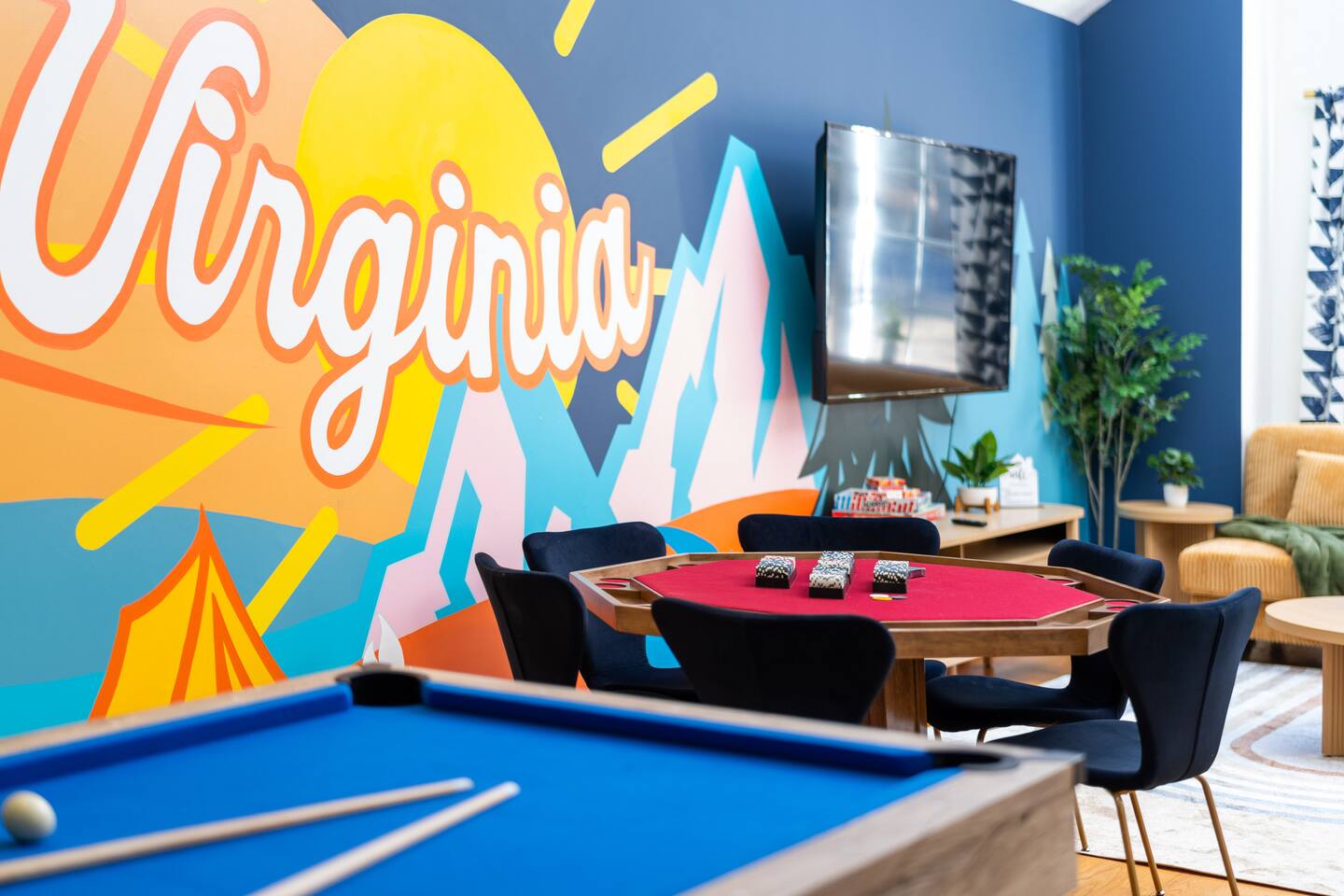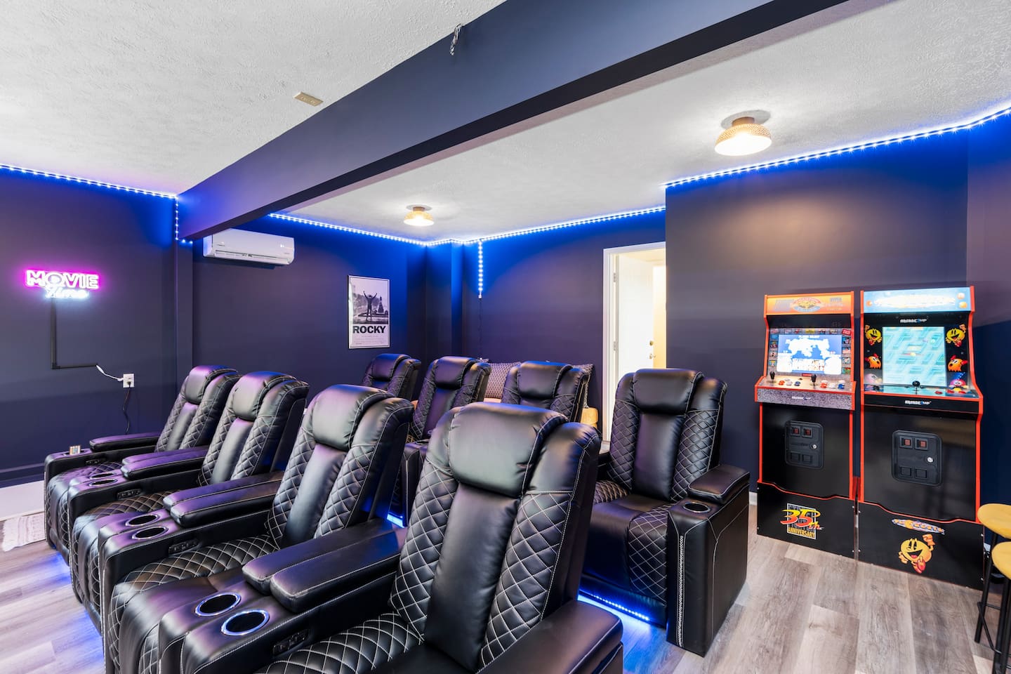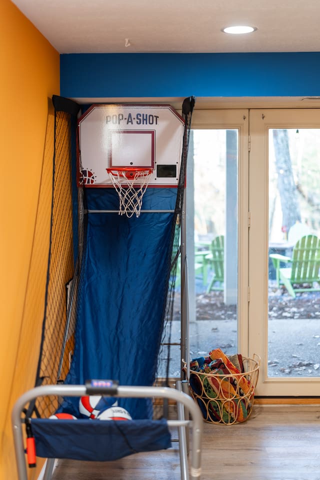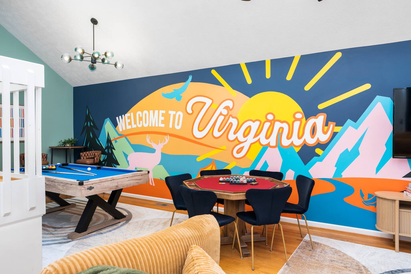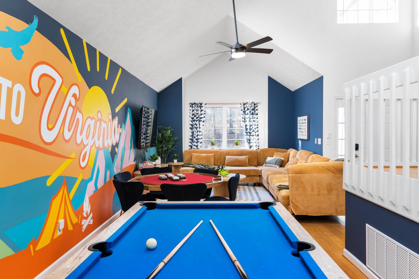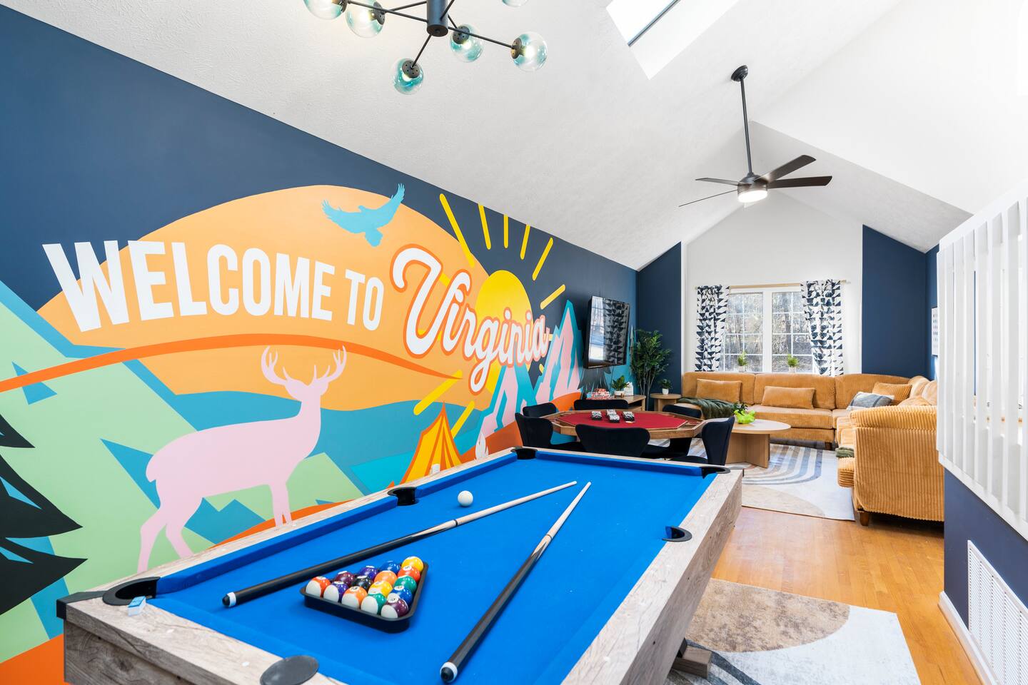 KEY FEATURES: ☀ 6 beautiful bedrooms; 4 kings & 4 queen beds ☀ 3.5 clean, modern bathrooms ☀ Modern kitchen with new, stainless steel appliances ☀ Open living room with lots of comfy seating & smart TV ☀ Dining room with seating to comfortably accommodate 16 ☀ AMAZING game rooms; pool table, shuffleboard, poker table, basketball, & much more! ☀ One-of-a-kind movie theater, with huge TV & tons of theater seating! ☀ Beautiful, private backyard; hot tub, fire pit, bowling, jungle gym, games & more! Here Are A Few Kind Words From Our Past Guests: “This was a great place to stay! The morning light through the windows was so beautiful. Overall, just a relaxing experience. The hosts were super responsive whenever I had a question. I would stay again!” - Emily “Sabrina was very accommodating and communicative. the house is beautiful and very comfortable, close to nature hikes.” - Jennifer “This place was lovely! Exactly as pictured! Very clean and excellent host experience!!! I plan to come back again!” - Regina ☆☆ BEDROOMS ☆☆ There are 6 gorgeous bedrooms throughout this home. Four of the bedrooms have one king bed in each. The 5th and 6th bedrooms have two queen beds in each. ☆☆ BATHROOMS ☆☆ This home has 3 full bathrooms & one half bath. On the first level, the hallway bathroom has 1 sink, toilet, and a shower/tub combo. On the main level there is a half bathroom with a sink & toilet only. On the top level, the master bedroom has a private ensuite bathroom, with two sinks, a toilet, walk-in shower, & luxurious soaking tub. The final bathroom on this floor is a Jack-n-Jill, with 2 sinks, a toilet, & shower/tub combo. ☆☆ KITCHEN & DINING ☆☆ The modern kitchen is located right off of the main living areas, and is loaded with all new stainless steel appliances & a coffee station (including a Keurig & coffee pods). The dining room is right next to the kitchen, with enough seating to comfortably fit 16 people between the large dining table & breakfast nook seating. ☆☆ LIVING ROOM ☆☆ In the living room, you’ll be greeted with lots of comfy seating, a big smart TV, and gorgeous, colorful design along with a massive, fun mural. This is the perfect spot to host your movie nights & games with your friends and family! ☆☆ GAME ROOM ☆☆ Keep your family and friends entertained throughout your stay in our amenity-filled game rooms! Pool table, Pop-a-Shot basketball, shuffle board, poker table, air hockey, arcade games, card games, a big smart TV, & comfy seating. Whether your reason for staying is to explore the town or stay at home and relax, this place will be the perfect spot to unwind! ☆☆ MOVIE THEATER ☆☆ A truly unique space! In this home, you'll find a private movie theater, complete with classic theater seating, a big, 75 inch TV, and true theater ambiance. ☆☆ OUTDOOR SPACE ☆☆ This backyard is everything you could ask for, and more! ☀ Hot tub ☀ TWO fire pits ☀ Bowling ☀ Jungle gym ☀ Mini golf ☀ Corn hole ☀ Giant Connect 4 ☀ BBQ grill ☀ Comfy lounge seating ☀ Outdoor dining There is so much to do here, that all of your friends & family will be thoroughly entertained throughout your entire stay. No matter the season, this backyard has it all. Book your stay with us today and you will NOT be disappointed. Get ready for a vacation you will never forget! ★☆ Book Now & Let Us Take Care Of You In Shenandoah Valley ! ☆★