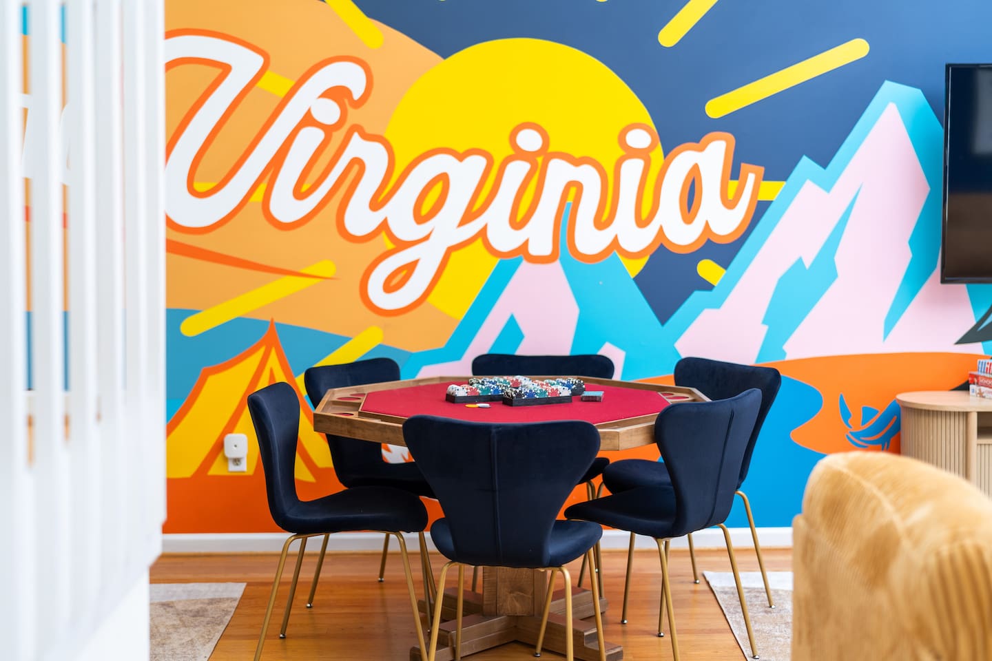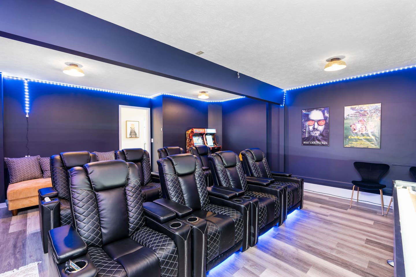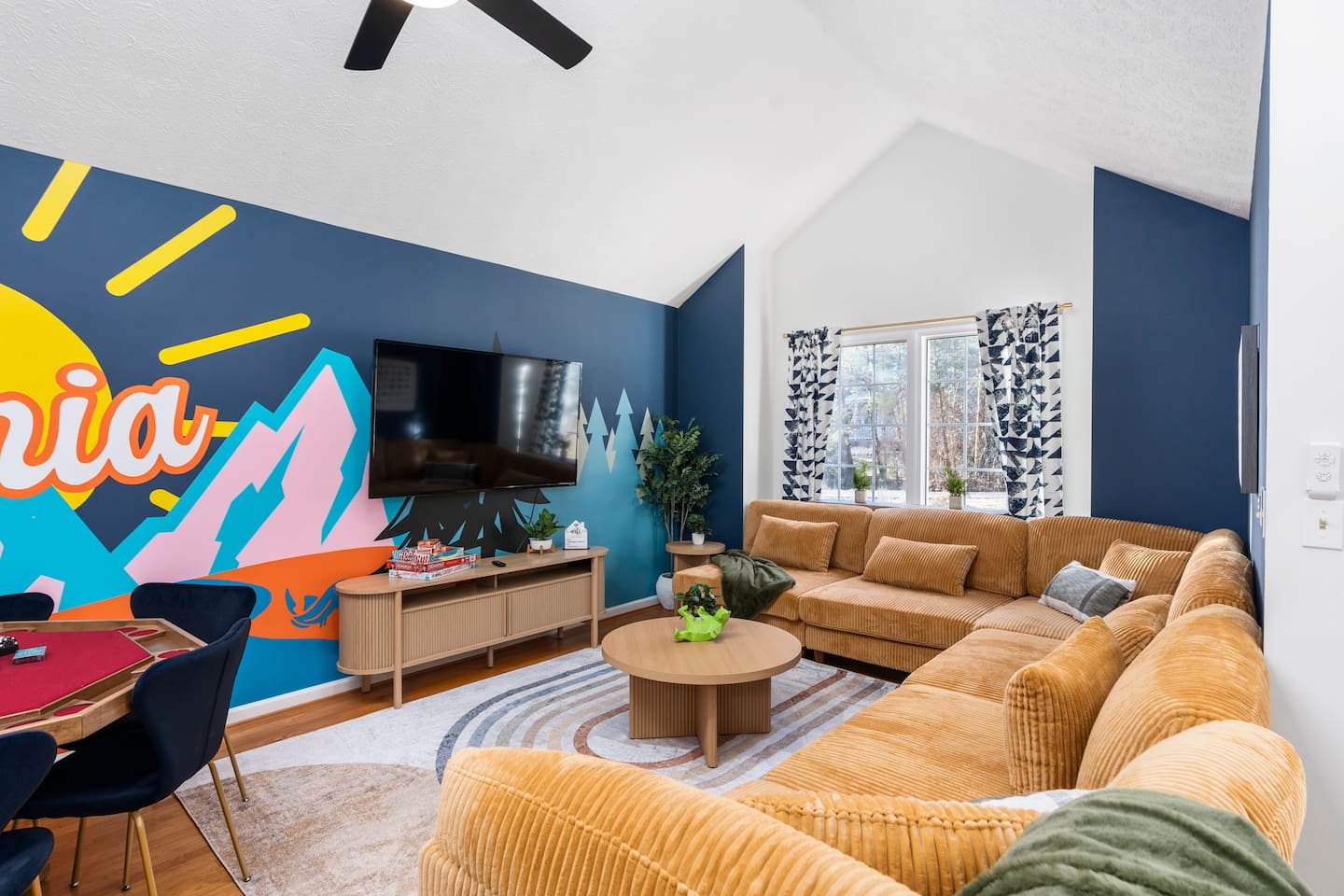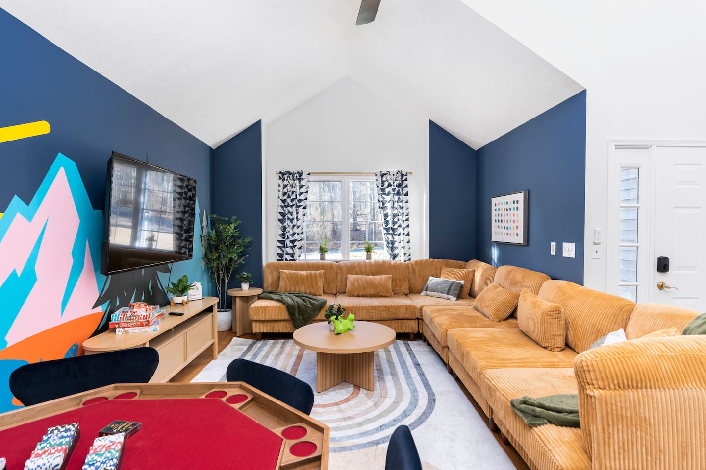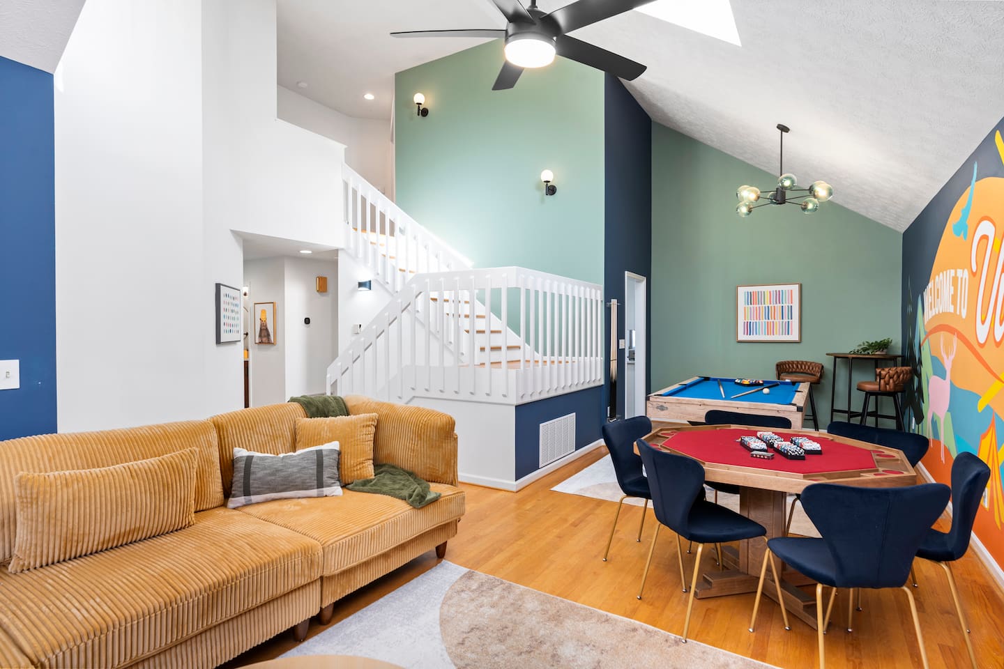 KEY FEATURES: ☀ 6 beautiful bedrooms; 4 kings & 4 queen beds ☀ 3.5 clean, modern bathrooms ☀ Modern kitchen with new, stainless steel appliances ☀ Open living room with lots of comfy seating & smart TV ☀ Dining room with seating to comfortably accommodate 16 ☀ AMAZING game rooms; pool table, shuffleboard, poker table, basketball, & much more! ☀ One-of-a-kind movie theater, with huge TV & tons of theater seating! ☀ Beautiful, private backyard; hot tub, fire pit, bowling, jungle gym, games & more! Here Are A Few Kind Words From Our Past Guests: “This was a great place to stay! The morning light through the windows was so beautiful. Overall, just a relaxing experience. The hosts were super responsive whenever I had a question. I would stay again!” - Emily “Sabrina was very accommodating and communicative. the house is beautiful and very comfortable, close to nature hikes.” - Jennifer “This place was lovely! Exactly as pictured! Very clean and excellent host experience!!! I plan to come back again!” - Regina ☆☆ BEDROOMS ☆☆ There are 6 gorgeous bedrooms throughout this home. Four of the bedrooms have one king bed in each. The 5th and 6th bedrooms have two queen beds in each. ☆☆ BATHROOMS ☆☆ This home has 3 full bathrooms & one half bath. On the first level, the hallway bathroom has 1 sink, toilet, and a shower/tub combo. On the main level there is a half bathroom with a sink & toilet only. On the top level, the master bedroom has a private ensuite bathroom, with two sinks, a toilet, walk-in shower, & luxurious soaking tub. The final bathroom on this floor is a Jack-n-Jill, with 2 sinks, a toilet, & shower/tub combo. ☆☆ KITCHEN & DINING ☆☆ The modern kitchen is located right off of the main living areas, and is loaded with all new stainless steel appliances & a coffee station (including a Keurig & coffee pods). The dining room is right next to the kitchen, with enough seating to comfortably fit 16 people between the large dining table & breakfast nook seating. ☆☆ LIVING ROOM ☆☆ In the living room, you’ll be greeted with lots of comfy seating, a big smart TV, and gorgeous, colorful design along with a massive, fun mural. This is the perfect spot to host your movie nights & games with your friends and family! ☆☆ GAME ROOM ☆☆ Keep your family and friends entertained throughout your stay in our amenity-filled game rooms! Pool table, Pop-a-Shot basketball, shuffle board, poker table, air hockey, arcade games, card games, a big smart TV, & comfy seating. Whether your reason for staying is to explore the town or stay at home and relax, this place will be the perfect spot to unwind! ☆☆ MOVIE THEATER ☆☆ A truly unique space! In this home, you'll find a private movie theater, complete with classic theater seating, a big, 75 inch TV, and true theater ambiance. ☆☆ OUTDOOR SPACE ☆☆ This backyard is everything you could ask for, and more! ☀ Hot tub ☀ TWO fire pits ☀ Bowling ☀ Jungle gym ☀ Mini golf ☀ Corn hole ☀ Giant Connect 4 ☀ BBQ grill ☀ Comfy lounge seating ☀ Outdoor dining There is so much to do here, that all of your friends & family will be thoroughly entertained throughout your entire stay. No matter the season, this backyard has it all. Book your stay with us today and you will NOT be disappointed. Get ready for a vacation you will never forget! ★☆ Book Now & Let Us Take Care Of You In Shenandoah Valley ! ☆★