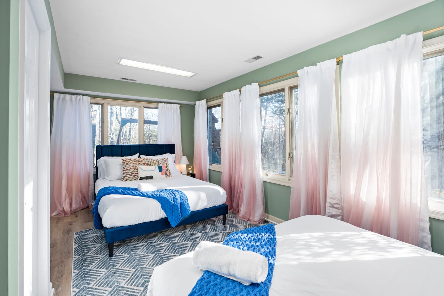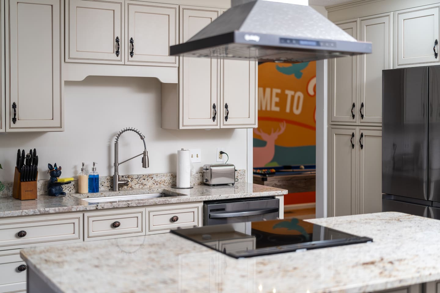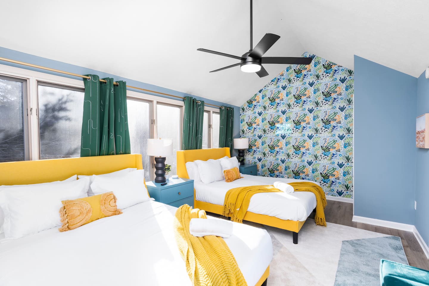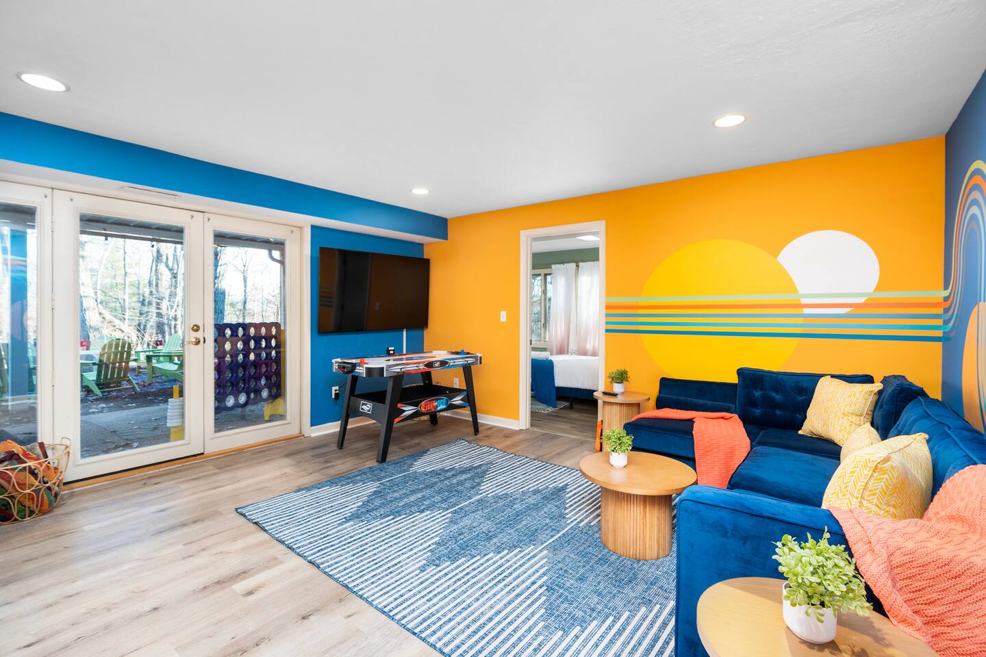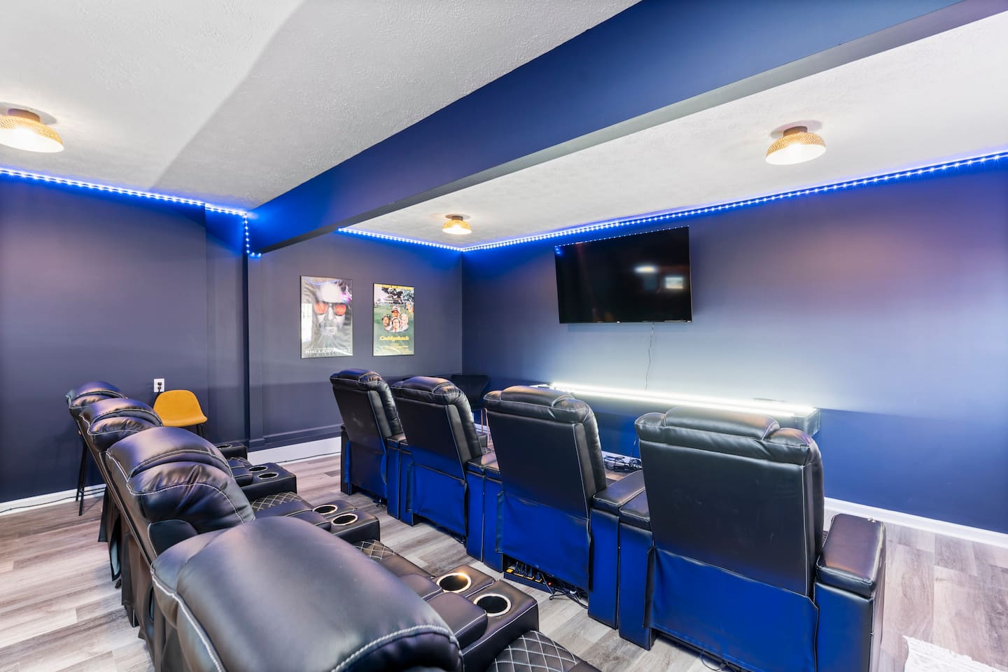 KEY FEATURES: ☀ 6 beautiful bedrooms; 4 kings & 4 queen beds ☀ 3.5 clean, modern bathrooms ☀ Modern kitchen with new, stainless steel appliances ☀ Open living room with lots of comfy seating & smart TV ☀ Dining room with seating to comfortably accommodate 16 ☀ AMAZING game rooms; pool table, shuffleboard, poker table, basketball, & much more! ☀ One-of-a-kind movie theater, with huge TV & tons of theater seating! ☀ Beautiful, private backyard; hot tub, fire pit, bowling, jungle gym, games & more! Here Are A Few Kind Words From Our Past Guests: “This was a great place to stay! The morning light through the windows was so beautiful. Overall, just a relaxing experience. The hosts were super responsive whenever I had a question. I would stay again!” - Emily “Sabrina was very accommodating and communicative. the house is beautiful and very comfortable, close to nature hikes.” - Jennifer “This place was lovely! Exactly as pictured! Very clean and excellent host experience!!! I plan to come back again!” - Regina ☆☆ BEDROOMS ☆☆ There are 6 gorgeous bedrooms throughout this home. Four of the bedrooms have one king bed in each. The 5th and 6th bedrooms have two queen beds in each. ☆☆ BATHROOMS ☆☆ This home has 3 full bathrooms & one half bath. On the first level, the hallway bathroom has 1 sink, toilet, and a shower/tub combo. On the main level there is a half bathroom with a sink & toilet only. On the top level, the master bedroom has a private ensuite bathroom, with two sinks, a toilet, walk-in shower, & luxurious soaking tub. The final bathroom on this floor is a Jack-n-Jill, with 2 sinks, a toilet, & shower/tub combo. ☆☆ KITCHEN & DINING ☆☆ The modern kitchen is located right off of the main living areas, and is loaded with all new stainless steel appliances & a coffee station (including a Keurig & coffee pods). The dining room is right next to the kitchen, with enough seating to comfortably fit 16 people between the large dining table & breakfast nook seating. ☆☆ LIVING ROOM ☆☆ In the living room, you’ll be greeted with lots of comfy seating, a big smart TV, and gorgeous, colorful design along with a massive, fun mural. This is the perfect spot to host your movie nights & games with your friends and family! ☆☆ GAME ROOM ☆☆ Keep your family and friends entertained throughout your stay in our amenity-filled game rooms! Pool table, Pop-a-Shot basketball, shuffle board, poker table, air hockey, arcade games, card games, a big smart TV, & comfy seating. Whether your reason for staying is to explore the town or stay at home and relax, this place will be the perfect spot to unwind! ☆☆ MOVIE THEATER ☆☆ A truly unique space! In this home, you'll find a private movie theater, complete with classic theater seating, a big, 75 inch TV, and true theater ambiance. ☆☆ OUTDOOR SPACE ☆☆ This backyard is everything you could ask for, and more! ☀ Hot tub ☀ TWO fire pits ☀ Bowling ☀ Jungle gym ☀ Mini golf ☀ Corn hole ☀ Giant Connect 4 ☀ BBQ grill ☀ Comfy lounge seating ☀ Outdoor dining There is so much to do here, that all of your friends & family will be thoroughly entertained throughout your entire stay. No matter the season, this backyard has it all. Book your stay with us today and you will NOT be disappointed. Get ready for a vacation you will never forget! ★☆ Book Now & Let Us Take Care Of You In Shenandoah Valley ! ☆★