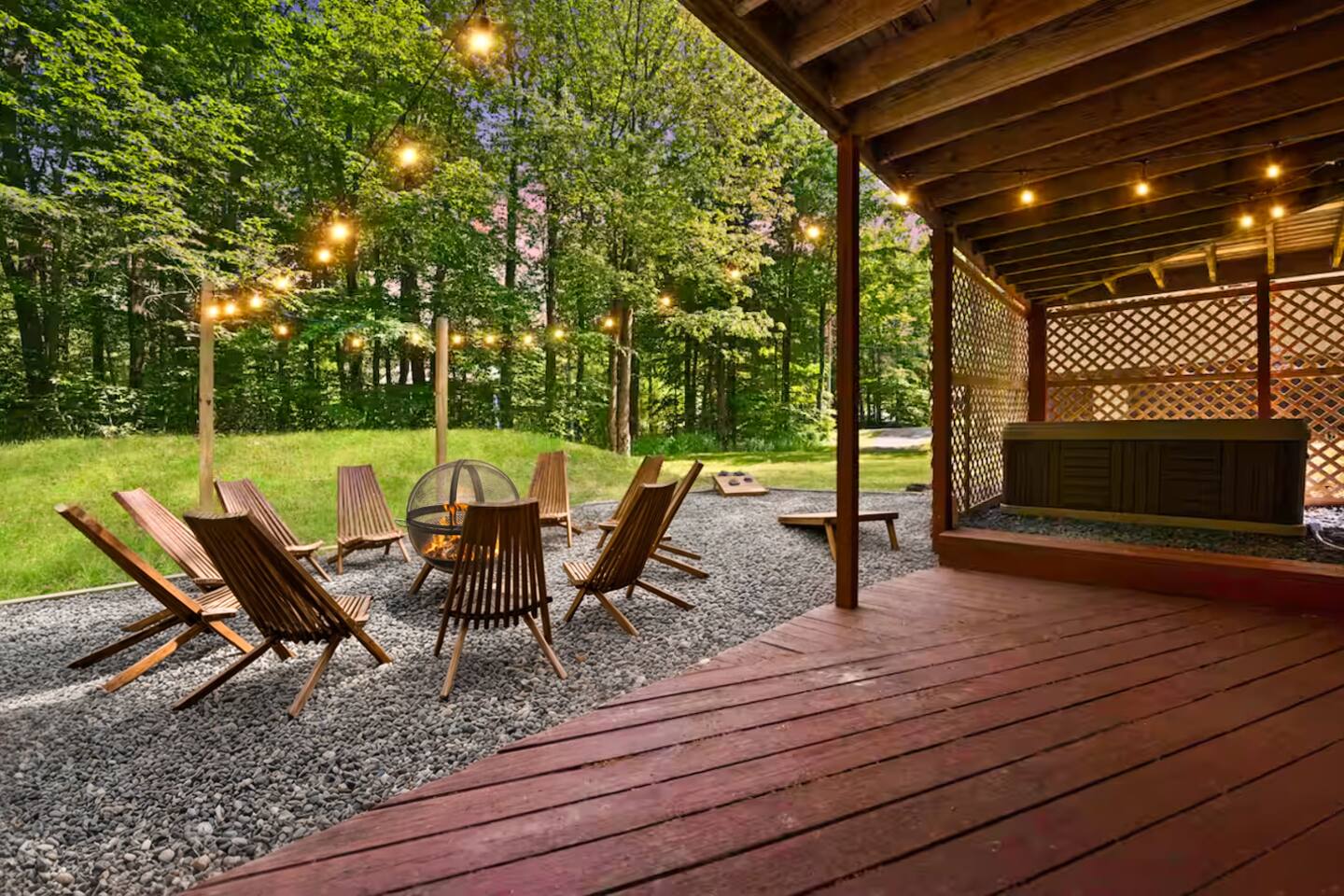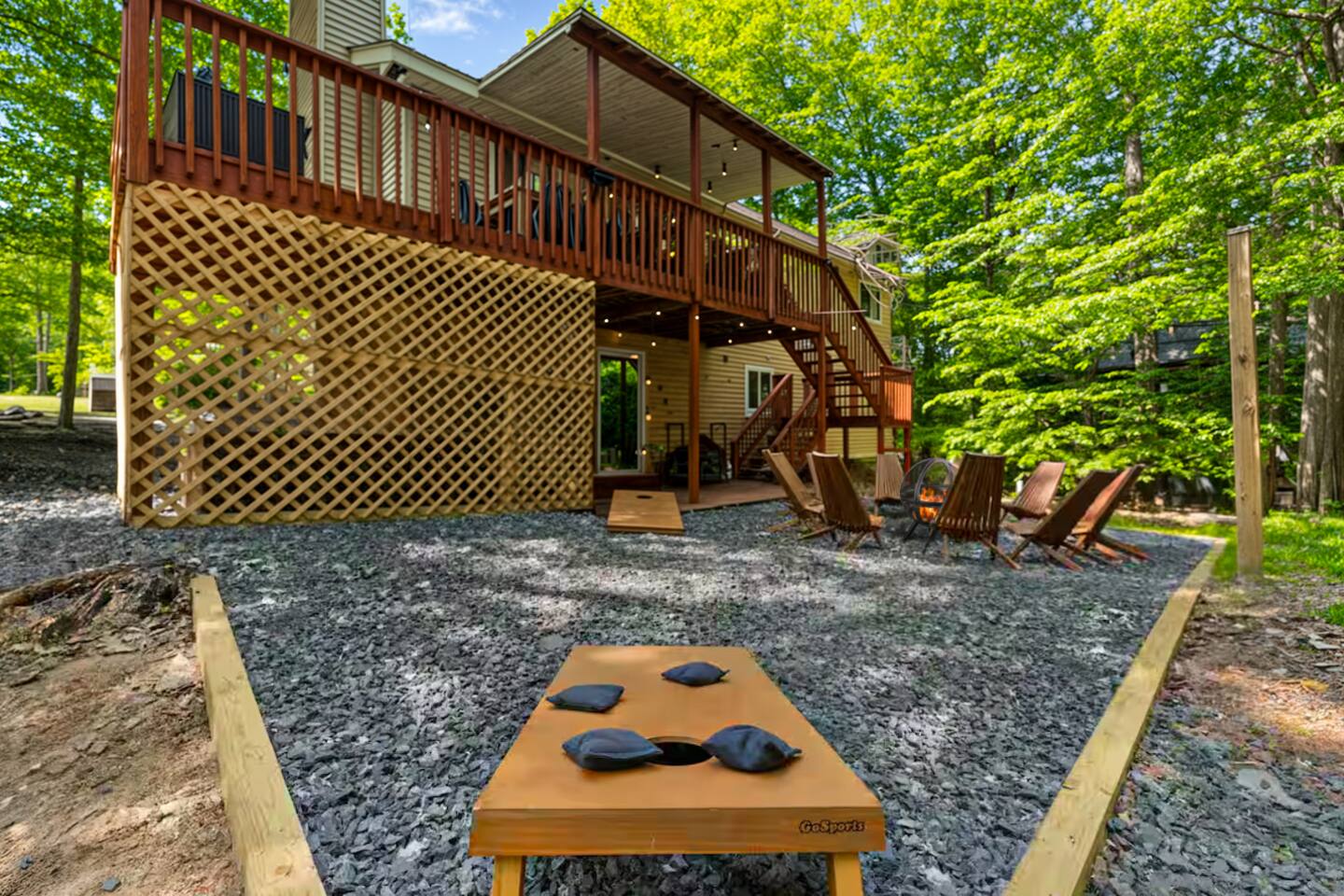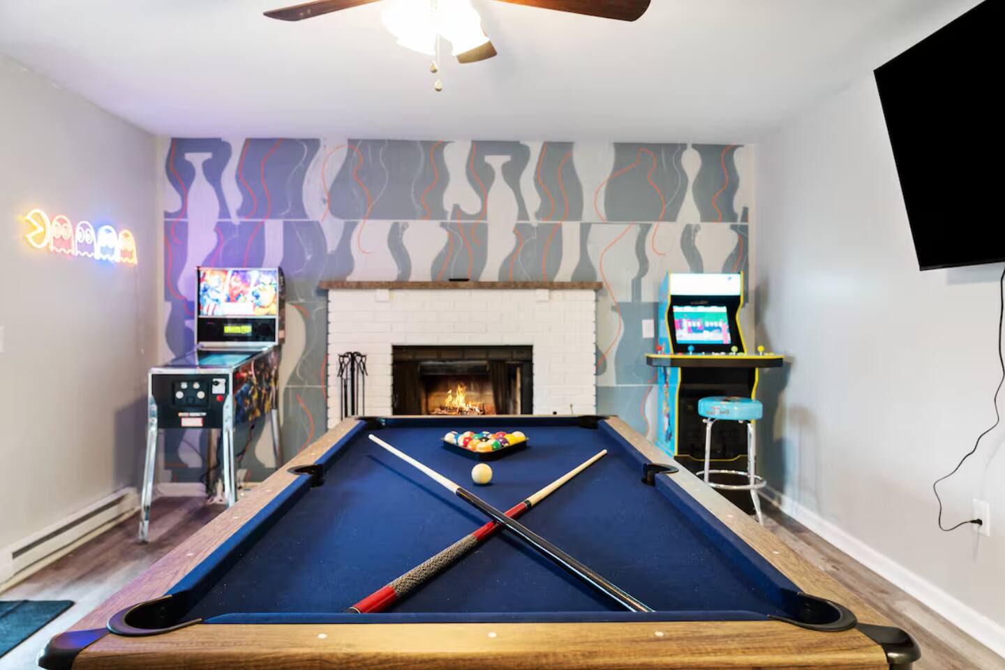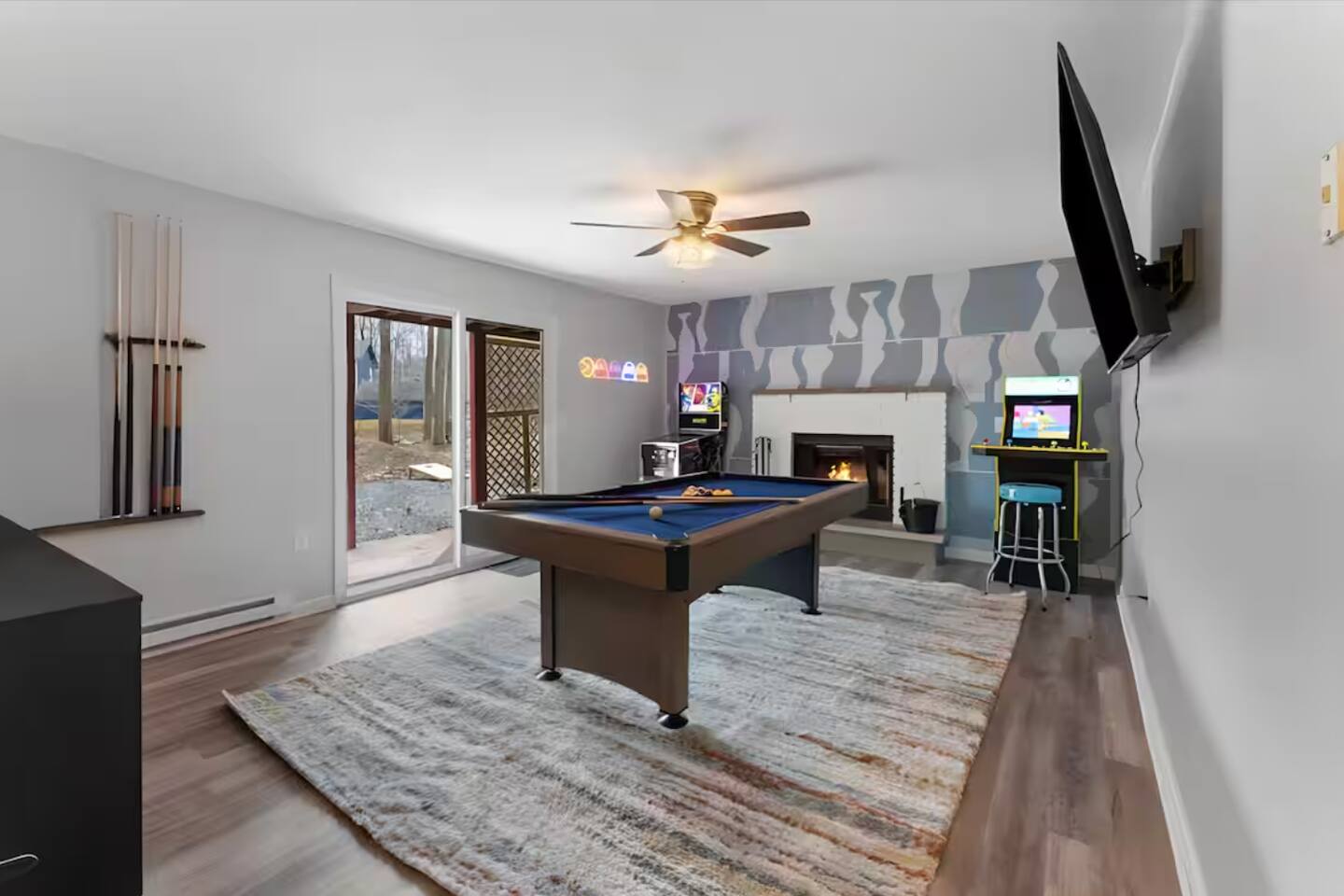 Modern Poconos cabin with TONS of games & amenities! Hot tub, fire pit, pool table, arcade games, two game rooms, and modern upgrades throughout the entire home! This four bedroom cabin has enough space to comfortably accommodate 10 people, with plenty of entertainment for everyone! Enjoy the beauty of the Poconos nature right here at home during your vacation! 10 min – Mount Pocono | 15 min – Kalahari | 30 min – Big Boulder Note: Wood-burning fire pit Experience the Poconos!