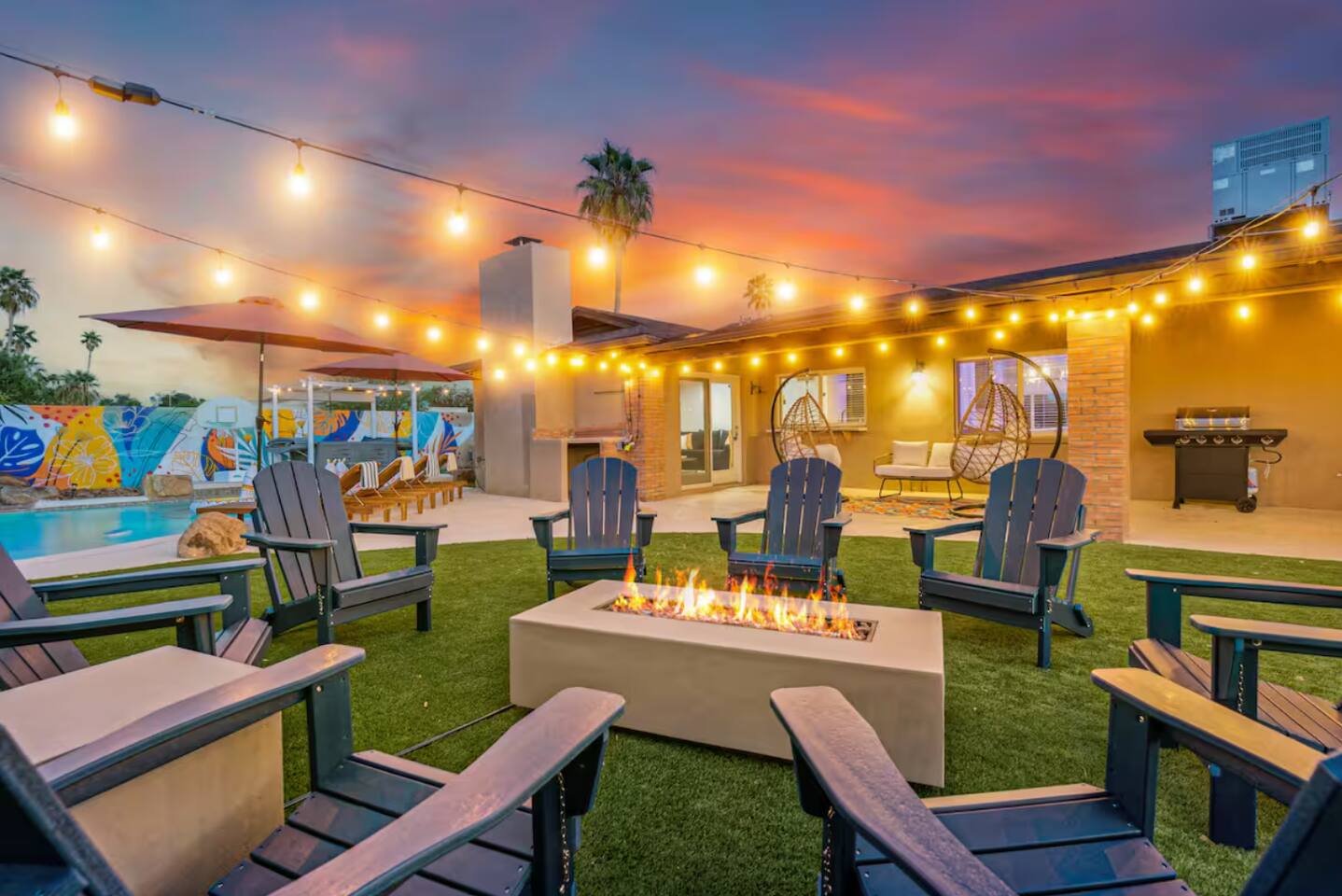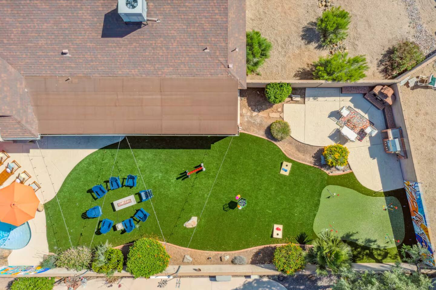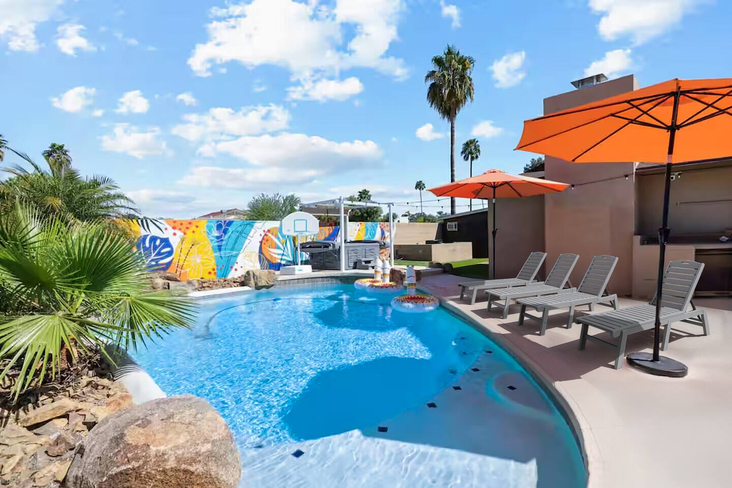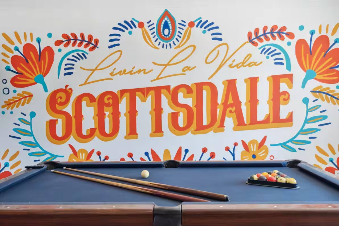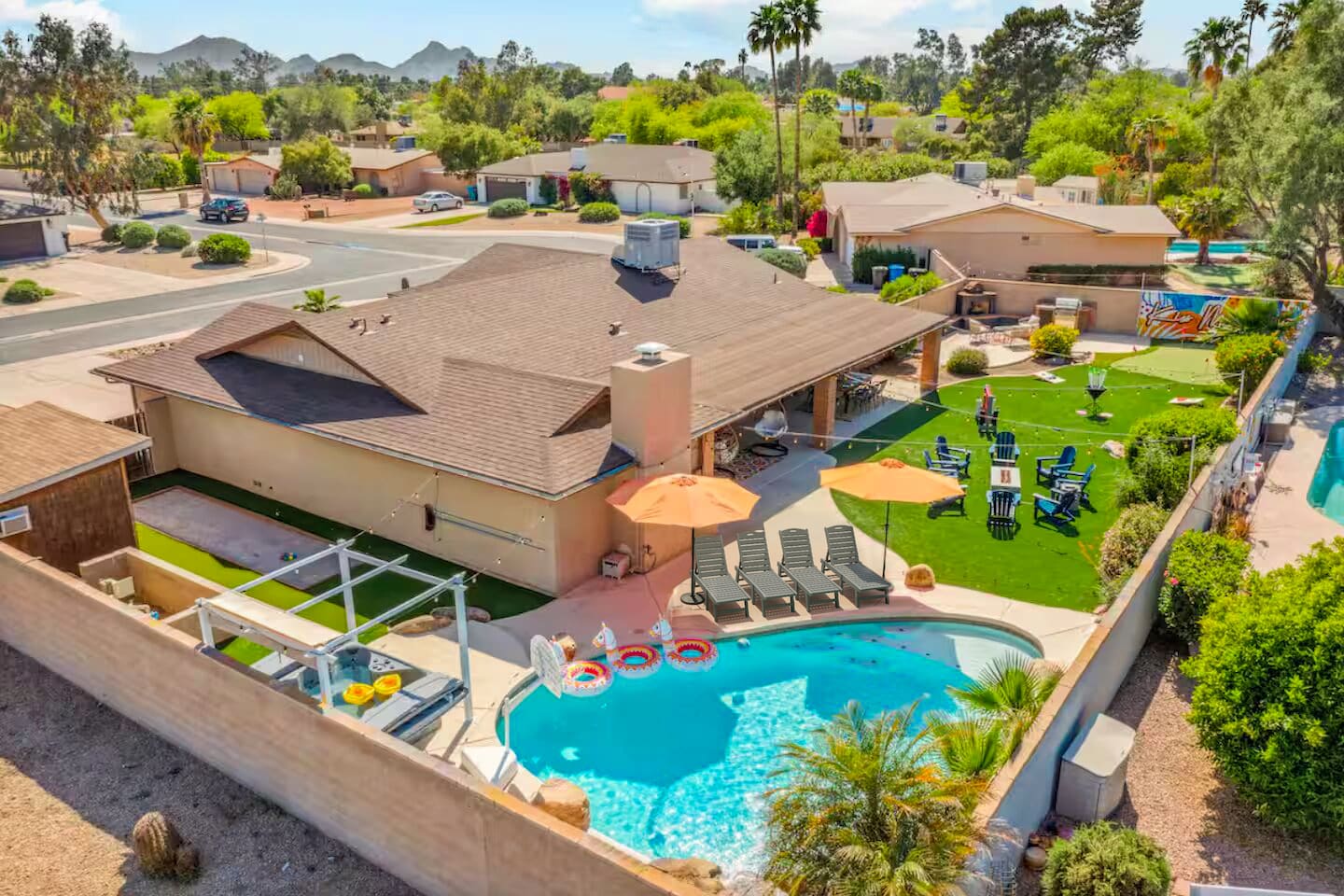 KEY FEATURES: ☀ 4 beautiful bedrooms; 1 king, 1 queen, and 4 full beds (including one full-over-full bunk bed) ☀ 2 full bathrooms ☀ Modern kitchen with new, stainless steel appliances ☀ Open living room with lots of comfy seating & smart TV ☀ Dining room with seating to comfortably accommodate 8 (plus countertop seating & outdoor dining) ☀ Fully-loaded game rooms; pool table, ping pong, arcade games, & more! ☀ AMAZING backyard; heated pool, hot tub, mini golf, fire pit, lots of games, & more! Here Are A Few Kind Words From Our Past Guests: “This was a great place to stay! The morning light through the windows was so beautiful. Overall, just a relaxing experience. The hosts were super responsive whenever I had a question. I would stay again!” - Emily “Sabrina was very accommodating and communicative. the house is beautiful and very comfortable, close to nature hikes.” - Jennifer “This place was lovely! Exactly as pictured! Very clean and excellent host experience!!! I plan to come back again!” - Regina ☆☆ BEDROOMS ☆☆ This home boasts 4 beautiful bedrooms, all carrying through the Spanish theme of the home. The master bedroom has a king bed, smart TV, direct access to the unbelievable backyard, and an attached private ensuite bathroom. Down the hall, one bedroom has a queen bed, while the last two bedrooms have two full beds in each. ☆☆ BATHROOMS ☆☆ You will find two full bathrooms throughout this home. The master bathroom has two sinks, toilet, and a grand walk-in shower. The common area bathroom also has two full sinks, a toilet, and a shower/tub combo, ☆☆ KITCHEN & DINING ☆☆ The modern kitchen is located right off of the main living areas, and is loaded with all new stainless steel appliances & a coffee station (including a Keurig & coffee pods). This gorgeous kitchen overlooks the rest of the main living space, making this a great area for entertaining. The dining room is right next to the kitchen, with enough seating to comfortably fit 8 people. ☆☆ LIVING ROOM ☆☆ In the living room, you’ll be greeted with lots of comfy seating, a big smart TV, and direct access to all the fun that awaits in the backyard. This space is set up in the center of the home, between the amazing outdoors, the open kitchen, and the multiple game rooms, making this a great layout to connect the whole group together. This is the perfect spot to host your movie nights & games with your friends and family! ☆☆ GAME ROOMS ☆☆ Our home has not just one, but TWO game rooms! You will be greeted with the first game room as you enter the home, filled with a pool table, smart TV, and a fun, Spanish-style mural. On the other end of the home, the second game room is PACKED with entertainment. Ping pong, foosball, arcade games, high-top seating, and a smart TV. When you're not enjoying all the amenities in the backyard, you will surely be entertained indoors! ☆☆ OUTDOOR SPACE ☆☆ Not only is this backyard filled with every amenity you could ask for, but it is also masterfully designed to bring the Spanish theme to every corner of the private yard! ☀ Heated pool ☀ Hot Tub ☀ Margarita bar ☀ Mini golf ☀ Bocce ball ☀ Fire pit ☀ Corn hole ☀ Giant Connect 4 ☀ BBQ grill ☀ Sun lounging chairs ☀ Outdoor fireplace ☀ Outdoor lounge seating ☀ Outdoor dining There is so much to do here, that all of your friends & family will be thoroughly entertained throughout your entire stay. No matter the season, this backyard has it all. Book your stay with us today and you will NOT be disappointed. Get ready for a vacation you will never forget! ★☆ Book Now & Let Us Take Care Of You In Scottsdale! ☆★