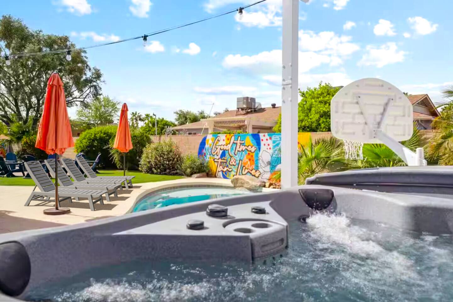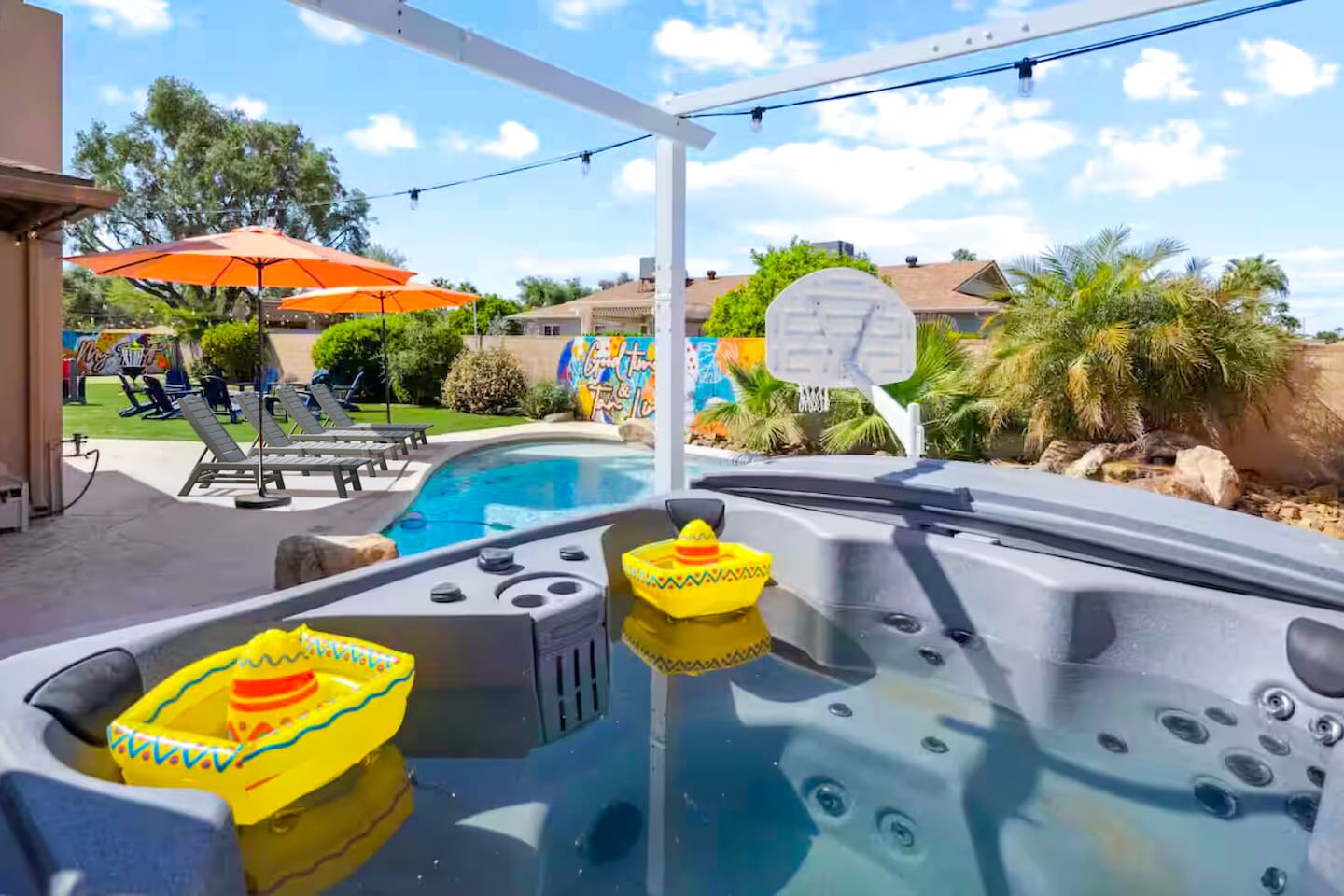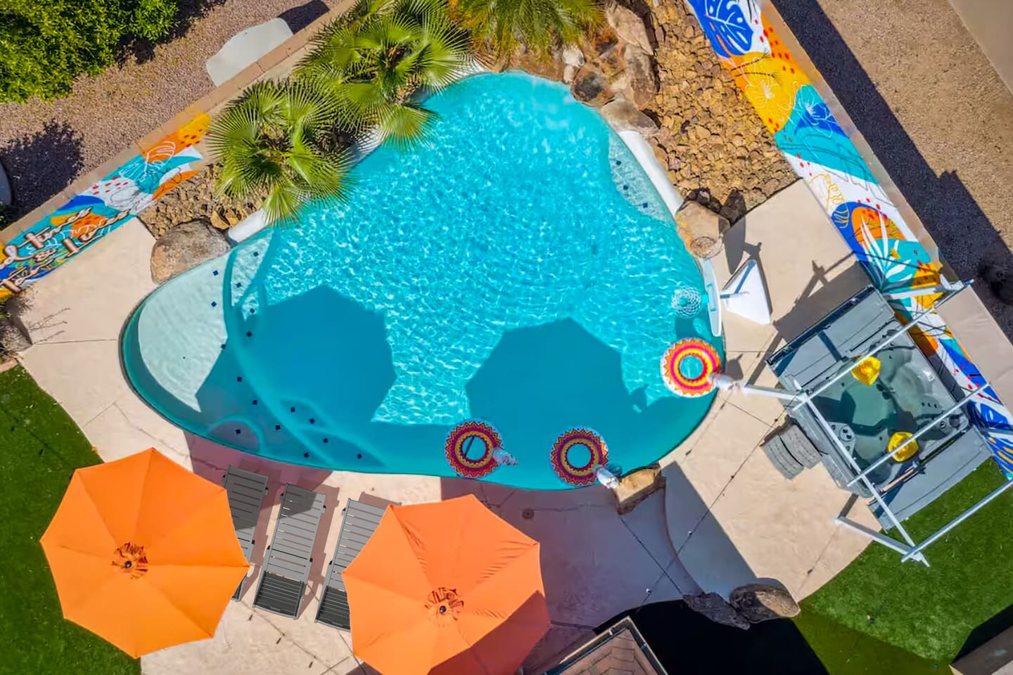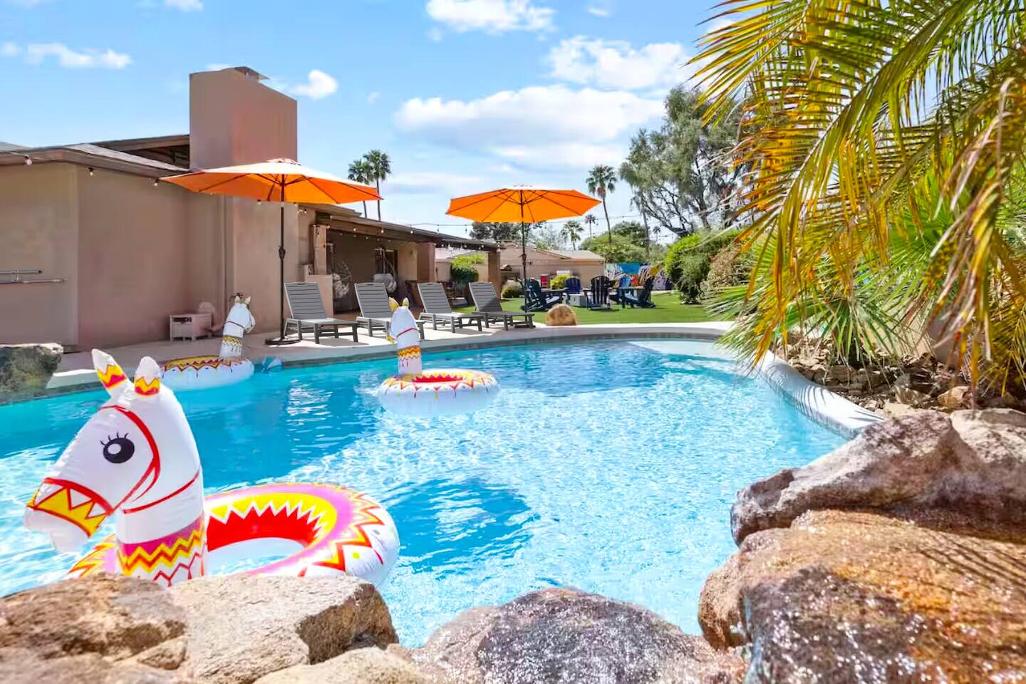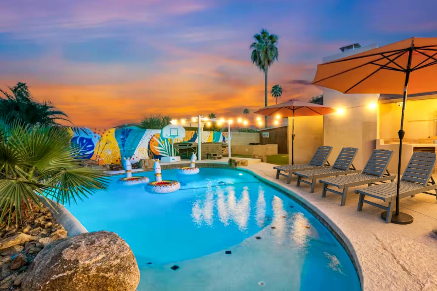KEY FEATURES: ☀ 4 beautiful bedrooms; 1 king, 1 queen, and 4 full beds (including one full-over-full bunk bed) ☀ 2 full bathrooms ☀ Modern kitchen with new, stainless steel appliances ☀ Open living room with lots of comfy seating & smart TV ☀ Dining room with seating to comfortably accommodate 8 (plus countertop seating & outdoor dining) ☀ Fully-loaded game rooms; pool table, ping pong, arcade games, & more! ☀ AMAZING backyard; heated pool, hot tub, mini golf, fire pit, lots of games, & more! Here Are A Few Kind Words From Our Past Guests: “This was a great place to stay! The morning light through the windows was so beautiful. Overall, just a relaxing experience. The hosts were super responsive whenever I had a question. I would stay again!” - Emily “Sabrina was very accommodating and communicative. the house is beautiful and very comfortable, close to nature hikes.” - Jennifer “This place was lovely! Exactly as pictured! Very clean and excellent host experience!!! I plan to come back again!” - Regina ☆☆ BEDROOMS ☆☆ This home boasts 4 beautiful bedrooms, all carrying through the Spanish theme of the home. The master bedroom has a king bed, smart TV, direct access to the unbelievable backyard, and an attached private ensuite bathroom. Down the hall, one bedroom has a queen bed, while the last two bedrooms have two full beds in each. ☆☆ BATHROOMS ☆☆ You will find two full bathrooms throughout this home. The master bathroom has two sinks, toilet, and a grand walk-in shower. The common area bathroom also has two full sinks, a toilet, and a shower/tub combo, ☆☆ KITCHEN & DINING ☆☆ The modern kitchen is located right off of the main living areas, and is loaded with all new stainless steel appliances & a coffee station (including a Keurig & coffee pods). This gorgeous kitchen overlooks the rest of the main living space, making this a great area for entertaining. The dining room is right next to the kitchen, with enough seating to comfortably fit 8 people. ☆☆ LIVING ROOM ☆☆ In the living room, you’ll be greeted with lots of comfy seating, a big smart TV, and direct access to all the fun that awaits in the backyard. This space is set up in the center of the home, between the amazing outdoors, the open kitchen, and the multiple game rooms, making this a great layout to connect the whole group together. This is the perfect spot to host your movie nights & games with your friends and family! ☆☆ GAME ROOMS ☆☆ Our home has not just one, but TWO game rooms! You will be greeted with the first game room as you enter the home, filled with a pool table, smart TV, and a fun, Spanish-style mural. On the other end of the home, the second game room is PACKED with entertainment. Ping pong, foosball, arcade games, high-top seating, and a smart TV. When you're not enjoying all the amenities in the backyard, you will surely be entertained indoors! ☆☆ OUTDOOR SPACE ☆☆ Not only is this backyard filled with every amenity you could ask for, but it is also masterfully designed to bring the Spanish theme to every corner of the private yard! ☀ Heated pool ☀ Hot Tub ☀ Margarita bar ☀ Mini golf ☀ Bocce ball ☀ Fire pit ☀ Corn hole ☀ Giant Connect 4 ☀ BBQ grill ☀ Sun lounging chairs ☀ Outdoor fireplace ☀ Outdoor lounge seating ☀ Outdoor dining There is so much to do here, that all of your friends & family will be thoroughly entertained throughout your entire stay. No matter the season, this backyard has it all. Book your stay with us today and you will NOT be disappointed. Get ready for a vacation you will never forget! ★☆ Book Now & Let Us Take Care Of You In Scottsdale! ☆★