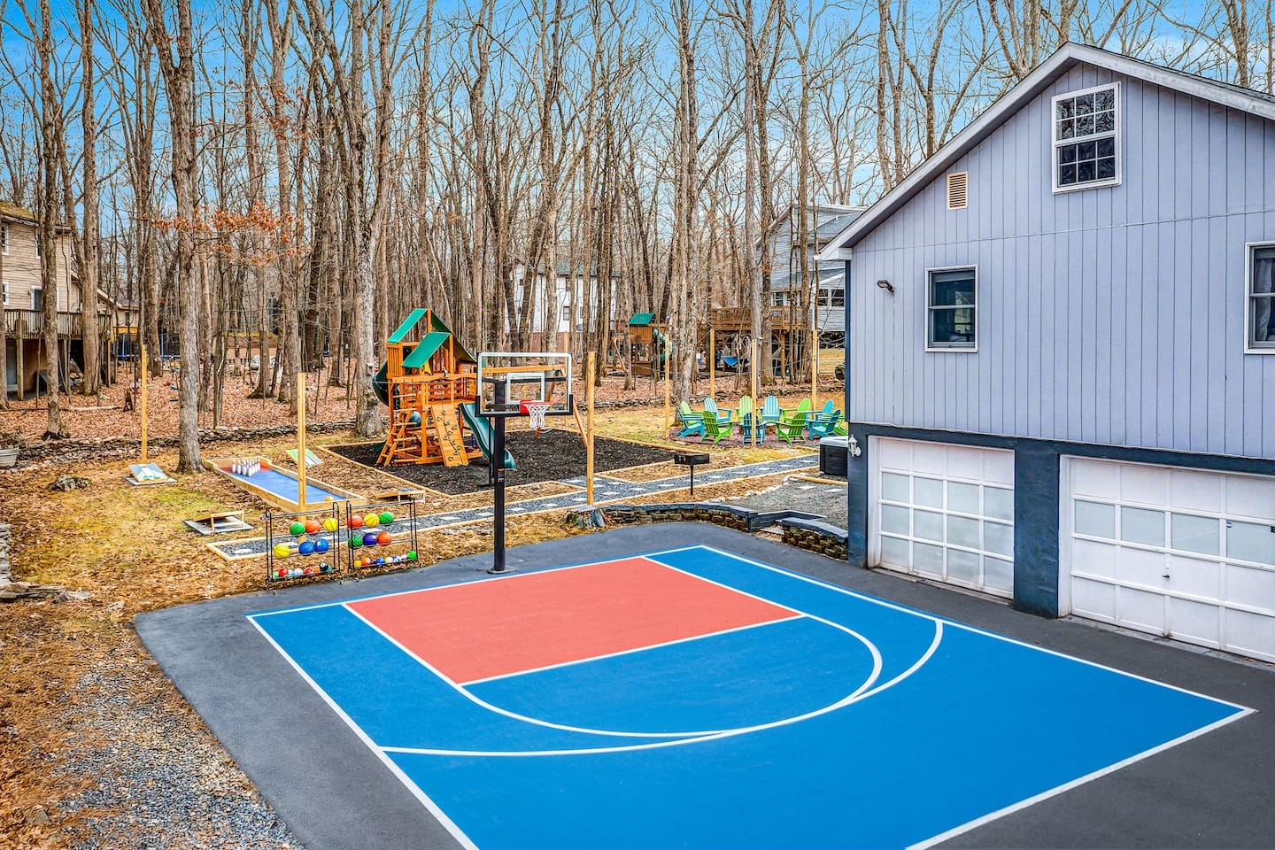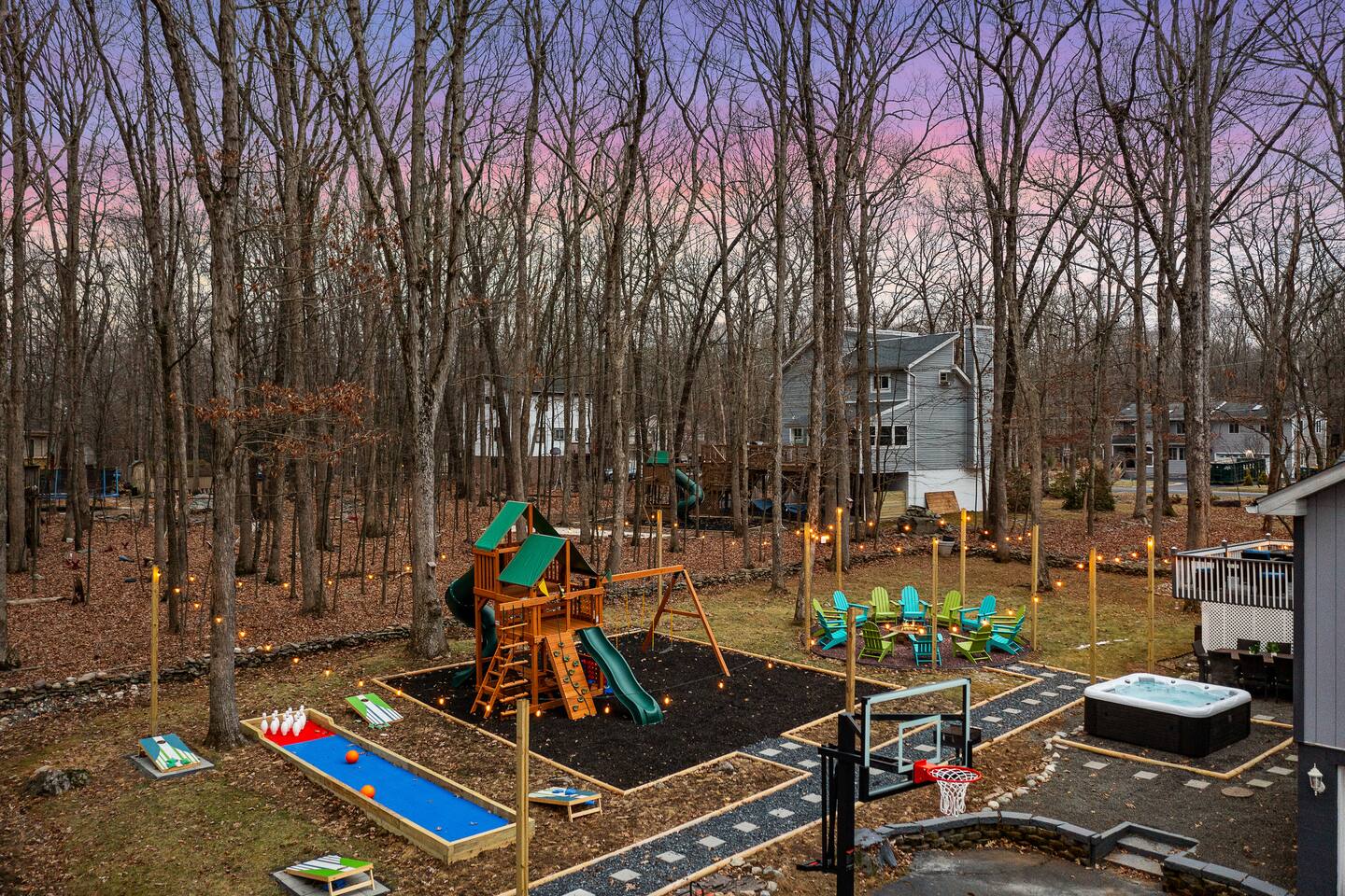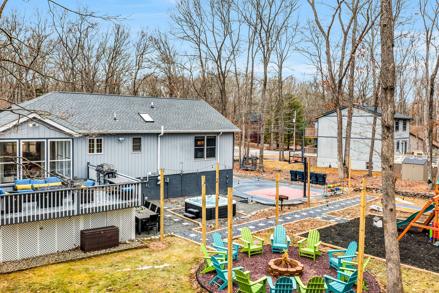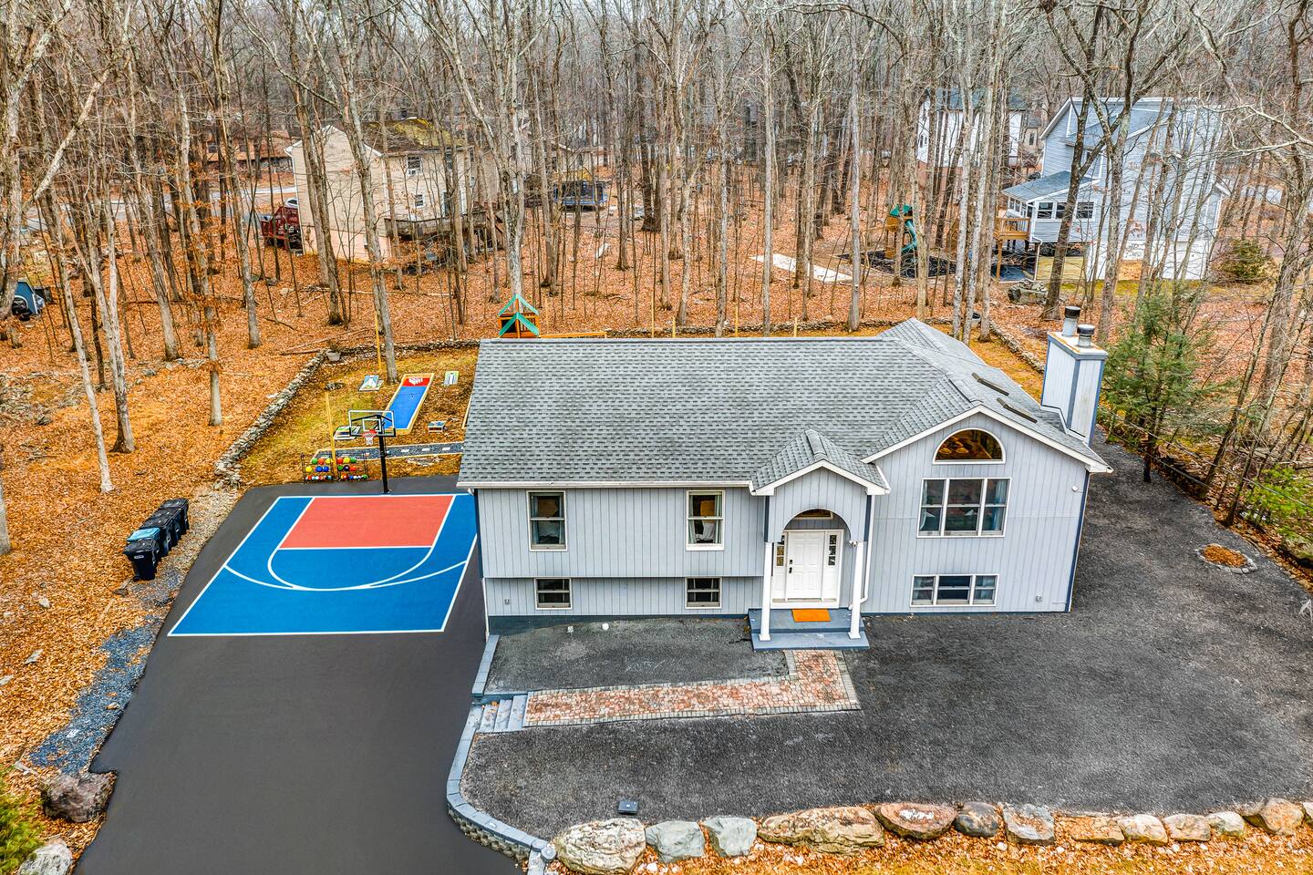 **During the summer months (Memorial Day weekend - Labor Day weekend), you will receive amenity badges that allow you to access the following amenities. If you’re staying with us outside of these dates, these amenities will be closed.** ☀ Lakes (with beach access - swimming allowed!) ☀ Pools ☀ Tennis courts ☀ Basketball courts ☀ Volleyball courts ☀ Dog park ☀ Playground areas KEY FEATURES: ☀ 5 beautiful bedrooms; 2 kings, 2 queens, and 2 full beds ☀ 3 full, modern bathrooms ☀ Modern kitchen ☀ Open living room with lots of comfy seating & smart TV ☀ Stylish dining room that opens up to the rest of the living space ☀ Super fun game room with pool table, poker table, pop-a-shot, & more! ☀ A private MOVIE THEATER with a massive projector screen ☀ AMAZING backyard, with a hot tub, fire pit, bowling & more! Here Are A Few Kind Words From Our Past Guests: “This was a great place to stay! The morning light through the windows was so beautiful. Overall, just a relaxing experience. The hosts were super responsive whenever I had a question. I would stay again!” - Emily “Sabrina was very accommodating and communicative. the house is beautiful and very comfortable, close to nature hikes.” - Jennifer “This place was lovely! Exactly as pictured! Very clean and excellent host experience!!! I plan to come back again!” - Regina ☆☆ BEDROOMS ☆☆ These 5 bedrooms in this home are truly designed for style & comfort, each with their own smart TV! Upstairs, the large master bedroom has a king bed and a private ensuite bathroom. Right across the hall, there are two more bedrooms, with 1 queen bed in each. Downstairs, there is a second "master" bedroom, with a king bed, fire place, and little seating area - super cozy! Right next door is the fifth & final bedroom, with two full beds. ☆☆ BATHROOMS ☆☆ There are 3 full, modern bathrooms throughout this home. Upstairs, the private master ensuite has a sink, toilet, soaking tub, and walk-in shower. Right down the hall is the second bathroom, with a sink, toilet, and shower/tub combo. Downstairs, the third bathroom also has a sink, toilet, and shower/tub combo. ☆☆ KITCHEN & DINING ☆☆ The modern kitchen is located right off of the main living areas, and is loaded with all you'll need during your stay (including a coffee maker & coffee pods). The kitchen also has a 4-seater table in its little breakfast nook. The dining room is right next to the kitchen, with enough seating to comfortably fit 8 more people. This space is truly sleek & stylish! ☆☆ LIVING ROOM ☆☆ In the living room, you’ll be greeted with tall vaulted ceilings, skylights, lots of comfy seating & a big smart TV. This is the perfect spot to gather with your friends and family! ☆☆ GAME ROOM ☆☆ The game room is located on the lower level, filled with a pool table, poker table, and pop-a-shot, and giant Connect 4. Such a fun space to provide you with all the entertainment you need during your stay! ☆☆ MOVIE THEATER ☆☆ Right next to the game room is your very own, private movie theater! With a huge theater-style sectional couch (built-in cup holders), foosball, and a HUGE projector screen, this is a DREAM spot to host your movie nights with your friends and family! ☆☆ OUTDOOR SPACE ☆☆ This backyard is everything you could ask for, and more! ☀ Basketball court ☀ Hot tub ☀ Fire pits (one wood burning, one propane) ☀ Mini golf (in sun room, next to deck) ☀ Bowling ☀ Jungle gym ☀ Corn hole ☀ Giant Connect 4 ☀ BBQ grill ☀ Outdoor lounge seating There is so much to do here, that all of your friends & family will be thoroughly entertained throughout your entire stay. No matter the season, this backyard has it all. Book your stay with us today and you will NOT be disappointed. Get ready for a vacation you will never forget! ★☆ Book Now & Let Us Take Care Of You In The Poconos! ☆★
