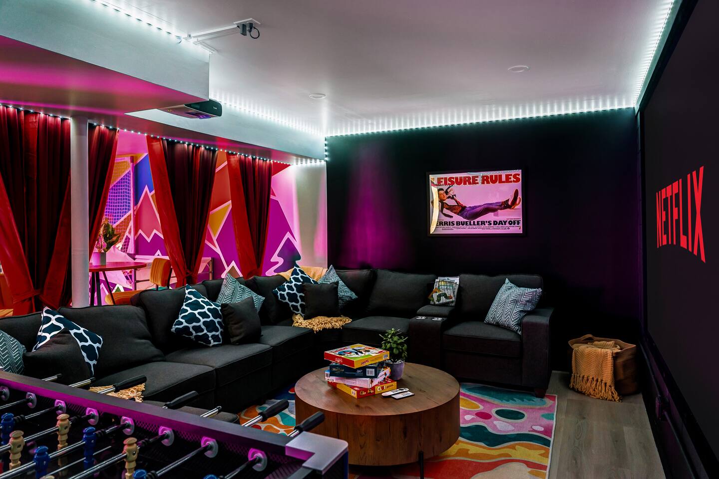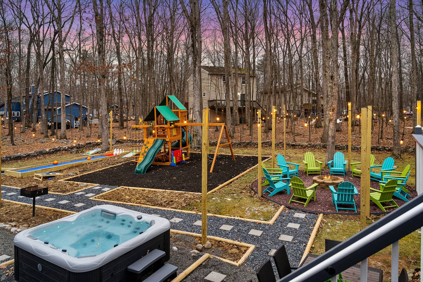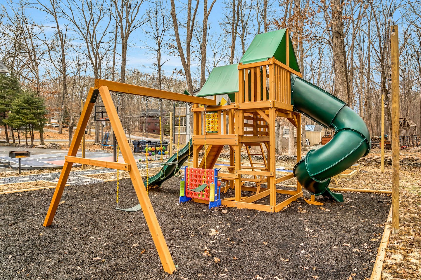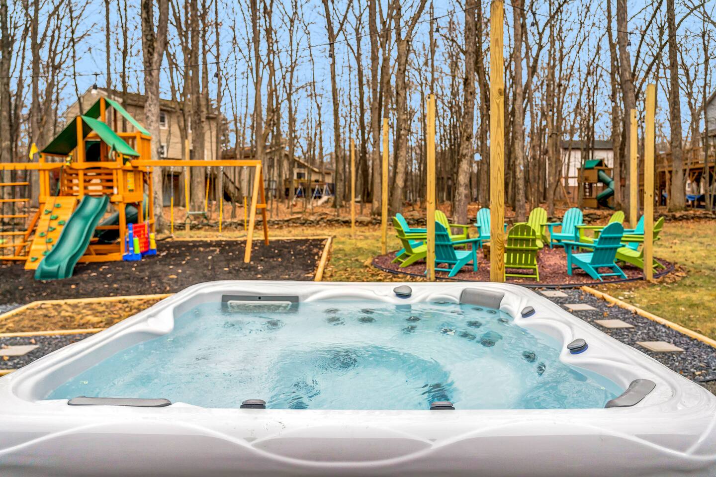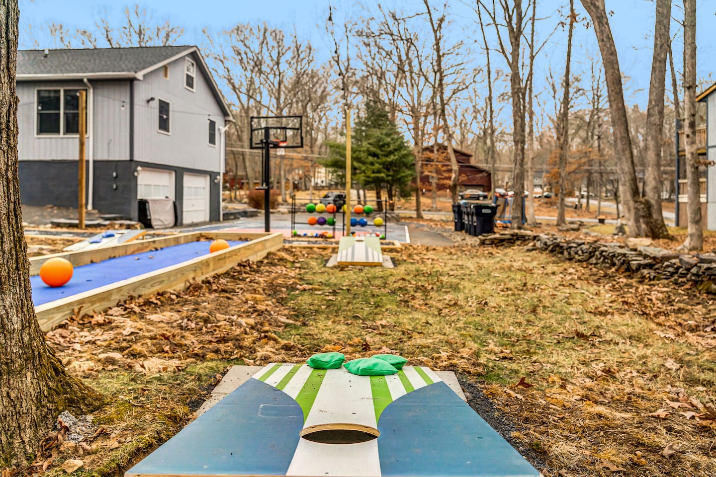 **During the summer months (Memorial Day weekend - Labor Day weekend), you will receive amenity badges that allow you to access the following amenities. If you’re staying with us outside of these dates, these amenities will be closed.** ☀ Lakes (with beach access - swimming allowed!) ☀ Pools ☀ Tennis courts ☀ Basketball courts ☀ Volleyball courts ☀ Dog park ☀ Playground areas KEY FEATURES: ☀ 5 beautiful bedrooms; 2 kings, 2 queens, and 2 full beds ☀ 3 full, modern bathrooms ☀ Modern kitchen ☀ Open living room with lots of comfy seating & smart TV ☀ Stylish dining room that opens up to the rest of the living space ☀ Super fun game room with pool table, poker table, pop-a-shot, & more! ☀ A private MOVIE THEATER with a massive projector screen ☀ AMAZING backyard, with a hot tub, fire pit, bowling & more! Here Are A Few Kind Words From Our Past Guests: “This was a great place to stay! The morning light through the windows was so beautiful. Overall, just a relaxing experience. The hosts were super responsive whenever I had a question. I would stay again!” - Emily “Sabrina was very accommodating and communicative. the house is beautiful and very comfortable, close to nature hikes.” - Jennifer “This place was lovely! Exactly as pictured! Very clean and excellent host experience!!! I plan to come back again!” - Regina ☆☆ BEDROOMS ☆☆ These 5 bedrooms in this home are truly designed for style & comfort, each with their own smart TV! Upstairs, the large master bedroom has a king bed and a private ensuite bathroom. Right across the hall, there are two more bedrooms, with 1 queen bed in each. Downstairs, there is a second "master" bedroom, with a king bed, fire place, and little seating area - super cozy! Right next door is the fifth & final bedroom, with two full beds. ☆☆ BATHROOMS ☆☆ There are 3 full, modern bathrooms throughout this home. Upstairs, the private master ensuite has a sink, toilet, soaking tub, and walk-in shower. Right down the hall is the second bathroom, with a sink, toilet, and shower/tub combo. Downstairs, the third bathroom also has a sink, toilet, and shower/tub combo. ☆☆ KITCHEN & DINING ☆☆ The modern kitchen is located right off of the main living areas, and is loaded with all you'll need during your stay (including a coffee maker & coffee pods). The kitchen also has a 4-seater table in its little breakfast nook. The dining room is right next to the kitchen, with enough seating to comfortably fit 8 more people. This space is truly sleek & stylish! ☆☆ LIVING ROOM ☆☆ In the living room, you’ll be greeted with tall vaulted ceilings, skylights, lots of comfy seating & a big smart TV. This is the perfect spot to gather with your friends and family! ☆☆ GAME ROOM ☆☆ The game room is located on the lower level, filled with a pool table, poker table, and pop-a-shot, and giant Connect 4. Such a fun space to provide you with all the entertainment you need during your stay! ☆☆ MOVIE THEATER ☆☆ Right next to the game room is your very own, private movie theater! With a huge theater-style sectional couch (built-in cup holders), foosball, and a HUGE projector screen, this is a DREAM spot to host your movie nights with your friends and family! ☆☆ OUTDOOR SPACE ☆☆ This backyard is everything you could ask for, and more! ☀ Basketball court ☀ Hot tub ☀ Fire pits (one wood burning, one propane) ☀ Mini golf (in sun room, next to deck) ☀ Bowling ☀ Jungle gym ☀ Corn hole ☀ Giant Connect 4 ☀ BBQ grill ☀ Outdoor lounge seating There is so much to do here, that all of your friends & family will be thoroughly entertained throughout your entire stay. No matter the season, this backyard has it all. Book your stay with us today and you will NOT be disappointed. Get ready for a vacation you will never forget! ★☆ Book Now & Let Us Take Care Of You In The Poconos! ☆★