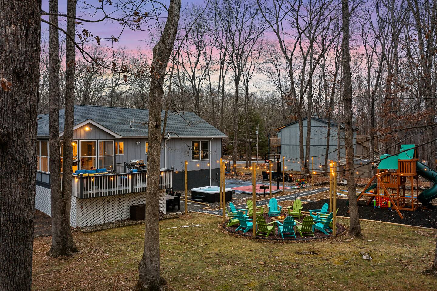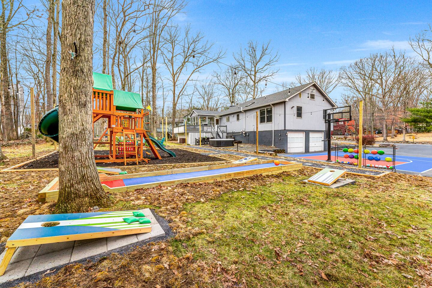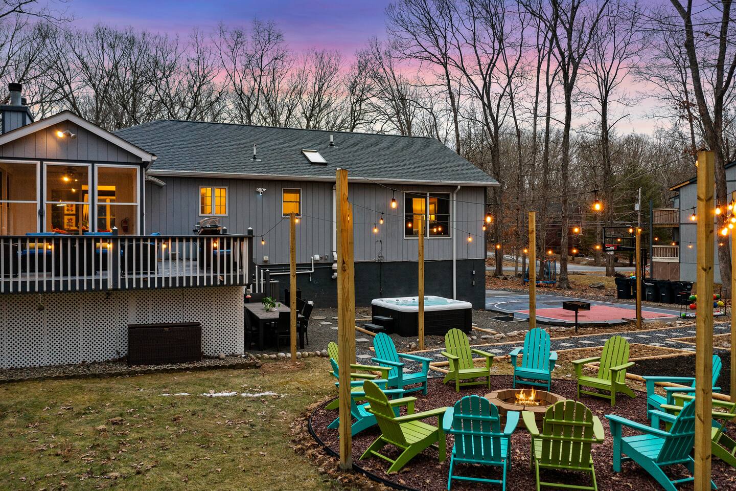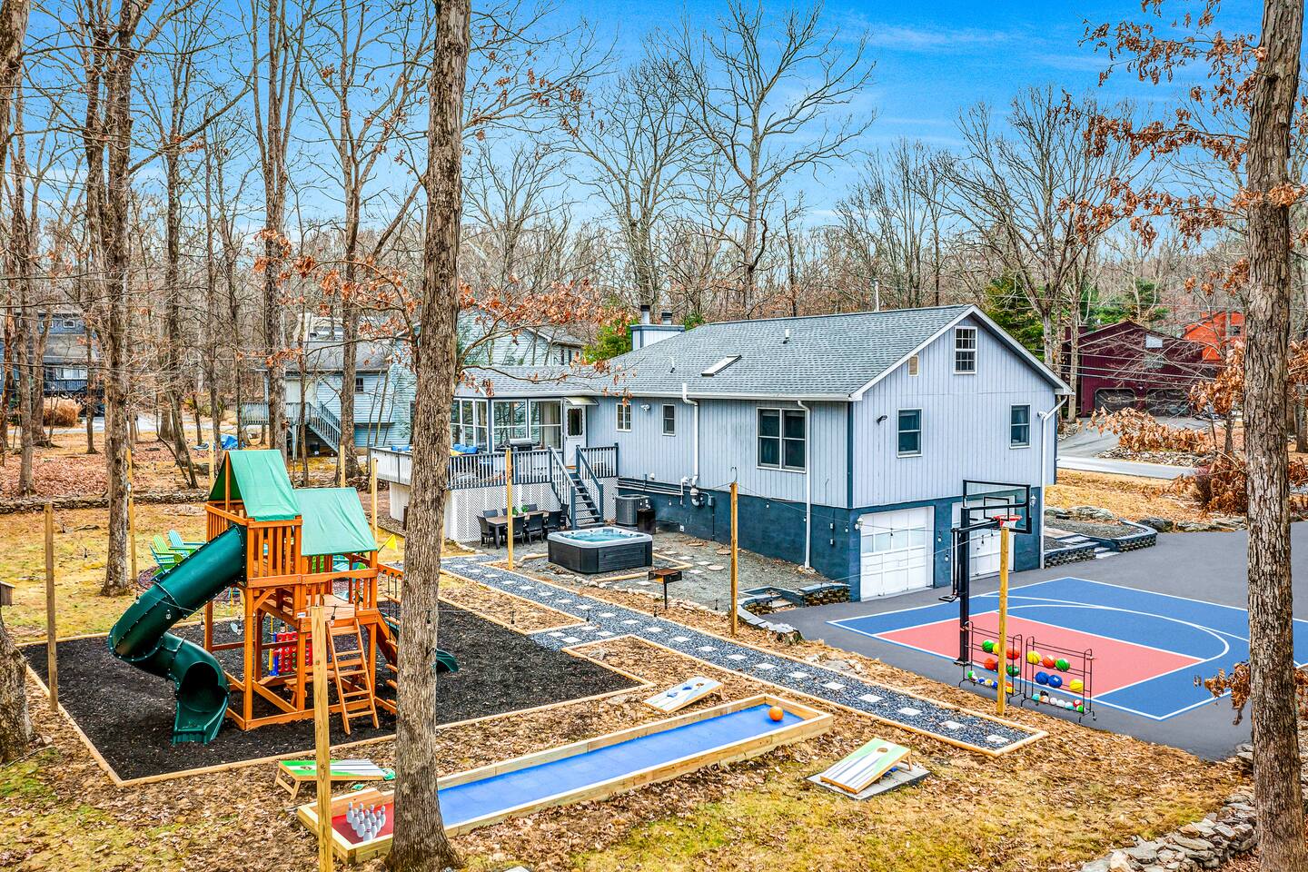 Conveniently located just minutes away from all the natural attractions that the Poconos has to offer (lakes, hiking, & more!), you will have all the amenities & entertainment you could need right here at home. Basketball court, hot tub, fire pit, mini golf, pool table, and much more! 15 min - Delaware Water Gap, Downtown Stroudsburg 20 min - Kalahari Resort, Shawnee Mountain, Big Pocono State Park 30 min - Bushkill Falls Experience The Poconos With Us & Learn More Below!