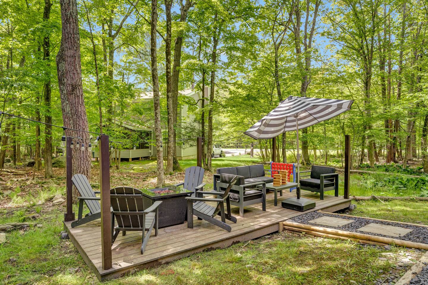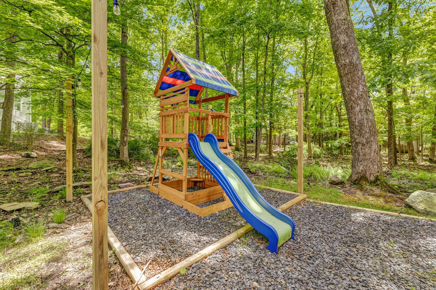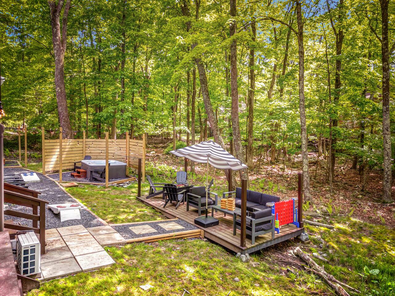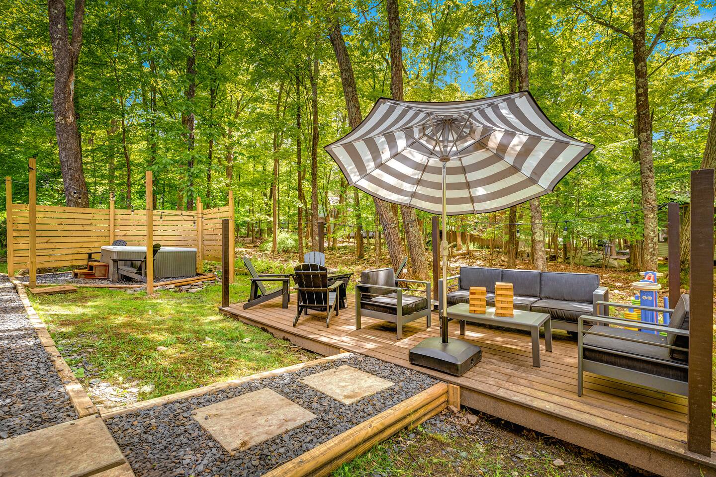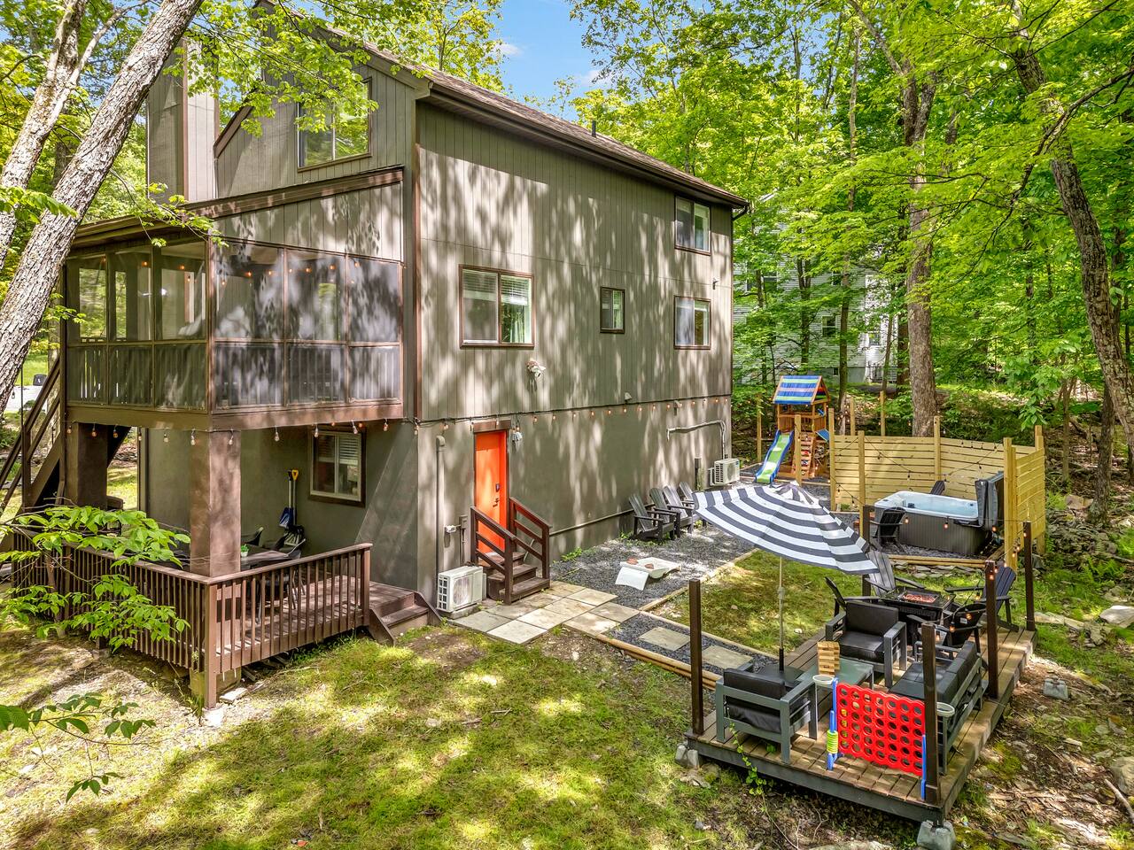 **During the summer months (Memorial Day weekend - Labor Day weekend), you will receive amenity badges that allow you to access the following amenities. If you’re staying with us outside of these dates, these amenities will be closed.** ☀ Lakes (with beach access - swimming allowed!) ☀ Pools ☀ Tennis courts ☀ Basketball courts ☀ Volleyball courts ☀ Dog park ☀ Playground areas KEY FEATURES: ☀ 5 beautiful bedrooms; 2 kings, 1 queen, 1 full, & 5 twin beds ☀ 3 modern, full bathrooms ☀ Modern kitchen with new, stainless steel appliances ☀ Open living room with lots of comfy seating & smart TV ☀ Dining room with seating to comfortably accommodate 12 (+ outdoor dining) ☀ Incredible game room with pool table, arcade games & more! ☀ Private & serene backyard, with a hot tub, fire pit, & more! Here Are A Few Kind Words From Our Past Guests: “This was a great place to stay! The morning light through the windows was so beautiful. Overall, just a relaxing experience. The hosts were super responsive whenever I had a question. I would stay again!” - Emily “Sabrina was very accommodating and communicative. the house is beautiful and very comfortable, close to nature hikes.” - Jennifer “This place was lovely! Exactly as pictured! Very clean and excellent host experience!!! I plan to come back again!” - Regina ☆☆ BEDROOMS ☆☆ Each of the 5 bedrooms in this home have been beautifully designed for comfort - every bedroom in this home has a 55" smart TV. On the bottom floor, one of the game rooms also doubles as a bedroom, with a twin-over-full bunk, smart TV, and an attached full bathroom. On the main floor, the second bedroom has a queen bed. On the third floor, the third & fourth bedrooms have one king bed in each. The fifth bedroom has two twin-over-twin bunk beds (4 twin beds total). ☆☆ BATHROOMS ☆☆ There are three full, modern bathrooms in this home - each with a sink, toilet, and walk-in shower only. The bathroom on the first floor is shared between the two game rooms. On the main floor, the bathroom is accessible right off of the bedroom, and also accessible from the hallway. The third bathroom on the top floor is accessible off the hallway, for all bedrooms on this floor to share. ☆☆ KITCHEN & DINING ☆☆ The modern kitchen is located right off of the main living areas, and is loaded with all new stainless steel appliances & a coffee station (including a Keurig & coffee pods). The dining room is right next to the kitchen, with enough seating to comfortably fit 12 people, plus outdoor dining options! ☆☆ LIVING ROOM ☆☆ In the living room, you’ll be greeted with lots of comfy seating & a big smart TV. This is the perfect spot to host your movie nights & games with your friends and family! ☆☆ GAME ROOMS ☆☆ Keep your family and friends entertained throughout your stay in our fun game rooms! Pool table, foosball, arcade games, basketball Pop-a-Short, comfy seating with a smart TV, and lots of board games & card games. Whether your reason for staying is to explore the town or stay at home and relax, this place will be the perfect spot to unwind! ☆☆ OUTDOOR SPACE ☆☆ This backyard is everything you could ask for, and more! ☀ Hot tub ☀ Fire pit ☀ Kids' play house with slide ☀ Corn hole ☀ Giant Connect 4 ☀ Giant Jenga ☀ BBQ grill ☀ Outdoor dining ☀ Outdoor lounge seating There is so much to do here, that all of your friends & family will be thoroughly entertained throughout your entire stay. No matter the season, this backyard has it all. Book your stay with us today and you will NOT be disappointed. Get ready for a vacation you will never forget! ★☆ Book Now & Let Us Take Care Of You In The Poconos! ☆★