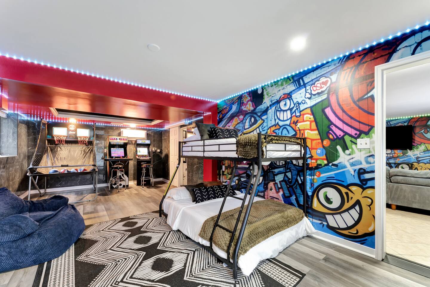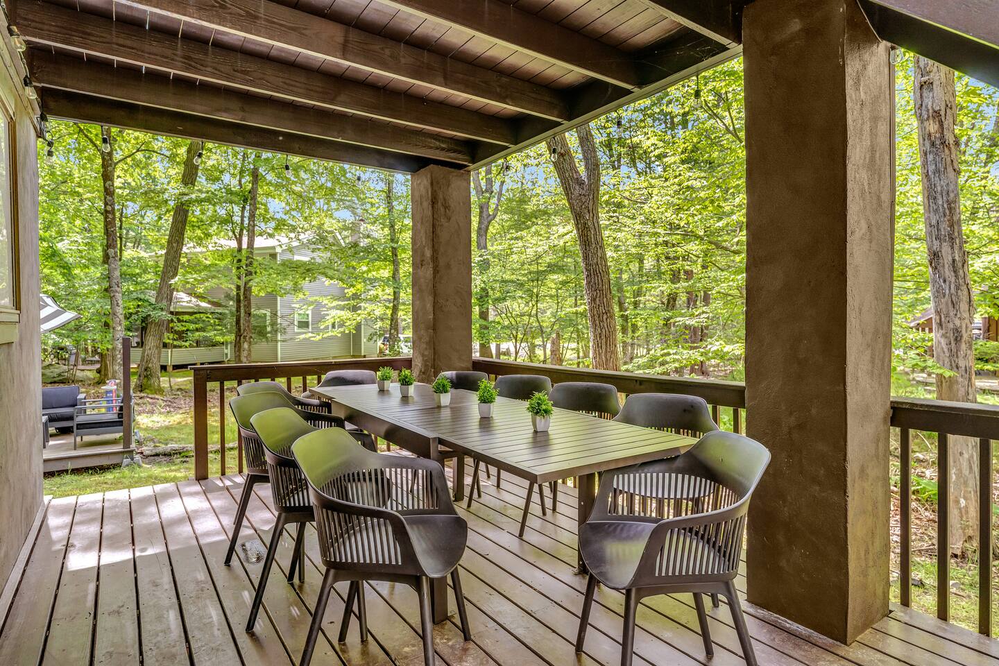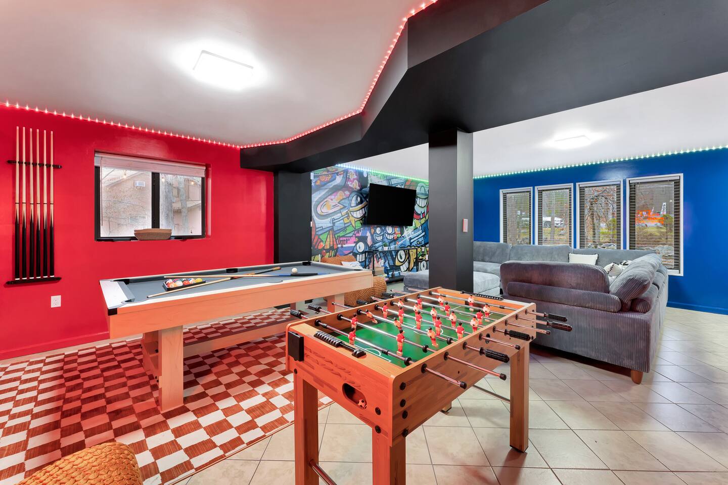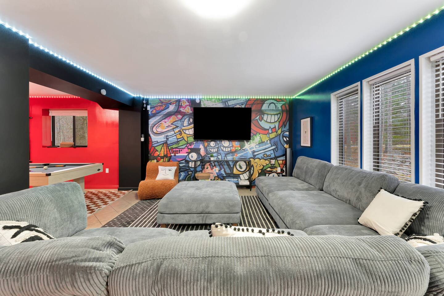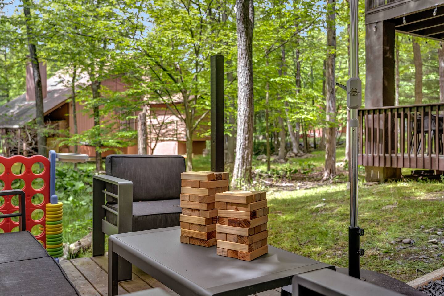 **During the summer months (Memorial Day weekend - Labor Day weekend), you will receive amenity badges that allow you to access the following amenities. If you’re staying with us outside of these dates, these amenities will be closed.** ☀ Lakes (with beach access - swimming allowed!) ☀ Pools ☀ Tennis courts ☀ Basketball courts ☀ Volleyball courts ☀ Dog park ☀ Playground areas KEY FEATURES: ☀ 5 beautiful bedrooms; 2 kings, 1 queen, 1 full, & 5 twin beds ☀ 3 modern, full bathrooms ☀ Modern kitchen with new, stainless steel appliances ☀ Open living room with lots of comfy seating & smart TV ☀ Dining room with seating to comfortably accommodate 12 (+ outdoor dining) ☀ Incredible game room with pool table, arcade games & more! ☀ Private & serene backyard, with a hot tub, fire pit, & more! Here Are A Few Kind Words From Our Past Guests: “This was a great place to stay! The morning light through the windows was so beautiful. Overall, just a relaxing experience. The hosts were super responsive whenever I had a question. I would stay again!” - Emily “Sabrina was very accommodating and communicative. the house is beautiful and very comfortable, close to nature hikes.” - Jennifer “This place was lovely! Exactly as pictured! Very clean and excellent host experience!!! I plan to come back again!” - Regina ☆☆ BEDROOMS ☆☆ Each of the 5 bedrooms in this home have been beautifully designed for comfort - every bedroom in this home has a 55" smart TV. On the bottom floor, one of the game rooms also doubles as a bedroom, with a twin-over-full bunk, smart TV, and an attached full bathroom. On the main floor, the second bedroom has a queen bed. On the third floor, the third & fourth bedrooms have one king bed in each. The fifth bedroom has two twin-over-twin bunk beds (4 twin beds total). ☆☆ BATHROOMS ☆☆ There are three full, modern bathrooms in this home - each with a sink, toilet, and walk-in shower only. The bathroom on the first floor is shared between the two game rooms. On the main floor, the bathroom is accessible right off of the bedroom, and also accessible from the hallway. The third bathroom on the top floor is accessible off the hallway, for all bedrooms on this floor to share. ☆☆ KITCHEN & DINING ☆☆ The modern kitchen is located right off of the main living areas, and is loaded with all new stainless steel appliances & a coffee station (including a Keurig & coffee pods). The dining room is right next to the kitchen, with enough seating to comfortably fit 12 people, plus outdoor dining options! ☆☆ LIVING ROOM ☆☆ In the living room, you’ll be greeted with lots of comfy seating & a big smart TV. This is the perfect spot to host your movie nights & games with your friends and family! ☆☆ GAME ROOMS ☆☆ Keep your family and friends entertained throughout your stay in our fun game rooms! Pool table, foosball, arcade games, basketball Pop-a-Short, comfy seating with a smart TV, and lots of board games & card games. Whether your reason for staying is to explore the town or stay at home and relax, this place will be the perfect spot to unwind! ☆☆ OUTDOOR SPACE ☆☆ This backyard is everything you could ask for, and more! ☀ Hot tub ☀ Fire pit ☀ Kids' play house with slide ☀ Corn hole ☀ Giant Connect 4 ☀ Giant Jenga ☀ BBQ grill ☀ Outdoor dining ☀ Outdoor lounge seating There is so much to do here, that all of your friends & family will be thoroughly entertained throughout your entire stay. No matter the season, this backyard has it all. Book your stay with us today and you will NOT be disappointed. Get ready for a vacation you will never forget! ★☆ Book Now & Let Us Take Care Of You In The Poconos! ☆★