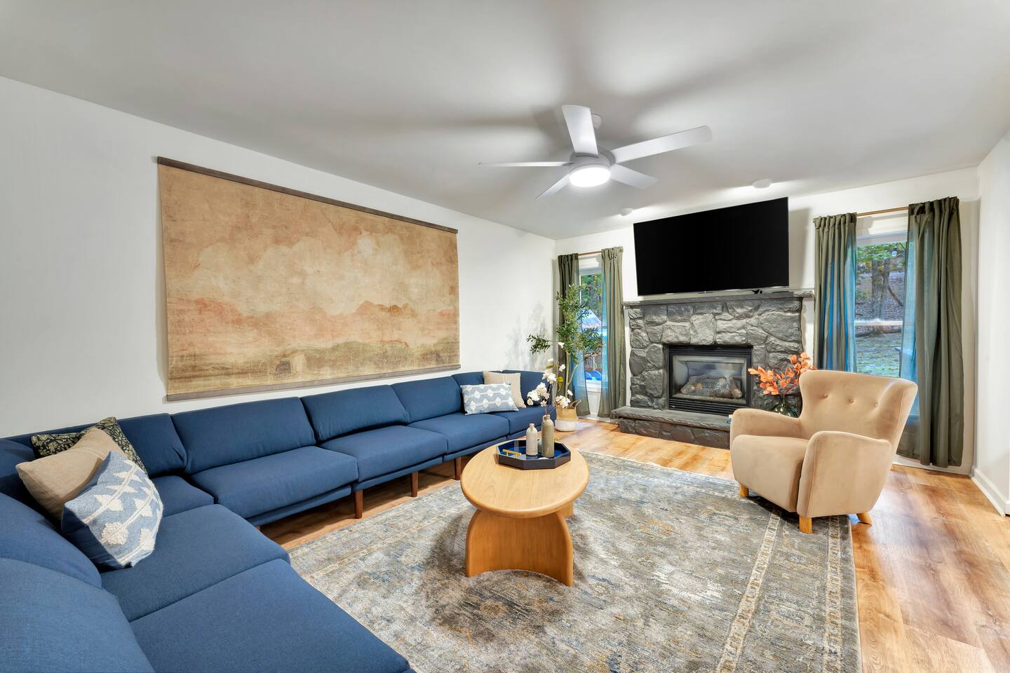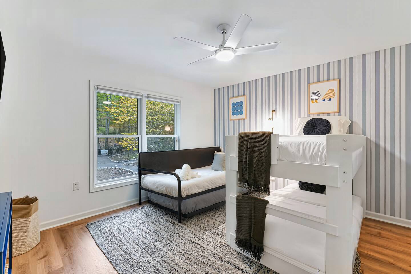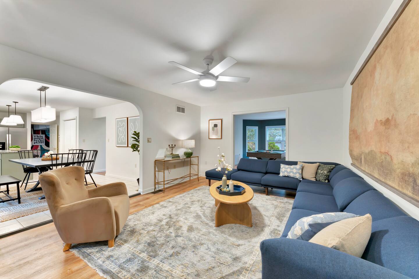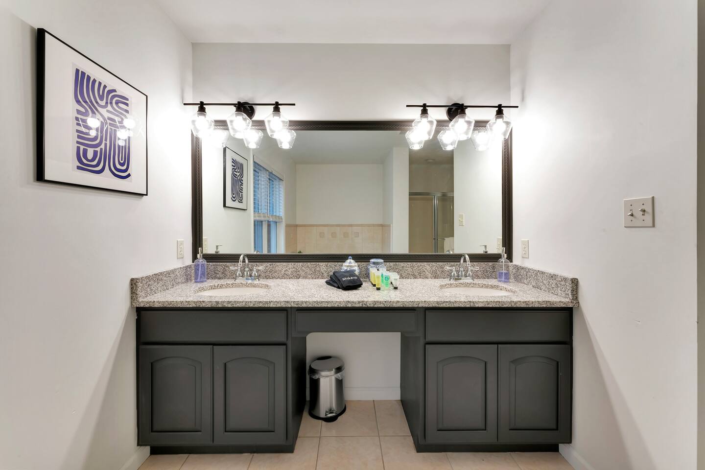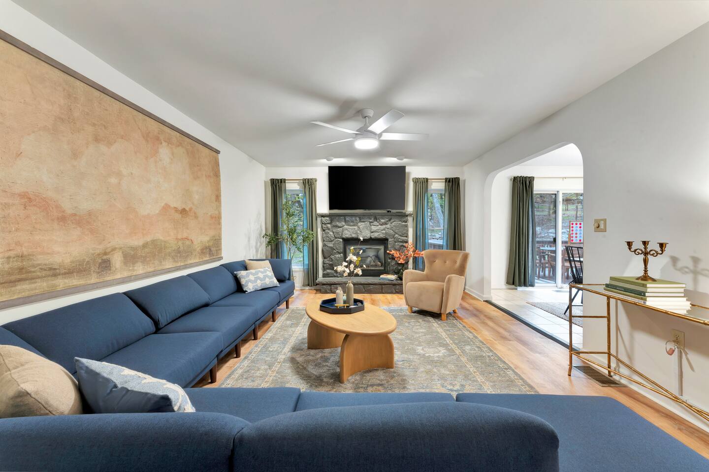 **During the summer months (Memorial Day weekend - Labor Day weekend), you will receive amenity badges that allow you to access the following amenities. If you’re staying with us outside of these dates, these amenities will be closed.** ☀ Lakes (with beach access - swimming allowed!) ☀ Pools ☀ Tennis courts ☀ Basketball courts ☀ Volleyball courts ☀ Dog park ☀ Playground areas KEY FEATURES: ☀ 5 beautiful bedrooms; 2 kings, 2 queens, & 4 twin beds ☀ 2.5 bathrooms ☀ Modern kitchen with new, stainless steel appliances ☀ Open living room with lots of comfy seating & smart TV ☀ Dining room with seating to comfortably accommodate 12 (+ breakfast nook seating & outdoor dining) ☀ Fun game room with foosball, ping pong, arcade games, pool table & more! ☀ Resort-style amenities in the private backyard; hot tub, mini golf, fire pit, jungle gym, & more! Here Are A Few Kind Words From Our Past Guests: “This was a great place to stay! The morning light through the windows was so beautiful. Overall, just a relaxing experience. The hosts were super responsive whenever I had a question. I would stay again!” - Emily “Sabrina was very accommodating and communicative. the house is beautiful and very comfortable, close to nature hikes.” - Jennifer “This place was lovely! Exactly as pictured! Very clean and excellent host experience!!! I plan to come back again!” - Regina ☆☆ BEDROOMS ☆☆ Each of the 5 bedrooms in this home have been masterfully designed for beauty & comfort, all of which are upstairs. Two bedrooms have one king bed & smart TV in each, the third & fourth bedrooms with one queen & smart TV in each, and the fifth bedroom has 4 twin beds (1 bunk beds and 1 twin over twin trundle). ☆☆ BATHROOMS ☆☆ There are two & a half bathrooms in this home. The first is on the lower level, with a sink & toilet only. The other two bathrooms are on the top level. One is a private ensuite bathroom to the master bedroom, with two sinks, toilet, walk-in shower, & soaking tub. The third bathroom has one sink, toilet, and walk-in shower only ☆☆ KITCHEN & DINING ☆☆ The modern kitchen is located right off of the main living areas, and is loaded with all new stainless steel appliances & a coffee station (including a Keurig & coffee pods). The dining room is right next to the kitchen, with enough seating to comfortably fit 12 people, plus a breakfast nook in the kitchen with seating for 6 more & outdoor dining options! ☆☆ LIVING ROOM ☆☆ In the living room, you’ll be greeted with lots of comfy seating & a big smart TV. This is the perfect spot to host your movie nights & games with your friends and family! ☆☆ GAME ROOMS ☆☆ Keep your family and friends entertained throughout your stay in our amenity-filled game rooms! Pool table, arcade games, foosball, ping pong, comfy seating with a smart TV, and lots of board games & card games. Whether your reason for staying is to explore the town or stay at home and relax, this place will be the perfect spot to unwind! ☆☆ MOVIE THEATER ☆☆ The basement has been transformed into a private movie theater, right at home! With a massive TV, lots of comfy theater-style seating, and a dark ambiance to set the mood, this is a great spot to hang out with your group that you won't be able to find anywhere else! ☆☆ OUTDOOR SPACE ☆☆ This backyard is everything you could ask for, and more! ☀ Hot tub ☀ Mini golf ☀ Fire pit ☀ Jungle gym ☀ Giant chess ☀ Giant Connect 4 ☀ Giant Jenga ☀ Outdoor dining ☀ Outdoor lounge seating There is so much to do here, that all of your friends & family will be thoroughly entertained throughout your entire stay. No matter the season, this backyard has it all. Book your stay with us today and you will NOT be disappointed. Get ready for a vacation you will never forget! ★☆ Book Now & Let Us Take Care Of You In The Poconos! ☆★