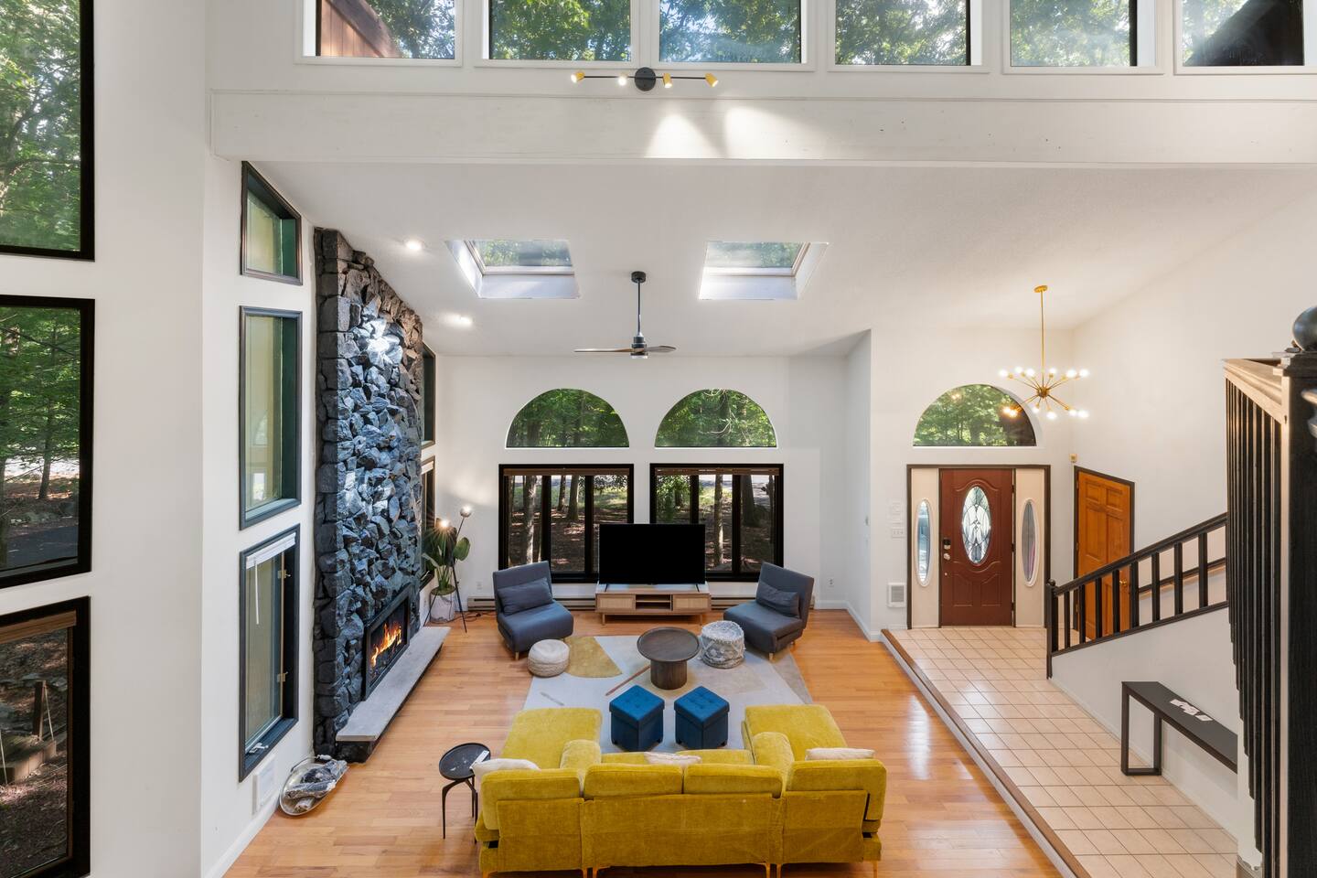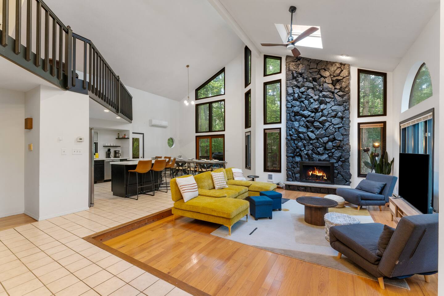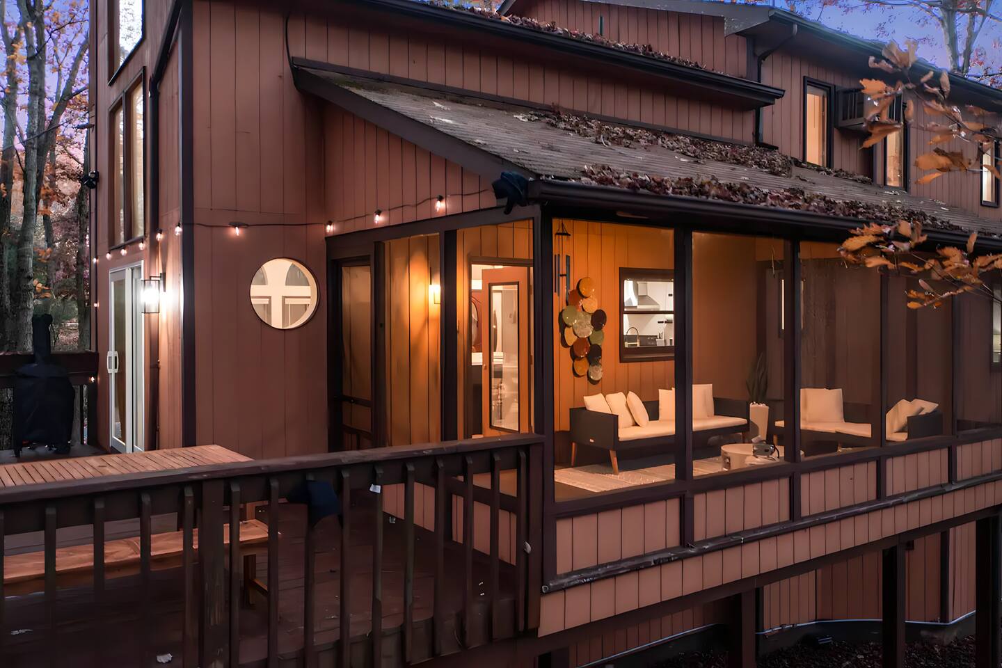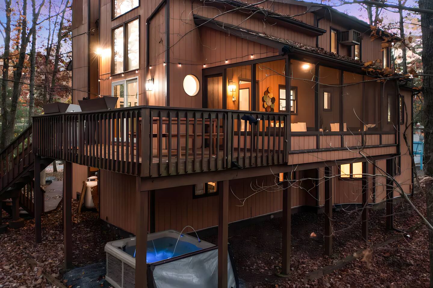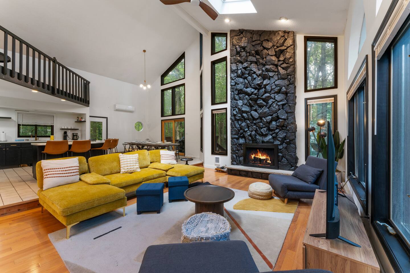 **During the summer months (Memorial Day weekend - Labor Day weekend), you will receive amenity badges that allow you to access the following amenities. If you’re staying with us outside of these dates, these amenities will be closed.** ☀ Lakes (with beach access - swimming allowed!) ☀ Pools ☀ Tennis courts ☀ Basketball courts ☀ Volleyball courts ☀ Dog park ☀ Playground areas KEY FEATURES: ☀ Five beautifully designed bedrooms (4 king beds, 2 full beds) ☀ Three full bathrooms, one on each floor! ☀ Completely renovated kitchen with brand new, modern appliances ☀ Grand living room that will blow you away! ☀ Open dining space with easy access to the patio & living areas ☀ Large back deck with outdoor seating, grill, and pizza oven ☀ Screened-in-porch with a fire pit and gorgeous views ☀ Private hot tub, secluded location below the back deck ☀ Two living rooms with lots of entertainment + poker table in the loft! Here Are A Few Kind Words From Our Past Guests: “This was a great place to stay! The morning light through the windows was so beautiful. Overall, just a relaxing experience. The hosts were super responsive whenever I had a question. I would stay again!” - Emily “Sabrina was very accommodating and communicative. the house is beautiful and very comfortable, close to nature hikes.” - Jennifer “This place was lovely! Exactly as pictured! Very clean and excellent host experience!!! I plan to come back again!” - Regina ☆☆ BEDROOMS ☆☆ Five spacious bedrooms, you have your choice on each floor! On the bottom level, there is one bedroom equipped with two full beds and next-door access to a full bathroom. Up on the main level, there are two bedrooms, one king bed in each. These two bedrooms share a full hallway bathroom with each other. On the third floor, there are two more bedrooms, also with one king bed in each. The third and final bathroom is also shared between these two rooms up on the top floor. ☆☆ BATHROOMS ☆☆ On every floor, you will always have direct access to a bathroom! Each bathroom has a similar layout of 1 sink, 1 toilet, and 1 shower/tub combo. ☆☆ KITCHEN & DINING ☆☆ As you walk in through the front door, you will be amazed by the grand entrance of this home, which opens right up into the kitchen/dining area. The kitchen has been completely remodeled and is now equipped with brand new modern appliances, a coffee station (including a Keurig and coffee pods), and tons of bar seating (up to 6). Right across from the kitchen is the dining area, surrounded by panoramic views of the Poconos woodlands and easy access to the screened-in-porch and back deck. This dining area is equipped with dining table which has seating up to 6, for a total of 12 accommodations in this kitchen/dining area. ☆☆ LIVING ROOMS ☆☆ WOW! This living room is one of the main attractions of this home. Beautiful, modern design with huge, lofty ceilings, walls of windows, and skylights. How could you ever want to leave? Included in this main living room is a wood-burning fireplace (wood not provided, but feel free to bring your own!) & a smart TV with lots of comfy seating surrounding it. Downstairs on the lower level, you will have access to a second living room. This room also has a smart TV, as well as a pool table, wet bar, and lots of seating. Of course, there is also a wall of windows where you can sit back and enjoy the Poconos nature from the comfort inside the walls of this beautiful home! ☆☆ OUTDOOR SPACE ☆☆ What kind of trip to the Poconos would it be if you didn't have access to wonderful outdoor amenities! We provide them all! In the screened in porch, you can cozy up on the couch next to the fire pit. Right outside of the porch, you have access to a large, private deck with outdoor dining options at the picnic table, grill, and pizza oven. Even at night you can enjoy this space, as the deck is surrounded by string lights to keep this are well-lit at any time of day! Right below the deck is the private hot tub. What a perfect location! Set away from the rest of the home, you can sit back and relax with complete privacy and never-ending views of the Poconos forest. A truly remarkable vacation destination! ★☆ Book Now & Let Us Take Care Of You In The Poconos! ☆★