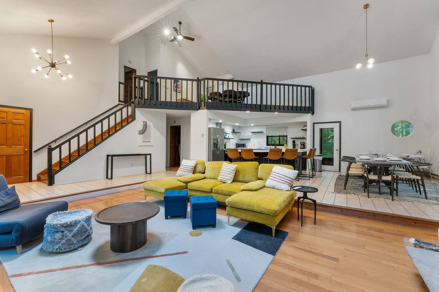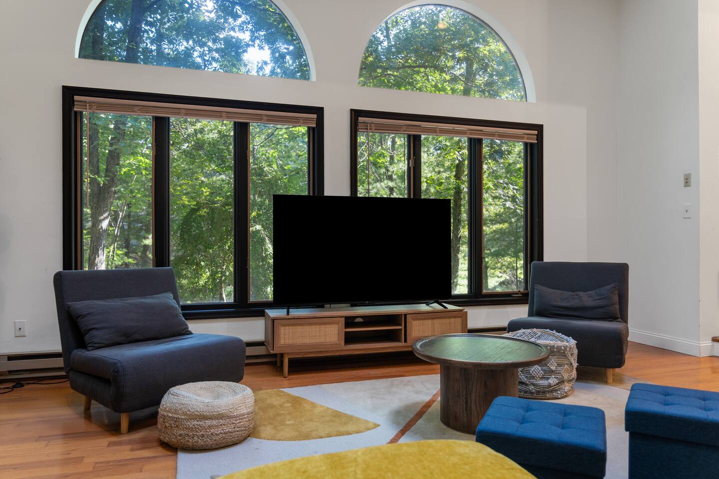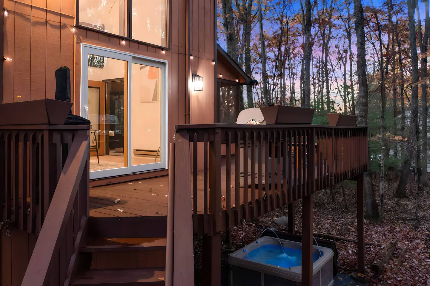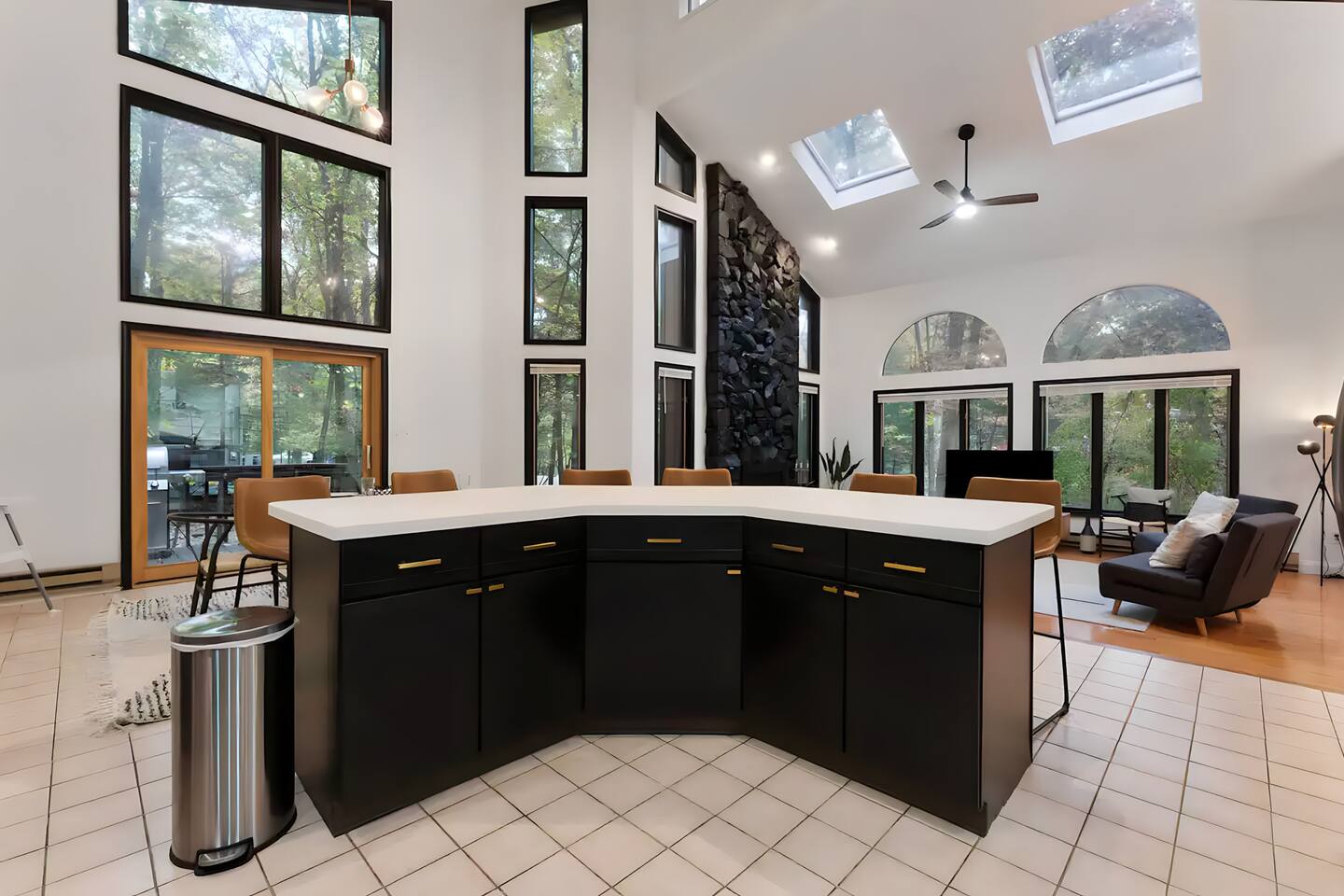 **During the summer months (Memorial Day weekend - Labor Day weekend), you will receive amenity badges that allow you to access the following amenities. If you’re staying with us outside of these dates, these amenities will be closed.** ☀ Lakes (with beach access - swimming allowed!) ☀ Pools ☀ Tennis courts ☀ Basketball courts ☀ Volleyball courts ☀ Dog park ☀ Playground areas KEY FEATURES: ☀ Five beautifully designed bedrooms (4 king beds, 2 full beds) ☀ Three full bathrooms, one on each floor! ☀ Completely renovated kitchen with brand new, modern appliances ☀ Grand living room that will blow you away! ☀ Open dining space with easy access to the patio & living areas ☀ Large back deck with outdoor seating, grill, and pizza oven ☀ Screened-in-porch with a fire pit and gorgeous views ☀ Private hot tub, secluded location below the back deck ☀ Two living rooms with lots of entertainment + poker table in the loft! Here Are A Few Kind Words From Our Past Guests: “This was a great place to stay! The morning light through the windows was so beautiful. Overall, just a relaxing experience. The hosts were super responsive whenever I had a question. I would stay again!” - Emily “Sabrina was very accommodating and communicative. the house is beautiful and very comfortable, close to nature hikes.” - Jennifer “This place was lovely! Exactly as pictured! Very clean and excellent host experience!!! I plan to come back again!” - Regina ☆☆ BEDROOMS ☆☆ Five spacious bedrooms, you have your choice on each floor! On the bottom level, there is one bedroom equipped with two full beds and next-door access to a full bathroom. Up on the main level, there are two bedrooms, one king bed in each. These two bedrooms share a full hallway bathroom with each other. On the third floor, there are two more bedrooms, also with one king bed in each. The third and final bathroom is also shared between these two rooms up on the top floor. ☆☆ BATHROOMS ☆☆ On every floor, you will always have direct access to a bathroom! Each bathroom has a similar layout of 1 sink, 1 toilet, and 1 shower/tub combo. ☆☆ KITCHEN & DINING ☆☆ As you walk in through the front door, you will be amazed by the grand entrance of this home, which opens right up into the kitchen/dining area. The kitchen has been completely remodeled and is now equipped with brand new modern appliances, a coffee station (including a Keurig and coffee pods), and tons of bar seating (up to 6). Right across from the kitchen is the dining area, surrounded by panoramic views of the Poconos woodlands and easy access to the screened-in-porch and back deck. This dining area is equipped with dining table which has seating up to 6, for a total of 12 accommodations in this kitchen/dining area. ☆☆ LIVING ROOMS ☆☆ WOW! This living room is one of the main attractions of this home. Beautiful, modern design with huge, lofty ceilings, walls of windows, and skylights. How could you ever want to leave? Included in this main living room is a wood-burning fireplace (wood not provided, but feel free to bring your own!) & a smart TV with lots of comfy seating surrounding it. Downstairs on the lower level, you will have access to a second living room. This room also has a smart TV, as well as a pool table, wet bar, and lots of seating. Of course, there is also a wall of windows where you can sit back and enjoy the Poconos nature from the comfort inside the walls of this beautiful home! ☆☆ OUTDOOR SPACE ☆☆ What kind of trip to the Poconos would it be if you didn't have access to wonderful outdoor amenities! We provide them all! In the screened in porch, you can cozy up on the couch next to the fire pit. Right outside of the porch, you have access to a large, private deck with outdoor dining options at the picnic table, grill, and pizza oven. Even at night you can enjoy this space, as the deck is surrounded by string lights to keep this are well-lit at any time of day! Right below the deck is the private hot tub. What a perfect location! Set away from the rest of the home, you can sit back and relax with complete privacy and never-ending views of the Poconos forest. A truly remarkable vacation destination! ★☆ Book Now & Let Us Take Care Of You In The Poconos! ☆★