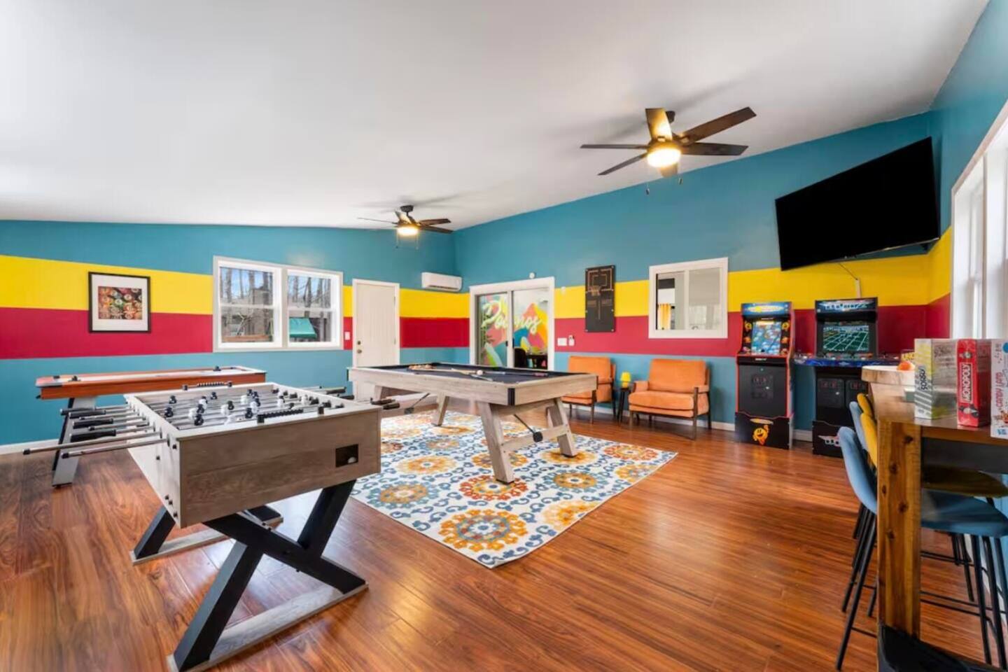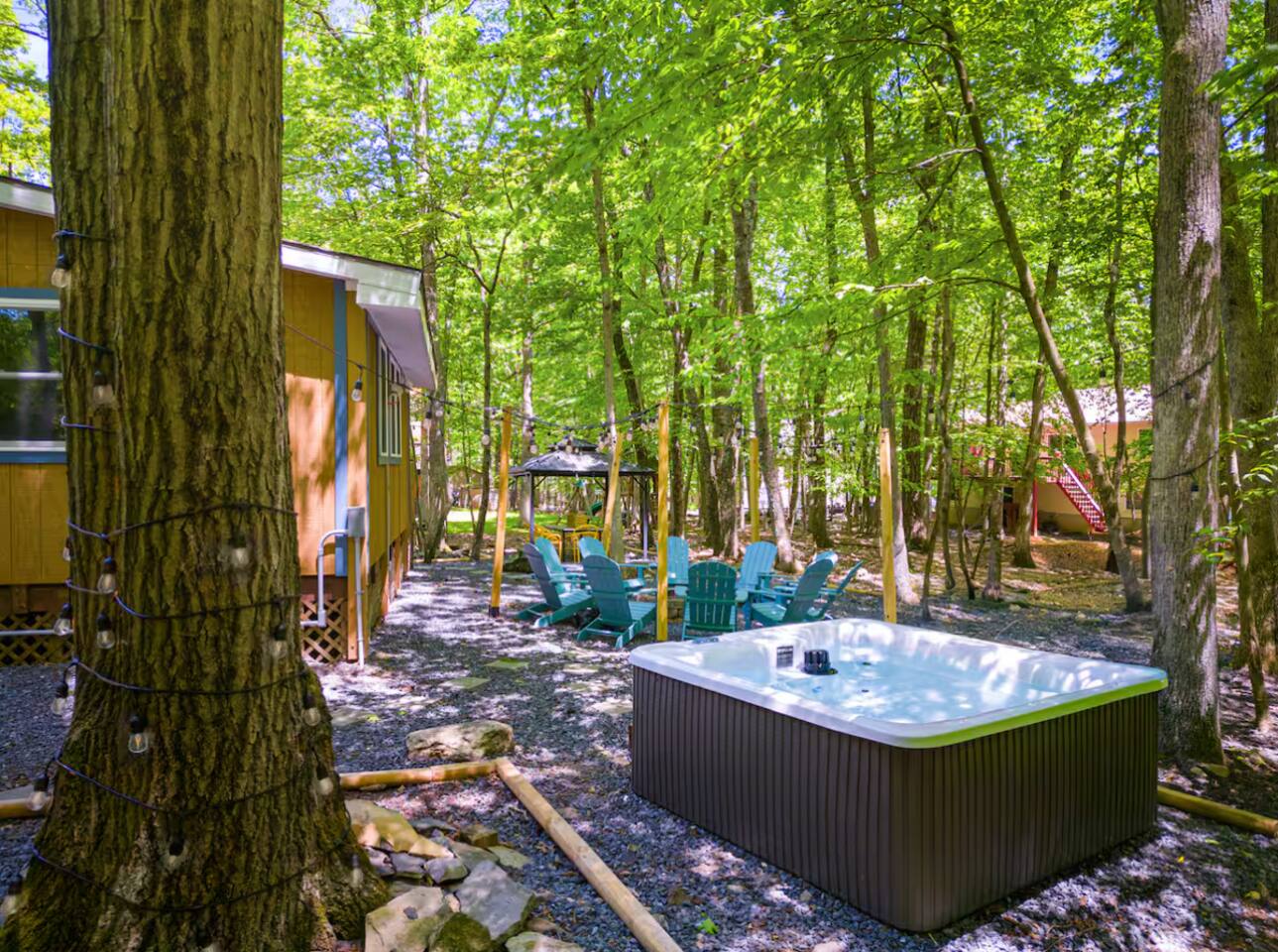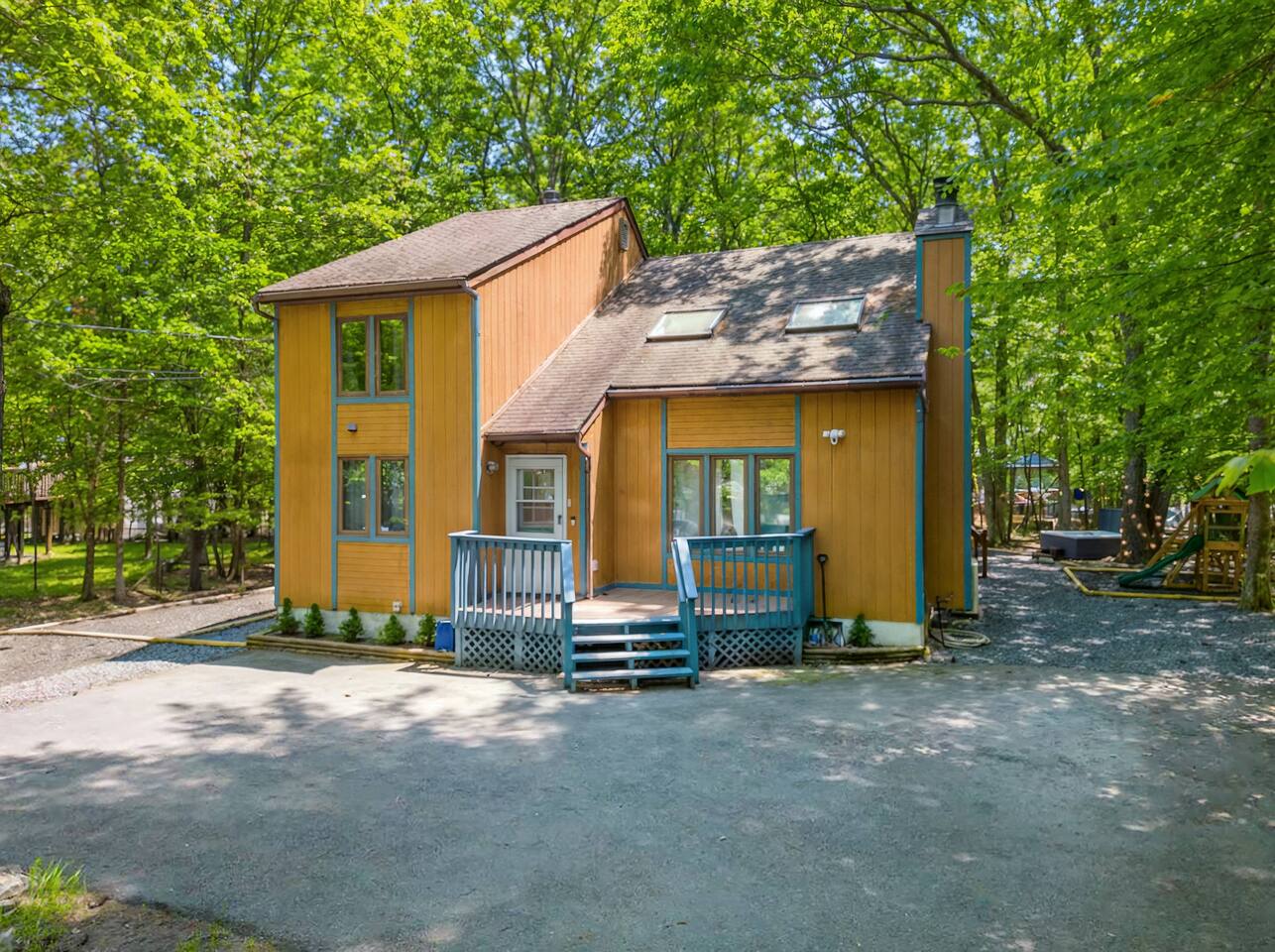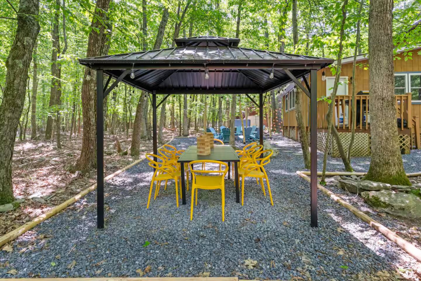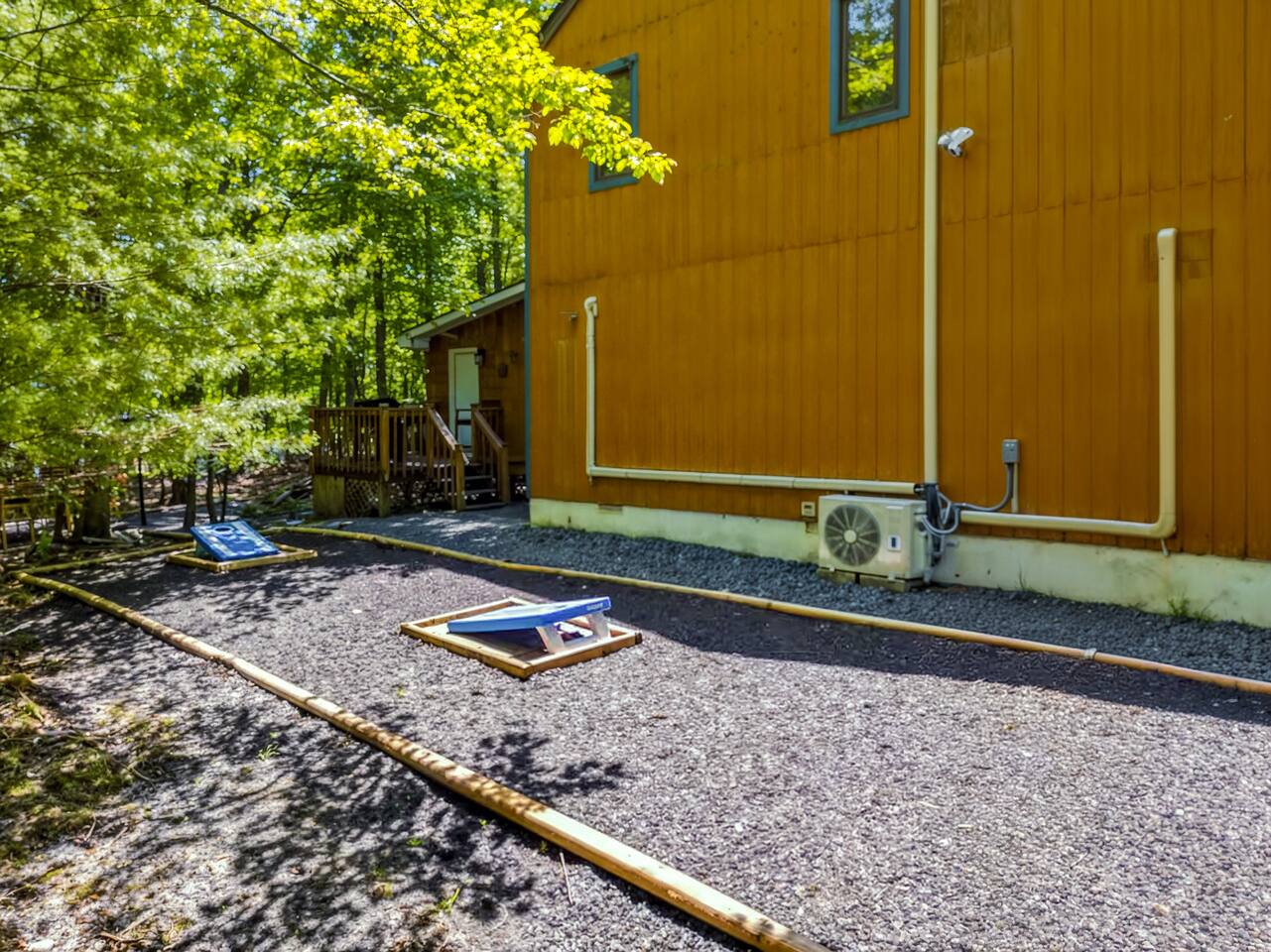 **During the summer months (Memorial Day weekend - Labor Day weekend), you will receive amenity badges that allow you to access the following amenities. If you’re staying with us outside of these dates, these amenities will be closed.** ☀ Lakes (with beach access - swimming allowed!) ☀ Pools ☀ Tennis courts ☀ Basketball courts ☀ Volleyball courts ☀ Dog park ☀ Playground areas KEY FEATURES: ☀ 4 beautiful bedrooms; 1 king, 2 queens, & 2 full beds ☀ 2 modern, full bathrooms ☀ Modern kitchen with stainless steel appliances ☀ Open living room with lots of comfy seating & smart TV ☀ Dining room with seating to comfortably accommodate 10 (+ outdoor dining) ☀ Incredible game room with pool table, air hockey, foosball, arcade games, & more! ☀ Serene backyard, with a hot tub, fire pit, jungle gym & more! Here Are A Few Kind Words From Our Past Guests: “This was a great place to stay! The morning light through the windows was so beautiful. Overall, just a relaxing experience. The hosts were super responsive whenever I had a question. I would stay again!” - Emily “Sabrina was very accommodating and communicative. the house is beautiful and very comfortable, close to nature hikes.” - Jennifer “This place was lovely! Exactly as pictured! Very clean and excellent host experience!!! I plan to come back again!” - Regina ☆☆ BEDROOMS ☆☆ Each of the 4 bedrooms in this home have been beautifully designed for comfort - every bedroom in this home has a 65" smart TV. On the bottom floor, Each bedroom has 1 queen bed + smart TV. Upstairs, the master bedroom has a king bed, smart TV, & private ensuite bathroom. Also upstairs, the 4th bedroom is super FUN, including a bunk bed (full-over-full) with a slide & smart TV! ☆☆ BATHROOMS ☆☆ There are two full, modern bathrooms in this home - each with a sink, toilet, and shower/tub combo. The bathroom on the first floor is shared between the two downstairs bedrooms. On the top floor, the second bathroom is a private ensuite bathroom to the master bedroom. ☆☆ KITCHEN & DINING ☆☆ The modern kitchen is located right off of the main living areas, and is loaded with all new stainless steel appliances & a coffee station (including a Keurig & coffee pods). The dining room is right next to the kitchen, with enough seating to comfortably fit 10 people, plus outdoor dining options! ☆☆ LIVING ROOM ☆☆ In the living room, you’ll be greeted with lots of comfy seating, a big smart TV, and an INCREDIBLE Poconos-themed mural. This is the perfect spot to host your movie nights & games with your friends and family! ☆☆ GAME ROOMS ☆☆ Keep your family and friends entertained throughout your stay in our fun game rooms! Pool table, foosball, air hockey, arcade games, and comfy seating with a smart TV. Whether your reason for staying is to explore the town or stay at home and relax, this place will be the perfect spot to unwind! ☆☆ OUTDOOR SPACE ☆☆ This backyard is everything you could ask for, and more! ☀ Hot tub ☀ Fire pit ☀ Kids' play house with slide ☀ Corn hole ☀ Giant Jenga ☀ BBQ grill ☀ Outdoor dining There is so much to do here, that all of your friends & family will be thoroughly entertained throughout your entire stay. No matter the season, this backyard has it all. Book your stay with us today and you will NOT be disappointed. Get ready for a vacation you will never forget! ★☆ Book Now & Let Us Take Care Of You In The Poconos! ☆★