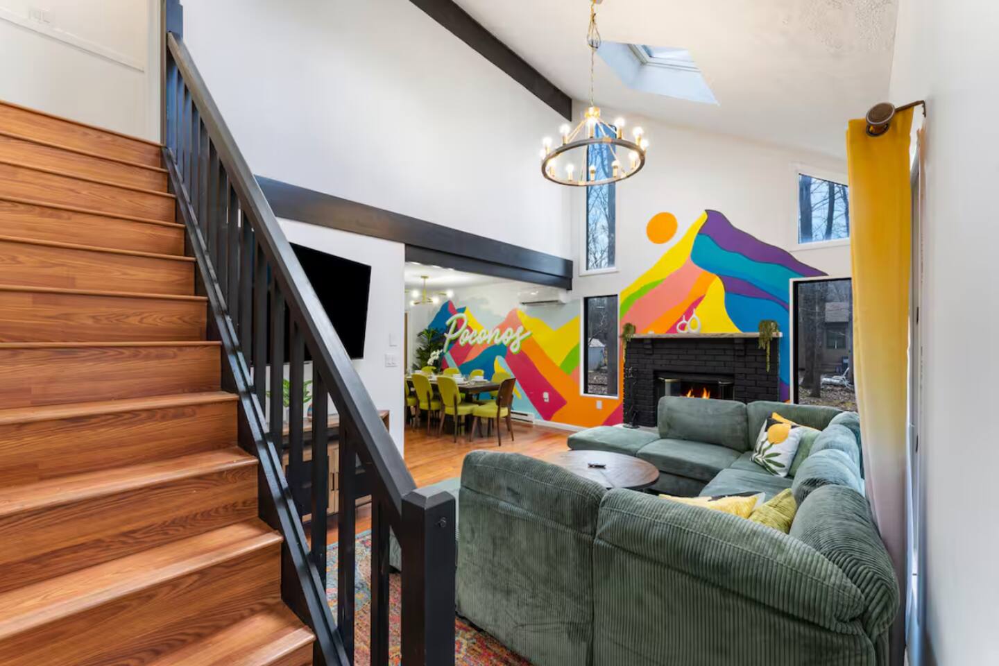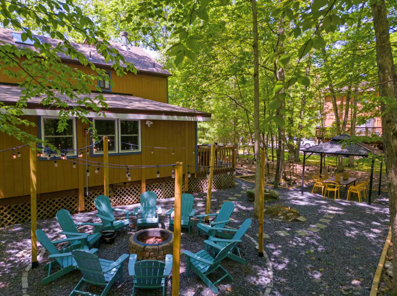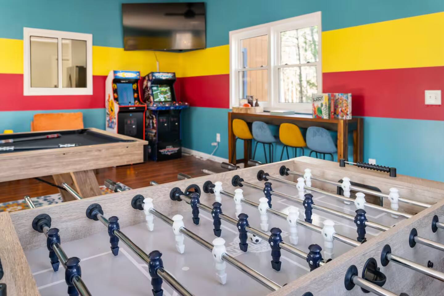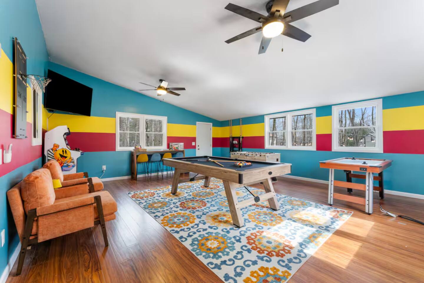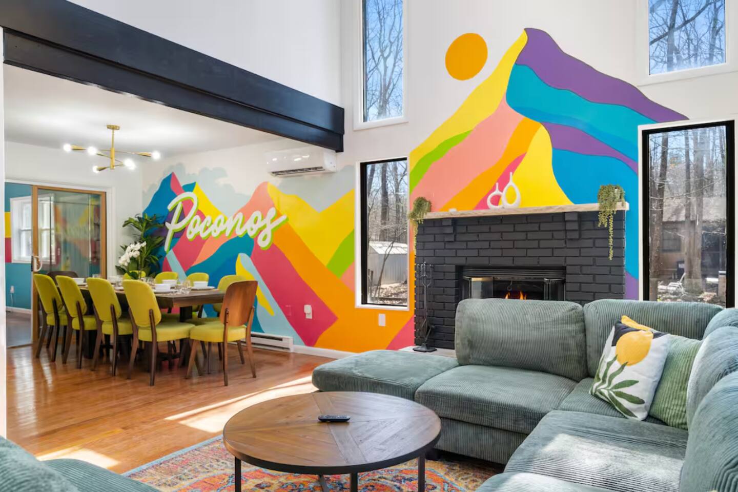 **During the summer months (Memorial Day weekend - Labor Day weekend), you will receive amenity badges that allow you to access the following amenities. If you’re staying with us outside of these dates, these amenities will be closed.** ☀ Lakes (with beach access - swimming allowed!) ☀ Pools ☀ Tennis courts ☀ Basketball courts ☀ Volleyball courts ☀ Dog park ☀ Playground areas KEY FEATURES: ☀ 4 beautiful bedrooms; 1 king, 2 queens, & 2 full beds ☀ 2 modern, full bathrooms ☀ Modern kitchen with stainless steel appliances ☀ Open living room with lots of comfy seating & smart TV ☀ Dining room with seating to comfortably accommodate 10 (+ outdoor dining) ☀ Incredible game room with pool table, air hockey, foosball, arcade games, & more! ☀ Serene backyard, with a hot tub, fire pit, jungle gym & more! Here Are A Few Kind Words From Our Past Guests: “This was a great place to stay! The morning light through the windows was so beautiful. Overall, just a relaxing experience. The hosts were super responsive whenever I had a question. I would stay again!” - Emily “Sabrina was very accommodating and communicative. the house is beautiful and very comfortable, close to nature hikes.” - Jennifer “This place was lovely! Exactly as pictured! Very clean and excellent host experience!!! I plan to come back again!” - Regina ☆☆ BEDROOMS ☆☆ Each of the 4 bedrooms in this home have been beautifully designed for comfort - every bedroom in this home has a 65" smart TV. On the bottom floor, Each bedroom has 1 queen bed + smart TV. Upstairs, the master bedroom has a king bed, smart TV, & private ensuite bathroom. Also upstairs, the 4th bedroom is super FUN, including a bunk bed (full-over-full) with a slide & smart TV! ☆☆ BATHROOMS ☆☆ There are two full, modern bathrooms in this home - each with a sink, toilet, and shower/tub combo. The bathroom on the first floor is shared between the two downstairs bedrooms. On the top floor, the second bathroom is a private ensuite bathroom to the master bedroom. ☆☆ KITCHEN & DINING ☆☆ The modern kitchen is located right off of the main living areas, and is loaded with all new stainless steel appliances & a coffee station (including a Keurig & coffee pods). The dining room is right next to the kitchen, with enough seating to comfortably fit 10 people, plus outdoor dining options! ☆☆ LIVING ROOM ☆☆ In the living room, you’ll be greeted with lots of comfy seating, a big smart TV, and an INCREDIBLE Poconos-themed mural. This is the perfect spot to host your movie nights & games with your friends and family! ☆☆ GAME ROOMS ☆☆ Keep your family and friends entertained throughout your stay in our fun game rooms! Pool table, foosball, air hockey, arcade games, and comfy seating with a smart TV. Whether your reason for staying is to explore the town or stay at home and relax, this place will be the perfect spot to unwind! ☆☆ OUTDOOR SPACE ☆☆ This backyard is everything you could ask for, and more! ☀ Hot tub ☀ Fire pit ☀ Kids' play house with slide ☀ Corn hole ☀ Giant Jenga ☀ BBQ grill ☀ Outdoor dining There is so much to do here, that all of your friends & family will be thoroughly entertained throughout your entire stay. No matter the season, this backyard has it all. Book your stay with us today and you will NOT be disappointed. Get ready for a vacation you will never forget! ★☆ Book Now & Let Us Take Care Of You In The Poconos! ☆★
