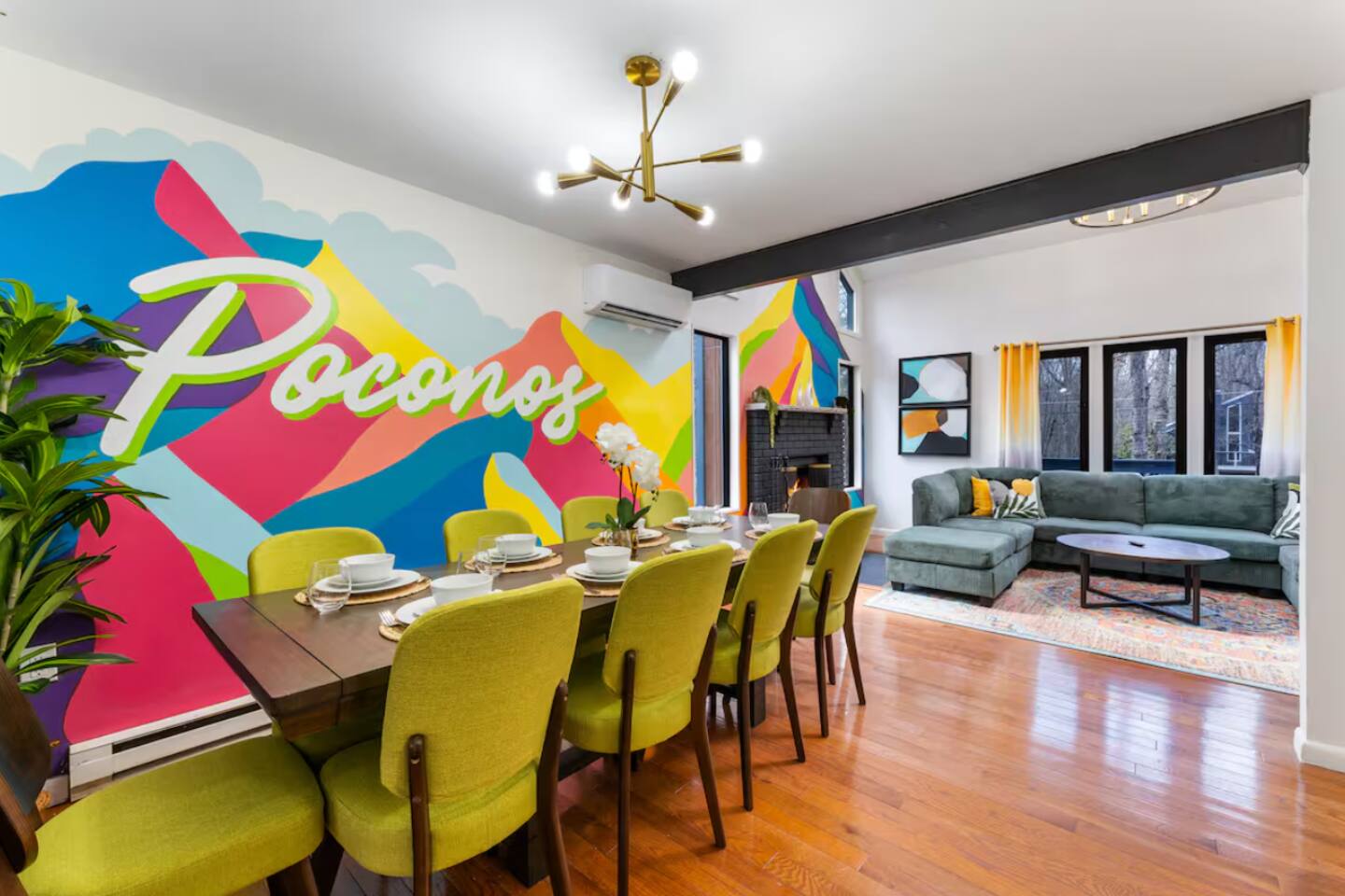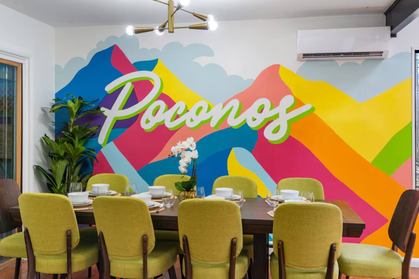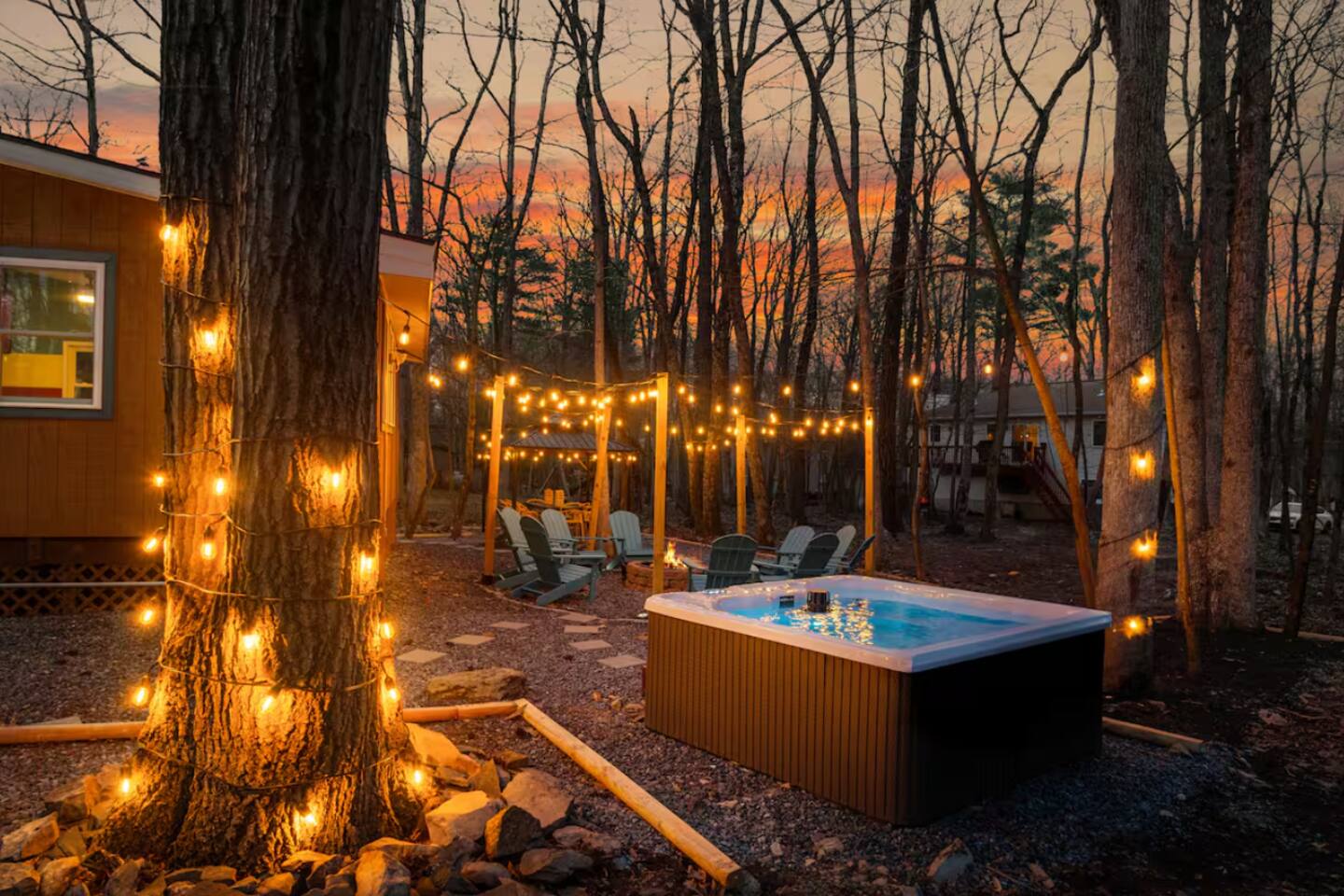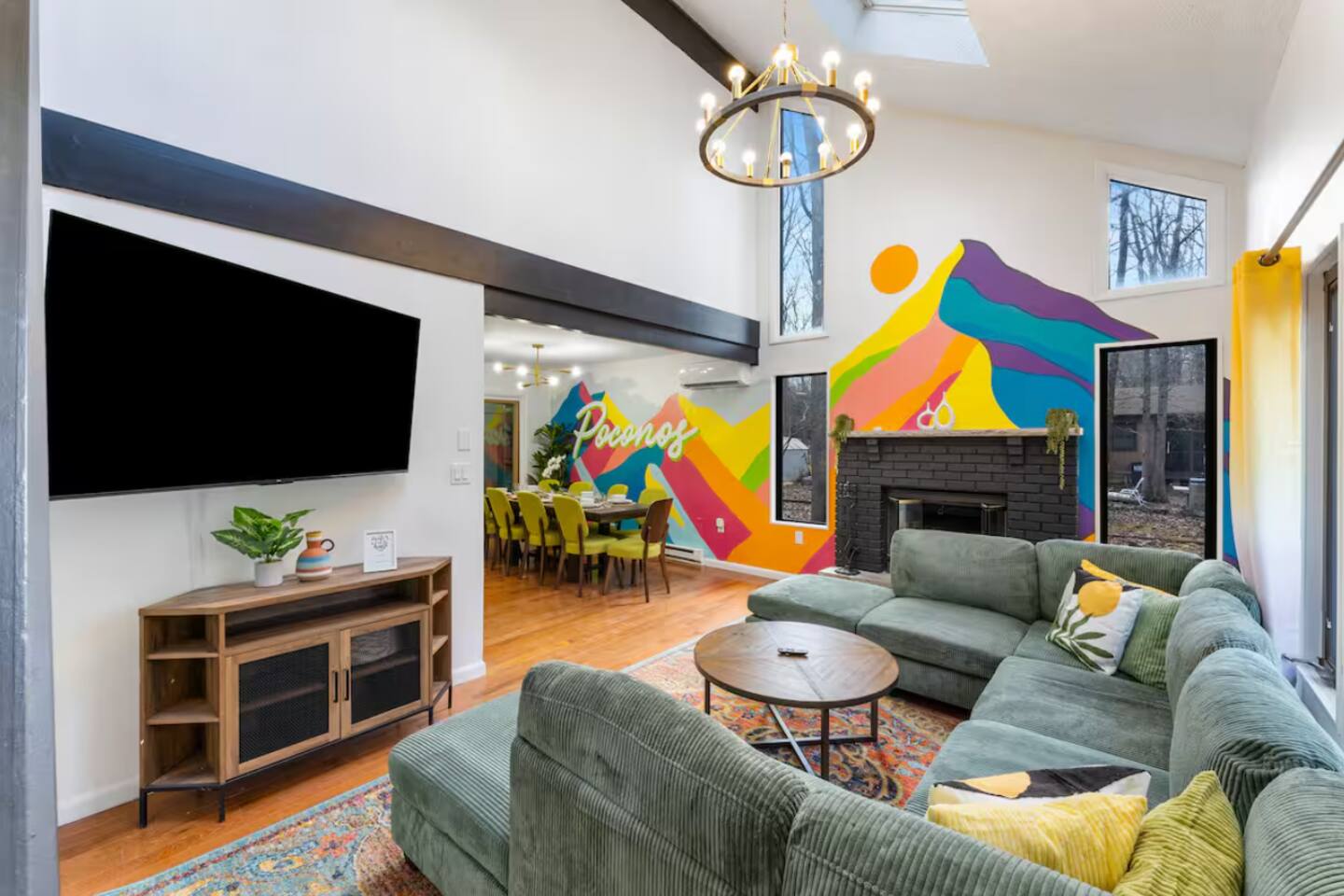 **During the summer months (Memorial Day weekend - Labor Day weekend), you will receive amenity badges that allow you to access the following amenities. If you’re staying with us outside of these dates, these amenities will be closed.** ☀ Lakes (with beach access - swimming allowed!) ☀ Pools ☀ Tennis courts ☀ Basketball courts ☀ Volleyball courts ☀ Dog park ☀ Playground areas KEY FEATURES: ☀ 4 beautiful bedrooms; 1 king, 2 queens, & 2 full beds ☀ 2 modern, full bathrooms ☀ Modern kitchen with stainless steel appliances ☀ Open living room with lots of comfy seating & smart TV ☀ Dining room with seating to comfortably accommodate 10 (+ outdoor dining) ☀ Incredible game room with pool table, air hockey, foosball, arcade games, & more! ☀ Serene backyard, with a hot tub, fire pit, jungle gym & more! Here Are A Few Kind Words From Our Past Guests: “This was a great place to stay! The morning light through the windows was so beautiful. Overall, just a relaxing experience. The hosts were super responsive whenever I had a question. I would stay again!” - Emily “Sabrina was very accommodating and communicative. the house is beautiful and very comfortable, close to nature hikes.” - Jennifer “This place was lovely! Exactly as pictured! Very clean and excellent host experience!!! I plan to come back again!” - Regina ☆☆ BEDROOMS ☆☆ Each of the 4 bedrooms in this home have been beautifully designed for comfort - every bedroom in this home has a 65" smart TV. On the bottom floor, Each bedroom has 1 queen bed + smart TV. Upstairs, the master bedroom has a king bed, smart TV, & private ensuite bathroom. Also upstairs, the 4th bedroom is super FUN, including a bunk bed (full-over-full) with a slide & smart TV! ☆☆ BATHROOMS ☆☆ There are two full, modern bathrooms in this home - each with a sink, toilet, and shower/tub combo. The bathroom on the first floor is shared between the two downstairs bedrooms. On the top floor, the second bathroom is a private ensuite bathroom to the master bedroom. ☆☆ KITCHEN & DINING ☆☆ The modern kitchen is located right off of the main living areas, and is loaded with all new stainless steel appliances & a coffee station (including a Keurig & coffee pods). The dining room is right next to the kitchen, with enough seating to comfortably fit 10 people, plus outdoor dining options! ☆☆ LIVING ROOM ☆☆ In the living room, you’ll be greeted with lots of comfy seating, a big smart TV, and an INCREDIBLE Poconos-themed mural. This is the perfect spot to host your movie nights & games with your friends and family! ☆☆ GAME ROOMS ☆☆ Keep your family and friends entertained throughout your stay in our fun game rooms! Pool table, foosball, air hockey, arcade games, and comfy seating with a smart TV. Whether your reason for staying is to explore the town or stay at home and relax, this place will be the perfect spot to unwind! ☆☆ OUTDOOR SPACE ☆☆ This backyard is everything you could ask for, and more! ☀ Hot tub ☀ Fire pit ☀ Kids' play house with slide ☀ Corn hole ☀ Giant Jenga ☀ BBQ grill ☀ Outdoor dining There is so much to do here, that all of your friends & family will be thoroughly entertained throughout your entire stay. No matter the season, this backyard has it all. Book your stay with us today and you will NOT be disappointed. Get ready for a vacation you will never forget! ★☆ Book Now & Let Us Take Care Of You In The Poconos! ☆★