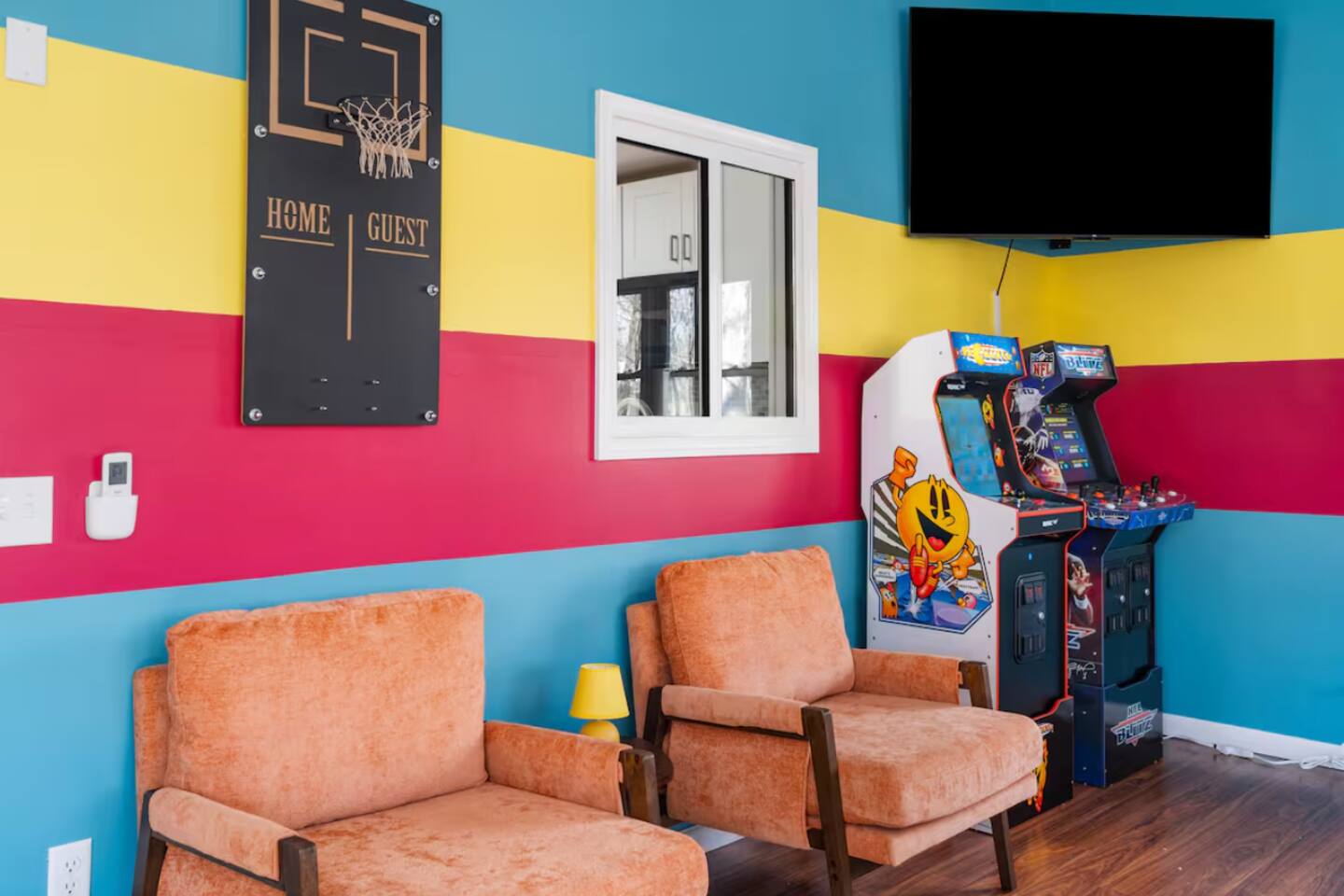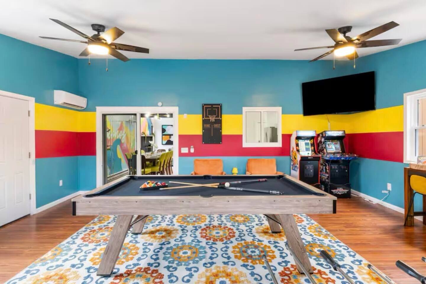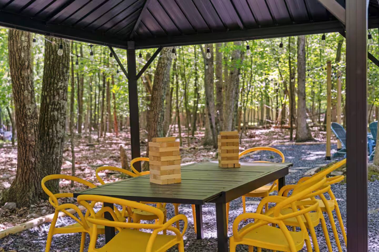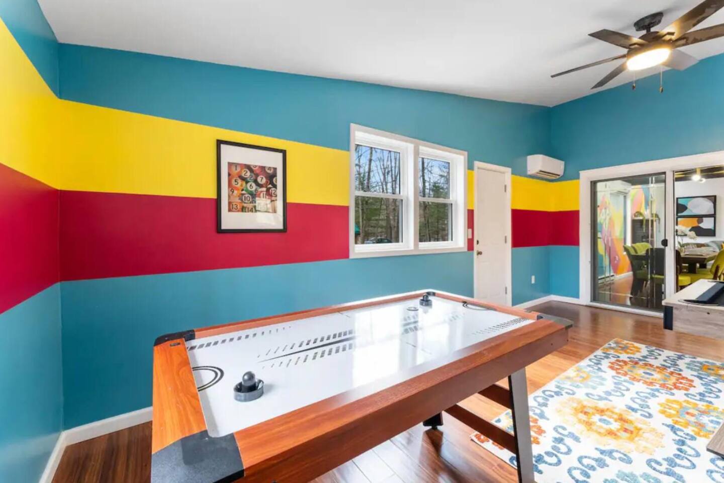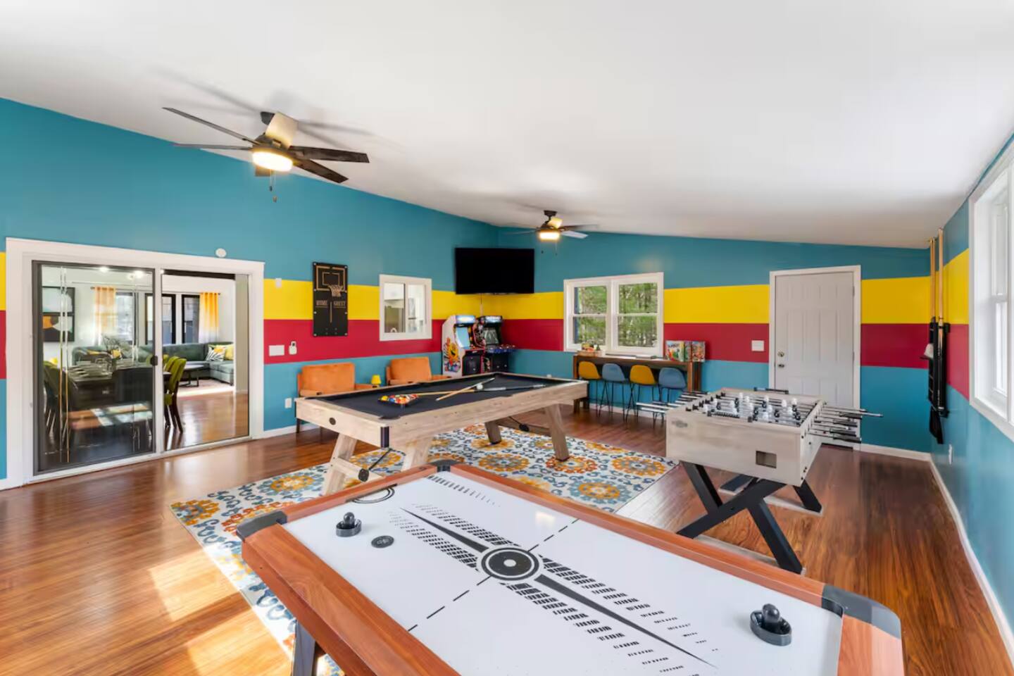 **During the summer months (Memorial Day weekend - Labor Day weekend), you will receive amenity badges that allow you to access the following amenities. If you’re staying with us outside of these dates, these amenities will be closed.** ☀ Lakes (with beach access - swimming allowed!) ☀ Pools ☀ Tennis courts ☀ Basketball courts ☀ Volleyball courts ☀ Dog park ☀ Playground areas KEY FEATURES: ☀ 4 beautiful bedrooms; 1 king, 2 queens, & 2 full beds ☀ 2 modern, full bathrooms ☀ Modern kitchen with stainless steel appliances ☀ Open living room with lots of comfy seating & smart TV ☀ Dining room with seating to comfortably accommodate 10 (+ outdoor dining) ☀ Incredible game room with pool table, air hockey, foosball, arcade games, & more! ☀ Serene backyard, with a hot tub, fire pit, jungle gym & more! Here Are A Few Kind Words From Our Past Guests: “This was a great place to stay! The morning light through the windows was so beautiful. Overall, just a relaxing experience. The hosts were super responsive whenever I had a question. I would stay again!” - Emily “Sabrina was very accommodating and communicative. the house is beautiful and very comfortable, close to nature hikes.” - Jennifer “This place was lovely! Exactly as pictured! Very clean and excellent host experience!!! I plan to come back again!” - Regina ☆☆ BEDROOMS ☆☆ Each of the 4 bedrooms in this home have been beautifully designed for comfort - every bedroom in this home has a 65" smart TV. On the bottom floor, Each bedroom has 1 queen bed + smart TV. Upstairs, the master bedroom has a king bed, smart TV, & private ensuite bathroom. Also upstairs, the 4th bedroom is super FUN, including a bunk bed (full-over-full) with a slide & smart TV! ☆☆ BATHROOMS ☆☆ There are two full, modern bathrooms in this home - each with a sink, toilet, and shower/tub combo. The bathroom on the first floor is shared between the two downstairs bedrooms. On the top floor, the second bathroom is a private ensuite bathroom to the master bedroom. ☆☆ KITCHEN & DINING ☆☆ The modern kitchen is located right off of the main living areas, and is loaded with all new stainless steel appliances & a coffee station (including a Keurig & coffee pods). The dining room is right next to the kitchen, with enough seating to comfortably fit 10 people, plus outdoor dining options! ☆☆ LIVING ROOM ☆☆ In the living room, you’ll be greeted with lots of comfy seating, a big smart TV, and an INCREDIBLE Poconos-themed mural. This is the perfect spot to host your movie nights & games with your friends and family! ☆☆ GAME ROOMS ☆☆ Keep your family and friends entertained throughout your stay in our fun game rooms! Pool table, foosball, air hockey, arcade games, and comfy seating with a smart TV. Whether your reason for staying is to explore the town or stay at home and relax, this place will be the perfect spot to unwind! ☆☆ OUTDOOR SPACE ☆☆ This backyard is everything you could ask for, and more! ☀ Hot tub ☀ Fire pit ☀ Kids' play house with slide ☀ Corn hole ☀ Giant Jenga ☀ BBQ grill ☀ Outdoor dining There is so much to do here, that all of your friends & family will be thoroughly entertained throughout your entire stay. No matter the season, this backyard has it all. Book your stay with us today and you will NOT be disappointed. Get ready for a vacation you will never forget! ★☆ Book Now & Let Us Take Care Of You In The Poconos! ☆★