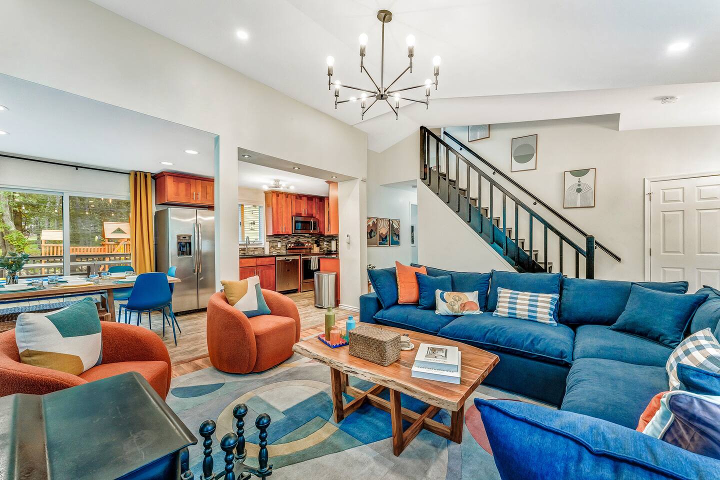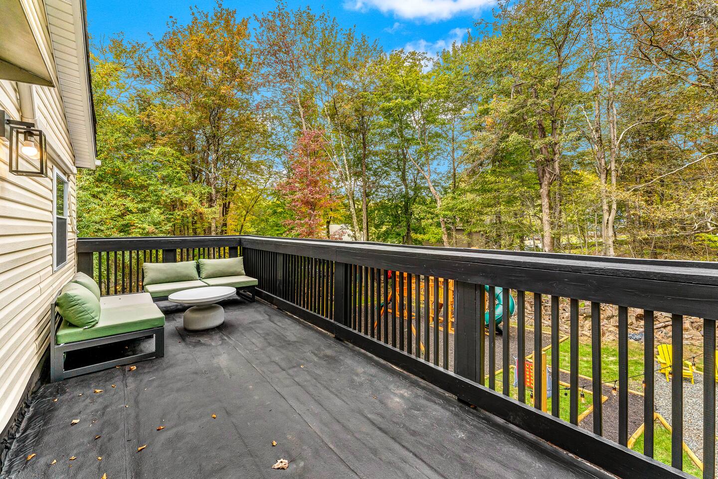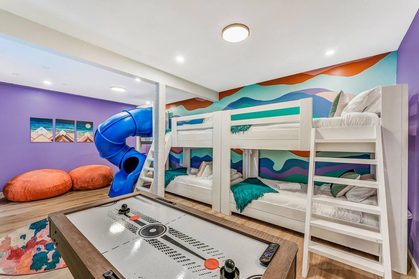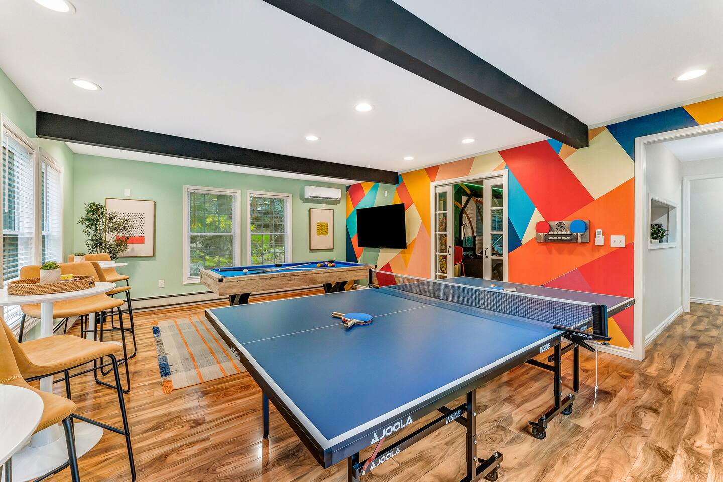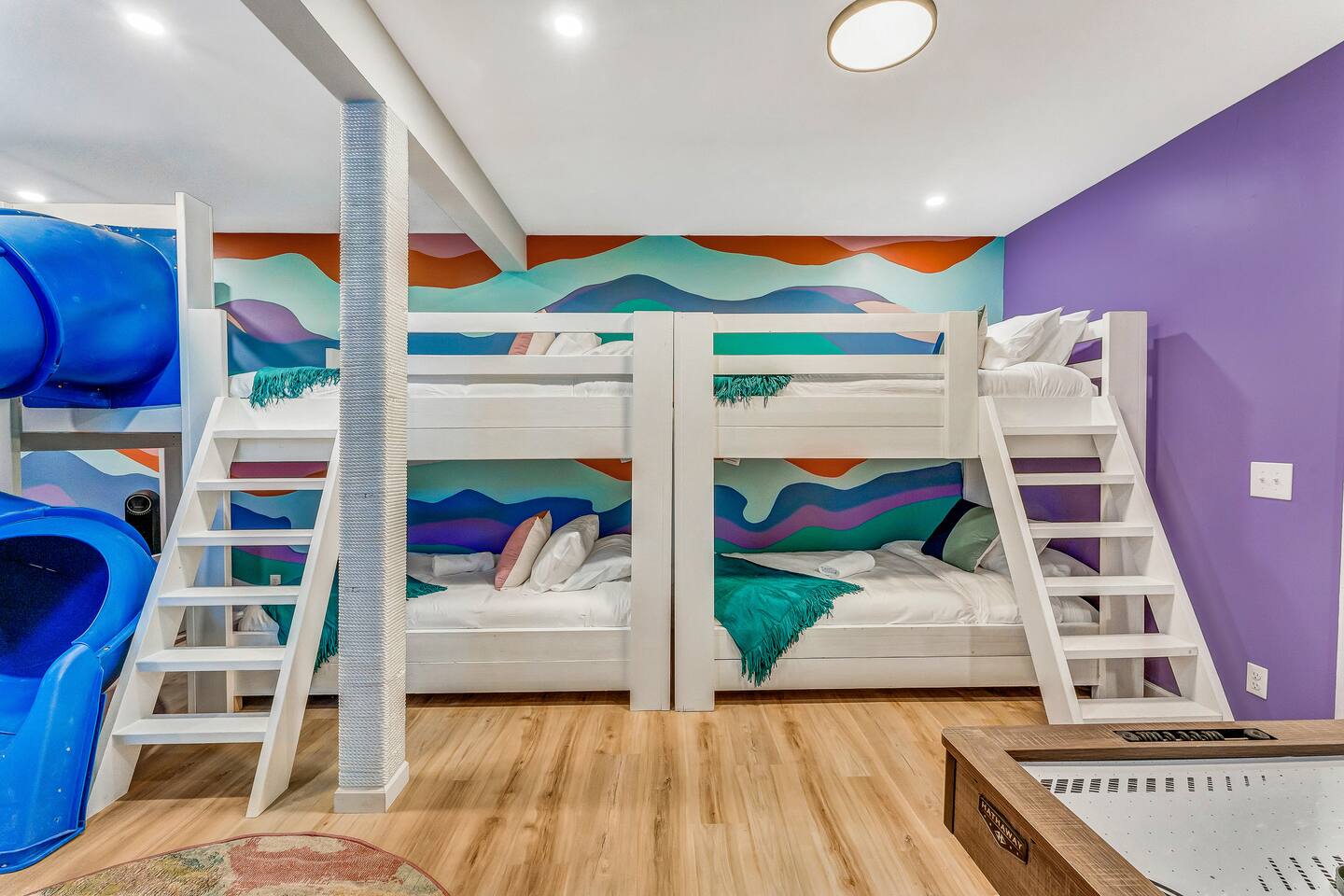 **During the summer months ONLY (Memorial Day weekend - Labor Day weekend), you will have the option to purchase amenity passes that allow you to access the following amenities** ☀ Lakes (with beach access - swimming allowed!) ☀ Pools ☀ Tennis courts ☀ Basketball courts ☀ Dog park ☀ Playground areas KEY FEATURES: ☀ 5 beautiful bedrooms; 2 kings, 2 queens, 1 full, and 4 twin beds (2 bunk beds) ☀ 3 modern, full bathrooms ☀ Modern kitchen with new, stainless steel appliances ☀ Open living room with lots of comfy seating & smart TV ☀ Dining room with seating to comfortably accommodate 12 (+ outdoor dining on the back deck) ☀ 2 AMAZING game rooms; pool table, ping pong, arcade games, & more! ☀ Fun-filled backyard; fire pit, hot tub, jungle gym, corn hole, & more! Here Are A Few Kind Words From Our Past Guests: “This was a great place to stay! The morning light through the windows was so beautiful. Overall, just a relaxing experience. The hosts were super responsive whenever I had a question. I would stay again!” - Emily “Sabrina was very accommodating and communicative. the house is beautiful and very comfortable, close to nature hikes.” - Jennifer “This place was lovely! Exactly as pictured! Very clean and excellent host experience!!! I plan to come back again!” - Regina ☆☆ BEDROOMS ☆☆ You'll find 5 beautiful bedrooms throughout this home, each with their own TV. On the first floor is the most fun bedroom of them all: two twin-over-twin bunk beds (4 twin beds total), a SLIDE, and air hockey. Upstairs are the 4 remaining bedrooms: the master bedroom has a king bed, private attached balcony, and an ensuite bathroom. The third bedroom has a king bed as well, while the fourth bedroom has a queen. The fifth bedroom has a queen-over-full trundle bed. ☆☆ BATHROOMS ☆☆ There are 3 full bathrooms in this home, each with a sink, toilet, and shower/tub combo. One bathroom is downstairs, located right off the hallway that connects the living room to the game rooms. Upstairs, the second bathroom is connected to the master bedroom, while the third bathroom is accessible from the upstairs hallway. ☆☆ KITCHEN & DINING ☆☆ The modern kitchen is located right off of the main living areas, and is loaded with all new stainless steel appliances & a coffee station (including a Keurig & coffee pods). The dining room is right next to the kitchen, with enough seating to comfortably fit 12 people, with direct access to the back deck, which has even more space for outdoor dining! ☆☆ LIVING ROOM ☆☆ In the living room, you’ll be greeted with lots of comfy seating and a big smart TV. This is the perfect spot to host your movie nights & games with your friends and family! ☆☆ GAME ROOMS ☆☆ Keep your family and friends entertained throughout your stay in our amenity-filled game room! Pool table, ping pong, basketball pop-a-shot, and arcade games. Whether your reason for staying is to explore the town or stay at home and relax, this place will be the perfect spot to unwind! ☆☆ OUTDOOR SPACE ☆☆ This backyard is everything you could ask for, and more! ☀ Hot tub ☀ Wood-burning fire pit ☀ Jungle gym ☀ Corn hole ☀ Giant Connect 4 ☀ BBQ grill ☀ Outdoor lounge seating ☀ Outdoor dining There is so much to do here, that all of your friends & family will be thoroughly entertained throughout your entire stay. No matter the season, this backyard has it all. Book your stay with us today and you will NOT be disappointed. Get ready for a vacation you will never forget! ★☆ Book Now & Let Us Take Care Of You In The Poconos! ☆★