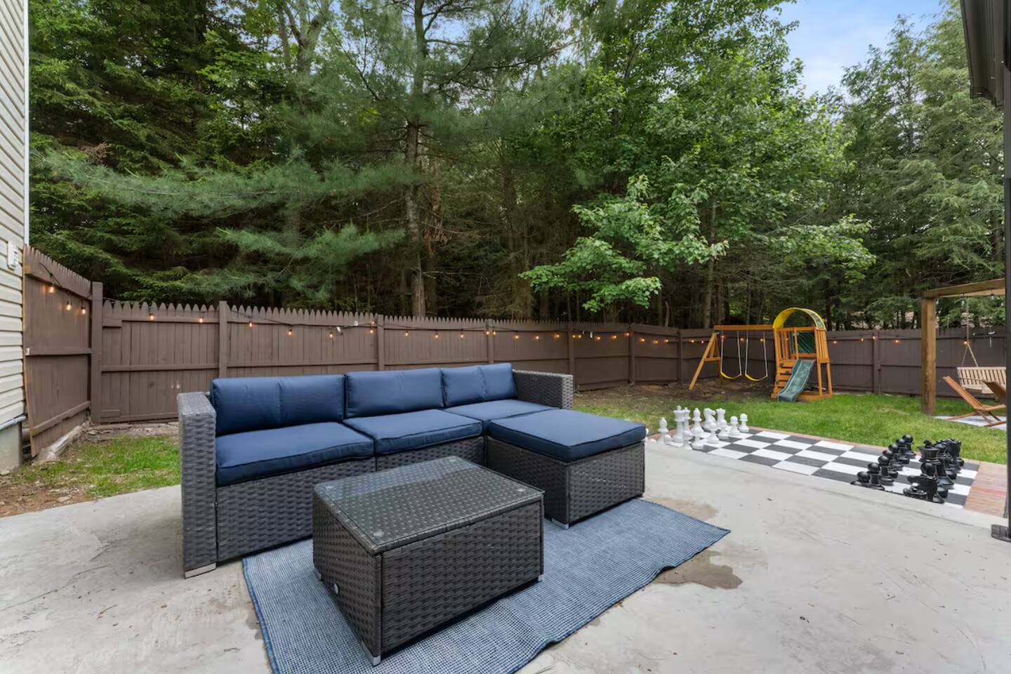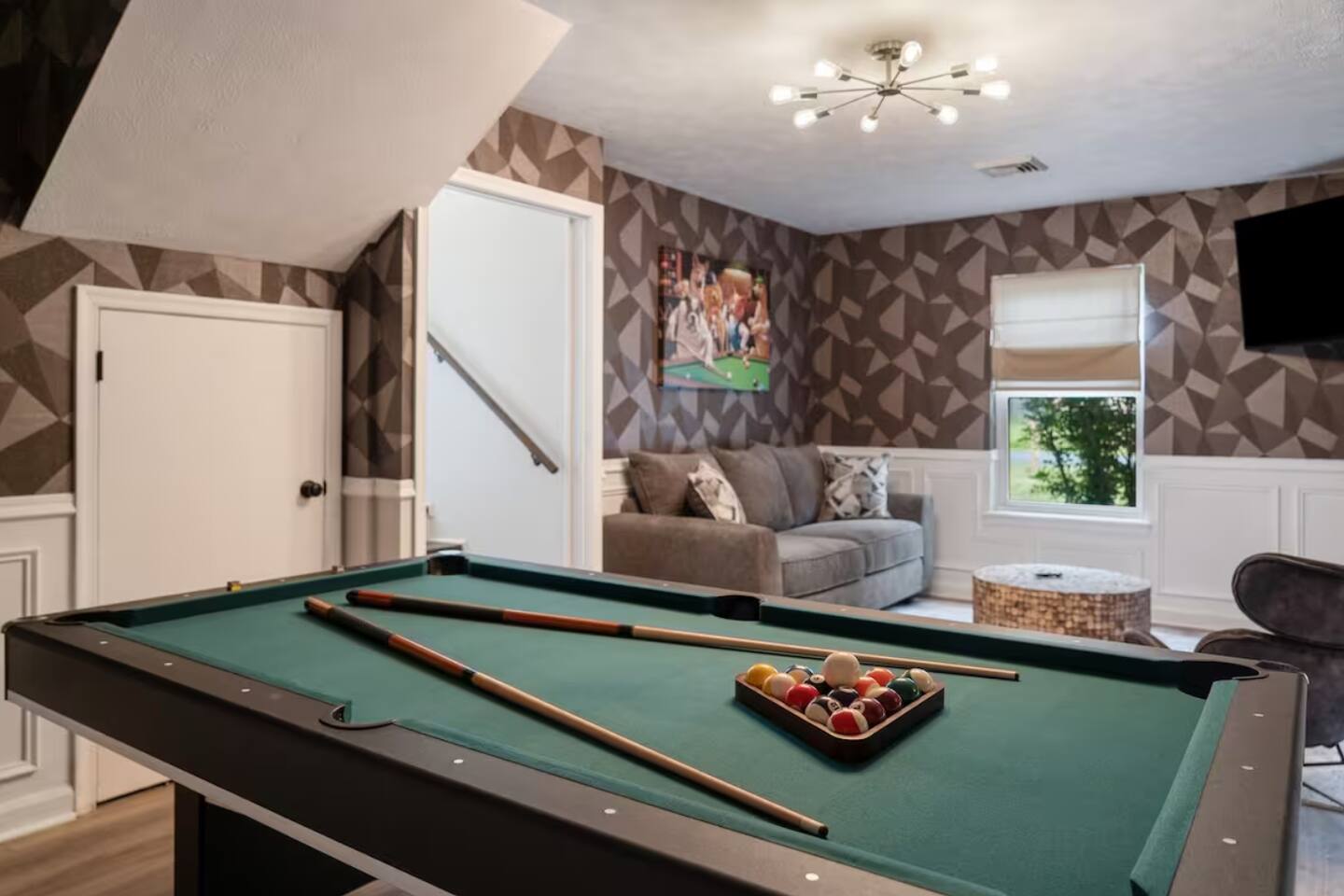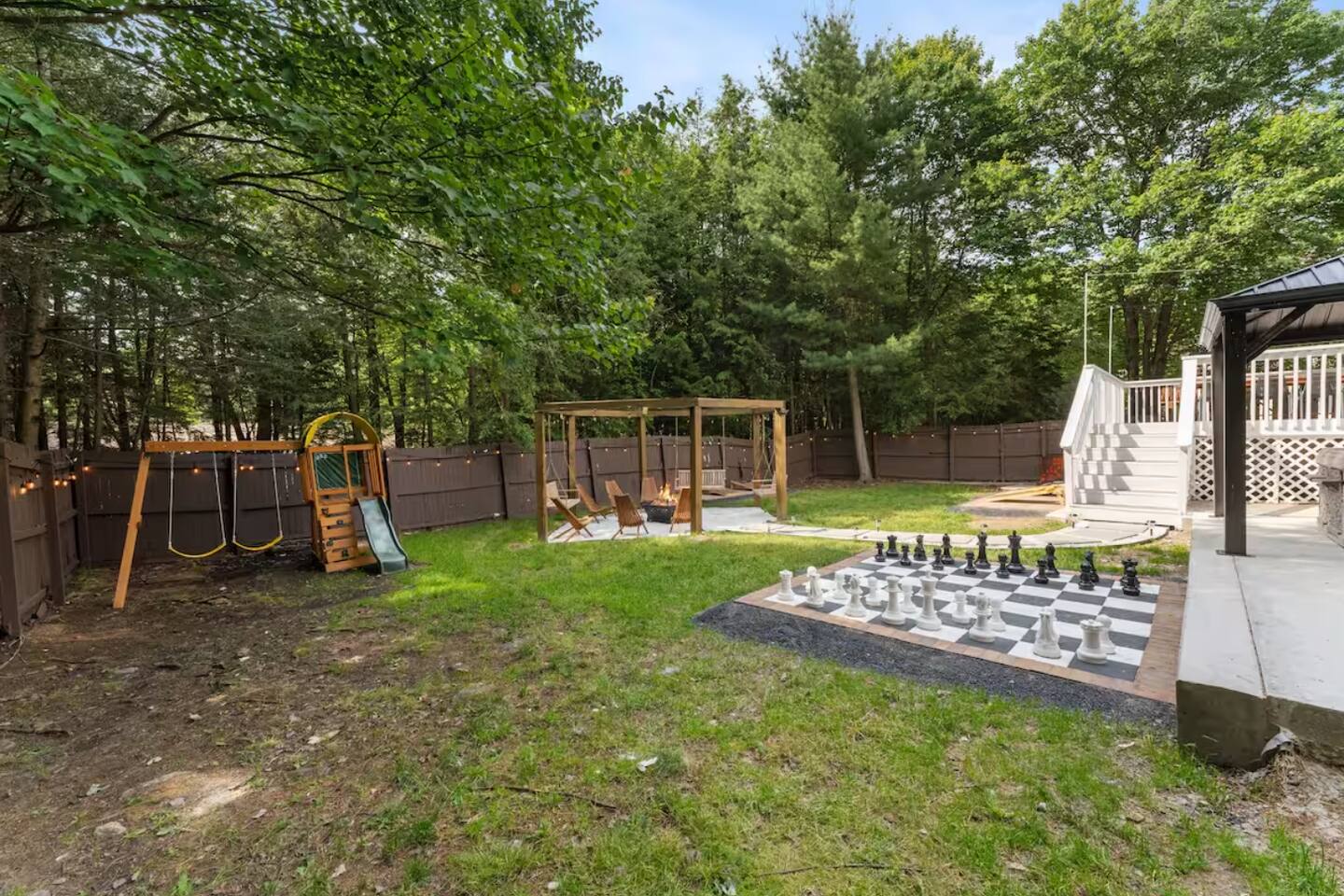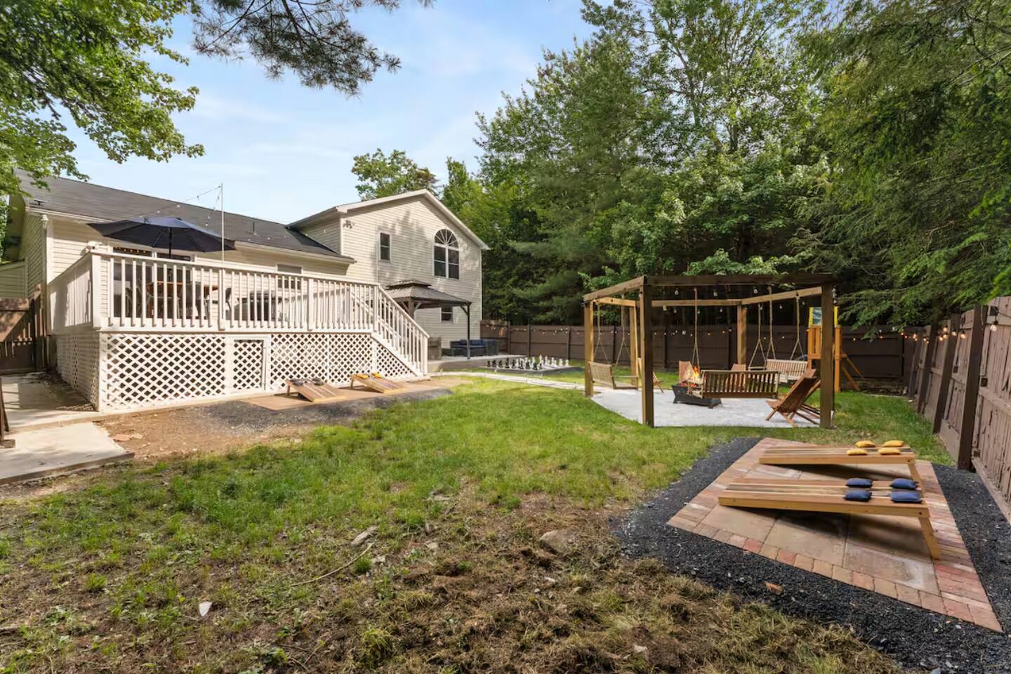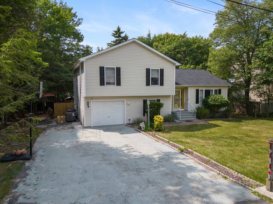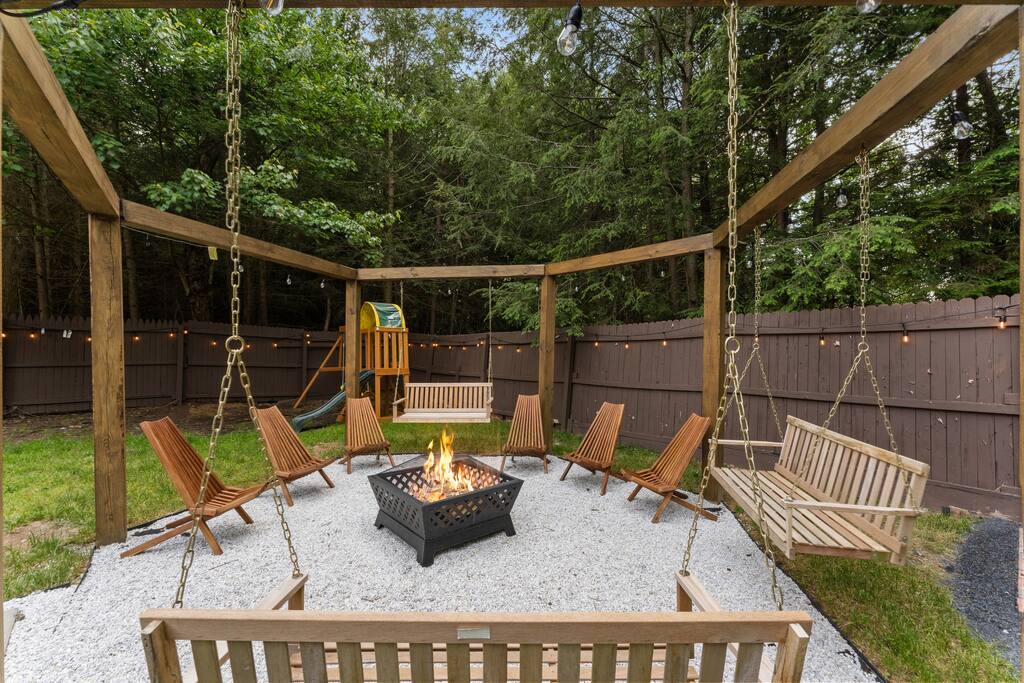 **During the summer months (Memorial Day weekend - Labor Day weekend), you will have the option to purchase amenity passes that allow you to access the following amenities** β Lakes (with beach access - swimming allowed!) β Pool KEY FEATURES: β 3 beautiful bedrooms; 1 king, 1 queen, 4 fulls (2 bunk beds), & 1 twin bed β 3 full bathrooms β Modern kitchen with new, stainless steel appliances β Open living room with lots of comfy seating & smart TV β Dining room with seating to comfortably accommodate 10 (+ outdoor dining) β Sleek game room with pool table & smart TV β AMAZING backyard, fully fenced with hot tub, fire pit, jungle gym, & more! Here Are A Few Kind Words From Our Past Guests: βThis was a great place to stay! The morning light through the windows was so beautiful. Overall, just a relaxing experience. The hosts were super responsive whenever I had a question. I would stay again!β - Emily βSabrina was very accommodating and communicative. the house is beautiful and very comfortable, close to nature hikes.β - Jennifer βThis place was lovely! Exactly as pictured! Very clean and excellent host experience!!! I plan to come back again!β - Regina ββ BEDROOMS ββ Each of the three bedrooms in this home has been beautifully designed to fit the modern aesthetic of this property. The master bedroom has one king bed & a smart TV, with an attached ensuite bathroom. The second bedroom has one queen bed & one twin bed, while the third bedroom has 2 full-over-full bunk beds (4 full size beds total). ββ BATHROOMS ββ There are three full bathrooms in this home. The master ensuite bathroom has a sink, toilet, and walk-in shower. The second bathroom on this floor also has a sink, toilet, and walk-in shower only. On the lower level, the third bathroom has a sink, toilet, and shower/tub combo. ββ KITCHEN & DINING ββ The modern kitchen is located right off of the main living areas, and is loaded with all new stainless steel appliances & a coffee station (including a Keurig & coffee pods). The dining room is right next to the kitchen, with enough seating to comfortably fit 10 people, with easy access directly out to the private deck & yard. ββ LIVING ROOM ββ In the living room, youβll be greeted with lots of comfy seating, a big smart TV, high vaulted ceilings, and modern design throughout. This is the perfect spot to host your movie nights & games with your friends and family! ββ GAME ROOM ββ Keep your family and friends entertained throughout your stay in our amenity-filled game room! Pool table, ping pong table, lounge seating, and a smart TV. Whether your reason for staying is to explore the town or stay at home and relax, this place will be the perfect spot to unwind! ββ OUTDOOR SPACE ββ This backyard is everything you could ask for, and more! β Hot tub β Fire pit (wood-burning) β Children's jungle gym β Giant Chess β Corn hole β Outdoor lounge seating β Covered outdoor dining β BBQ grill There is so much to do here, that all of your friends & family will be thoroughly entertained throughout your entire stay. No matter the season, this backyard has it all. Book your stay with us today and you will NOT be disappointed. Get ready for a vacation you will never forget! β β Book Now & Let Us Take Care Of You In The Poconos! ββ