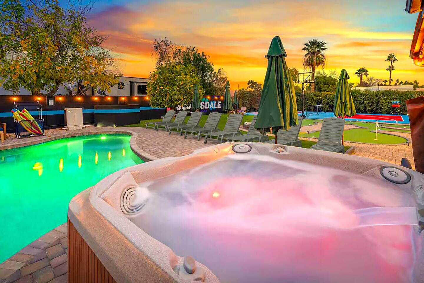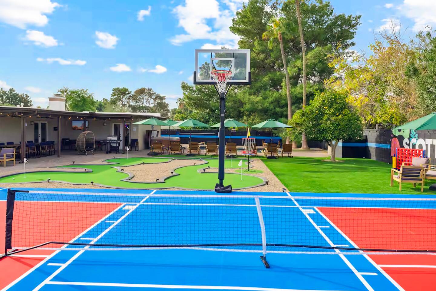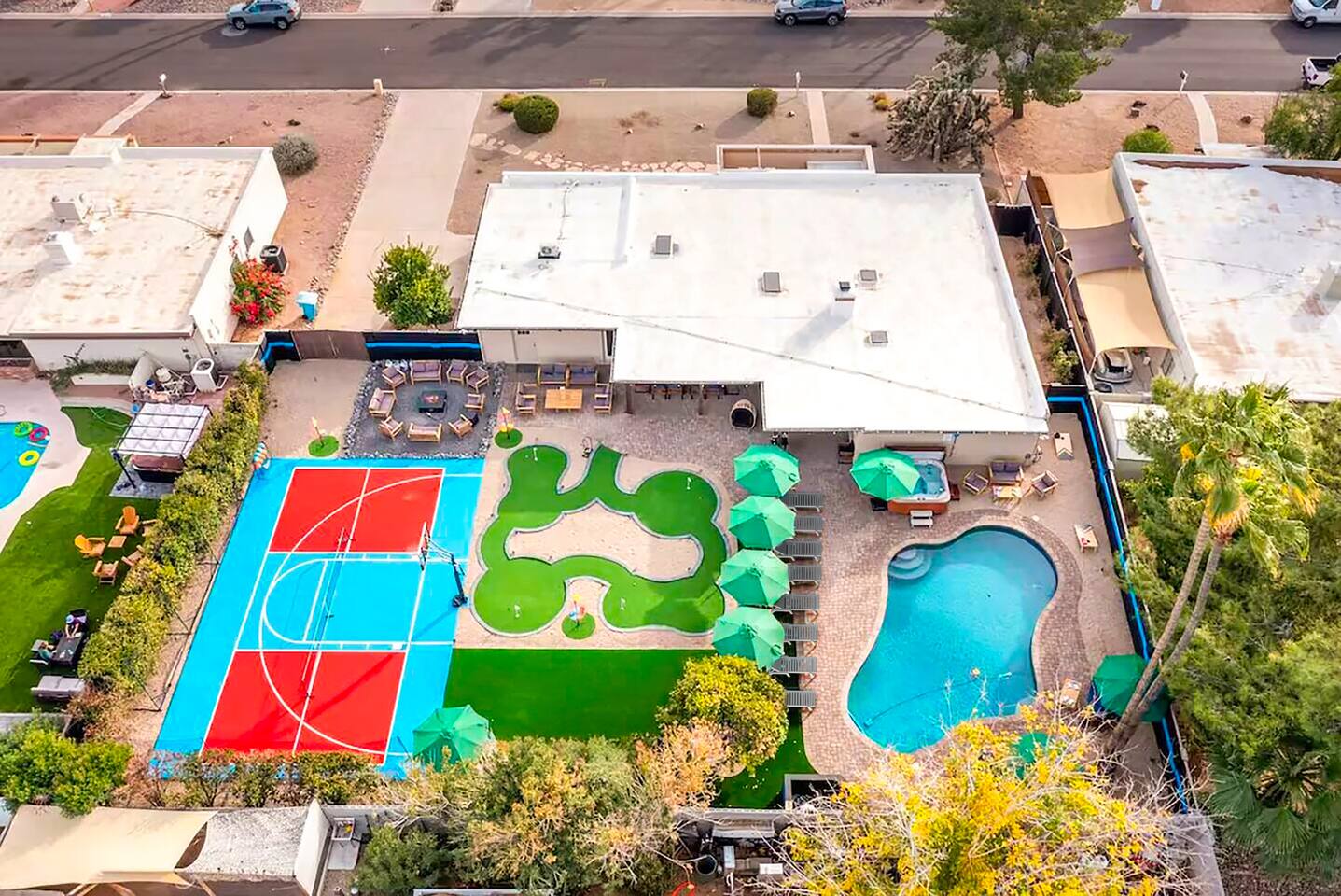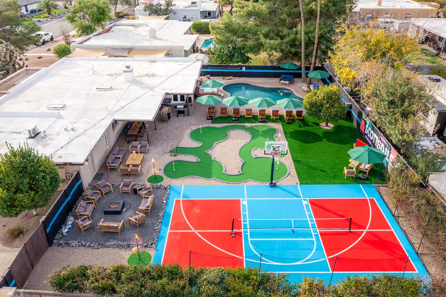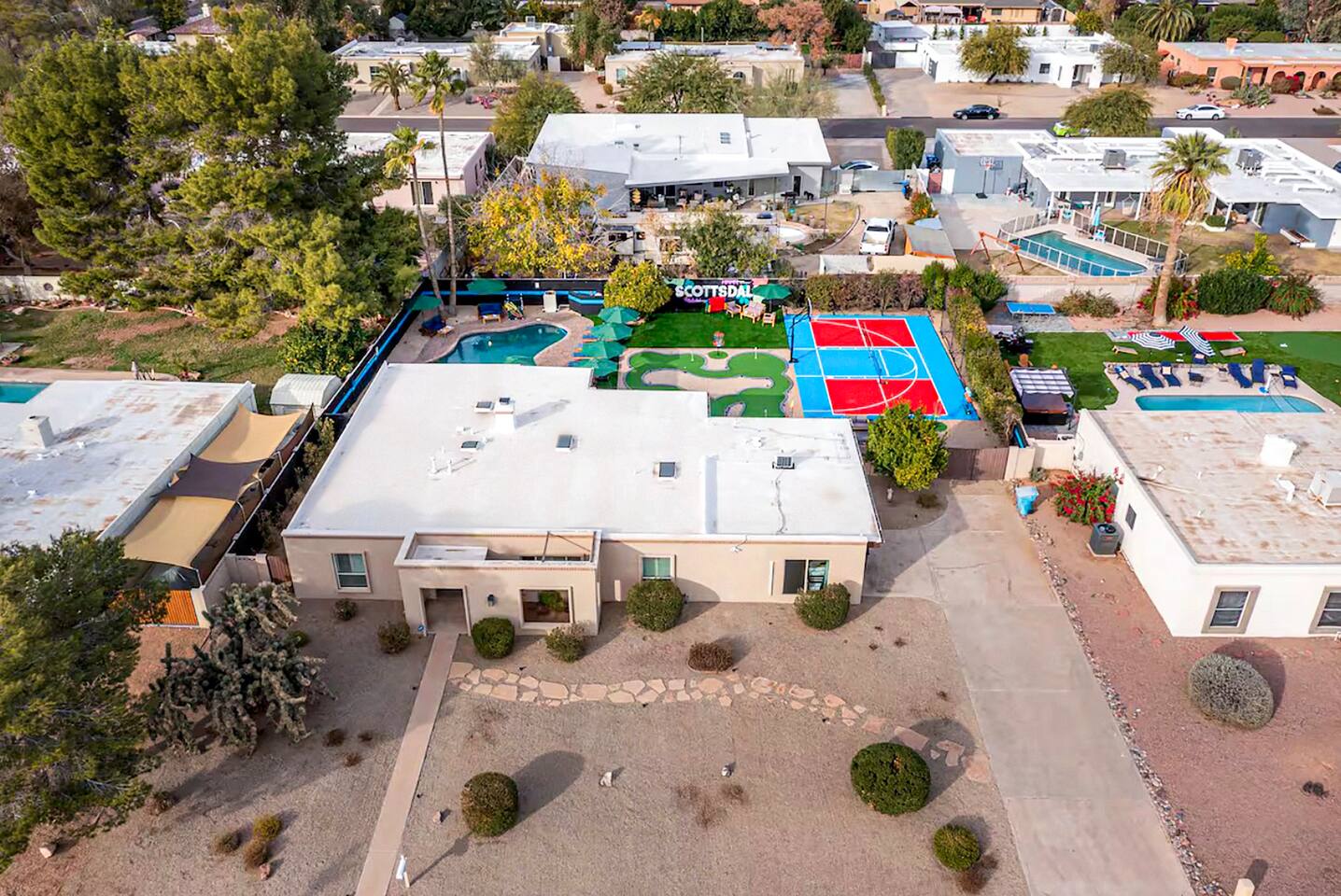 KEY FEATURES: ☀ 5 beautiful bedrooms; 1 king, 8 fulls, & 4 twin beds ☀ 2.5 modern bathrooms ☀ Modern kitchen with new, stainless steel appliances ☀ Open living room with lots of comfy seating & smart TV ☀ Dining room with seating to comfortably accommodate 14 (+ outdoor dining options) ☀ Bright, vibrant game rooms with pool table, air hockey, & more! ☀ UNBELIEVABLE backyard; heated pool, hot tub, fire pit, mini golf, basketball court, & much more! Here Are A Few Kind Words From Our Past Guests: “This was a great place to stay! The morning light through the windows was so beautiful. Overall, just a relaxing experience. The hosts were super responsive whenever I had a question. I would stay again!” - Emily “Sabrina was very accommodating and communicative. the house is beautiful and very comfortable, close to nature hikes.” - Jennifer “This place was lovely! Exactly as pictured! Very clean and excellent host experience!!! I plan to come back again!” - Regina ☆☆ BEDROOMS ☆☆ You'll find 5 bedrooms throughout this home. The first bedroom has a king bed. The second & third bedrooms have two full beds in each. The fourth bedroom has two twin-over-twin bunks, while the fifth bedroom has two full-over-full bunks, & is also LOADED with games & entertainment! ☆☆ BATHROOMS ☆☆ There are two and a half modern bathrooms throughout the home. The ensuite master bathroom has 2 sinks, a toilet, & a walk-in shower. The full hallway bathroom has a sink, toilet, & shower/tub combo. The final bathroom has a sink & toilet only. ☆☆ KITCHEN & DINING ☆☆ The modern kitchen is located right off of the main living areas, and is loaded with all new stainless steel appliances & a coffee station (including a Keurig & coffee pods). The dining rooms are right next to the kitchen, with enough seating to comfortably fit 14 people (between two dining rooms), + lots of room for outdoor dining! ☆☆ LIVING ROOM ☆☆ In the living room, you’ll be greeted with lots of comfy seating, a big smart TV, and a beautiful, bright design that is carried throughout the rest of the home. This is the perfect spot to host your movie nights & games with your friends and family! ☆☆ GAME ROOM ☆☆ There are TWO amazing game rooms in this home! The first is filled with a pool table, high top seating, & a smart TV, while the second has air hockey, shuffleboard, comfy seating, & another smart TV. Tons of fun - everywhere! ☆☆ OUTDOOR SPACE ☆☆ This backyard is everything you could ask for, and more! ☀ Heated pool ☀ Hot tub ☀ Mini golf ☀ Basketball court ☀ Pickleball court ☀ Frisbee golf ☀ Ping pong ☀ Fire pit ☀ Corn hole ☀ Giant Connect 4 ☀ Giant Jenga ☀ BBQ grill ☀ Sun bathing chairs ☀ Lounge seating ☀ Covered outdoor dining There is so much to do here, that all of your friends & family will be thoroughly entertained throughout your entire stay. No matter the season, this backyard has it all. Book your stay with us today and you will NOT be disappointed. Get ready for a vacation you will never forget! ★☆ Book Now & Let Us Take Care Of You In Scottsdale! ☆★