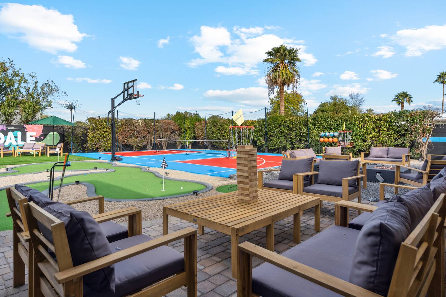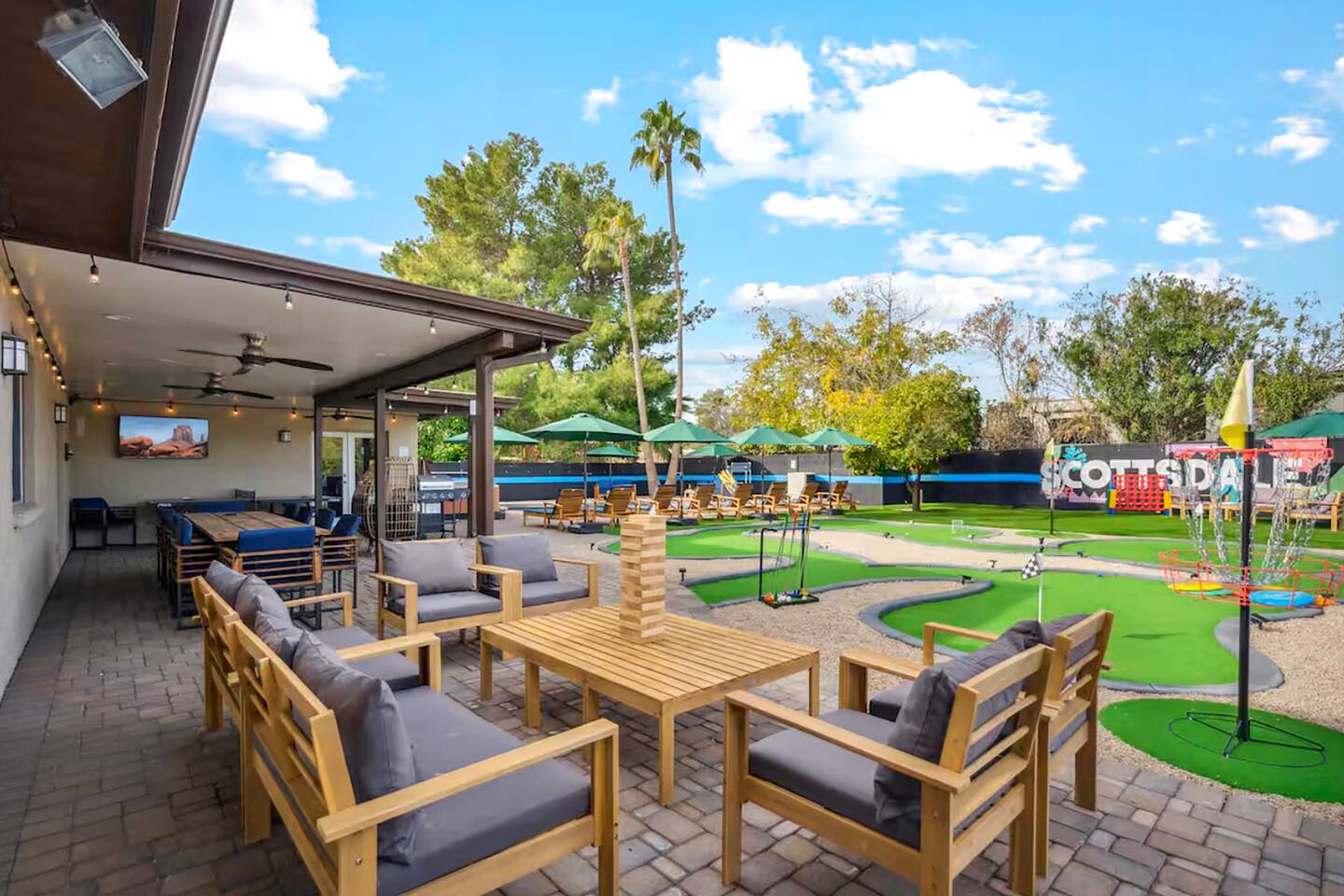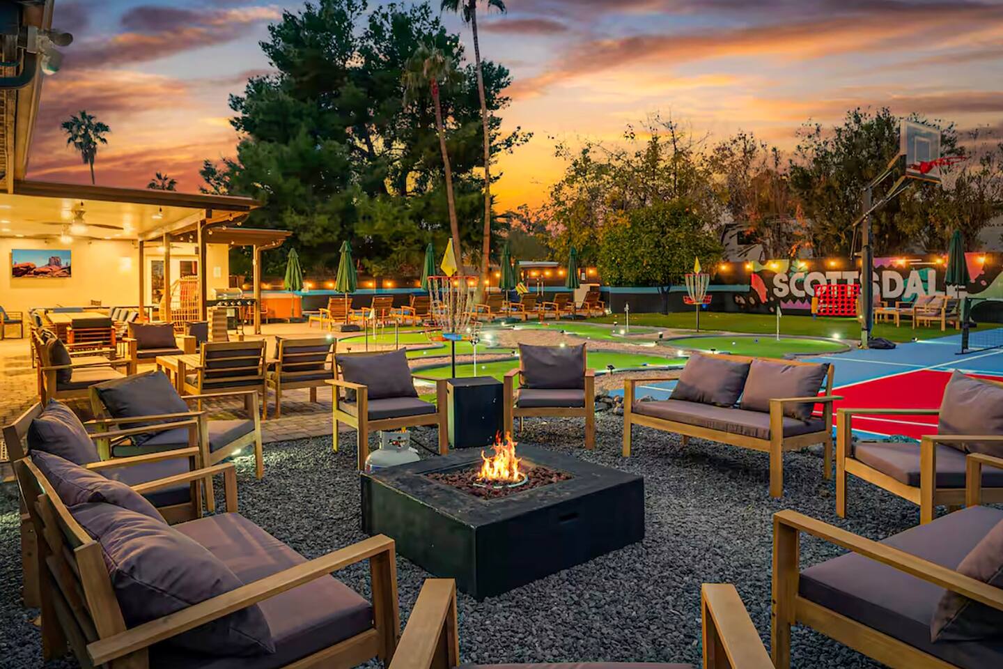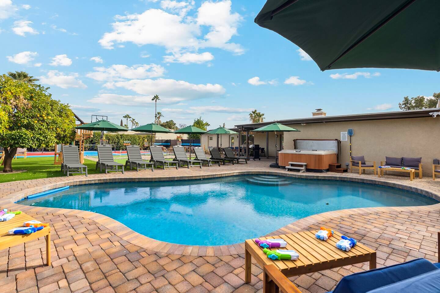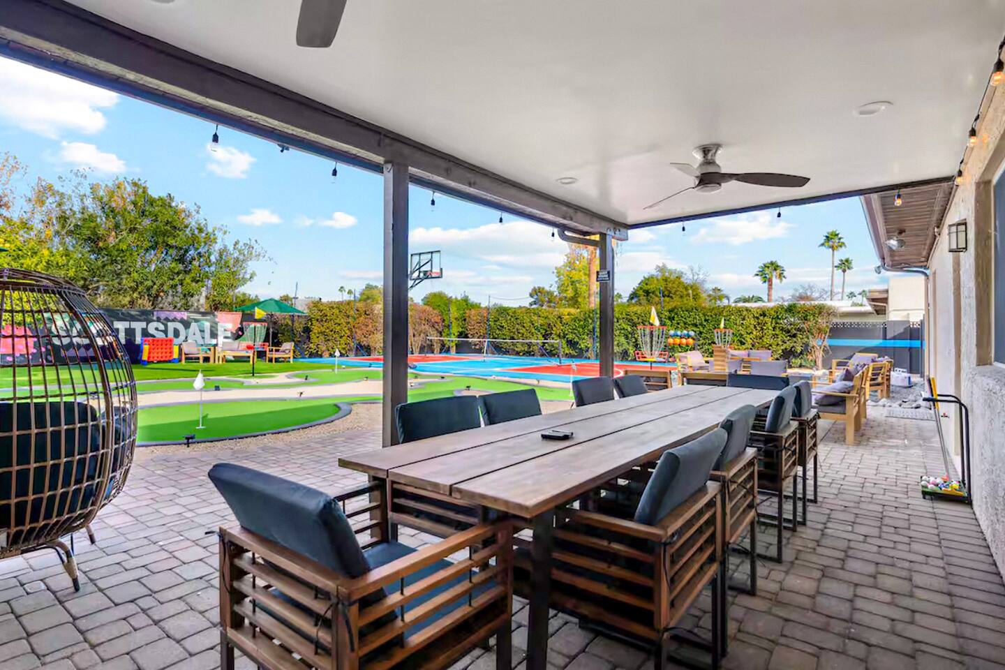 KEY FEATURES: ☀ 5 beautiful bedrooms; 1 king, 8 fulls, & 4 twin beds ☀ 2.5 modern bathrooms ☀ Modern kitchen with new, stainless steel appliances ☀ Open living room with lots of comfy seating & smart TV ☀ Dining room with seating to comfortably accommodate 14 (+ outdoor dining options) ☀ Bright, vibrant game rooms with pool table, air hockey, & more! ☀ UNBELIEVABLE backyard; heated pool, hot tub, fire pit, mini golf, basketball court, & much more! Here Are A Few Kind Words From Our Past Guests: “This was a great place to stay! The morning light through the windows was so beautiful. Overall, just a relaxing experience. The hosts were super responsive whenever I had a question. I would stay again!” - Emily “Sabrina was very accommodating and communicative. the house is beautiful and very comfortable, close to nature hikes.” - Jennifer “This place was lovely! Exactly as pictured! Very clean and excellent host experience!!! I plan to come back again!” - Regina ☆☆ BEDROOMS ☆☆ You'll find 5 bedrooms throughout this home. The first bedroom has a king bed. The second & third bedrooms have two full beds in each. The fourth bedroom has two twin-over-twin bunks, while the fifth bedroom has two full-over-full bunks, & is also LOADED with games & entertainment! ☆☆ BATHROOMS ☆☆ There are two and a half modern bathrooms throughout the home. The ensuite master bathroom has 2 sinks, a toilet, & a walk-in shower. The full hallway bathroom has a sink, toilet, & shower/tub combo. The final bathroom has a sink & toilet only. ☆☆ KITCHEN & DINING ☆☆ The modern kitchen is located right off of the main living areas, and is loaded with all new stainless steel appliances & a coffee station (including a Keurig & coffee pods). The dining rooms are right next to the kitchen, with enough seating to comfortably fit 14 people (between two dining rooms), + lots of room for outdoor dining! ☆☆ LIVING ROOM ☆☆ In the living room, you’ll be greeted with lots of comfy seating, a big smart TV, and a beautiful, bright design that is carried throughout the rest of the home. This is the perfect spot to host your movie nights & games with your friends and family! ☆☆ GAME ROOM ☆☆ There are TWO amazing game rooms in this home! The first is filled with a pool table, high top seating, & a smart TV, while the second has air hockey, shuffleboard, comfy seating, & another smart TV. Tons of fun - everywhere! ☆☆ OUTDOOR SPACE ☆☆ This backyard is everything you could ask for, and more! ☀ Heated pool ☀ Hot tub ☀ Mini golf ☀ Basketball court ☀ Pickleball court ☀ Frisbee golf ☀ Ping pong ☀ Fire pit ☀ Corn hole ☀ Giant Connect 4 ☀ Giant Jenga ☀ BBQ grill ☀ Sun bathing chairs ☀ Lounge seating ☀ Covered outdoor dining There is so much to do here, that all of your friends & family will be thoroughly entertained throughout your entire stay. No matter the season, this backyard has it all. Book your stay with us today and you will NOT be disappointed. Get ready for a vacation you will never forget! ★☆ Book Now & Let Us Take Care Of You In Scottsdale! ☆★