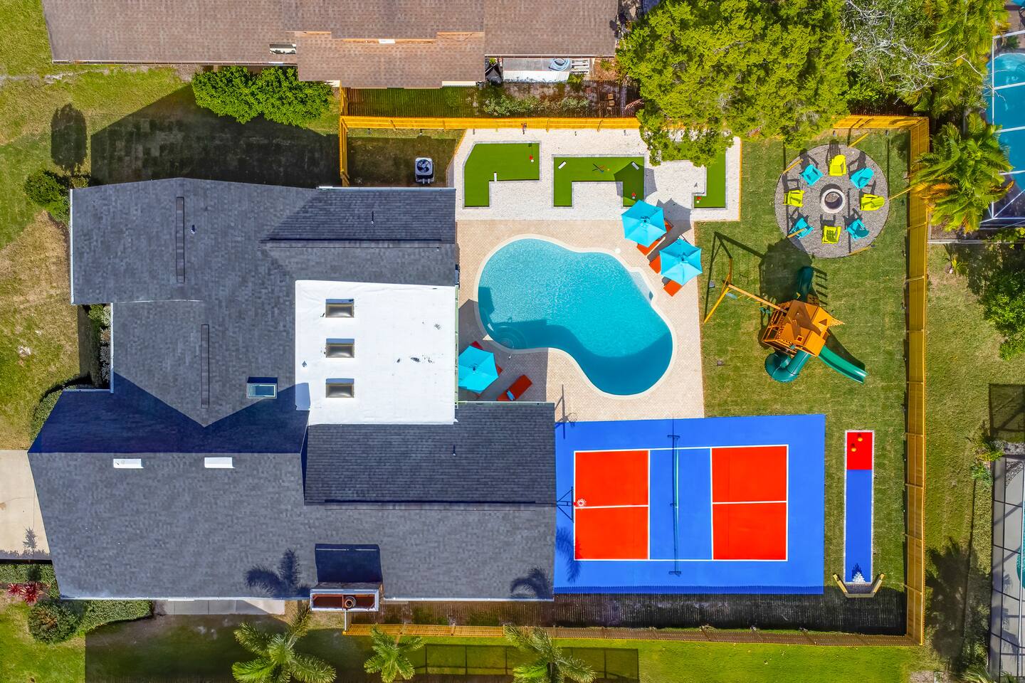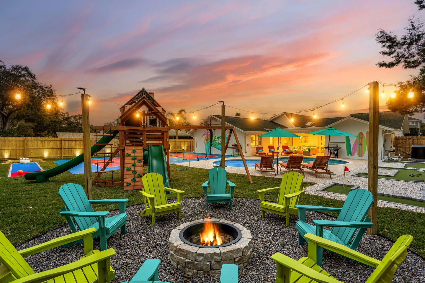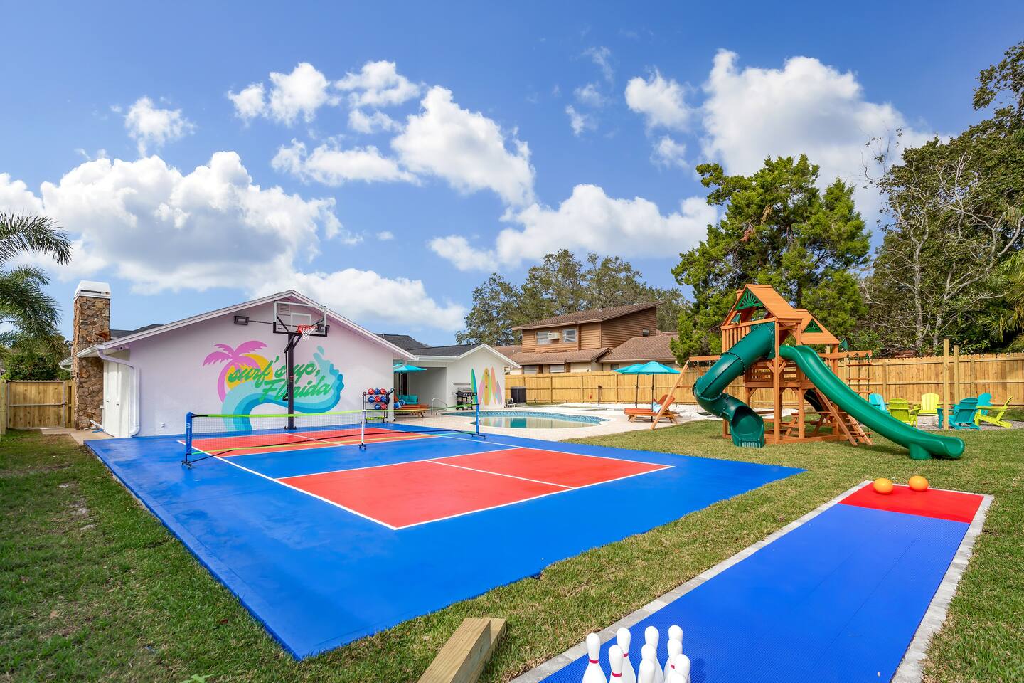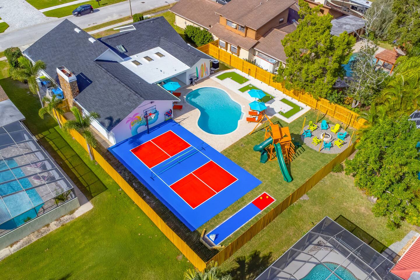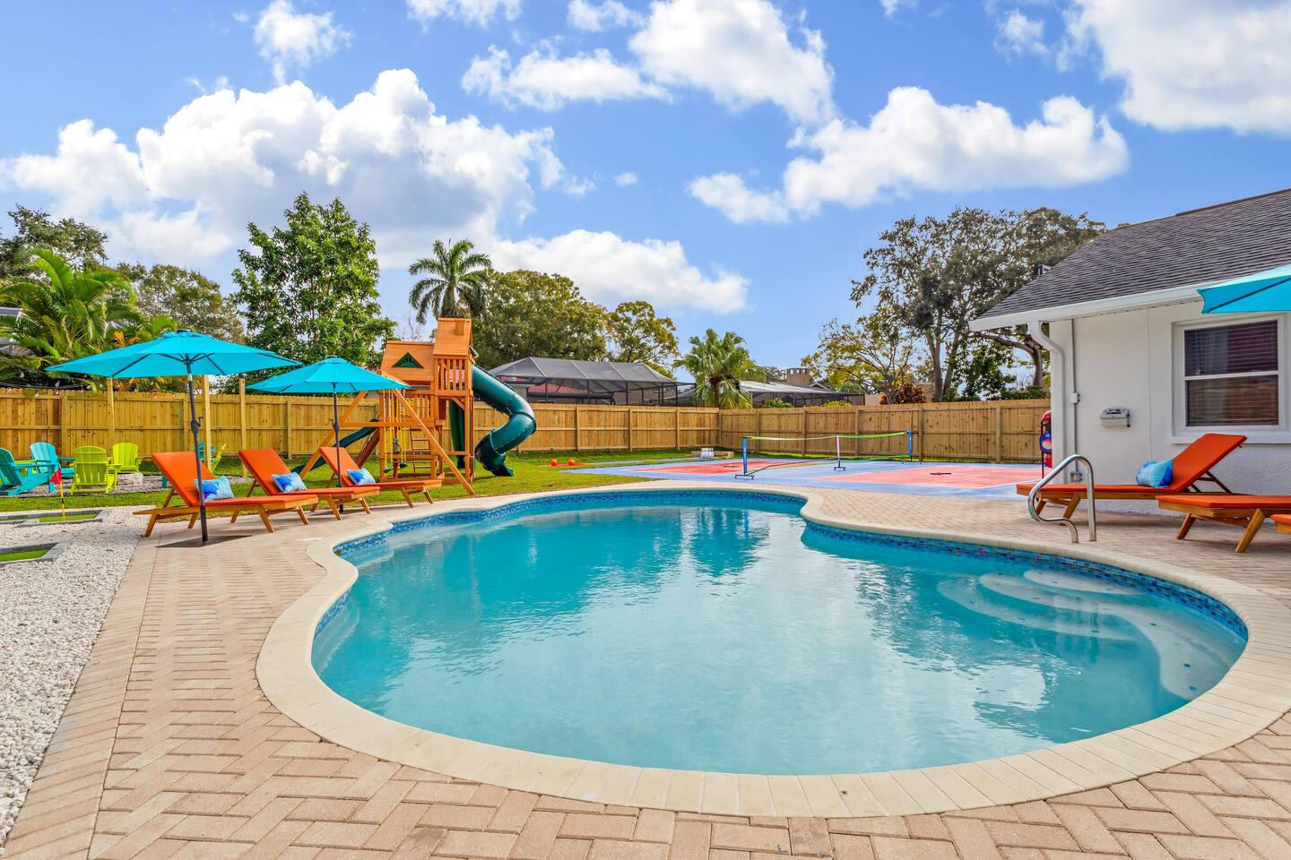 KEY FEATURES: ☀ 5 spacious bedrooms with fun, unique designs; 2 kings, 2 queens, 2 fulls, & 2 twin beds ☀ 3 full, modern bathrooms ☀ Beautiful chef's kitchen with modern appliances & design ☀ Living room with tons of comfy seating and large smart TV ☀ Game room with pool table, foosball, air hockey & more ☀ Bright dining room that opens up to the main living area; great for entertaining! ☀ Huge backyard with heated pool, mini golf, bowling, fire pit, and more ☀ Quiet, private neighborhood just minutes away from beautiful beaches Here Are A Few Kind Words From Our Past Guests: “This was a great place to stay! The morning light through the windows was so beautiful. Overall, just a relaxing experience. The hosts were super responsive whenever I had a question. I would stay again!” - Emily “Sabrina was very accommodating and communicative. the house is beautiful and very comfortable, close to nature hikes.” - Jennifer “This place was lovely! Exactly as pictured! Very clean and excellent host experience!!! I plan to come back again!” - Regina ☆☆ BEDROOMS ☆☆ These 5 bedrooms will BLOW YOU AWAY! The star of the show is the bunk bedroom, which is filled with two twin-over-full bunk beds, two slides, arcade gams, basketball (Pop-a-Shot), smart TV, & comfy seating. It will truly WOW you! There are 4 remaining bedrooms; two with a king bed in each, and two with a queen bed in each. All bedrooms have their own smart TV! ☆☆ BATHROOMS ☆☆ There are 3 full bathrooms throughout this home. The first bathroom has a toilet, sink, & a shower/tub combo. The private ensuite master bathroom has a sink, toilet, walk-in shower, and standalone tub. The third bathroom is located right off of the pool table room, with two sinks, a toilet, & walk-in shower. ☆☆ KITCHEN & DINING ☆☆ The kitchen is bright & open, with brand new stainless steel appliances. With lots of counter space and bar top seating, it's a great kitchen for entertaining! Just one room over is the dining room, which is bright and welcoming. The formal dining room seats 8 (plus 4 bar top seats in the kitchen), and there is also a second dining table in the backyard. ☆☆ LIVING ROOM ☆☆ As you walk into the home, you're greeted with the big, open living room, which has tons of comfy seating and a fun, tropical design! It's a great place for your movie or game nights, where the whole family can sit together in this cozy space! ☆☆ GAME ROOM ☆☆ There are TWO fun game rooms in this home. The first game room, right off of the living room, has foosball, air hockey, and direct access to the incredible backyard. The second game room is located right next to the dining room, with a pool table smart TV, and a fireplace. ☆☆ OUTDOOR SPACE ☆☆ This backyard is everything you could ask for, and more! ☀ Heated pool ☀ Fire pit (wood burning) ☀ Mini golf ☀ Basketball court ☀ Pickleball court ☀ Bowling ☀ HUGE jungle gym ☀ Giant Jenga ☀ BBQ grill ☀ Covered outdoor dining ☀ Covered outdoor lounge seating ☀ Sun loungers ☀ Outdoor shower There is so much to do here, that all of your friends & family will be thoroughly entertained throughout your entire stay. No matter the season, this backyard has it all. Book your stay with us today and you will NOT be disappointed. Get ready for a vacation you will never forget! ★☆ Book Now & Let Us Take Care Of You In Seminole! ☆★