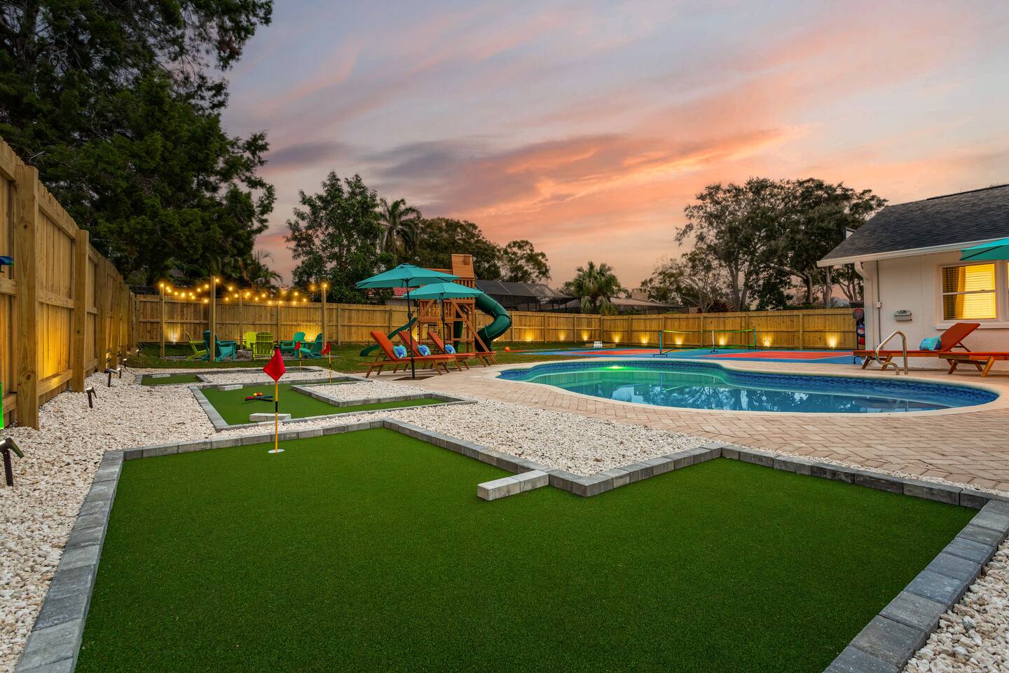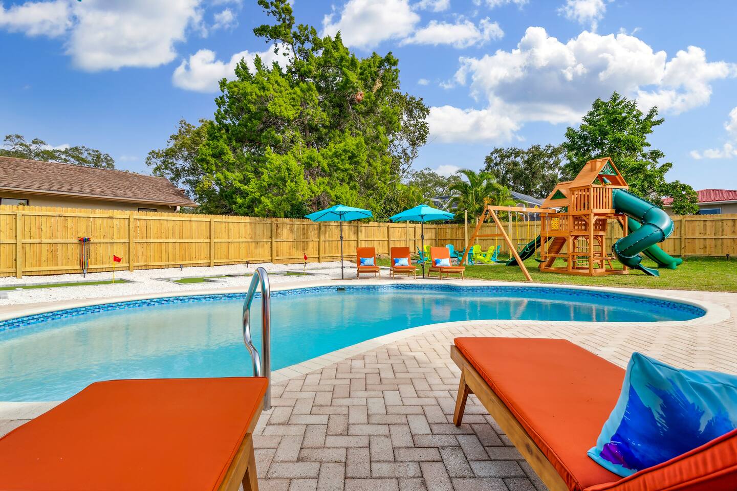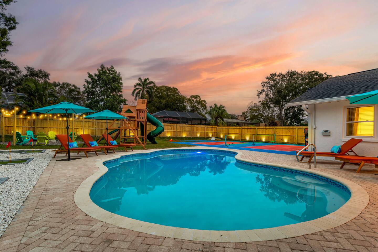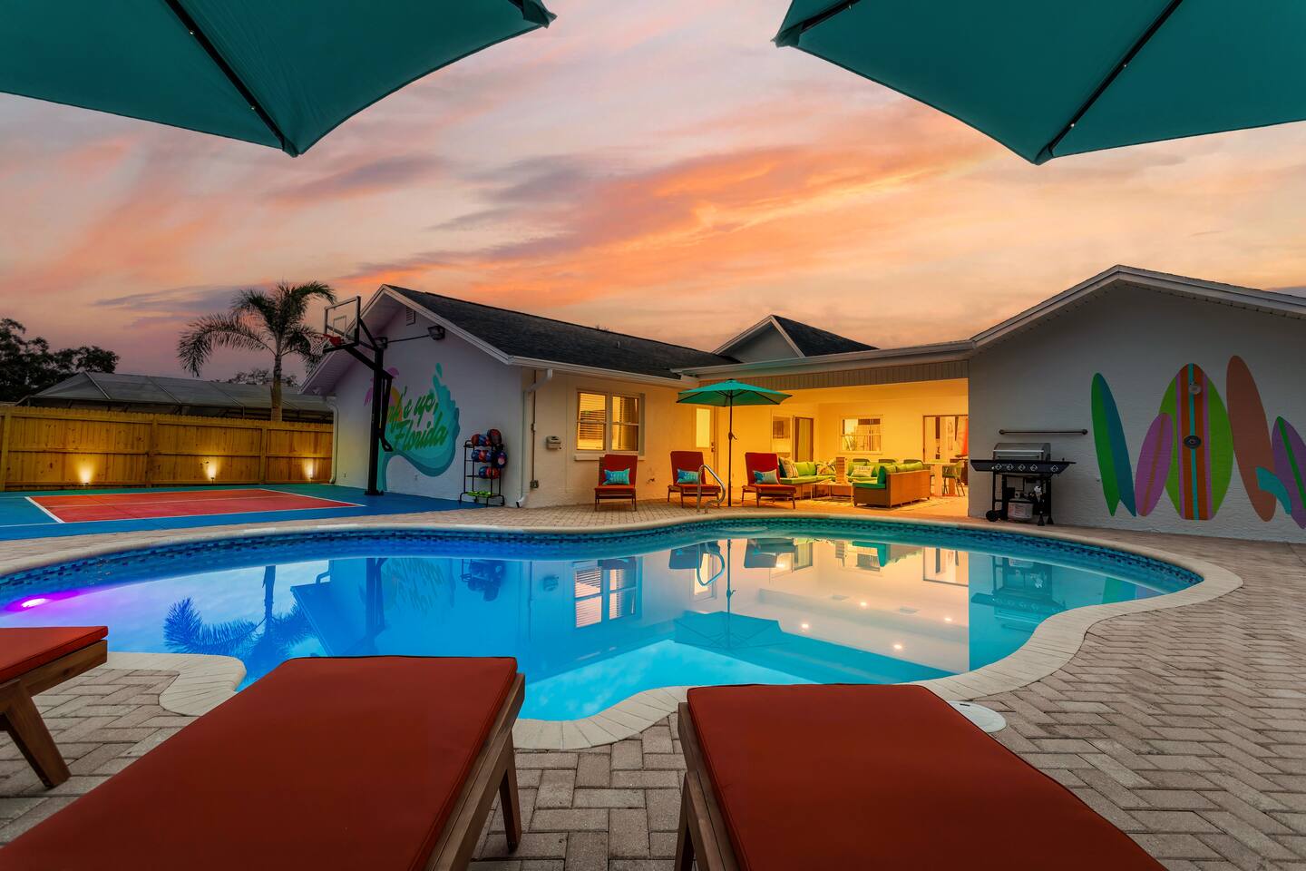KEY FEATURES: ☀ 5 spacious bedrooms with fun, unique designs; 2 kings, 2 queens, 2 fulls, & 2 twin beds ☀ 3 full, modern bathrooms ☀ Beautiful chef's kitchen with modern appliances & design ☀ Living room with tons of comfy seating and large smart TV ☀ Game room with pool table, foosball, air hockey & more ☀ Bright dining room that opens up to the main living area; great for entertaining! ☀ Huge backyard with heated pool, mini golf, bowling, fire pit, and more ☀ Quiet, private neighborhood just minutes away from beautiful beaches Here Are A Few Kind Words From Our Past Guests: “This was a great place to stay! The morning light through the windows was so beautiful. Overall, just a relaxing experience. The hosts were super responsive whenever I had a question. I would stay again!” - Emily “Sabrina was very accommodating and communicative. the house is beautiful and very comfortable, close to nature hikes.” - Jennifer “This place was lovely! Exactly as pictured! Very clean and excellent host experience!!! I plan to come back again!” - Regina ☆☆ BEDROOMS ☆☆ These 5 bedrooms will BLOW YOU AWAY! The star of the show is the bunk bedroom, which is filled with two twin-over-full bunk beds, two slides, arcade gams, basketball (Pop-a-Shot), smart TV, & comfy seating. It will truly WOW you! There are 4 remaining bedrooms; two with a king bed in each, and two with a queen bed in each. All bedrooms have their own smart TV! ☆☆ BATHROOMS ☆☆ There are 3 full bathrooms throughout this home. The first bathroom has a toilet, sink, & a shower/tub combo. The private ensuite master bathroom has a sink, toilet, walk-in shower, and standalone tub. The third bathroom is located right off of the pool table room, with two sinks, a toilet, & walk-in shower. ☆☆ KITCHEN & DINING ☆☆ The kitchen is bright & open, with brand new stainless steel appliances. With lots of counter space and bar top seating, it's a great kitchen for entertaining! Just one room over is the dining room, which is bright and welcoming. The formal dining room seats 8 (plus 4 bar top seats in the kitchen), and there is also a second dining table in the backyard. ☆☆ LIVING ROOM ☆☆ As you walk into the home, you're greeted with the big, open living room, which has tons of comfy seating and a fun, tropical design! It's a great place for your movie or game nights, where the whole family can sit together in this cozy space! ☆☆ GAME ROOM ☆☆ There are TWO fun game rooms in this home. The first game room, right off of the living room, has foosball, air hockey, and direct access to the incredible backyard. The second game room is located right next to the dining room, with a pool table smart TV, and a fireplace. ☆☆ OUTDOOR SPACE ☆☆ This backyard is everything you could ask for, and more! ☀ Heated pool ☀ Fire pit (wood burning) ☀ Mini golf ☀ Basketball court ☀ Pickleball court ☀ Bowling ☀ HUGE jungle gym ☀ Giant Jenga ☀ BBQ grill ☀ Covered outdoor dining ☀ Covered outdoor lounge seating ☀ Sun loungers ☀ Outdoor shower There is so much to do here, that all of your friends & family will be thoroughly entertained throughout your entire stay. No matter the season, this backyard has it all. Book your stay with us today and you will NOT be disappointed. Get ready for a vacation you will never forget! ★☆ Book Now & Let Us Take Care Of You In Seminole! ☆★