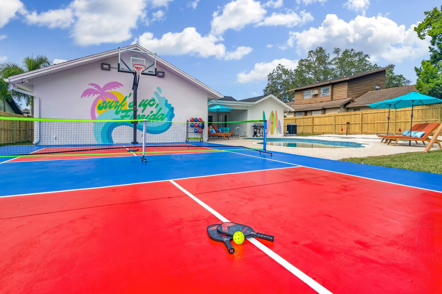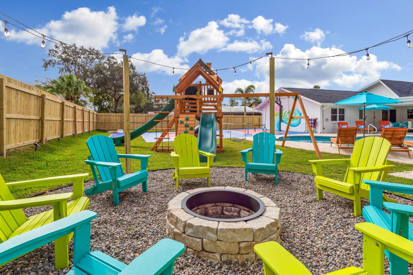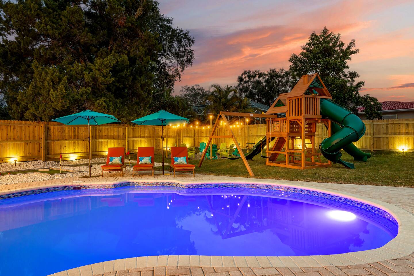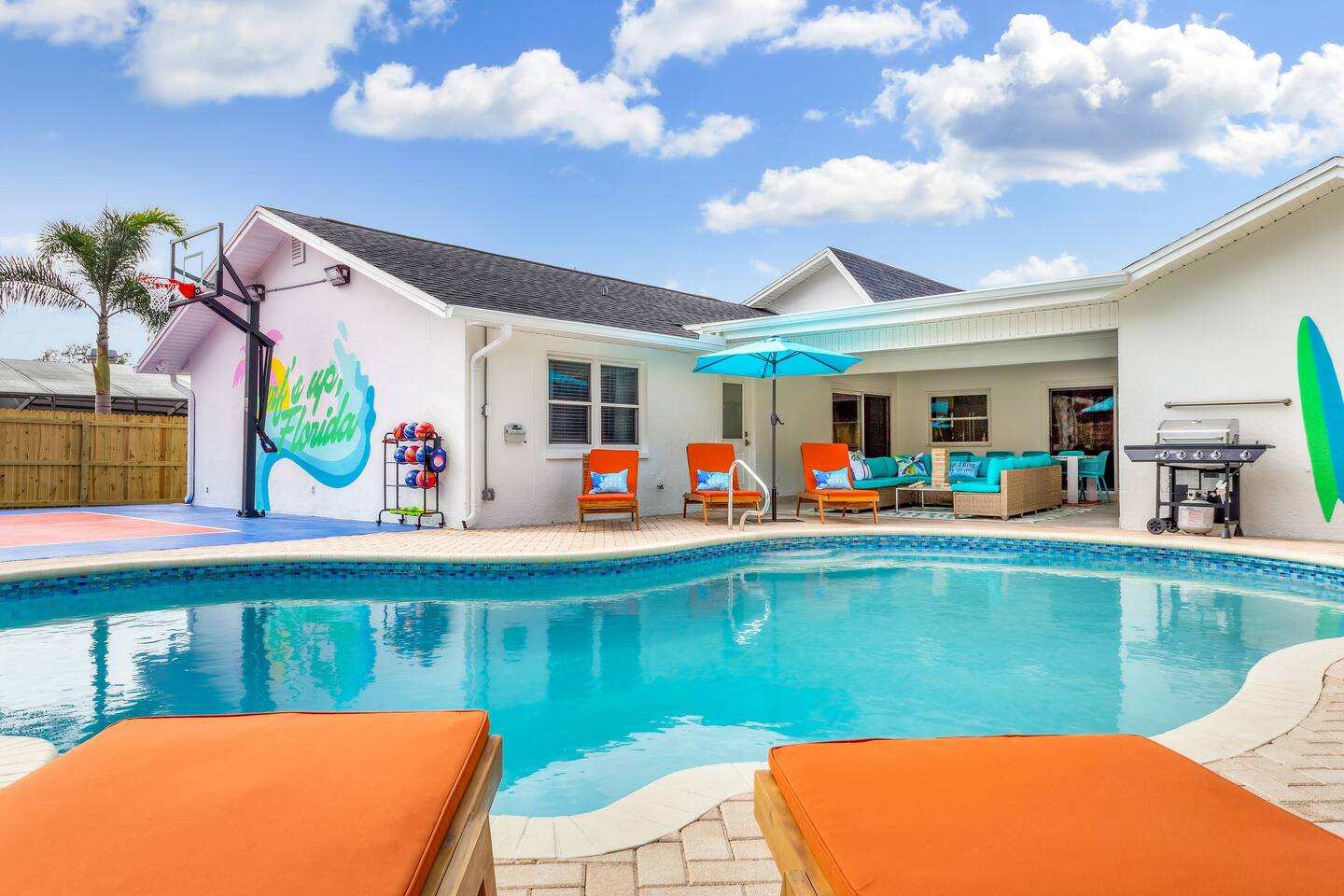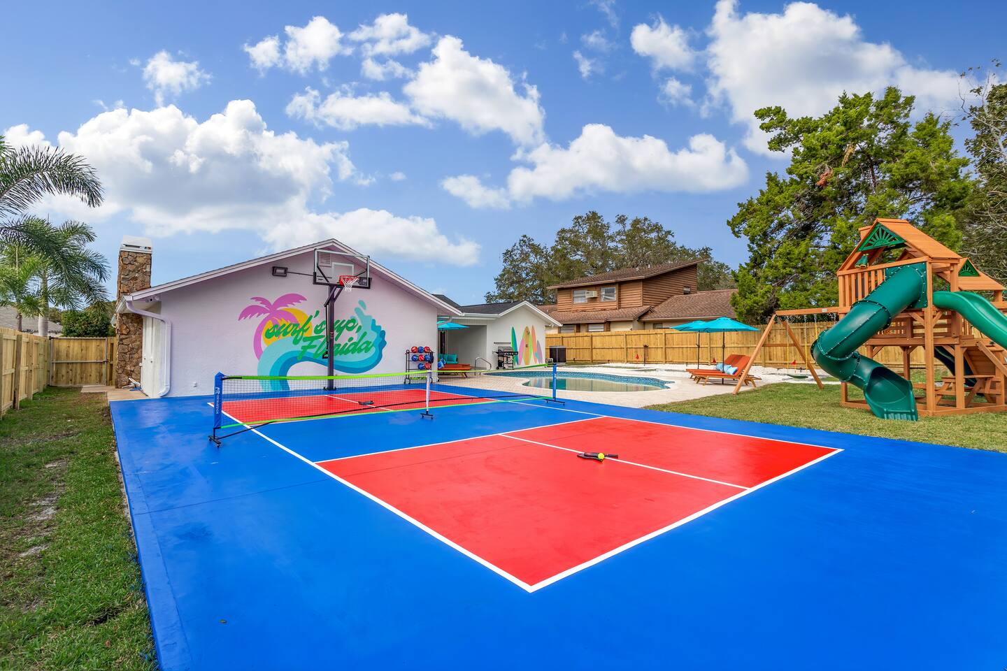KEY FEATURES: ☀ 5 spacious bedrooms with fun, unique designs; 2 kings, 2 queens, 2 fulls, & 2 twin beds ☀ 3 full, modern bathrooms ☀ Beautiful chef's kitchen with modern appliances & design ☀ Living room with tons of comfy seating and large smart TV ☀ Game room with pool table, foosball, air hockey & more ☀ Bright dining room that opens up to the main living area; great for entertaining! ☀ Huge backyard with heated pool, mini golf, bowling, fire pit, and more ☀ Quiet, private neighborhood just minutes away from beautiful beaches Here Are A Few Kind Words From Our Past Guests: “This was a great place to stay! The morning light through the windows was so beautiful. Overall, just a relaxing experience. The hosts were super responsive whenever I had a question. I would stay again!” - Emily “Sabrina was very accommodating and communicative. the house is beautiful and very comfortable, close to nature hikes.” - Jennifer “This place was lovely! Exactly as pictured! Very clean and excellent host experience!!! I plan to come back again!” - Regina ☆☆ BEDROOMS ☆☆ These 5 bedrooms will BLOW YOU AWAY! The star of the show is the bunk bedroom, which is filled with two twin-over-full bunk beds, two slides, arcade gams, basketball (Pop-a-Shot), smart TV, & comfy seating. It will truly WOW you! There are 4 remaining bedrooms; two with a king bed in each, and two with a queen bed in each. All bedrooms have their own smart TV! ☆☆ BATHROOMS ☆☆ There are 3 full bathrooms throughout this home. The first bathroom has a toilet, sink, & a shower/tub combo. The private ensuite master bathroom has a sink, toilet, walk-in shower, and standalone tub. The third bathroom is located right off of the pool table room, with two sinks, a toilet, & walk-in shower. ☆☆ KITCHEN & DINING ☆☆ The kitchen is bright & open, with brand new stainless steel appliances. With lots of counter space and bar top seating, it's a great kitchen for entertaining! Just one room over is the dining room, which is bright and welcoming. The formal dining room seats 8 (plus 4 bar top seats in the kitchen), and there is also a second dining table in the backyard. ☆☆ LIVING ROOM ☆☆ As you walk into the home, you're greeted with the big, open living room, which has tons of comfy seating and a fun, tropical design! It's a great place for your movie or game nights, where the whole family can sit together in this cozy space! ☆☆ GAME ROOM ☆☆ There are TWO fun game rooms in this home. The first game room, right off of the living room, has foosball, air hockey, and direct access to the incredible backyard. The second game room is located right next to the dining room, with a pool table smart TV, and a fireplace. ☆☆ OUTDOOR SPACE ☆☆ This backyard is everything you could ask for, and more! ☀ Heated pool ☀ Fire pit (wood burning) ☀ Mini golf ☀ Basketball court ☀ Pickleball court ☀ Bowling ☀ HUGE jungle gym ☀ Giant Jenga ☀ BBQ grill ☀ Covered outdoor dining ☀ Covered outdoor lounge seating ☀ Sun loungers ☀ Outdoor shower There is so much to do here, that all of your friends & family will be thoroughly entertained throughout your entire stay. No matter the season, this backyard has it all. Book your stay with us today and you will NOT be disappointed. Get ready for a vacation you will never forget! ★☆ Book Now & Let Us Take Care Of You In Seminole! ☆★