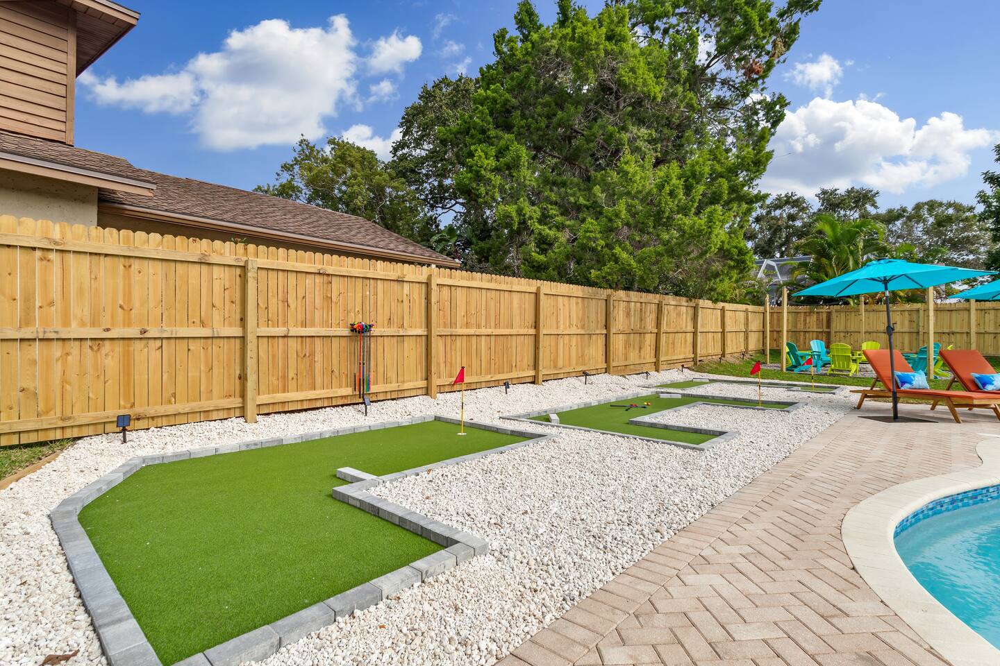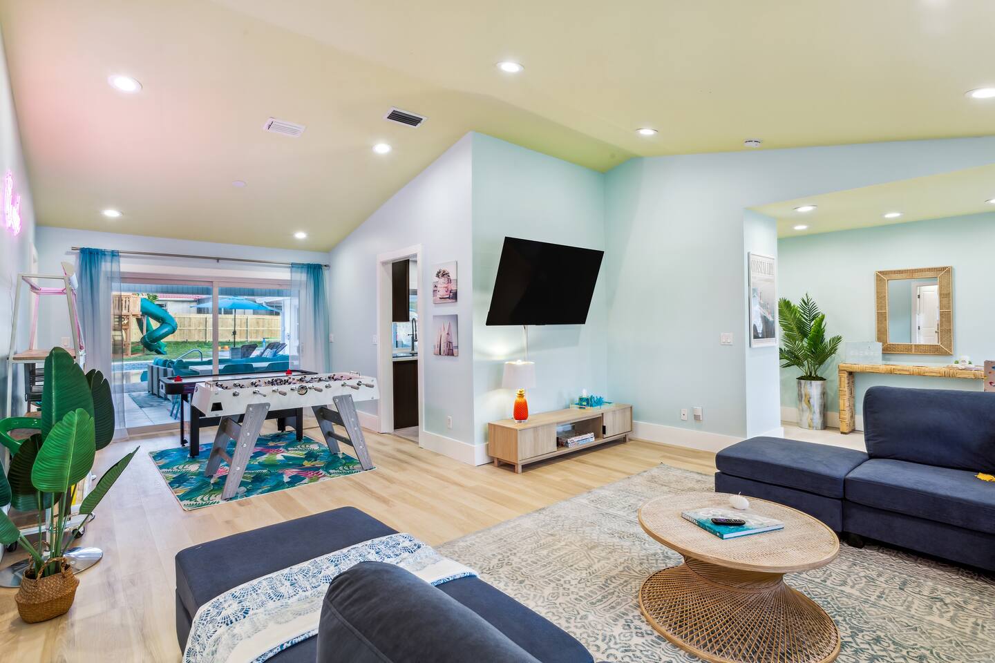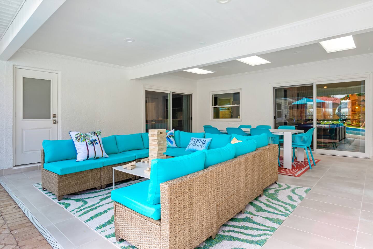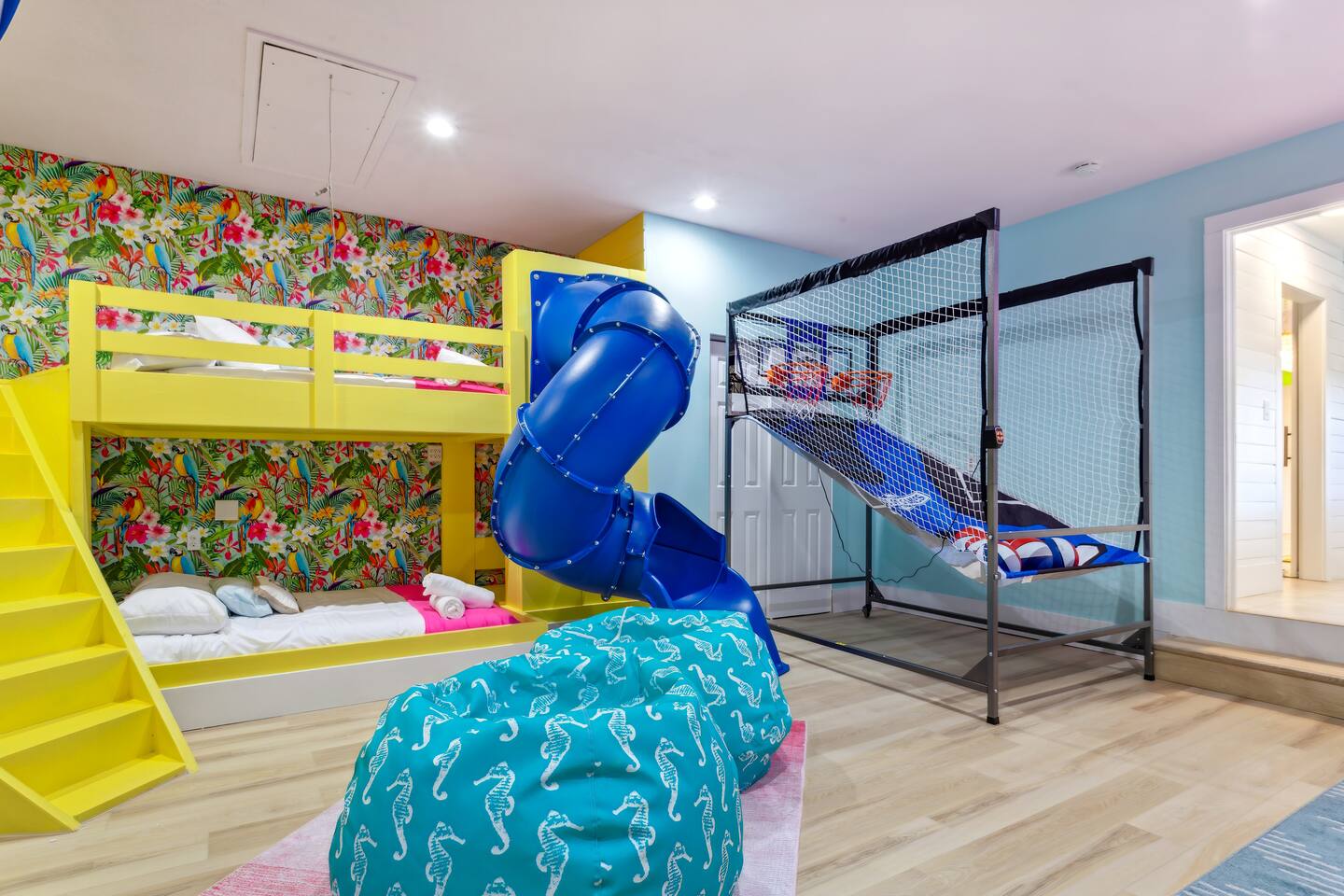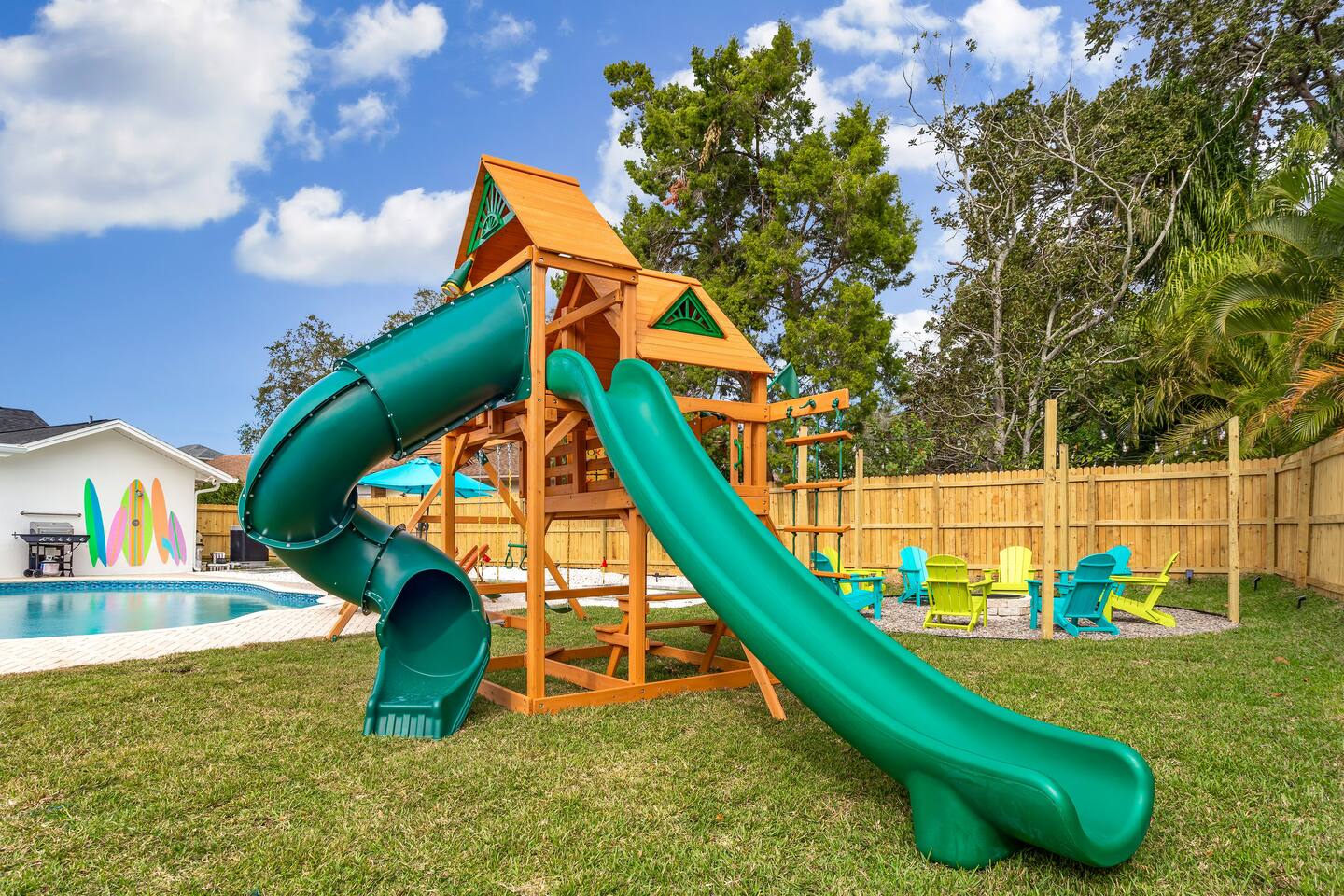 KEY FEATURES: ☀ 5 spacious bedrooms with fun, unique designs; 2 kings, 2 queens, 2 fulls, & 2 twin beds ☀ 3 full, modern bathrooms ☀ Beautiful chef's kitchen with modern appliances & design ☀ Living room with tons of comfy seating and large smart TV ☀ Game room with pool table, foosball, air hockey & more ☀ Bright dining room that opens up to the main living area; great for entertaining! ☀ Huge backyard with heated pool, mini golf, bowling, fire pit, and more ☀ Quiet, private neighborhood just minutes away from beautiful beaches Here Are A Few Kind Words From Our Past Guests: “This was a great place to stay! The morning light through the windows was so beautiful. Overall, just a relaxing experience. The hosts were super responsive whenever I had a question. I would stay again!” - Emily “Sabrina was very accommodating and communicative. the house is beautiful and very comfortable, close to nature hikes.” - Jennifer “This place was lovely! Exactly as pictured! Very clean and excellent host experience!!! I plan to come back again!” - Regina ☆☆ BEDROOMS ☆☆ These 5 bedrooms will BLOW YOU AWAY! The star of the show is the bunk bedroom, which is filled with two twin-over-full bunk beds, two slides, arcade gams, basketball (Pop-a-Shot), smart TV, & comfy seating. It will truly WOW you! There are 4 remaining bedrooms; two with a king bed in each, and two with a queen bed in each. All bedrooms have their own smart TV! ☆☆ BATHROOMS ☆☆ There are 3 full bathrooms throughout this home. The first bathroom has a toilet, sink, & a shower/tub combo. The private ensuite master bathroom has a sink, toilet, walk-in shower, and standalone tub. The third bathroom is located right off of the pool table room, with two sinks, a toilet, & walk-in shower. ☆☆ KITCHEN & DINING ☆☆ The kitchen is bright & open, with brand new stainless steel appliances. With lots of counter space and bar top seating, it's a great kitchen for entertaining! Just one room over is the dining room, which is bright and welcoming. The formal dining room seats 8 (plus 4 bar top seats in the kitchen), and there is also a second dining table in the backyard. ☆☆ LIVING ROOM ☆☆ As you walk into the home, you're greeted with the big, open living room, which has tons of comfy seating and a fun, tropical design! It's a great place for your movie or game nights, where the whole family can sit together in this cozy space! ☆☆ GAME ROOM ☆☆ There are TWO fun game rooms in this home. The first game room, right off of the living room, has foosball, air hockey, and direct access to the incredible backyard. The second game room is located right next to the dining room, with a pool table smart TV, and a fireplace. ☆☆ OUTDOOR SPACE ☆☆ This backyard is everything you could ask for, and more! ☀ Heated pool ☀ Fire pit (wood burning) ☀ Mini golf ☀ Basketball court ☀ Pickleball court ☀ Bowling ☀ HUGE jungle gym ☀ Giant Jenga ☀ BBQ grill ☀ Covered outdoor dining ☀ Covered outdoor lounge seating ☀ Sun loungers ☀ Outdoor shower There is so much to do here, that all of your friends & family will be thoroughly entertained throughout your entire stay. No matter the season, this backyard has it all. Book your stay with us today and you will NOT be disappointed. Get ready for a vacation you will never forget! ★☆ Book Now & Let Us Take Care Of You In Seminole! ☆★