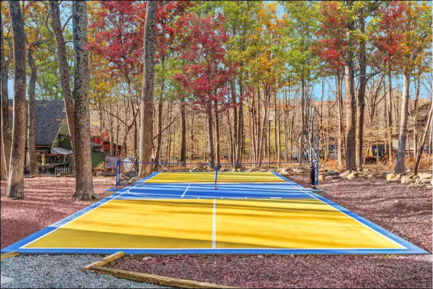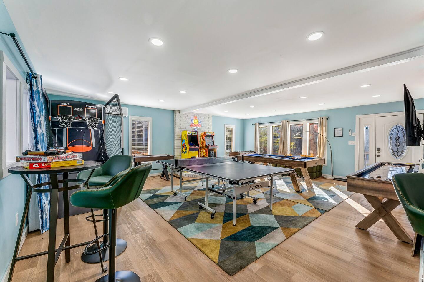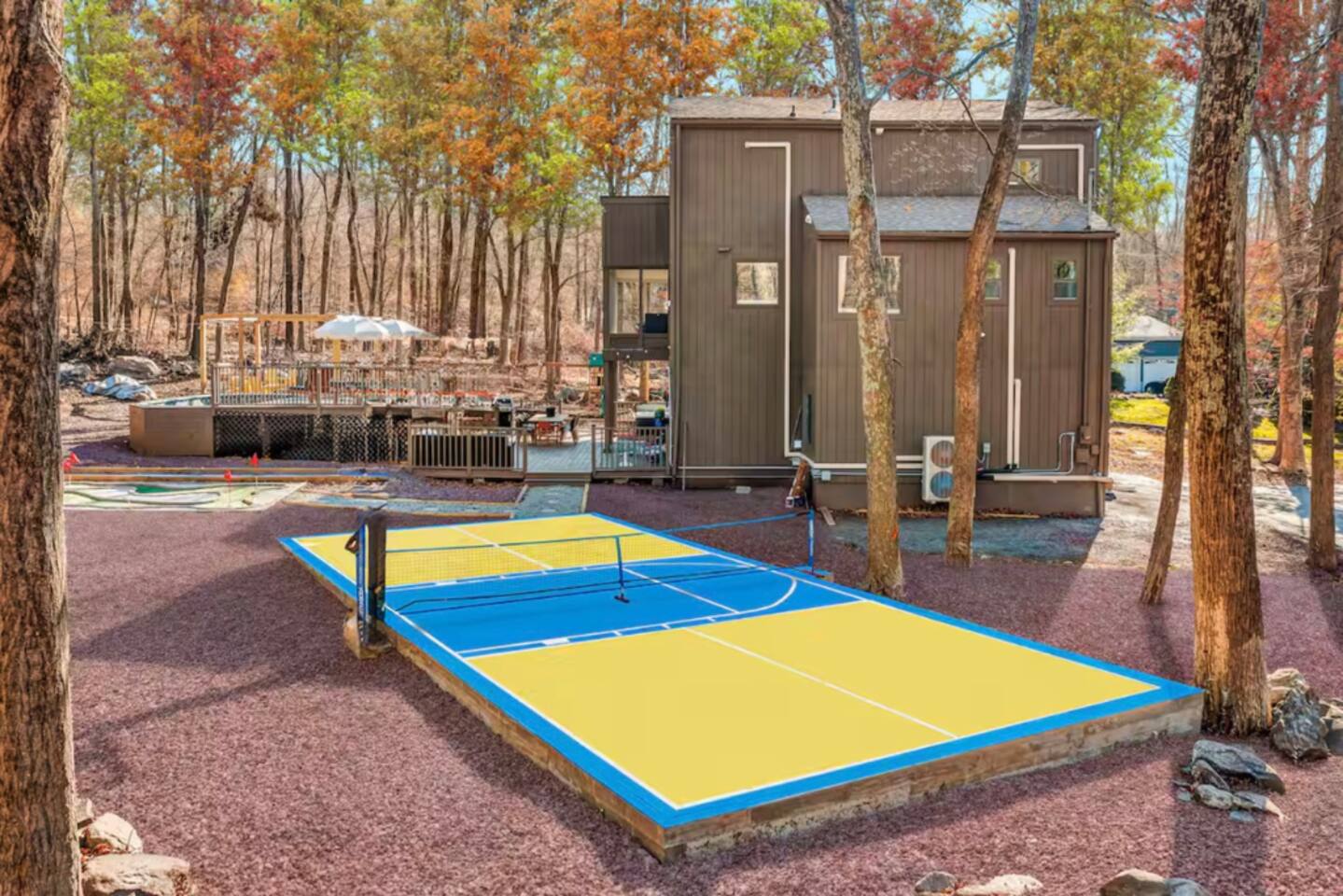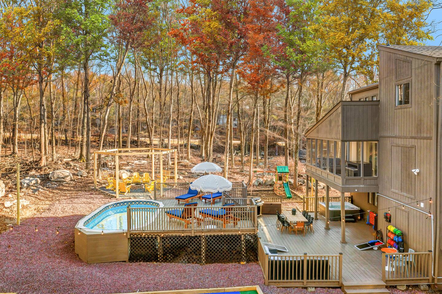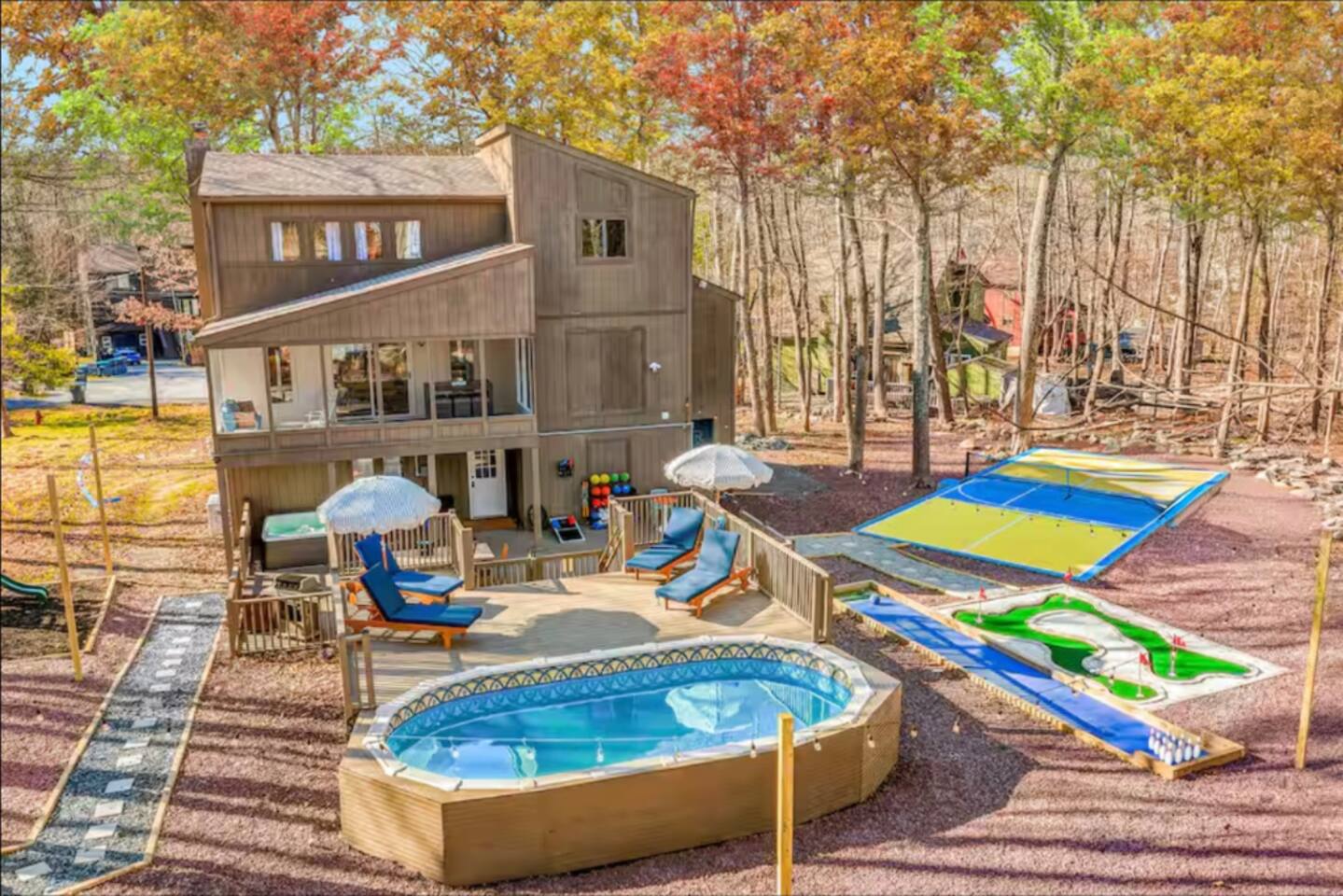 HEATED POOL WILL STAY OPEN THROUGH THE WEEK OF SEPTEMBER 15! **During the summer months (Memorial Day weekend - Labor Day weekend), you will receive amenity badges that allow you to access the following amenities. If you’re staying with us outside of these dates, these amenities will be closed.** ☀ Lakes (with beach access - swimming allowed!) ☀ Pools ☀ Tennis courts ☀ Basketball courts ☀ Volleyball courts ☀ Dog park ☀ Playground areas KEY FEATURES: ☀ 5 beautiful bedrooms; 3 kings, 1 queen, and 4 twin beds (two bunk beds) ☀ 3 full, modern bathrooms ☀ Modern kitchen with new, stainless steel appliances ☀ Open living room with lots of comfy seating & smart TV ☀ Dining room with seating to comfortably accommodate 10 (+ 6 in the screened-in porch & 10 more outdoor dining seats on the back deck!) ☀ Incredible game rooms with pool table, foosball, air hockey, arcade games, poker table, & more! ☀ AMAZING backyard, with a heated pool (open Jun-Aug ONLY), pickleball court, hot tub, fire pit, & more! Here Are A Few Kind Words From Our Past Guests: “This was a great place to stay! The morning light through the windows was so beautiful. Overall, just a relaxing experience. The hosts were super responsive whenever I had a question. I would stay again!” - Emily “Sabrina was very accommodating and communicative. the house is beautiful and very comfortable, close to nature hikes.” - Jennifer “This place was lovely! Exactly as pictured! Very clean and excellent host experience!!! I plan to come back again!” - Regina ☆☆ BEDROOMS ☆☆ Each of the 5 bedrooms in this home have been beautifully designed for comfort - every bedroom in this home has a smart TV. On the bottom floor, there are two bedrooms. One with a queen bed & the other with two twin-over-twin bunk beds (4 twin beds total). On the second level, you will find the master bedroom, with a king bed and cute seating area. The two remaining bedrooms are on the third level, each with a king bed. ☆☆ BATHROOMS ☆☆ There are 3 full, modern bathrooms throughout this home. On the first level, the first bathroom has a sink, toilet, walk-in shower, and TWO washers & dryers. The second level bathroom is right next to the master bedroom, with a sink, toilet, walk-in shower, and separate soaking tub. On the top level, the third bathroom has a sink, toilet, and shower/tub combo. ☆☆ KITCHEN & DINING ☆☆ The modern kitchen is located right off of the main living areas, and is loaded with all new stainless steel appliances & a coffee station (including a Keurig & coffee pods). The dining room is right next to the kitchen, with enough seating to comfortably fit 10 people, plus 6 more seats right out on the screened-in porch, with amazing views of the incredible backyard! ☆☆ LIVING ROOM ☆☆ In the HUGE living room, you’ll be greeted with lots of comfy seating & a big smart TV. This is the perfect spot to host your movie nights & games with your friends and family! ☆☆ GAME ROOM ☆☆ As you walk in the front door on the first level, you will be BLOWN AWAY by the jam-packed game room, filled with all the entertainment you could dream of! Pool table, ping pong, pop-a-shot, foosball, air hockey, shuffleboard, arcade games, and a smart TV - WOW! It just never ends! You will also be greeted with a fun surprise as you walk upstairs to the third level, which has a poker table that overlooks the beautiful living room below. ☆☆ OUTDOOR SPACE ☆☆ This backyard is everything you could ask for, and more! ☀ Heated pool (AVAILABLE JUN-AUG ONLY) ☀ Pickleball court** ☀ Hot tub ☀ Fire pit ☀ Mini golf ☀ Bowling ☀ Kids' jungle gym with slide ☀ Giant Connect 4 ☀ BBQ grill ☀ Outdoor dining ☀ Outdoor lounge seating ☀ Sun lounging chairs by the pool **For your safety, the pickleball court is closed during the winter months due to icy and unsafe conditions. The courts will reopen in the spring, weather permitting. There is so much to do here, that all of your friends & family will be thoroughly entertained throughout your entire stay. No matter the season, this backyard has it all. Book your stay with us today and you will NOT be disappointed. Get ready for a vacation you will never forget! ★☆ Book Now & Let Us Take Care Of You In The Poconos! ☆★