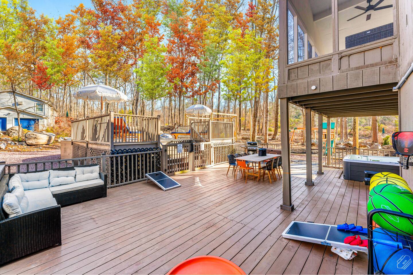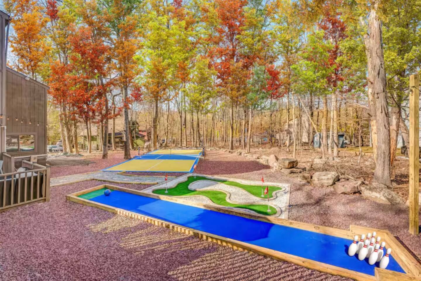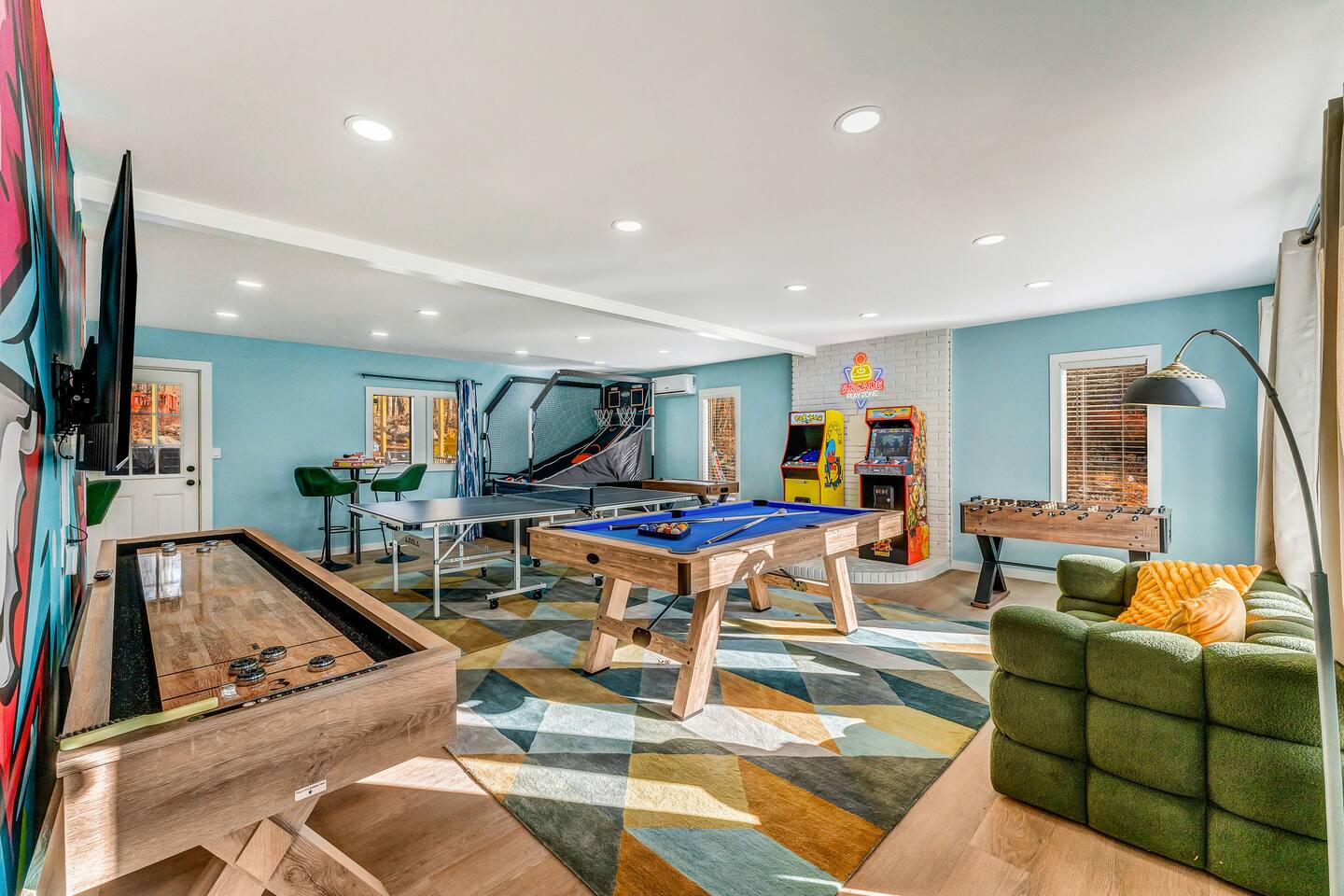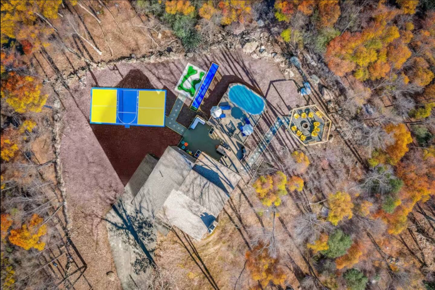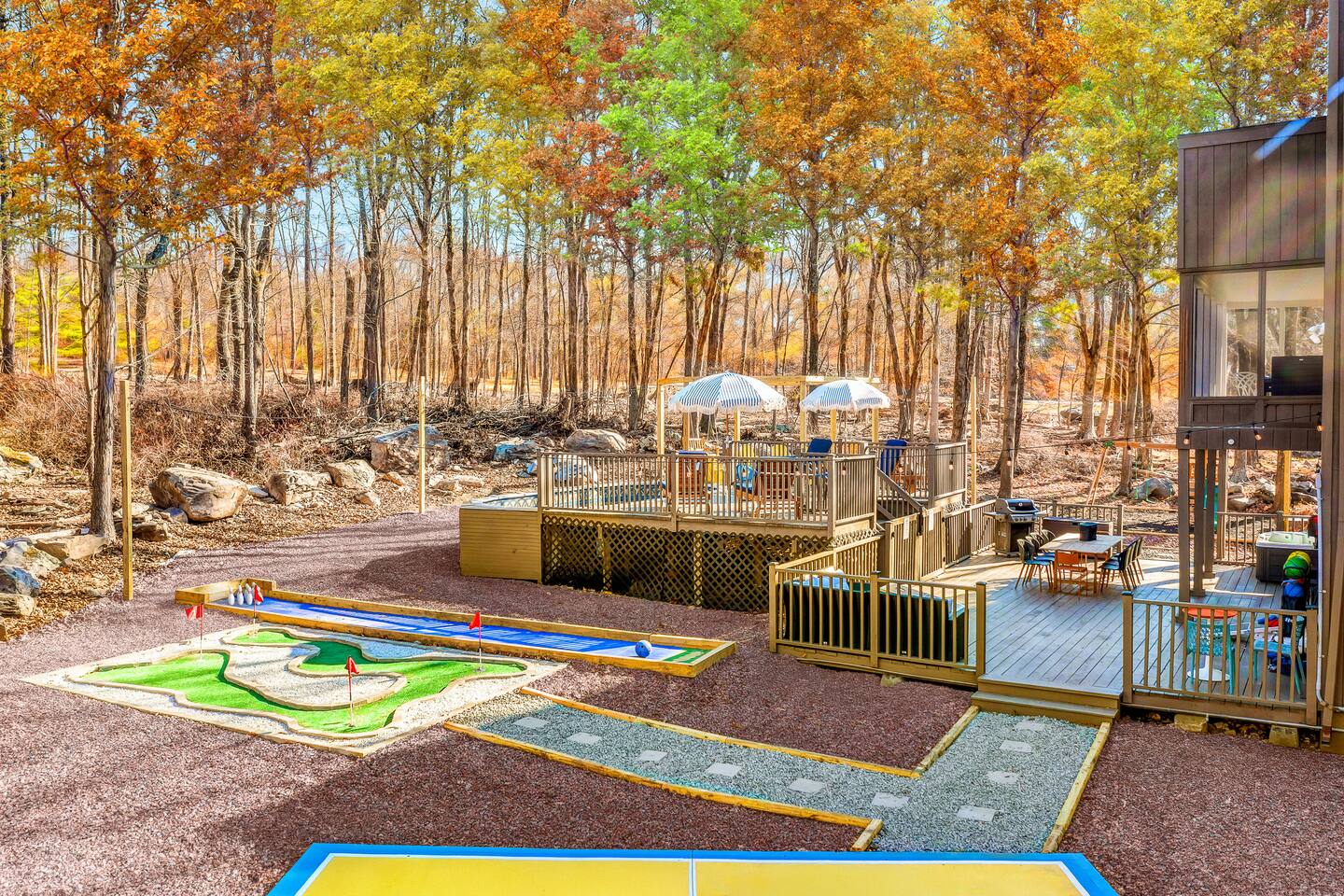 HEATED POOL WILL STAY OPEN THROUGH THE WEEK OF SEPTEMBER 15! **During the summer months (Memorial Day weekend - Labor Day weekend), you will receive amenity badges that allow you to access the following amenities. If you’re staying with us outside of these dates, these amenities will be closed.** ☀ Lakes (with beach access - swimming allowed!) ☀ Pools ☀ Tennis courts ☀ Basketball courts ☀ Volleyball courts ☀ Dog park ☀ Playground areas KEY FEATURES: ☀ 5 beautiful bedrooms; 3 kings, 1 queen, and 4 twin beds (two bunk beds) ☀ 3 full, modern bathrooms ☀ Modern kitchen with new, stainless steel appliances ☀ Open living room with lots of comfy seating & smart TV ☀ Dining room with seating to comfortably accommodate 10 (+ 6 in the screened-in porch & 10 more outdoor dining seats on the back deck!) ☀ Incredible game rooms with pool table, foosball, air hockey, arcade games, poker table, & more! ☀ AMAZING backyard, with a heated pool (open Jun-Aug ONLY), pickleball court, hot tub, fire pit, & more! Here Are A Few Kind Words From Our Past Guests: “This was a great place to stay! The morning light through the windows was so beautiful. Overall, just a relaxing experience. The hosts were super responsive whenever I had a question. I would stay again!” - Emily “Sabrina was very accommodating and communicative. the house is beautiful and very comfortable, close to nature hikes.” - Jennifer “This place was lovely! Exactly as pictured! Very clean and excellent host experience!!! I plan to come back again!” - Regina ☆☆ BEDROOMS ☆☆ Each of the 5 bedrooms in this home have been beautifully designed for comfort - every bedroom in this home has a smart TV. On the bottom floor, there are two bedrooms. One with a queen bed & the other with two twin-over-twin bunk beds (4 twin beds total). On the second level, you will find the master bedroom, with a king bed and cute seating area. The two remaining bedrooms are on the third level, each with a king bed. ☆☆ BATHROOMS ☆☆ There are 3 full, modern bathrooms throughout this home. On the first level, the first bathroom has a sink, toilet, walk-in shower, and TWO washers & dryers. The second level bathroom is right next to the master bedroom, with a sink, toilet, walk-in shower, and separate soaking tub. On the top level, the third bathroom has a sink, toilet, and shower/tub combo. ☆☆ KITCHEN & DINING ☆☆ The modern kitchen is located right off of the main living areas, and is loaded with all new stainless steel appliances & a coffee station (including a Keurig & coffee pods). The dining room is right next to the kitchen, with enough seating to comfortably fit 10 people, plus 6 more seats right out on the screened-in porch, with amazing views of the incredible backyard! ☆☆ LIVING ROOM ☆☆ In the HUGE living room, you’ll be greeted with lots of comfy seating & a big smart TV. This is the perfect spot to host your movie nights & games with your friends and family! ☆☆ GAME ROOM ☆☆ As you walk in the front door on the first level, you will be BLOWN AWAY by the jam-packed game room, filled with all the entertainment you could dream of! Pool table, ping pong, pop-a-shot, foosball, air hockey, shuffleboard, arcade games, and a smart TV - WOW! It just never ends! You will also be greeted with a fun surprise as you walk upstairs to the third level, which has a poker table that overlooks the beautiful living room below. ☆☆ OUTDOOR SPACE ☆☆ This backyard is everything you could ask for, and more! ☀ Heated pool (AVAILABLE JUN-AUG ONLY) ☀ Pickleball court** ☀ Hot tub ☀ Fire pit ☀ Mini golf ☀ Bowling ☀ Kids' jungle gym with slide ☀ Giant Connect 4 ☀ BBQ grill ☀ Outdoor dining ☀ Outdoor lounge seating ☀ Sun lounging chairs by the pool **For your safety, the pickleball court is closed during the winter months due to icy and unsafe conditions. The courts will reopen in the spring, weather permitting. There is so much to do here, that all of your friends & family will be thoroughly entertained throughout your entire stay. No matter the season, this backyard has it all. Book your stay with us today and you will NOT be disappointed. Get ready for a vacation you will never forget! ★☆ Book Now & Let Us Take Care Of You In The Poconos! ☆★
