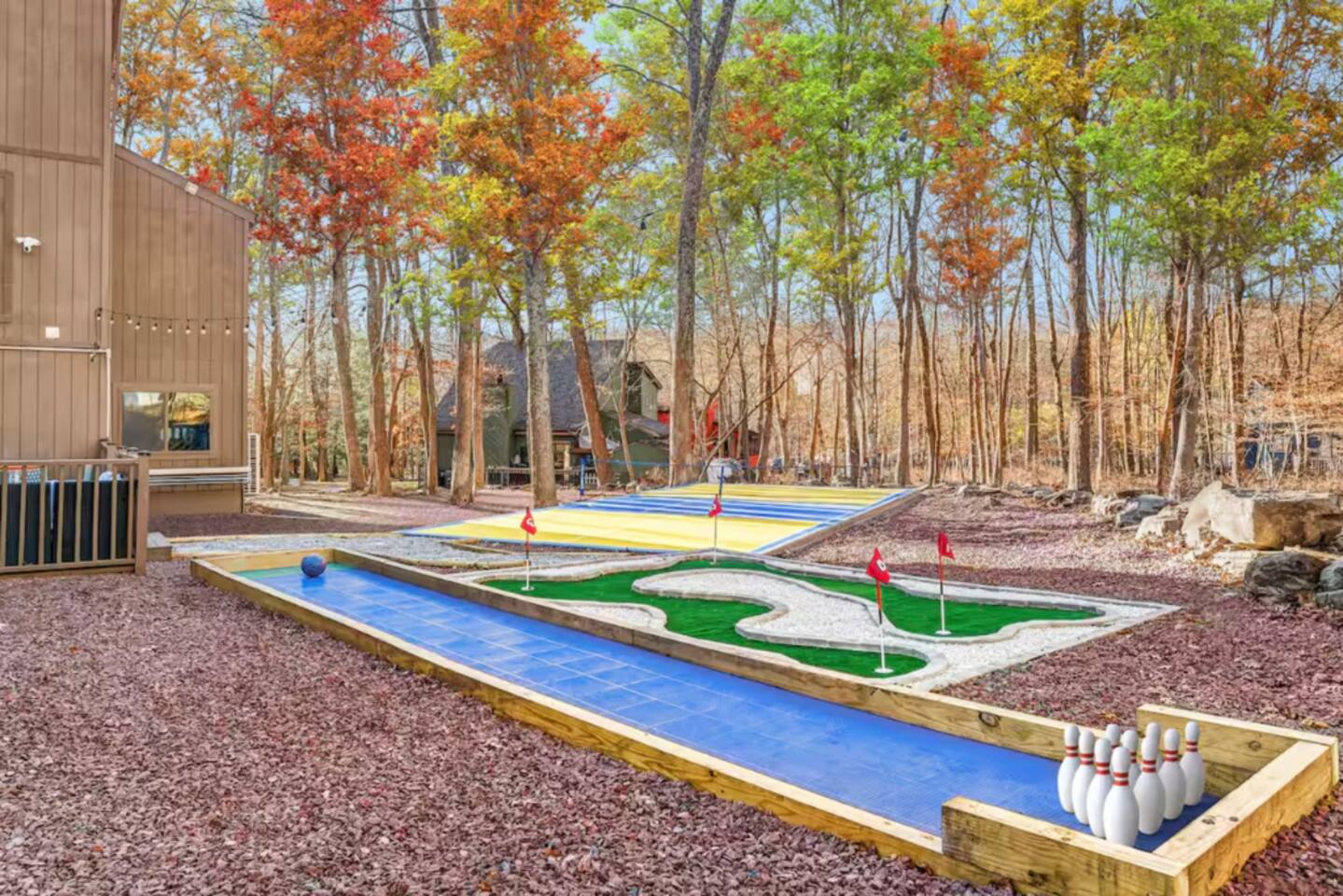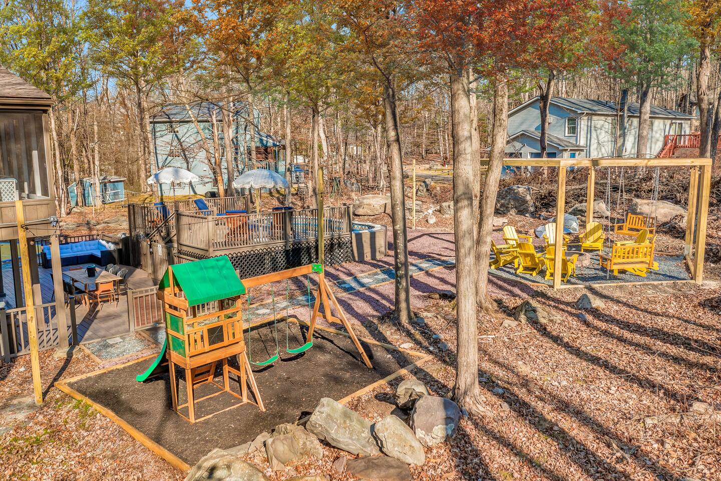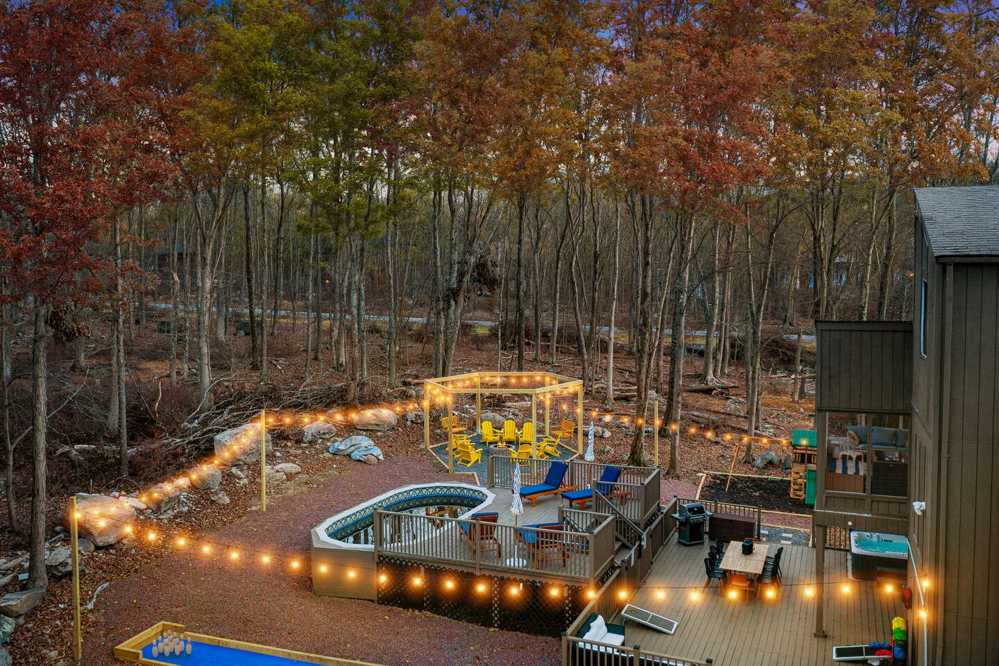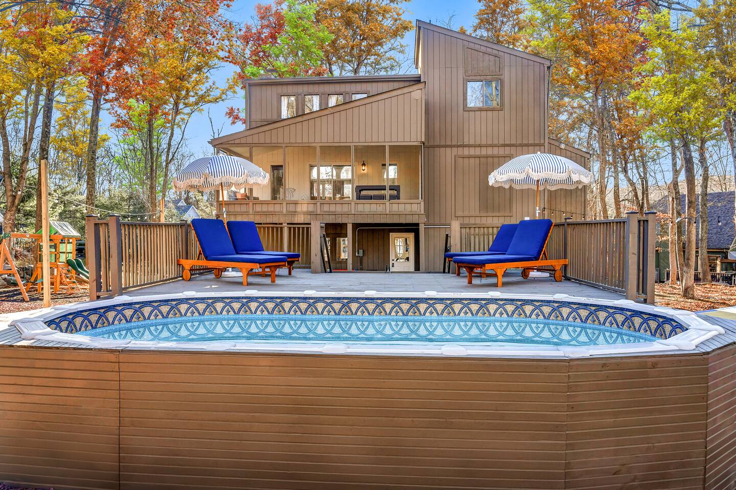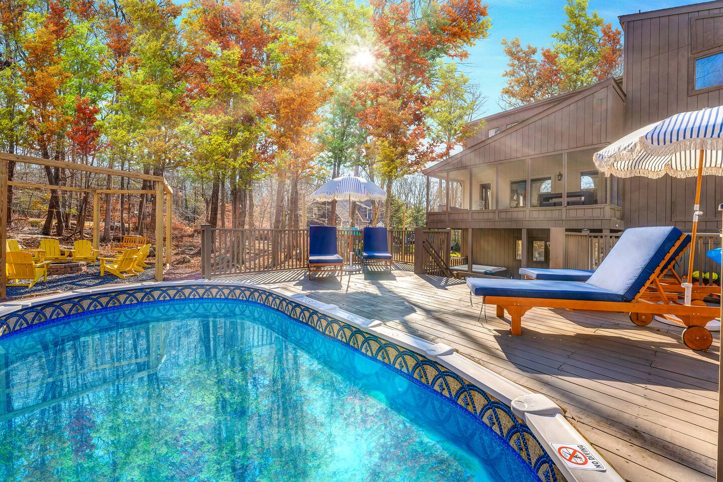 HEATED POOL WILL STAY OPEN THROUGH THE WEEK OF SEPTEMBER 15! **During the summer months (Memorial Day weekend - Labor Day weekend), you will receive amenity badges that allow you to access the following amenities. If you’re staying with us outside of these dates, these amenities will be closed.** ☀ Lakes (with beach access - swimming allowed!) ☀ Pools ☀ Tennis courts ☀ Basketball courts ☀ Volleyball courts ☀ Dog park ☀ Playground areas KEY FEATURES: ☀ 5 beautiful bedrooms; 3 kings, 1 queen, and 4 twin beds (two bunk beds) ☀ 3 full, modern bathrooms ☀ Modern kitchen with new, stainless steel appliances ☀ Open living room with lots of comfy seating & smart TV ☀ Dining room with seating to comfortably accommodate 10 (+ 6 in the screened-in porch & 10 more outdoor dining seats on the back deck!) ☀ Incredible game rooms with pool table, foosball, air hockey, arcade games, poker table, & more! ☀ AMAZING backyard, with a heated pool (open Jun-Aug ONLY), pickleball court, hot tub, fire pit, & more! Here Are A Few Kind Words From Our Past Guests: “This was a great place to stay! The morning light through the windows was so beautiful. Overall, just a relaxing experience. The hosts were super responsive whenever I had a question. I would stay again!” - Emily “Sabrina was very accommodating and communicative. the house is beautiful and very comfortable, close to nature hikes.” - Jennifer “This place was lovely! Exactly as pictured! Very clean and excellent host experience!!! I plan to come back again!” - Regina ☆☆ BEDROOMS ☆☆ Each of the 5 bedrooms in this home have been beautifully designed for comfort - every bedroom in this home has a smart TV. On the bottom floor, there are two bedrooms. One with a queen bed & the other with two twin-over-twin bunk beds (4 twin beds total). On the second level, you will find the master bedroom, with a king bed and cute seating area. The two remaining bedrooms are on the third level, each with a king bed. ☆☆ BATHROOMS ☆☆ There are 3 full, modern bathrooms throughout this home. On the first level, the first bathroom has a sink, toilet, walk-in shower, and TWO washers & dryers. The second level bathroom is right next to the master bedroom, with a sink, toilet, walk-in shower, and separate soaking tub. On the top level, the third bathroom has a sink, toilet, and shower/tub combo. ☆☆ KITCHEN & DINING ☆☆ The modern kitchen is located right off of the main living areas, and is loaded with all new stainless steel appliances & a coffee station (including a Keurig & coffee pods). The dining room is right next to the kitchen, with enough seating to comfortably fit 10 people, plus 6 more seats right out on the screened-in porch, with amazing views of the incredible backyard! ☆☆ LIVING ROOM ☆☆ In the HUGE living room, you’ll be greeted with lots of comfy seating & a big smart TV. This is the perfect spot to host your movie nights & games with your friends and family! ☆☆ GAME ROOM ☆☆ As you walk in the front door on the first level, you will be BLOWN AWAY by the jam-packed game room, filled with all the entertainment you could dream of! Pool table, ping pong, pop-a-shot, foosball, air hockey, shuffleboard, arcade games, and a smart TV - WOW! It just never ends! You will also be greeted with a fun surprise as you walk upstairs to the third level, which has a poker table that overlooks the beautiful living room below. ☆☆ OUTDOOR SPACE ☆☆ This backyard is everything you could ask for, and more! ☀ Heated pool (AVAILABLE JUN-AUG ONLY) ☀ Pickleball court** ☀ Hot tub ☀ Fire pit ☀ Mini golf ☀ Bowling ☀ Kids' jungle gym with slide ☀ Giant Connect 4 ☀ BBQ grill ☀ Outdoor dining ☀ Outdoor lounge seating ☀ Sun lounging chairs by the pool **For your safety, the pickleball court is closed during the winter months due to icy and unsafe conditions. The courts will reopen in the spring, weather permitting. There is so much to do here, that all of your friends & family will be thoroughly entertained throughout your entire stay. No matter the season, this backyard has it all. Book your stay with us today and you will NOT be disappointed. Get ready for a vacation you will never forget! ★☆ Book Now & Let Us Take Care Of You In The Poconos! ☆★