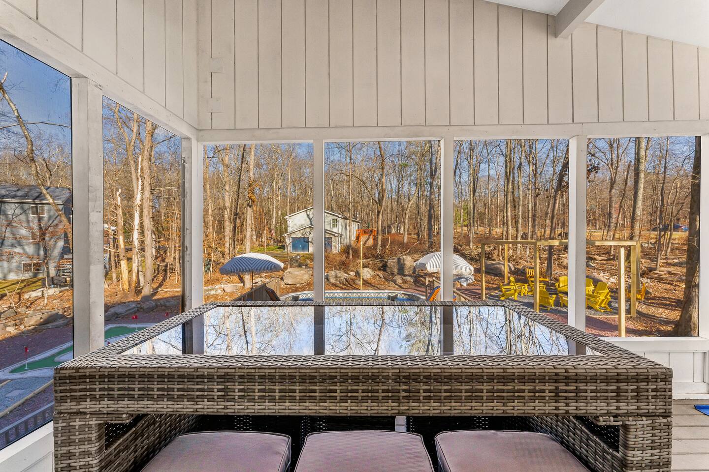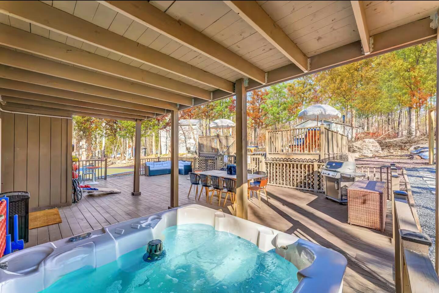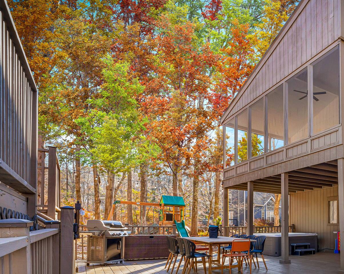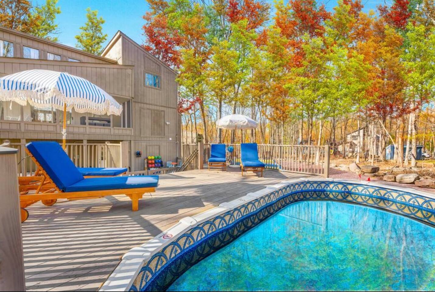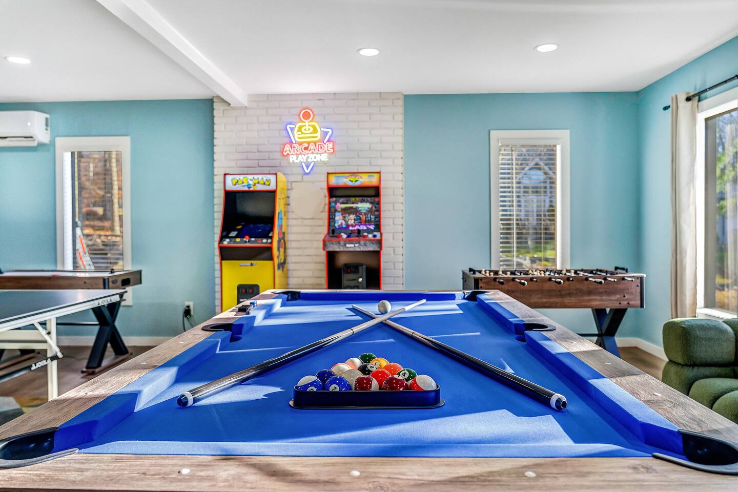 HEATED POOL WILL STAY OPEN THROUGH THE WEEK OF SEPTEMBER 15! **During the summer months (Memorial Day weekend - Labor Day weekend), you will receive amenity badges that allow you to access the following amenities. If you’re staying with us outside of these dates, these amenities will be closed.** ☀ Lakes (with beach access - swimming allowed!) ☀ Pools ☀ Tennis courts ☀ Basketball courts ☀ Volleyball courts ☀ Dog park ☀ Playground areas KEY FEATURES: ☀ 5 beautiful bedrooms; 3 kings, 1 queen, and 4 twin beds (two bunk beds) ☀ 3 full, modern bathrooms ☀ Modern kitchen with new, stainless steel appliances ☀ Open living room with lots of comfy seating & smart TV ☀ Dining room with seating to comfortably accommodate 10 (+ 6 in the screened-in porch & 10 more outdoor dining seats on the back deck!) ☀ Incredible game rooms with pool table, foosball, air hockey, arcade games, poker table, & more! ☀ AMAZING backyard, with a heated pool (open Jun-Aug ONLY), pickleball court, hot tub, fire pit, & more! Here Are A Few Kind Words From Our Past Guests: “This was a great place to stay! The morning light through the windows was so beautiful. Overall, just a relaxing experience. The hosts were super responsive whenever I had a question. I would stay again!” - Emily “Sabrina was very accommodating and communicative. the house is beautiful and very comfortable, close to nature hikes.” - Jennifer “This place was lovely! Exactly as pictured! Very clean and excellent host experience!!! I plan to come back again!” - Regina ☆☆ BEDROOMS ☆☆ Each of the 5 bedrooms in this home have been beautifully designed for comfort - every bedroom in this home has a smart TV. On the bottom floor, there are two bedrooms. One with a queen bed & the other with two twin-over-twin bunk beds (4 twin beds total). On the second level, you will find the master bedroom, with a king bed and cute seating area. The two remaining bedrooms are on the third level, each with a king bed. ☆☆ BATHROOMS ☆☆ There are 3 full, modern bathrooms throughout this home. On the first level, the first bathroom has a sink, toilet, walk-in shower, and TWO washers & dryers. The second level bathroom is right next to the master bedroom, with a sink, toilet, walk-in shower, and separate soaking tub. On the top level, the third bathroom has a sink, toilet, and shower/tub combo. ☆☆ KITCHEN & DINING ☆☆ The modern kitchen is located right off of the main living areas, and is loaded with all new stainless steel appliances & a coffee station (including a Keurig & coffee pods). The dining room is right next to the kitchen, with enough seating to comfortably fit 10 people, plus 6 more seats right out on the screened-in porch, with amazing views of the incredible backyard! ☆☆ LIVING ROOM ☆☆ In the HUGE living room, you’ll be greeted with lots of comfy seating & a big smart TV. This is the perfect spot to host your movie nights & games with your friends and family! ☆☆ GAME ROOM ☆☆ As you walk in the front door on the first level, you will be BLOWN AWAY by the jam-packed game room, filled with all the entertainment you could dream of! Pool table, ping pong, pop-a-shot, foosball, air hockey, shuffleboard, arcade games, and a smart TV - WOW! It just never ends! You will also be greeted with a fun surprise as you walk upstairs to the third level, which has a poker table that overlooks the beautiful living room below. ☆☆ OUTDOOR SPACE ☆☆ This backyard is everything you could ask for, and more! ☀ Heated pool (AVAILABLE JUN-AUG ONLY) ☀ Pickleball court** ☀ Hot tub ☀ Fire pit ☀ Mini golf ☀ Bowling ☀ Kids' jungle gym with slide ☀ Giant Connect 4 ☀ BBQ grill ☀ Outdoor dining ☀ Outdoor lounge seating ☀ Sun lounging chairs by the pool **For your safety, the pickleball court is closed during the winter months due to icy and unsafe conditions. The courts will reopen in the spring, weather permitting. There is so much to do here, that all of your friends & family will be thoroughly entertained throughout your entire stay. No matter the season, this backyard has it all. Book your stay with us today and you will NOT be disappointed. Get ready for a vacation you will never forget! ★☆ Book Now & Let Us Take Care Of You In The Poconos! ☆★