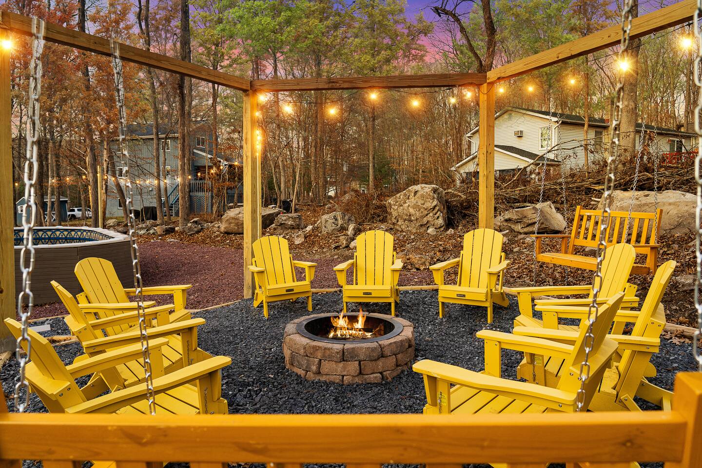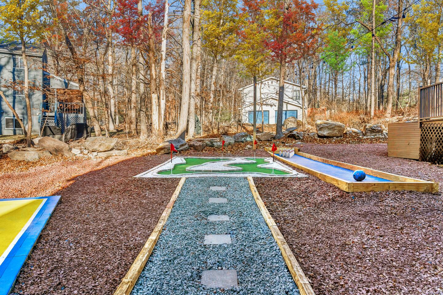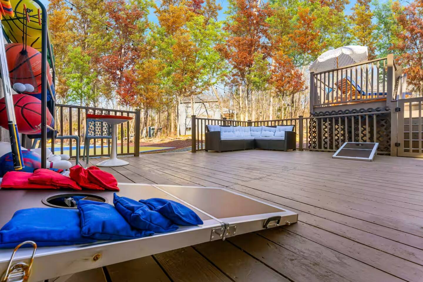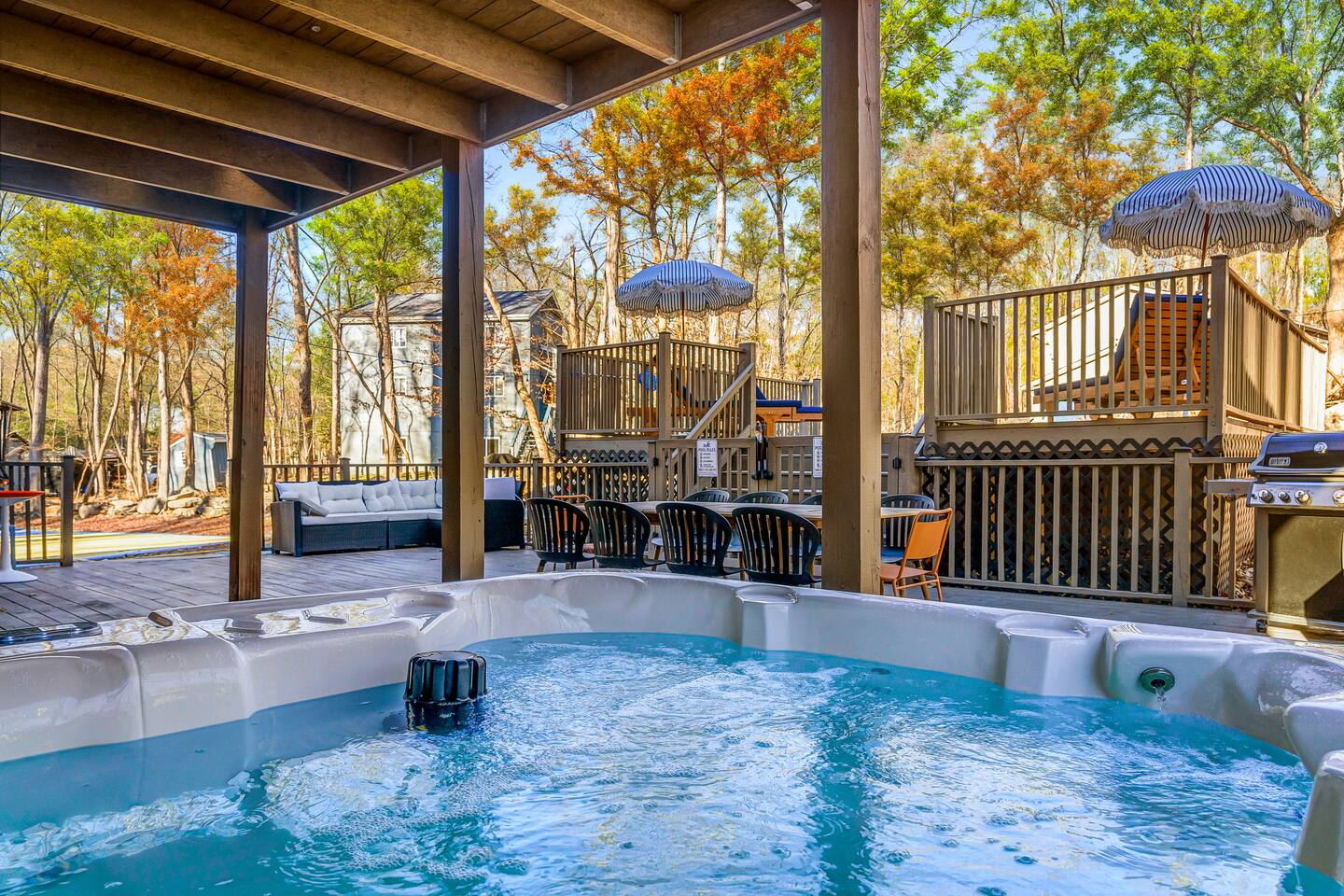 HEATED POOL WILL STAY OPEN THROUGH THE WEEK OF SEPTEMBER 15! **During the summer months (Memorial Day weekend - Labor Day weekend), you will receive amenity badges that allow you to access the following amenities. If you’re staying with us outside of these dates, these amenities will be closed.** ☀ Lakes (with beach access - swimming allowed!) ☀ Pools ☀ Tennis courts ☀ Basketball courts ☀ Volleyball courts ☀ Dog park ☀ Playground areas KEY FEATURES: ☀ 5 beautiful bedrooms; 3 kings, 1 queen, and 4 twin beds (two bunk beds) ☀ 3 full, modern bathrooms ☀ Modern kitchen with new, stainless steel appliances ☀ Open living room with lots of comfy seating & smart TV ☀ Dining room with seating to comfortably accommodate 10 (+ 6 in the screened-in porch & 10 more outdoor dining seats on the back deck!) ☀ Incredible game rooms with pool table, foosball, air hockey, arcade games, poker table, & more! ☀ AMAZING backyard, with a heated pool (open Jun-Aug ONLY), pickleball court, hot tub, fire pit, & more! Here Are A Few Kind Words From Our Past Guests: “This was a great place to stay! The morning light through the windows was so beautiful. Overall, just a relaxing experience. The hosts were super responsive whenever I had a question. I would stay again!” - Emily “Sabrina was very accommodating and communicative. the house is beautiful and very comfortable, close to nature hikes.” - Jennifer “This place was lovely! Exactly as pictured! Very clean and excellent host experience!!! I plan to come back again!” - Regina ☆☆ BEDROOMS ☆☆ Each of the 5 bedrooms in this home have been beautifully designed for comfort - every bedroom in this home has a smart TV. On the bottom floor, there are two bedrooms. One with a queen bed & the other with two twin-over-twin bunk beds (4 twin beds total). On the second level, you will find the master bedroom, with a king bed and cute seating area. The two remaining bedrooms are on the third level, each with a king bed. ☆☆ BATHROOMS ☆☆ There are 3 full, modern bathrooms throughout this home. On the first level, the first bathroom has a sink, toilet, walk-in shower, and TWO washers & dryers. The second level bathroom is right next to the master bedroom, with a sink, toilet, walk-in shower, and separate soaking tub. On the top level, the third bathroom has a sink, toilet, and shower/tub combo. ☆☆ KITCHEN & DINING ☆☆ The modern kitchen is located right off of the main living areas, and is loaded with all new stainless steel appliances & a coffee station (including a Keurig & coffee pods). The dining room is right next to the kitchen, with enough seating to comfortably fit 10 people, plus 6 more seats right out on the screened-in porch, with amazing views of the incredible backyard! ☆☆ LIVING ROOM ☆☆ In the HUGE living room, you’ll be greeted with lots of comfy seating & a big smart TV. This is the perfect spot to host your movie nights & games with your friends and family! ☆☆ GAME ROOM ☆☆ As you walk in the front door on the first level, you will be BLOWN AWAY by the jam-packed game room, filled with all the entertainment you could dream of! Pool table, ping pong, pop-a-shot, foosball, air hockey, shuffleboard, arcade games, and a smart TV - WOW! It just never ends! You will also be greeted with a fun surprise as you walk upstairs to the third level, which has a poker table that overlooks the beautiful living room below. ☆☆ OUTDOOR SPACE ☆☆ This backyard is everything you could ask for, and more! ☀ Heated pool (AVAILABLE JUN-AUG ONLY) ☀ Pickleball court** ☀ Hot tub ☀ Fire pit ☀ Mini golf ☀ Bowling ☀ Kids' jungle gym with slide ☀ Giant Connect 4 ☀ BBQ grill ☀ Outdoor dining ☀ Outdoor lounge seating ☀ Sun lounging chairs by the pool **For your safety, the pickleball court is closed during the winter months due to icy and unsafe conditions. The courts will reopen in the spring, weather permitting. There is so much to do here, that all of your friends & family will be thoroughly entertained throughout your entire stay. No matter the season, this backyard has it all. Book your stay with us today and you will NOT be disappointed. Get ready for a vacation you will never forget! ★☆ Book Now & Let Us Take Care Of You In The Poconos! ☆★