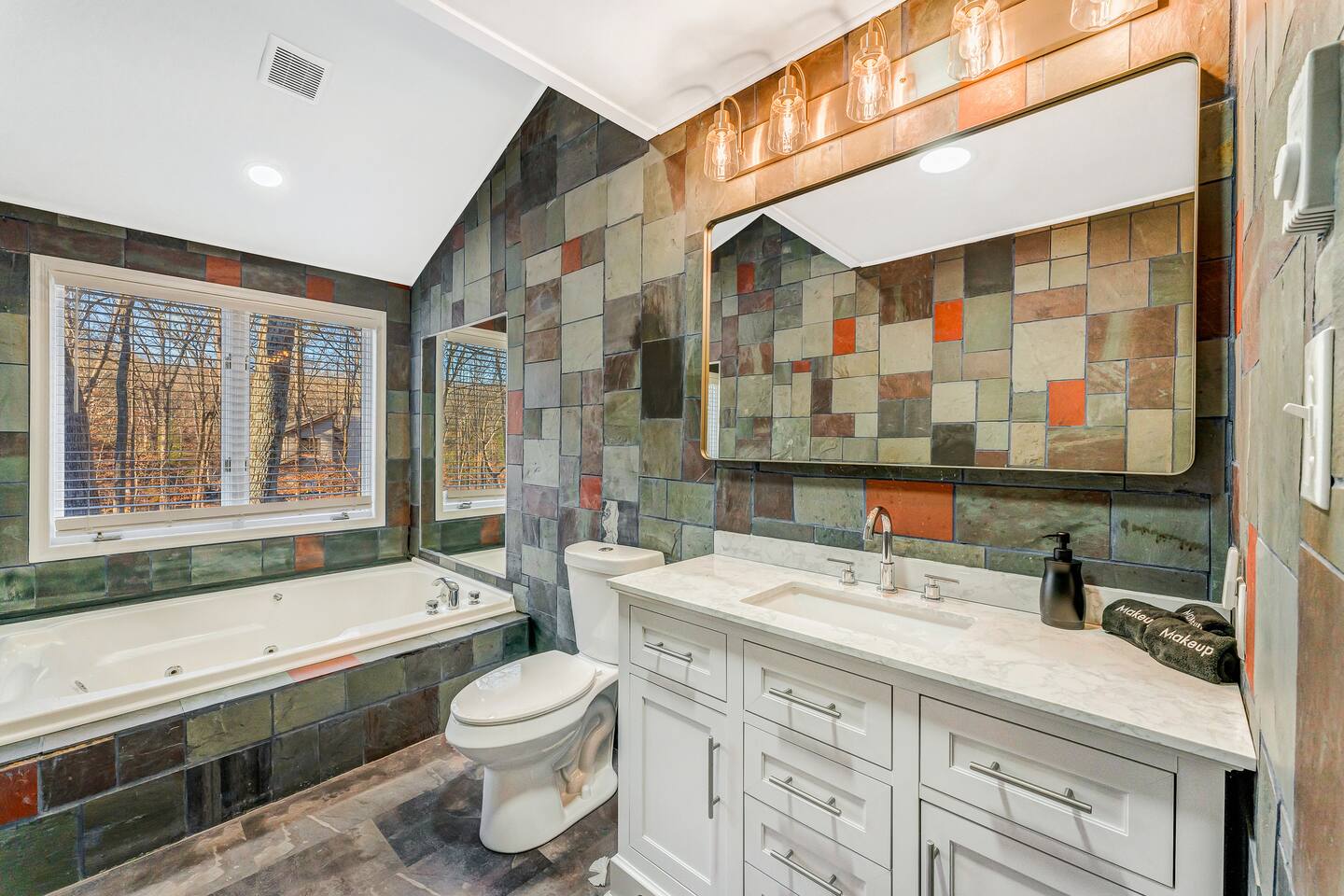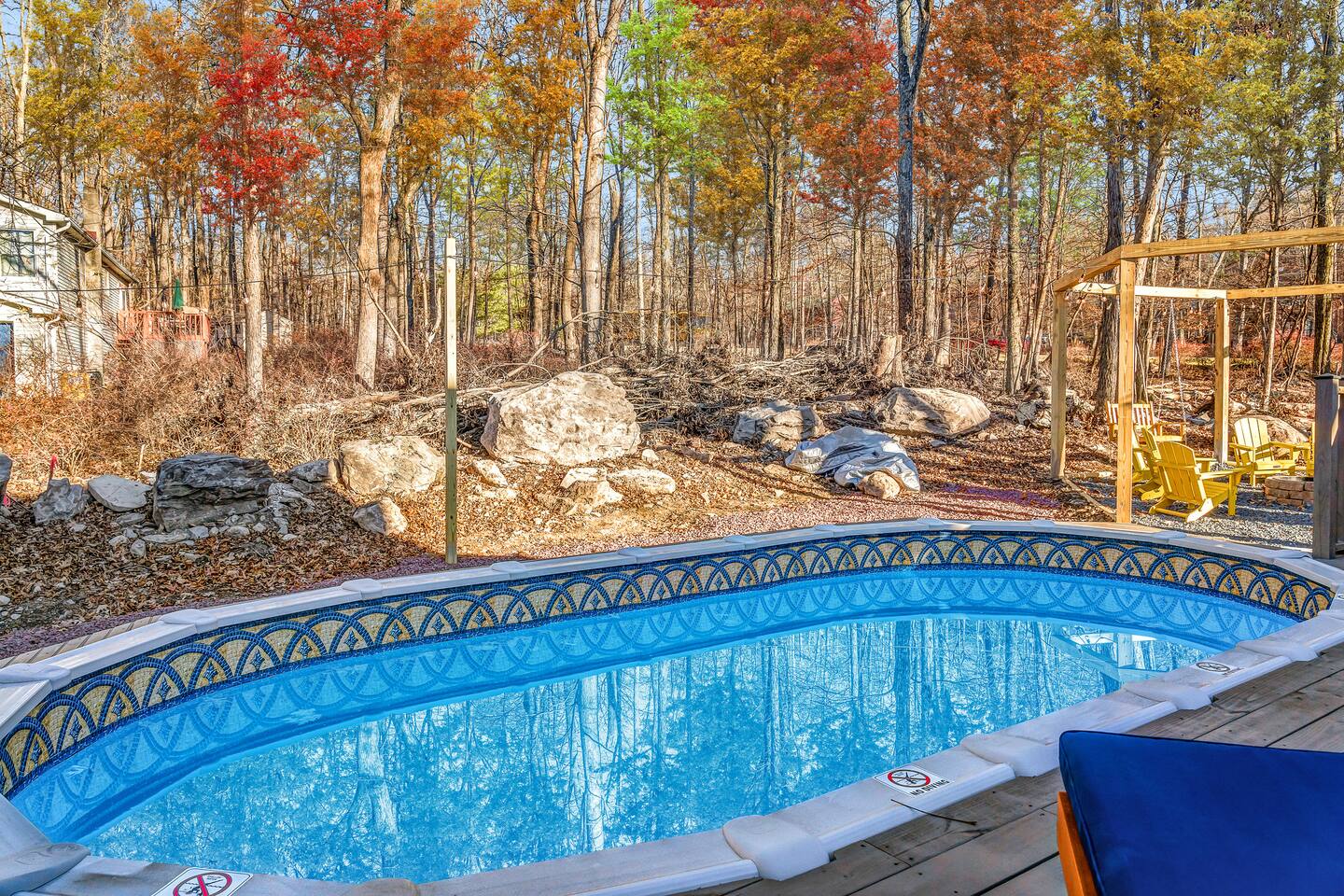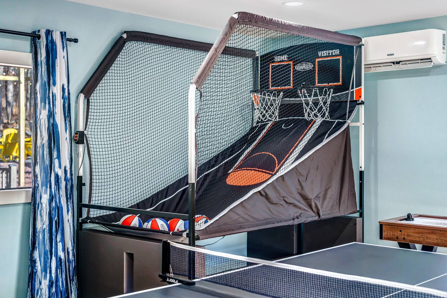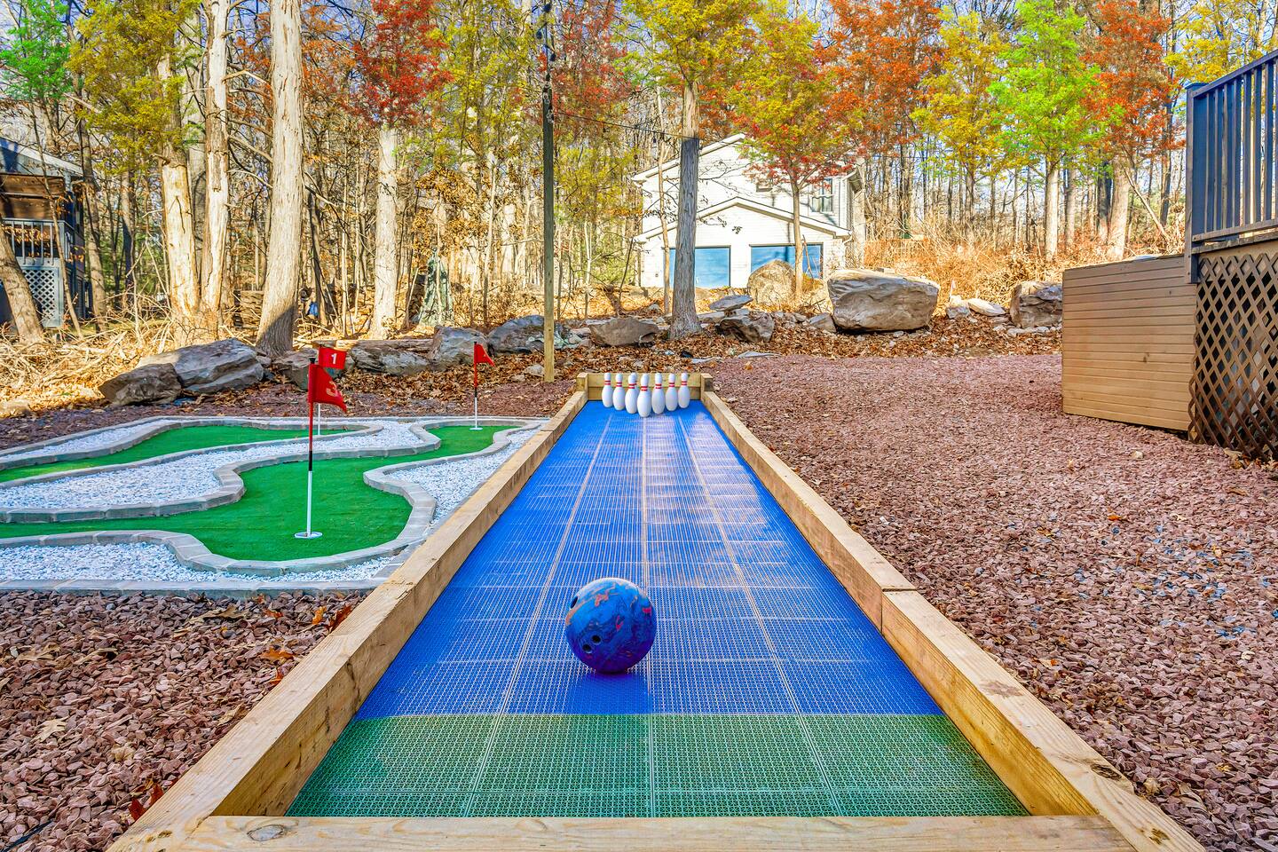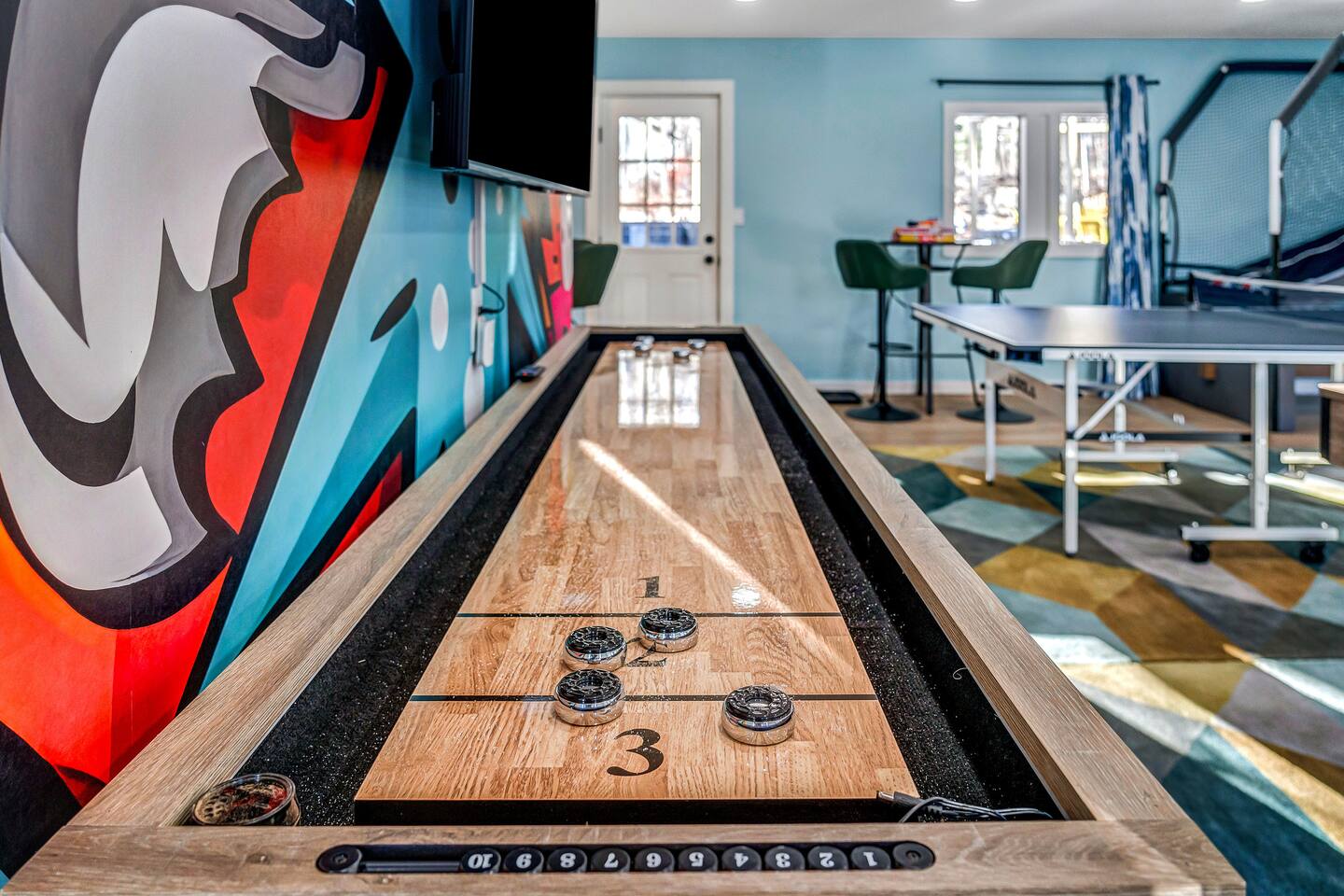 HEATED POOL WILL STAY OPEN THROUGH THE WEEK OF SEPTEMBER 15! **During the summer months (Memorial Day weekend - Labor Day weekend), you will receive amenity badges that allow you to access the following amenities. If you’re staying with us outside of these dates, these amenities will be closed.** ☀ Lakes (with beach access - swimming allowed!) ☀ Pools ☀ Tennis courts ☀ Basketball courts ☀ Volleyball courts ☀ Dog park ☀ Playground areas KEY FEATURES: ☀ 5 beautiful bedrooms; 3 kings, 1 queen, and 4 twin beds (two bunk beds) ☀ 3 full, modern bathrooms ☀ Modern kitchen with new, stainless steel appliances ☀ Open living room with lots of comfy seating & smart TV ☀ Dining room with seating to comfortably accommodate 10 (+ 6 in the screened-in porch & 10 more outdoor dining seats on the back deck!) ☀ Incredible game rooms with pool table, foosball, air hockey, arcade games, poker table, & more! ☀ AMAZING backyard, with a heated pool (open Jun-Aug ONLY), pickleball court, hot tub, fire pit, & more! Here Are A Few Kind Words From Our Past Guests: “This was a great place to stay! The morning light through the windows was so beautiful. Overall, just a relaxing experience. The hosts were super responsive whenever I had a question. I would stay again!” - Emily “Sabrina was very accommodating and communicative. the house is beautiful and very comfortable, close to nature hikes.” - Jennifer “This place was lovely! Exactly as pictured! Very clean and excellent host experience!!! I plan to come back again!” - Regina ☆☆ BEDROOMS ☆☆ Each of the 5 bedrooms in this home have been beautifully designed for comfort - every bedroom in this home has a smart TV. On the bottom floor, there are two bedrooms. One with a queen bed & the other with two twin-over-twin bunk beds (4 twin beds total). On the second level, you will find the master bedroom, with a king bed and cute seating area. The two remaining bedrooms are on the third level, each with a king bed. ☆☆ BATHROOMS ☆☆ There are 3 full, modern bathrooms throughout this home. On the first level, the first bathroom has a sink, toilet, walk-in shower, and TWO washers & dryers. The second level bathroom is right next to the master bedroom, with a sink, toilet, walk-in shower, and separate soaking tub. On the top level, the third bathroom has a sink, toilet, and shower/tub combo. ☆☆ KITCHEN & DINING ☆☆ The modern kitchen is located right off of the main living areas, and is loaded with all new stainless steel appliances & a coffee station (including a Keurig & coffee pods). The dining room is right next to the kitchen, with enough seating to comfortably fit 10 people, plus 6 more seats right out on the screened-in porch, with amazing views of the incredible backyard! ☆☆ LIVING ROOM ☆☆ In the HUGE living room, you’ll be greeted with lots of comfy seating & a big smart TV. This is the perfect spot to host your movie nights & games with your friends and family! ☆☆ GAME ROOM ☆☆ As you walk in the front door on the first level, you will be BLOWN AWAY by the jam-packed game room, filled with all the entertainment you could dream of! Pool table, ping pong, pop-a-shot, foosball, air hockey, shuffleboard, arcade games, and a smart TV - WOW! It just never ends! You will also be greeted with a fun surprise as you walk upstairs to the third level, which has a poker table that overlooks the beautiful living room below. ☆☆ OUTDOOR SPACE ☆☆ This backyard is everything you could ask for, and more! ☀ Heated pool (AVAILABLE JUN-AUG ONLY) ☀ Pickleball court** ☀ Hot tub ☀ Fire pit ☀ Mini golf ☀ Bowling ☀ Kids' jungle gym with slide ☀ Giant Connect 4 ☀ BBQ grill ☀ Outdoor dining ☀ Outdoor lounge seating ☀ Sun lounging chairs by the pool **For your safety, the pickleball court is closed during the winter months due to icy and unsafe conditions. The courts will reopen in the spring, weather permitting. There is so much to do here, that all of your friends & family will be thoroughly entertained throughout your entire stay. No matter the season, this backyard has it all. Book your stay with us today and you will NOT be disappointed. Get ready for a vacation you will never forget! ★☆ Book Now & Let Us Take Care Of You In The Poconos! ☆★